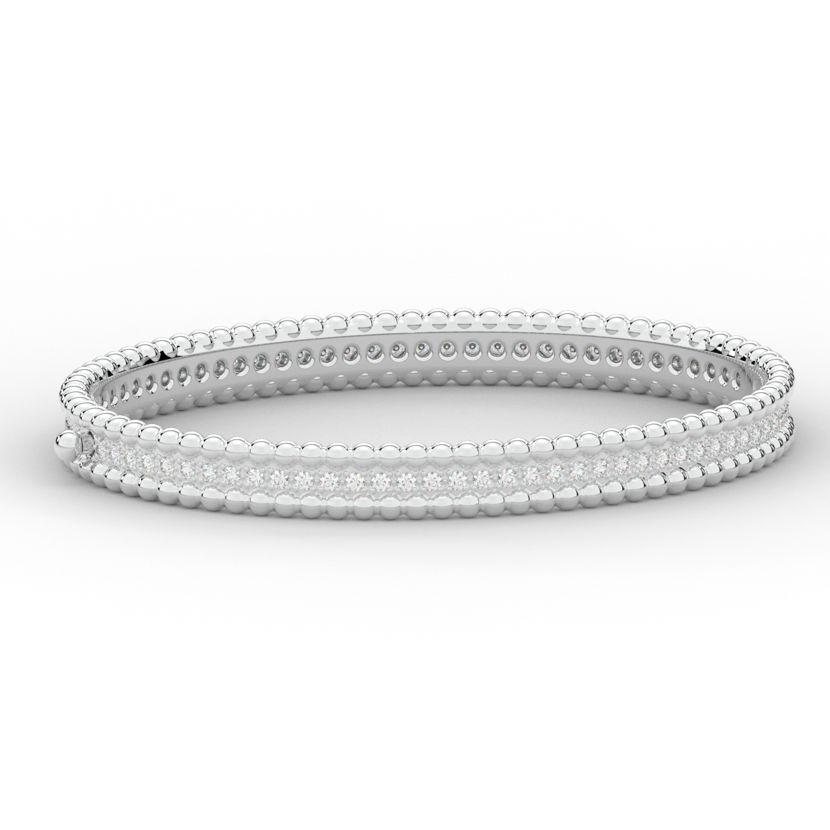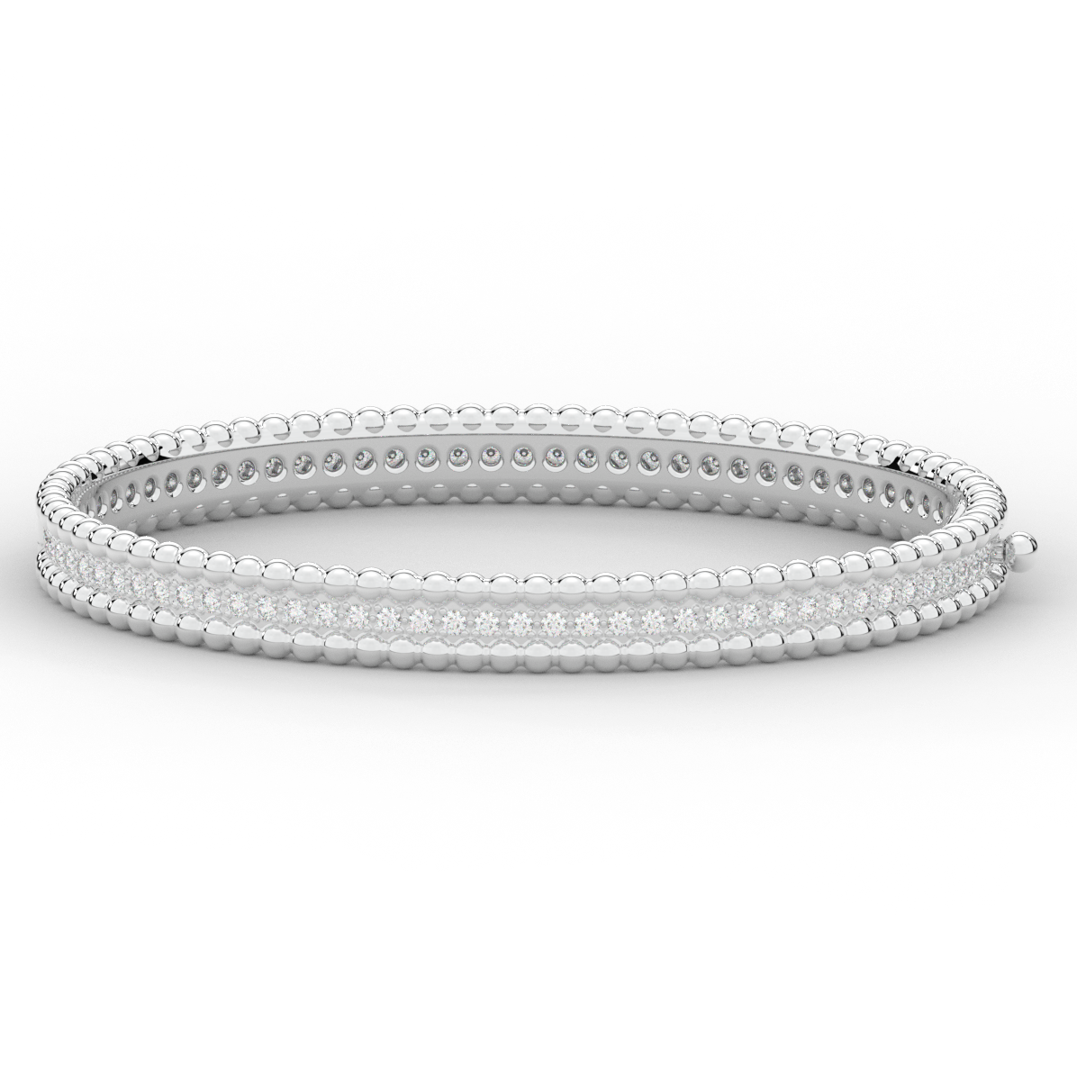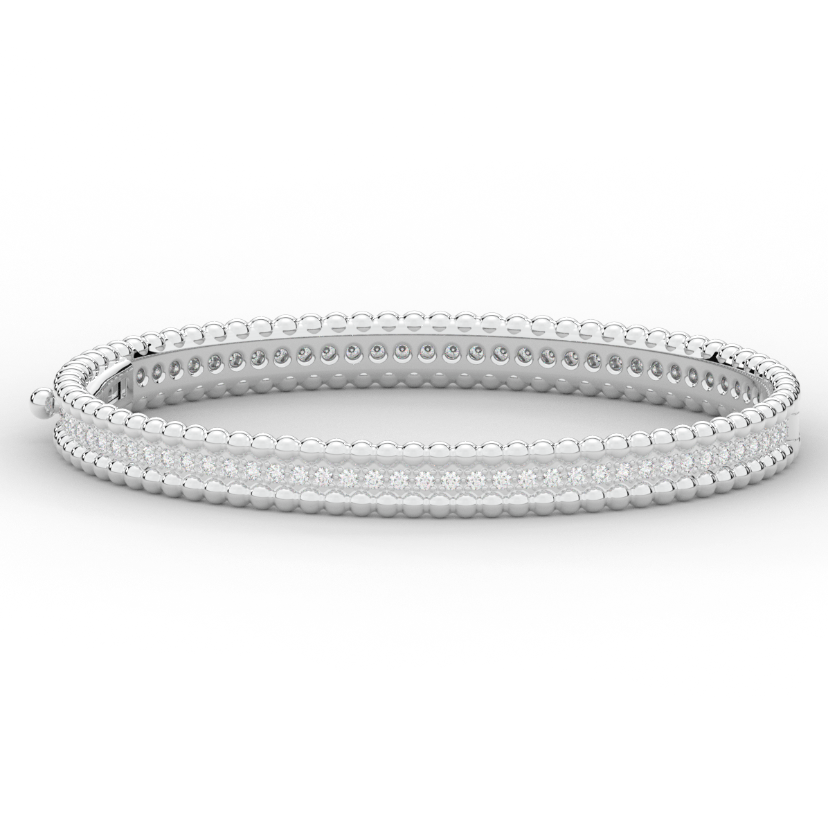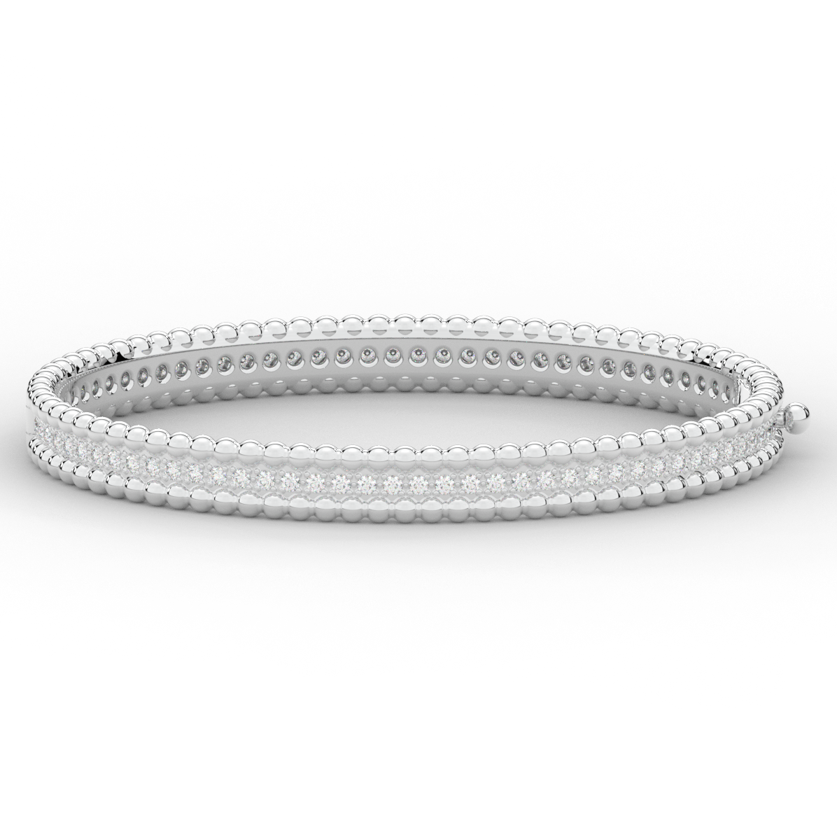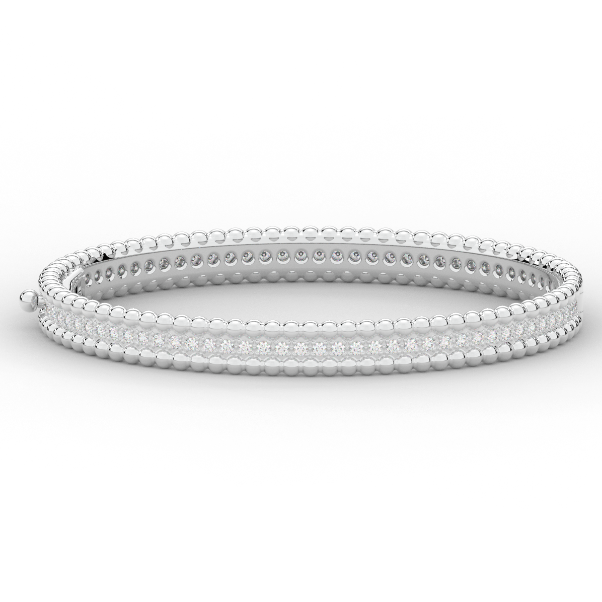 This beautiful bangle features bright round lab grown diamonds, prong set in an eternity style, flanked on either side by stylized beads for a truly unique bangle. This bangle also features a second catch on the latch for security. This bangle is available in 14k white, yellow, or rose gold.