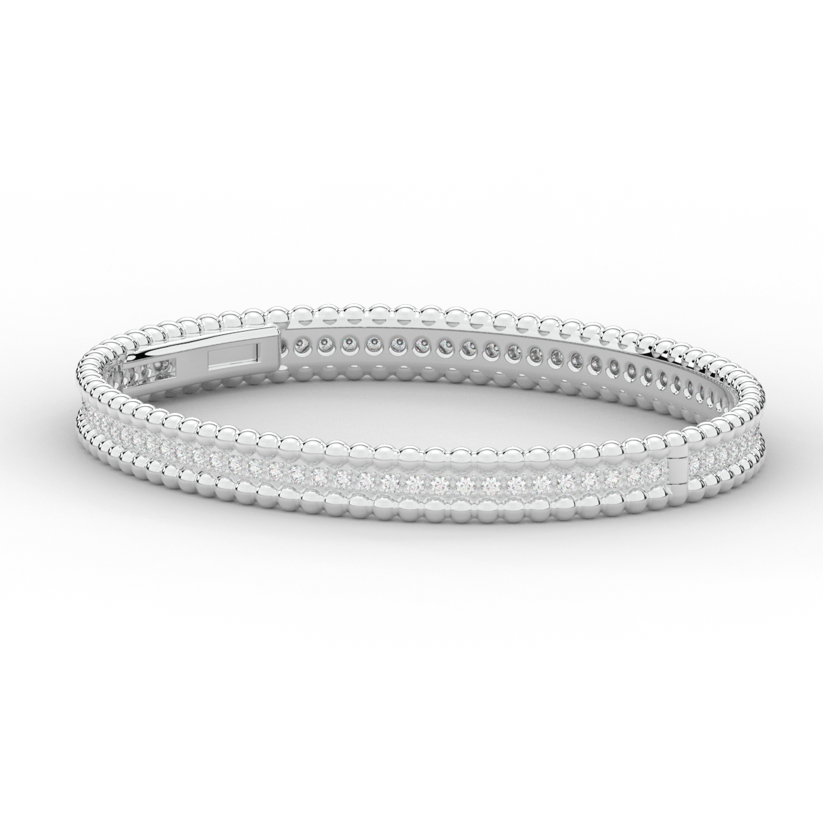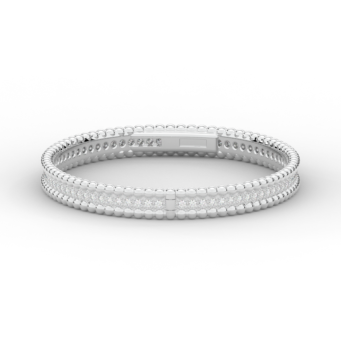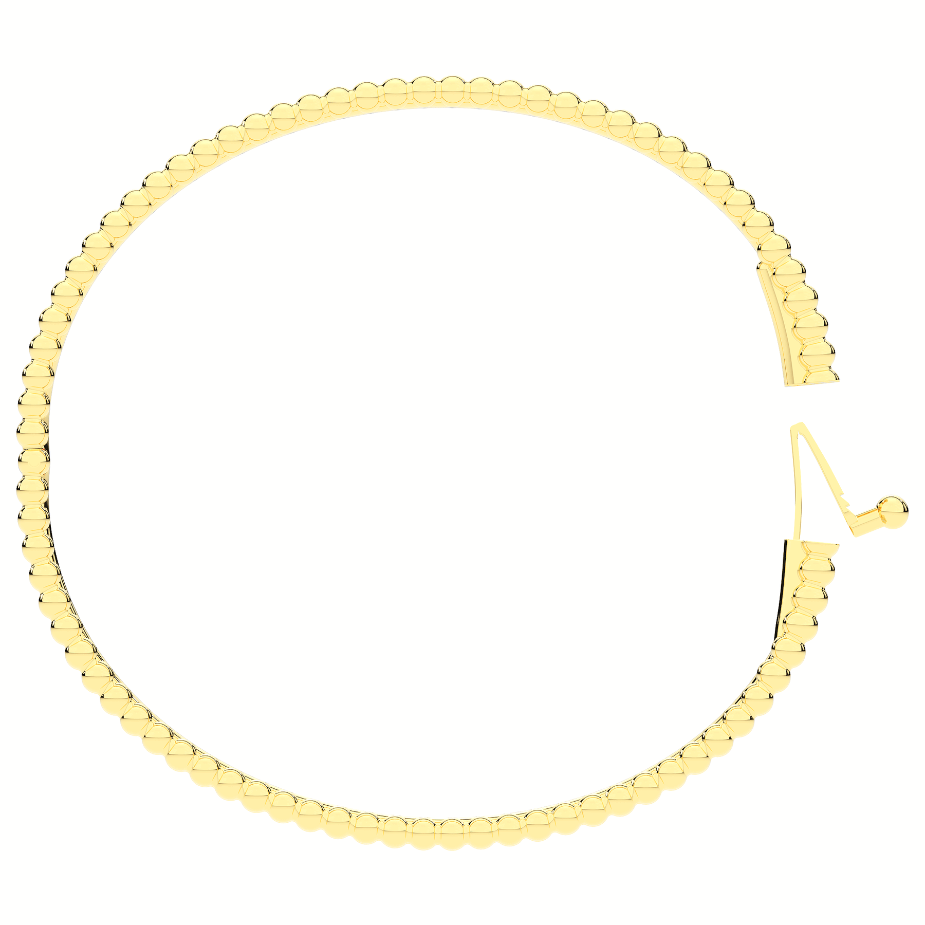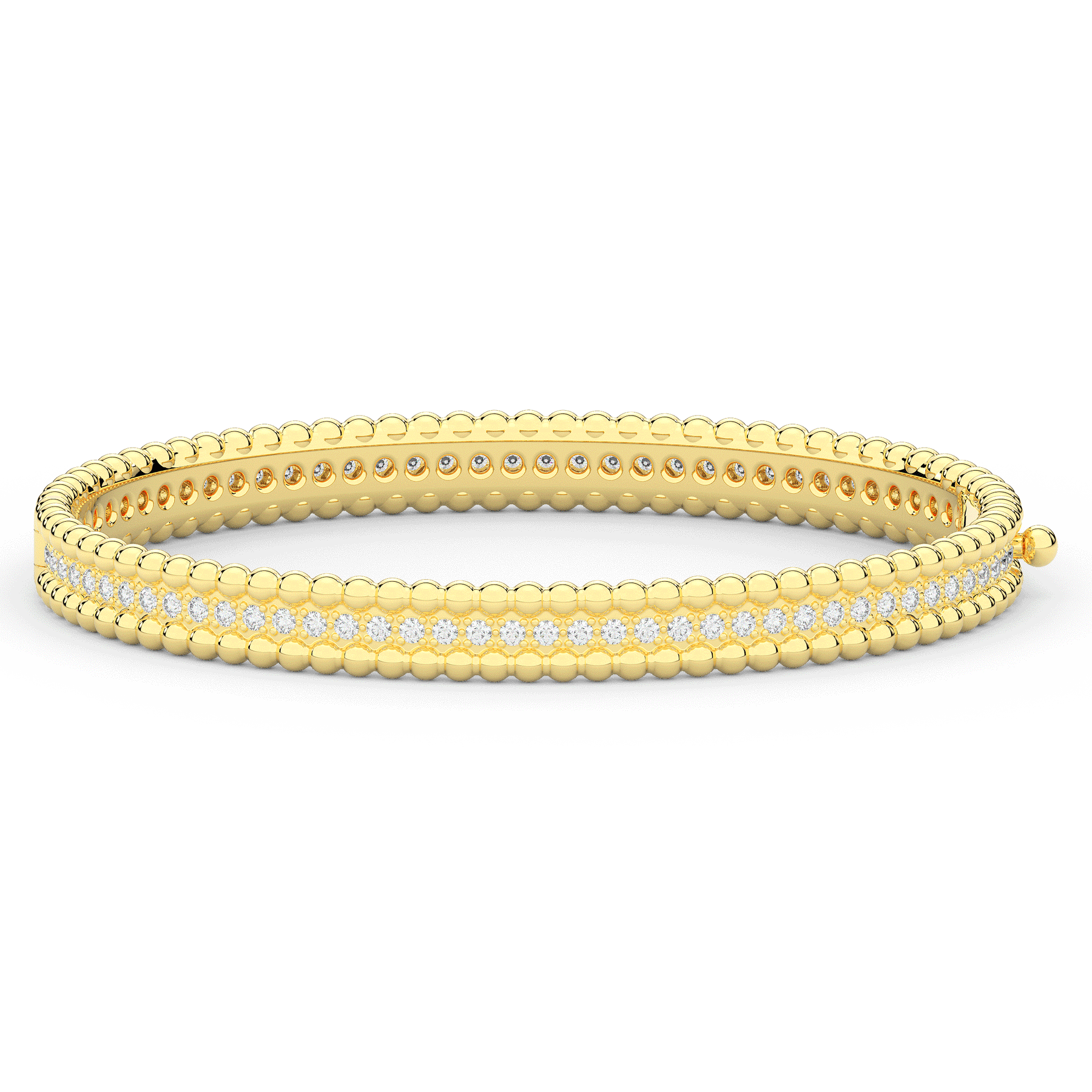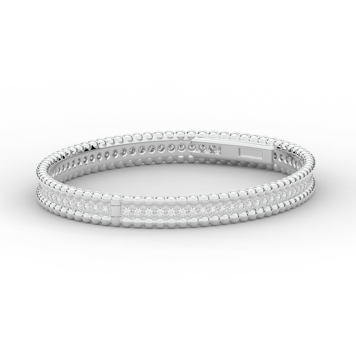 This beautiful bangle features bright round lab grown diamonds, prong set in an eternity style, flanked on either side by stylized beads for a truly unique bangle. This bangle also features a second catch on the latch for security. This bangle is available in 14k white, yellow, or rose gold.