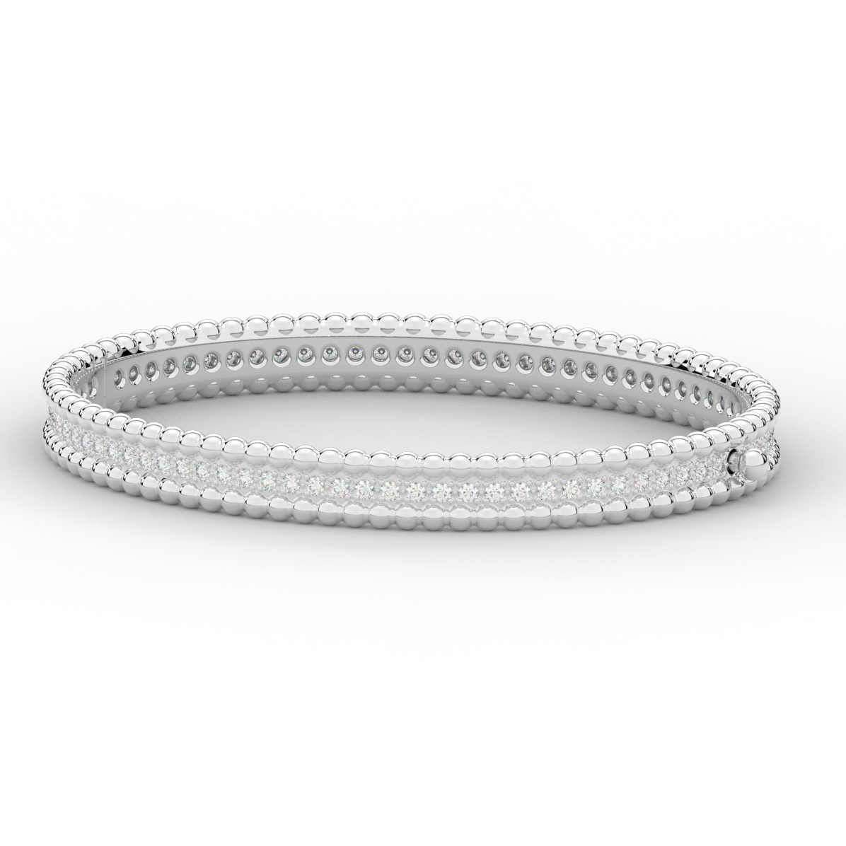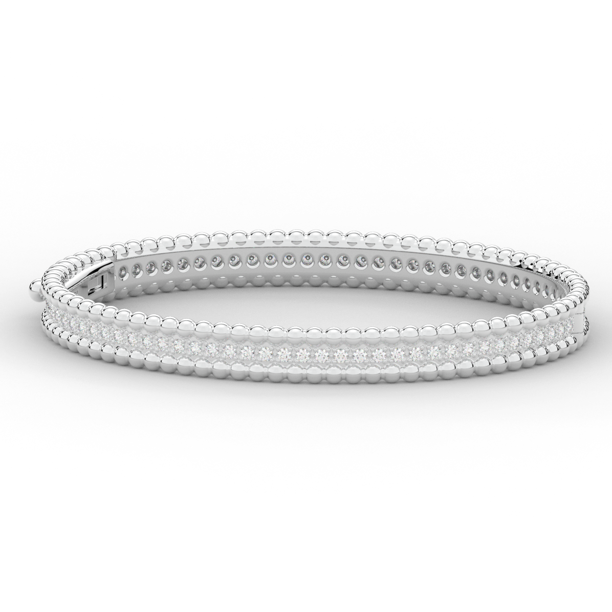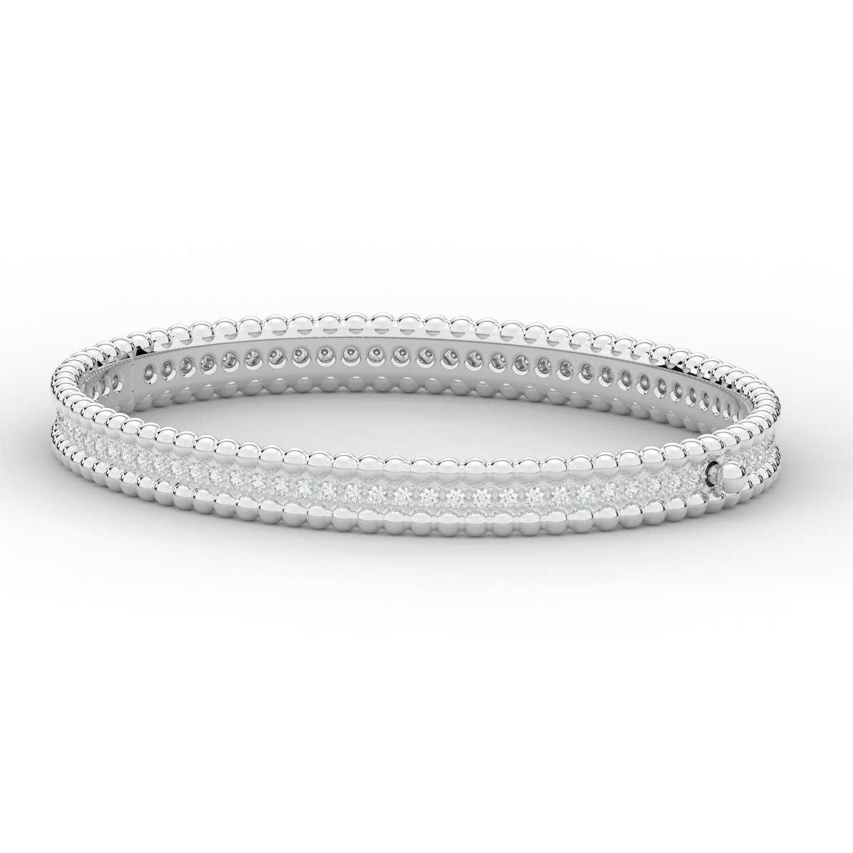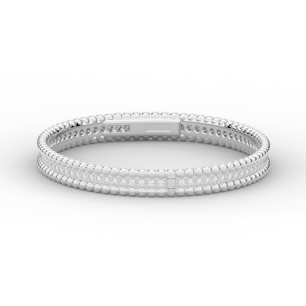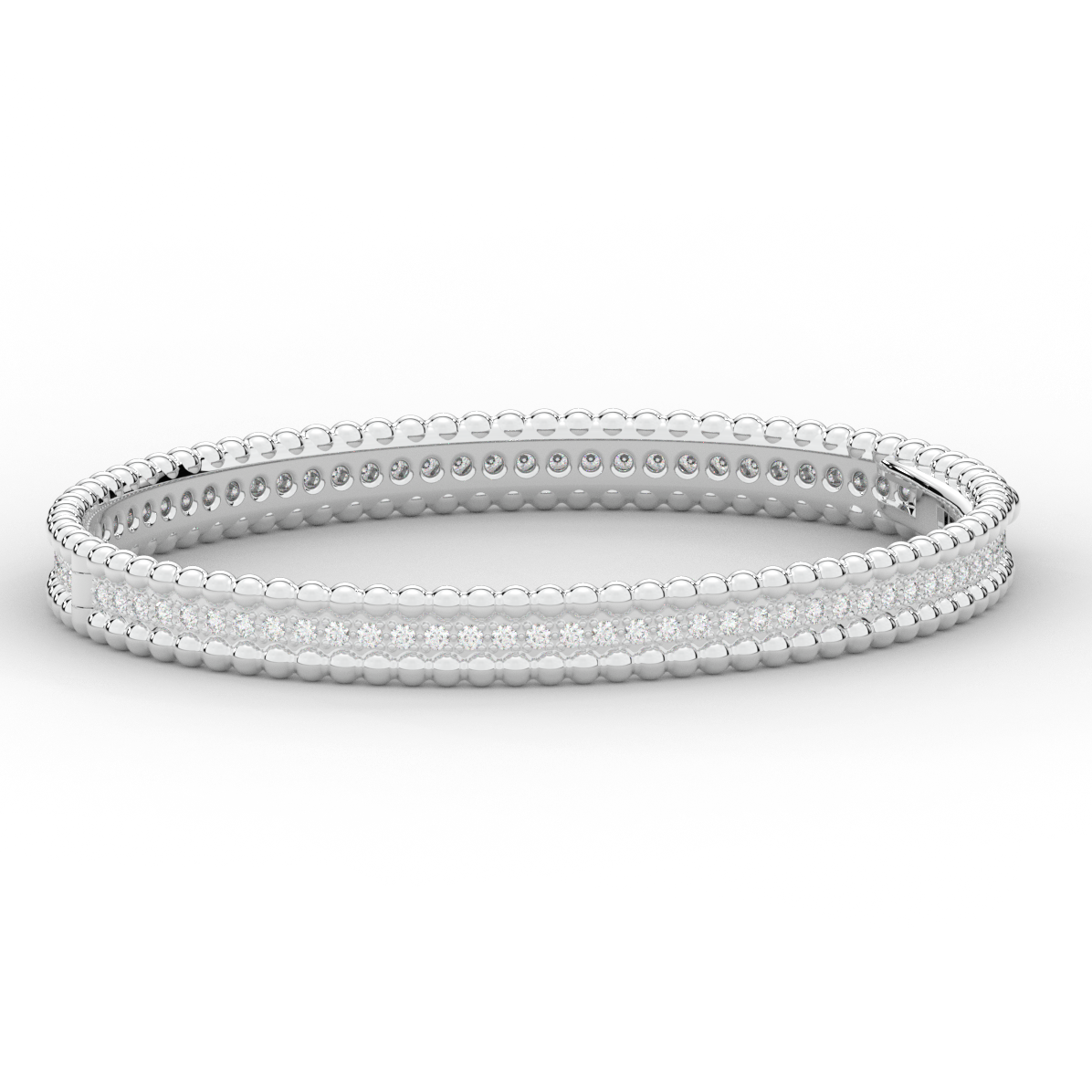 This beautiful bangle features bright round lab grown diamonds, prong set in an eternity style, flanked on either side by stylized beads for a truly unique bangle. This bangle also features a second catch on the latch for security. This bangle is available in 14k white, yellow, or rose gold.