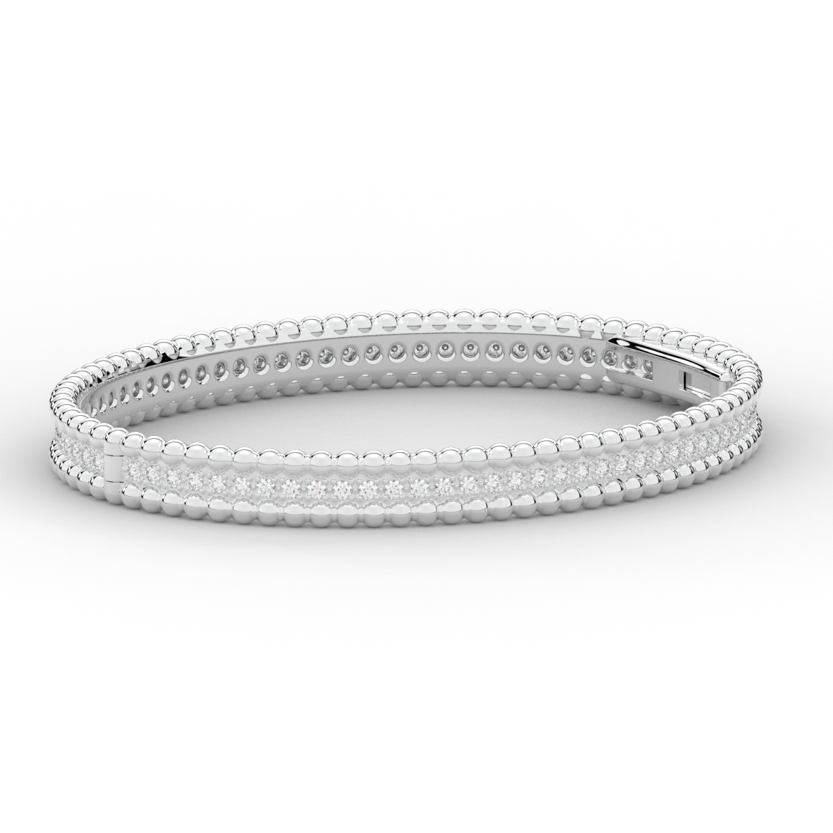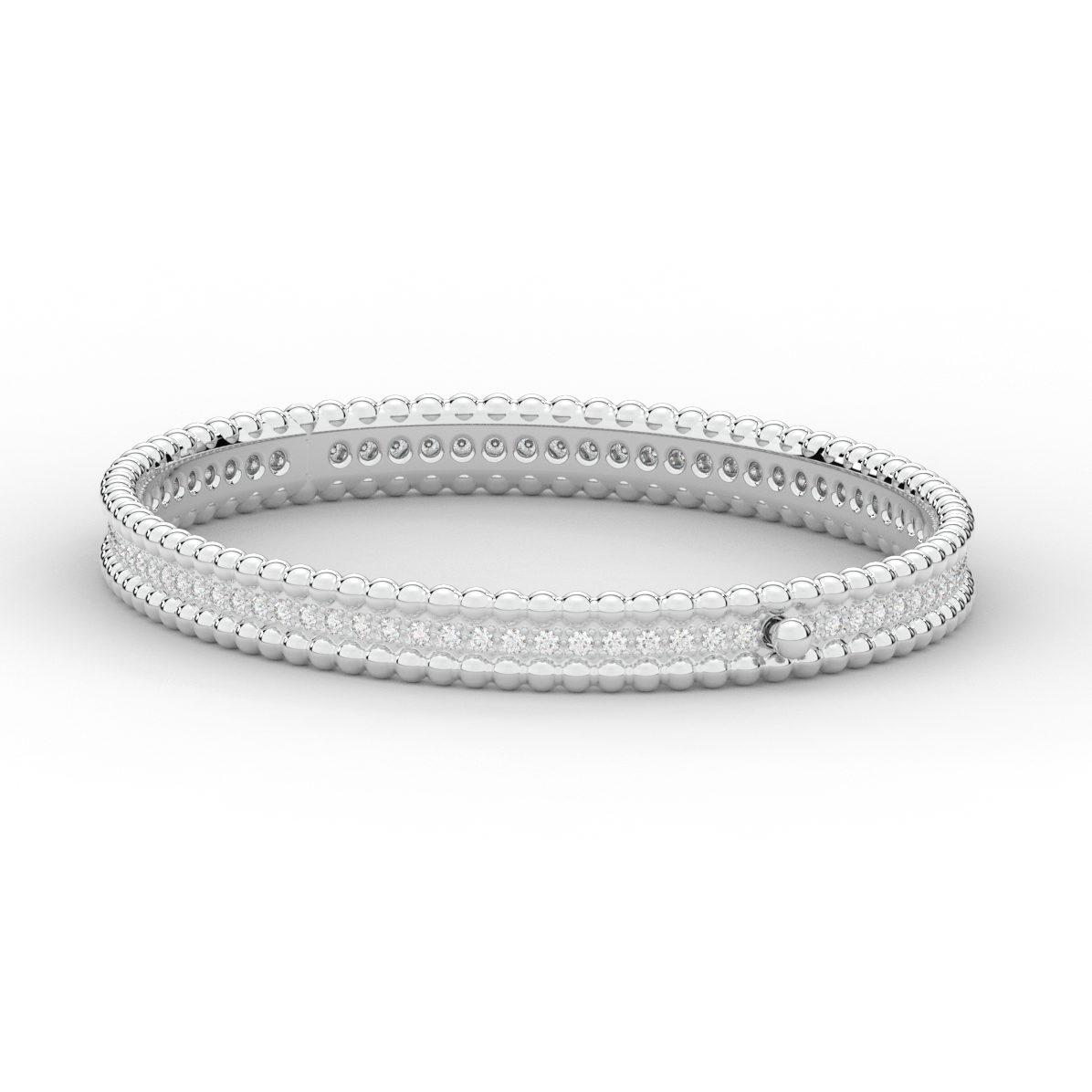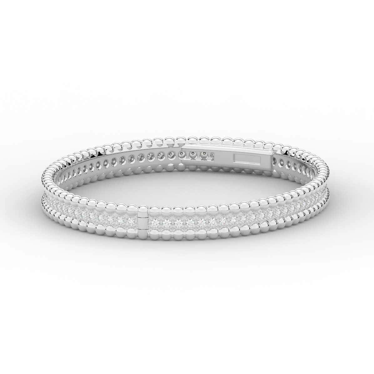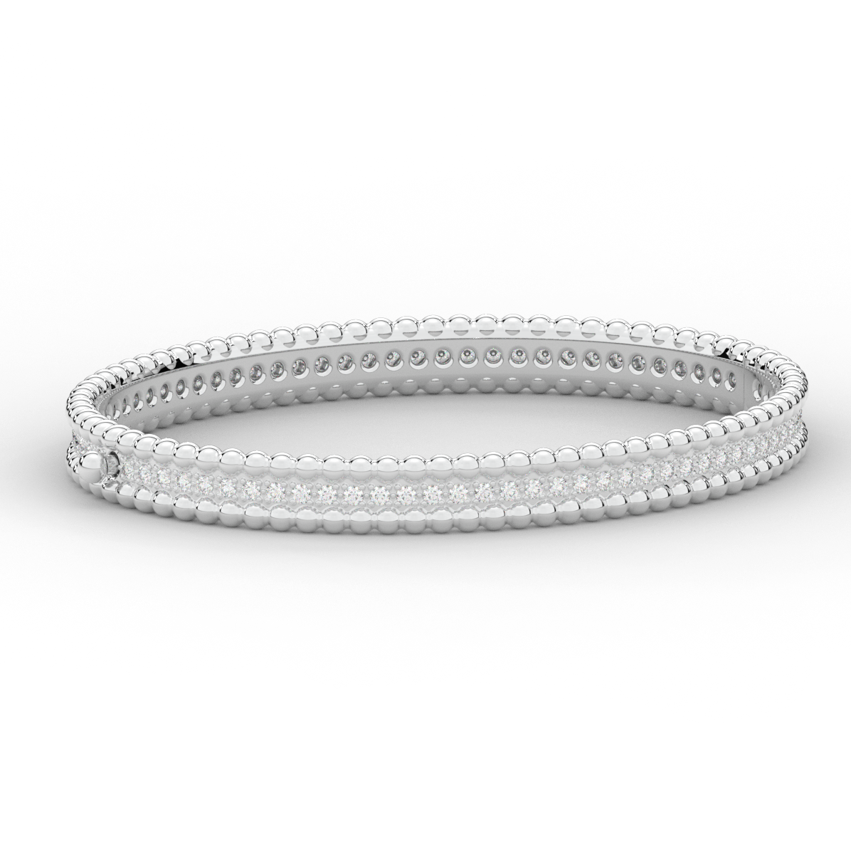 This beautiful bangle features bright round lab grown diamonds, prong set in an eternity style, flanked on either side by stylized beads for a truly unique bangle. This bangle also features a second catch on the latch for security. This bangle is available in 14k white, yellow, or rose gold.