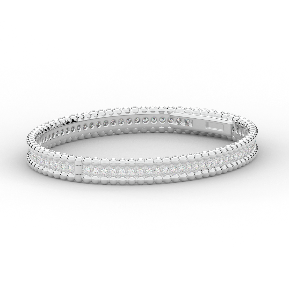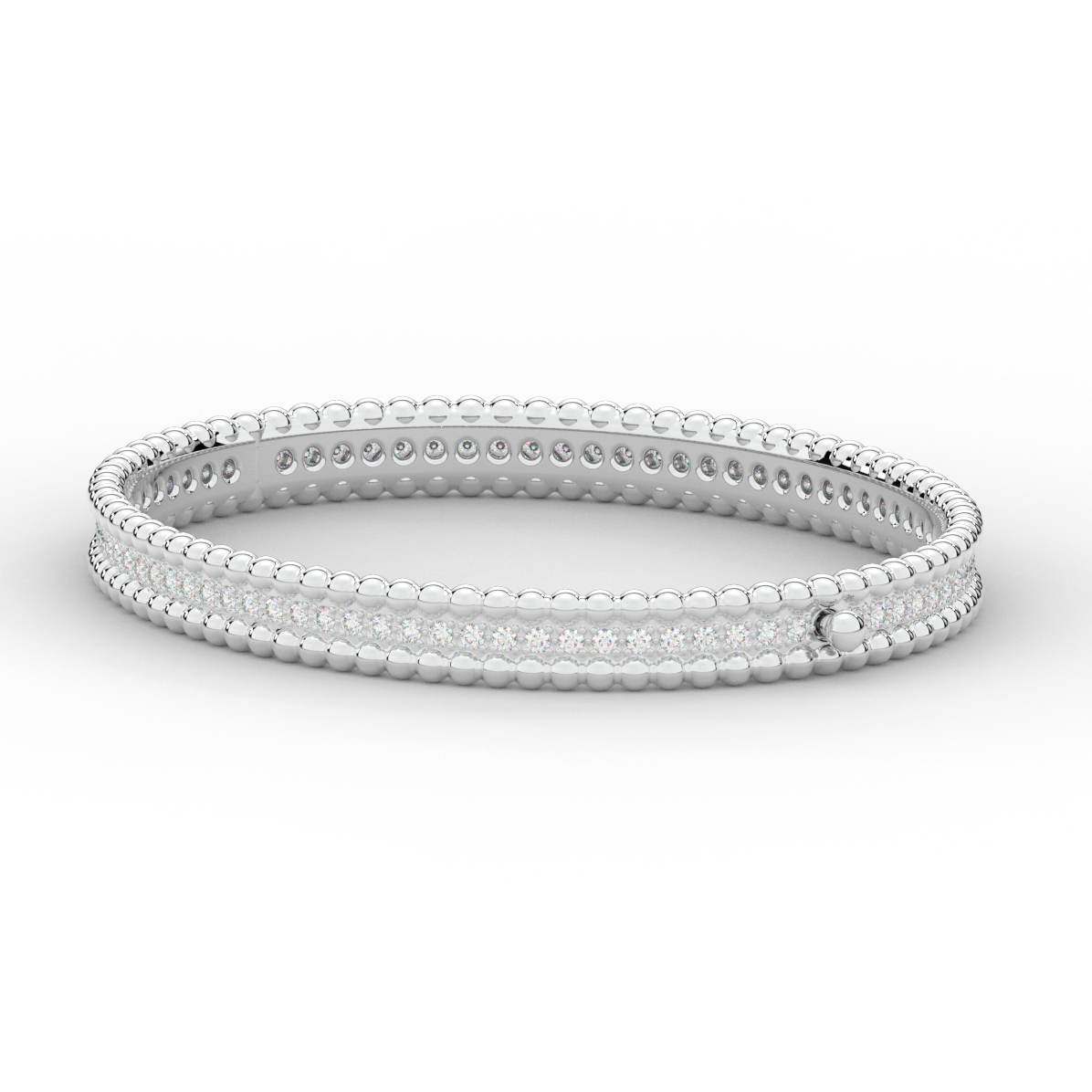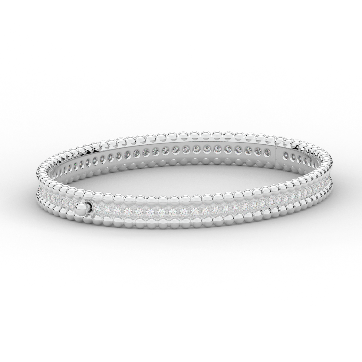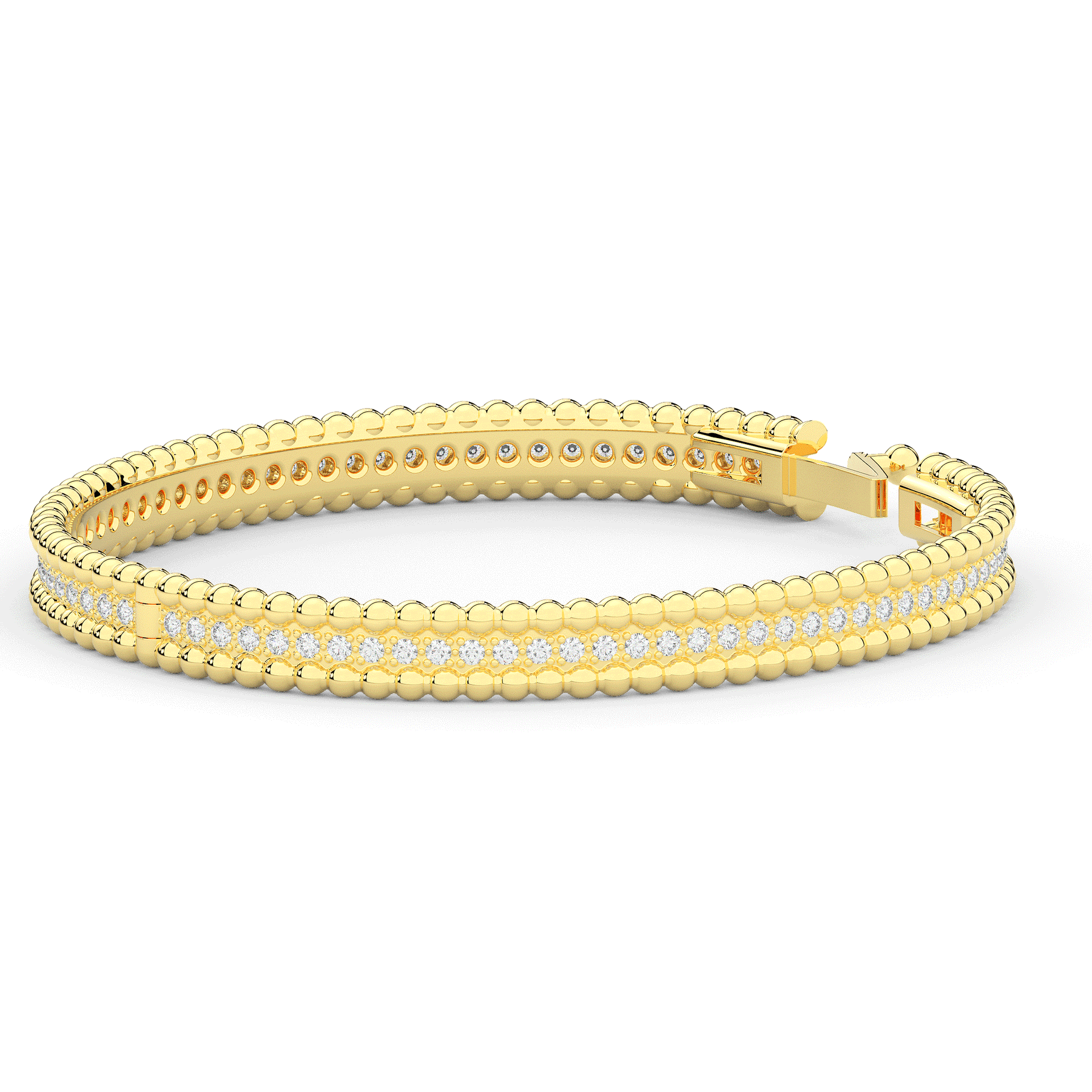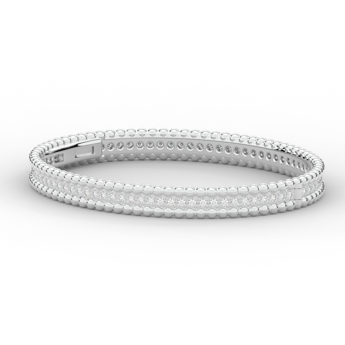 This beautiful bangle features bright round lab grown diamonds, prong set in an eternity style, flanked on either side by stylized beads for a truly unique bangle. This bangle also features a second catch on the latch for security. This bangle is available in 14k white, yellow, or rose gold.