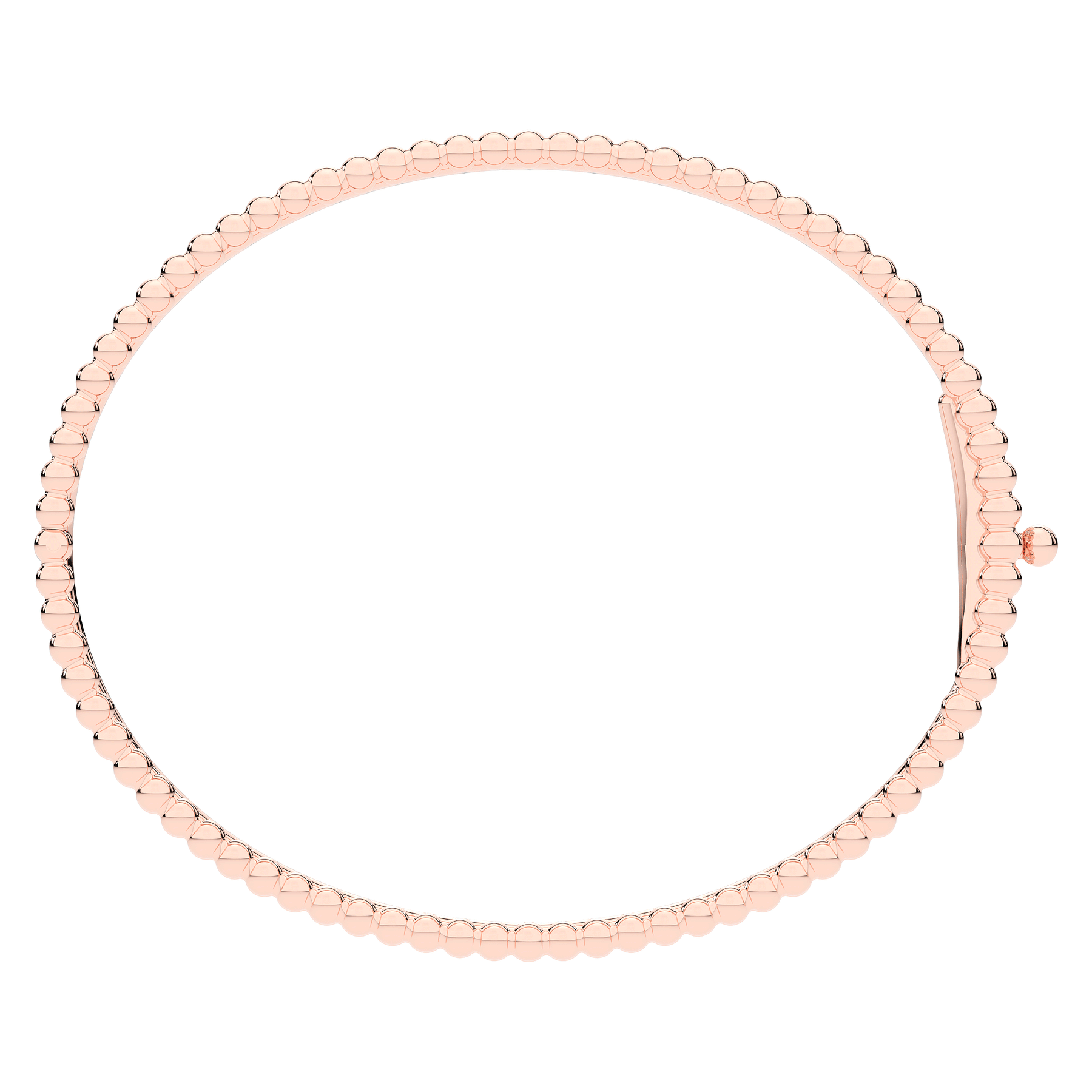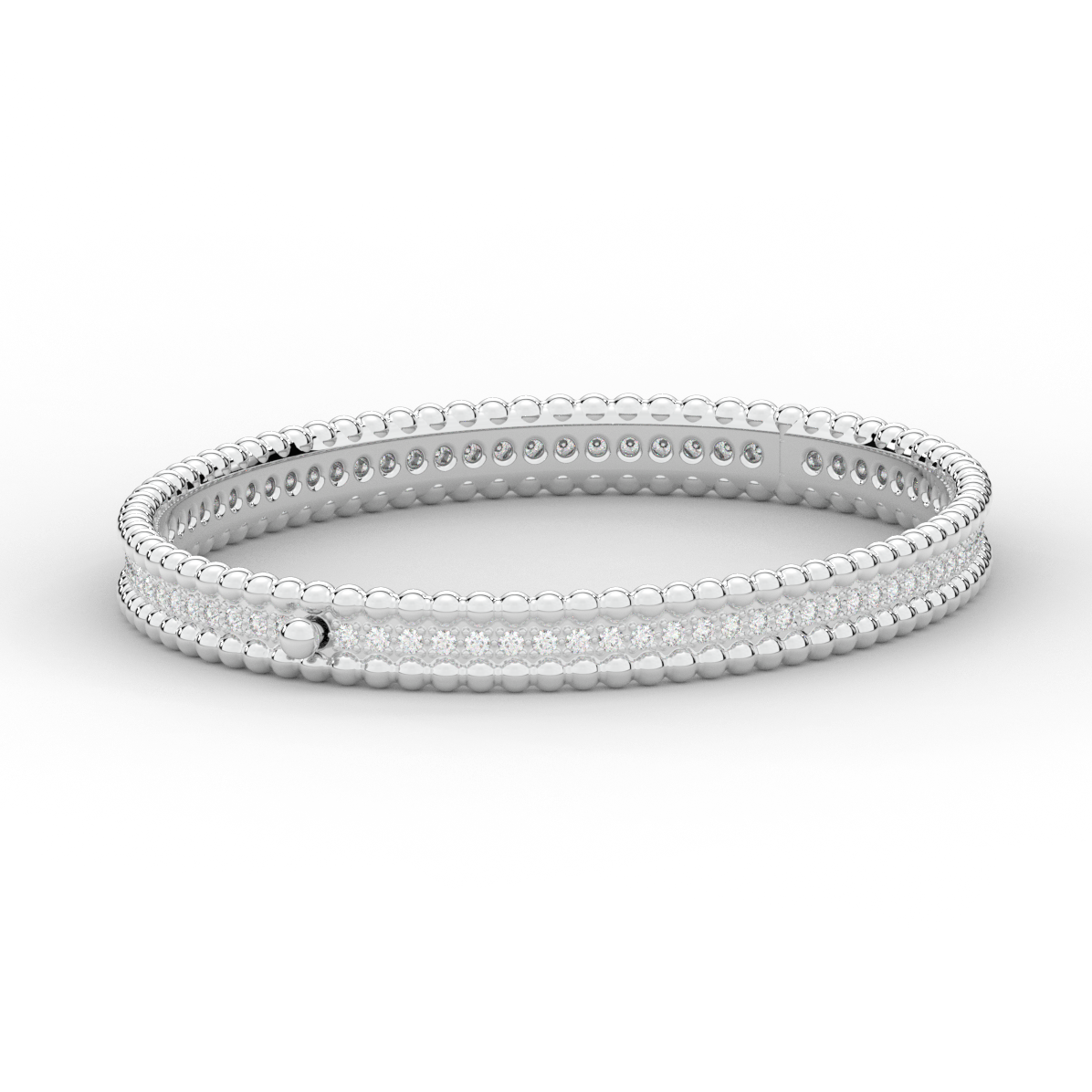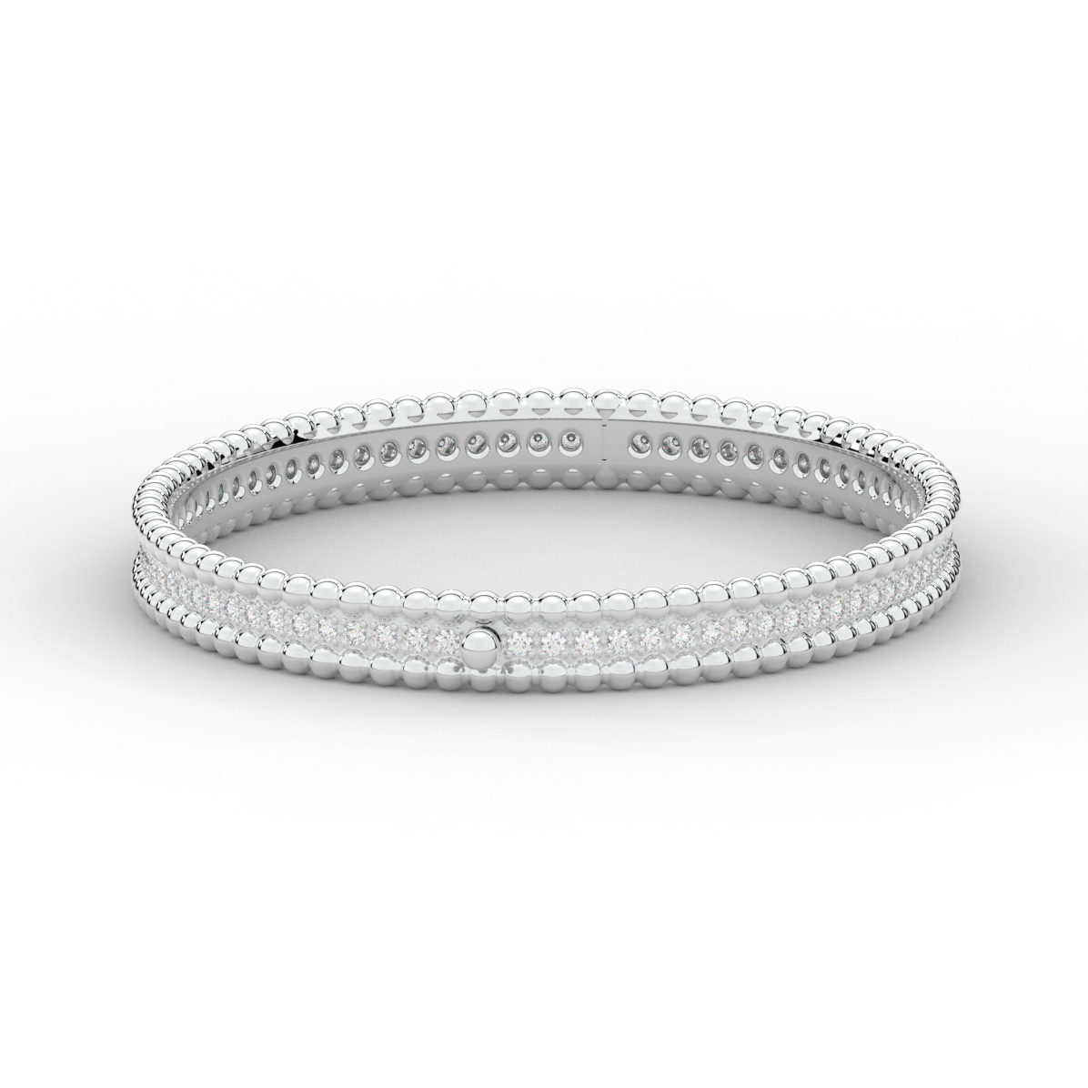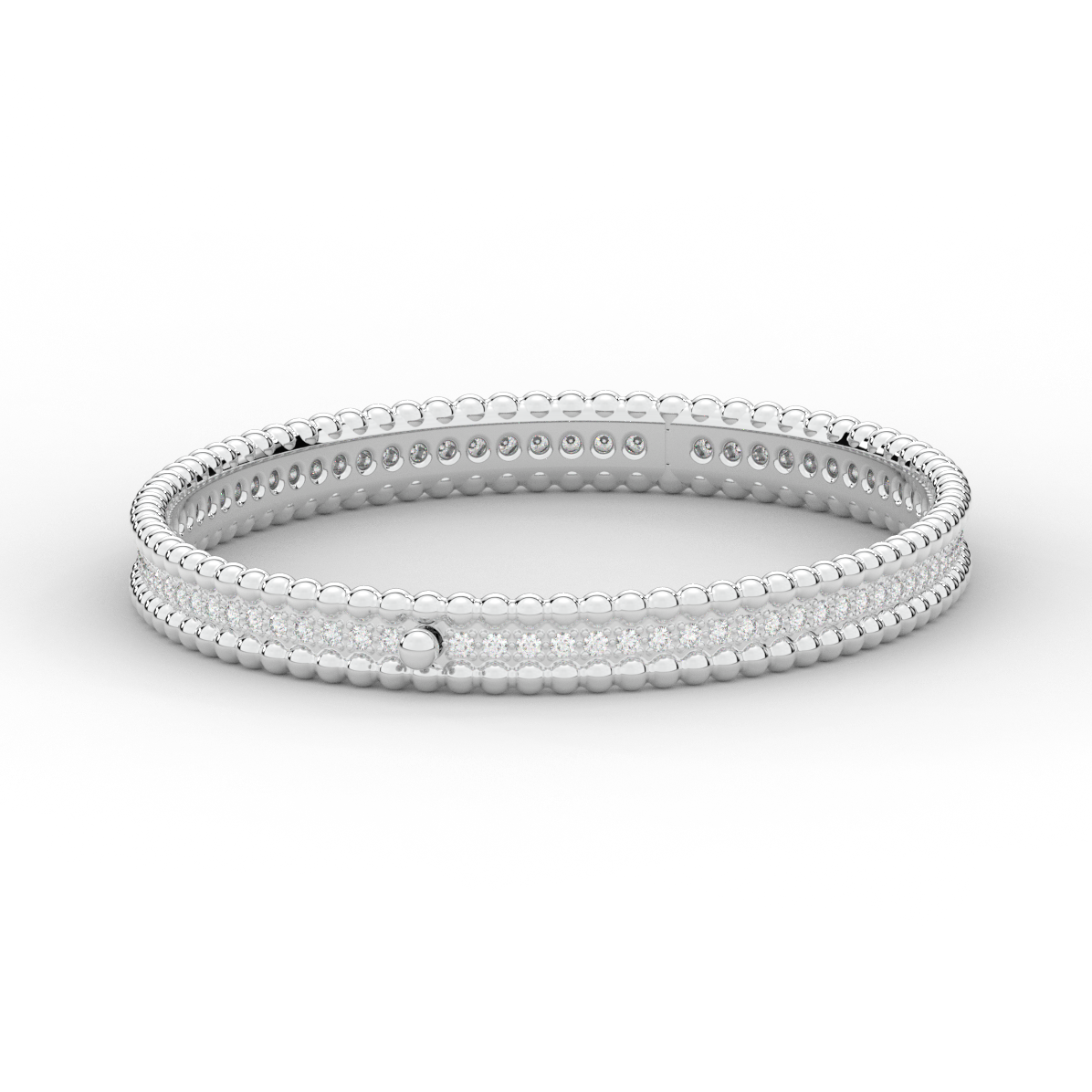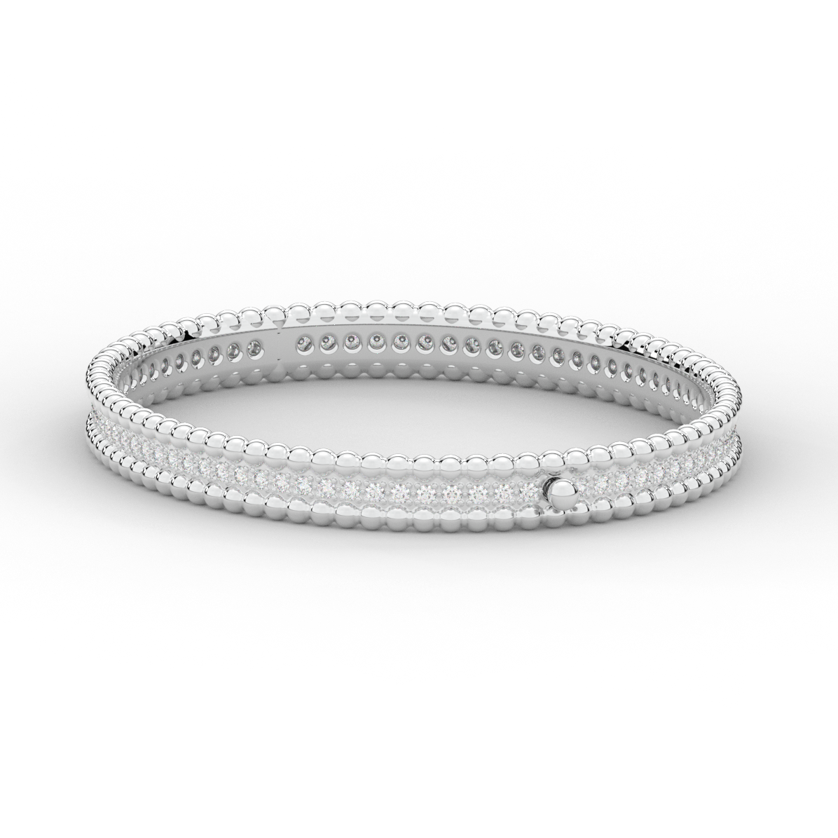 This beautiful bangle features bright round lab grown diamonds, prong set in an eternity style, flanked on either side by stylized beads for a truly unique bangle. This bangle also features a second catch on the latch for security. This bangle is available in 14k white, yellow, or rose gold.