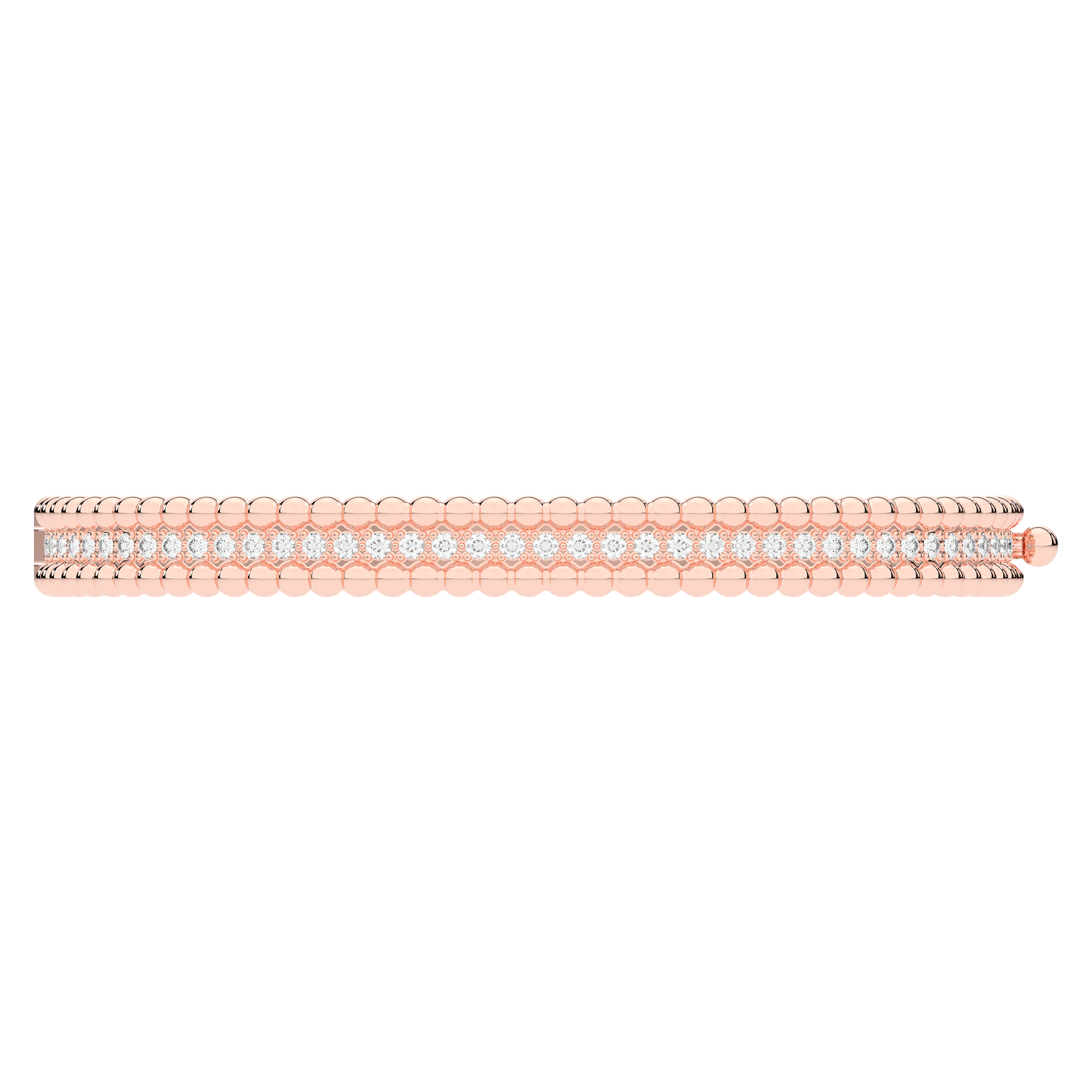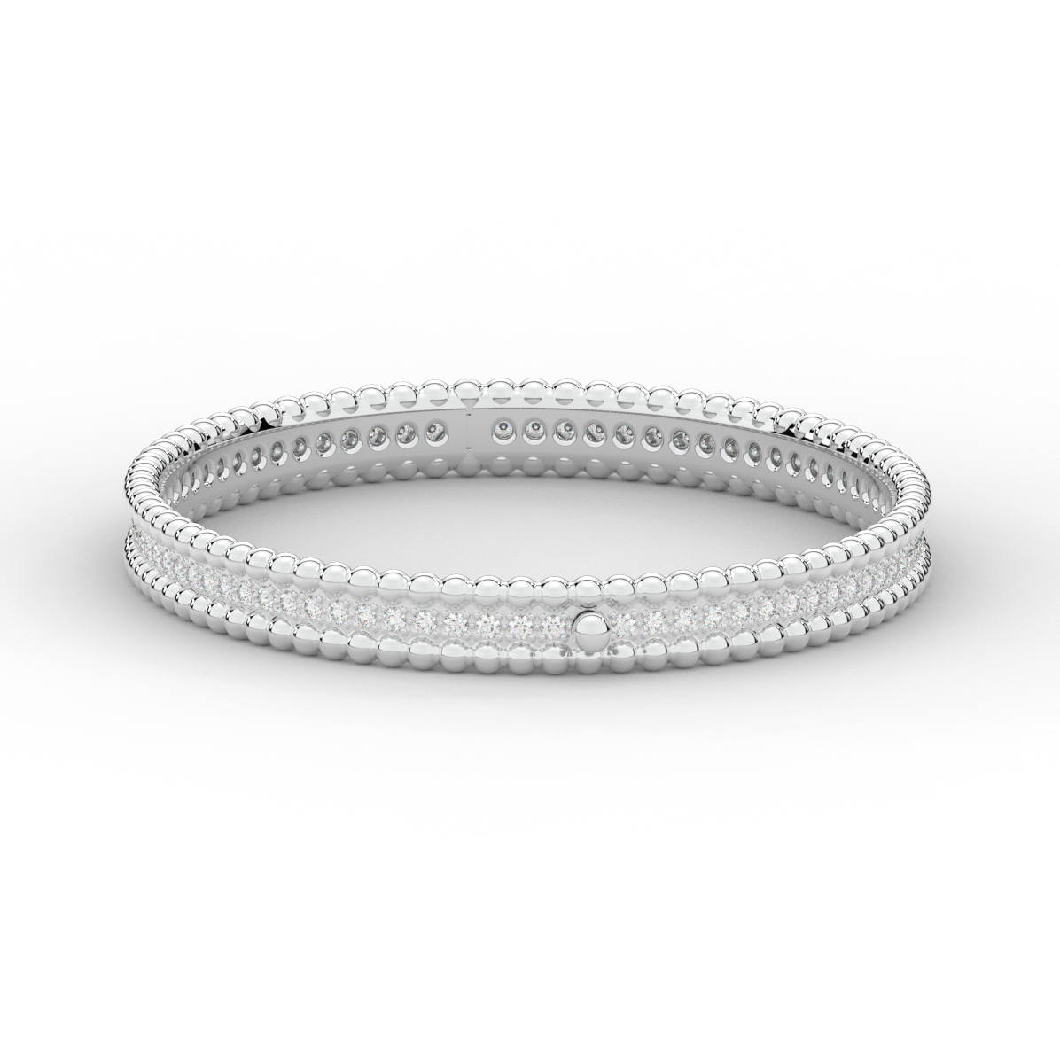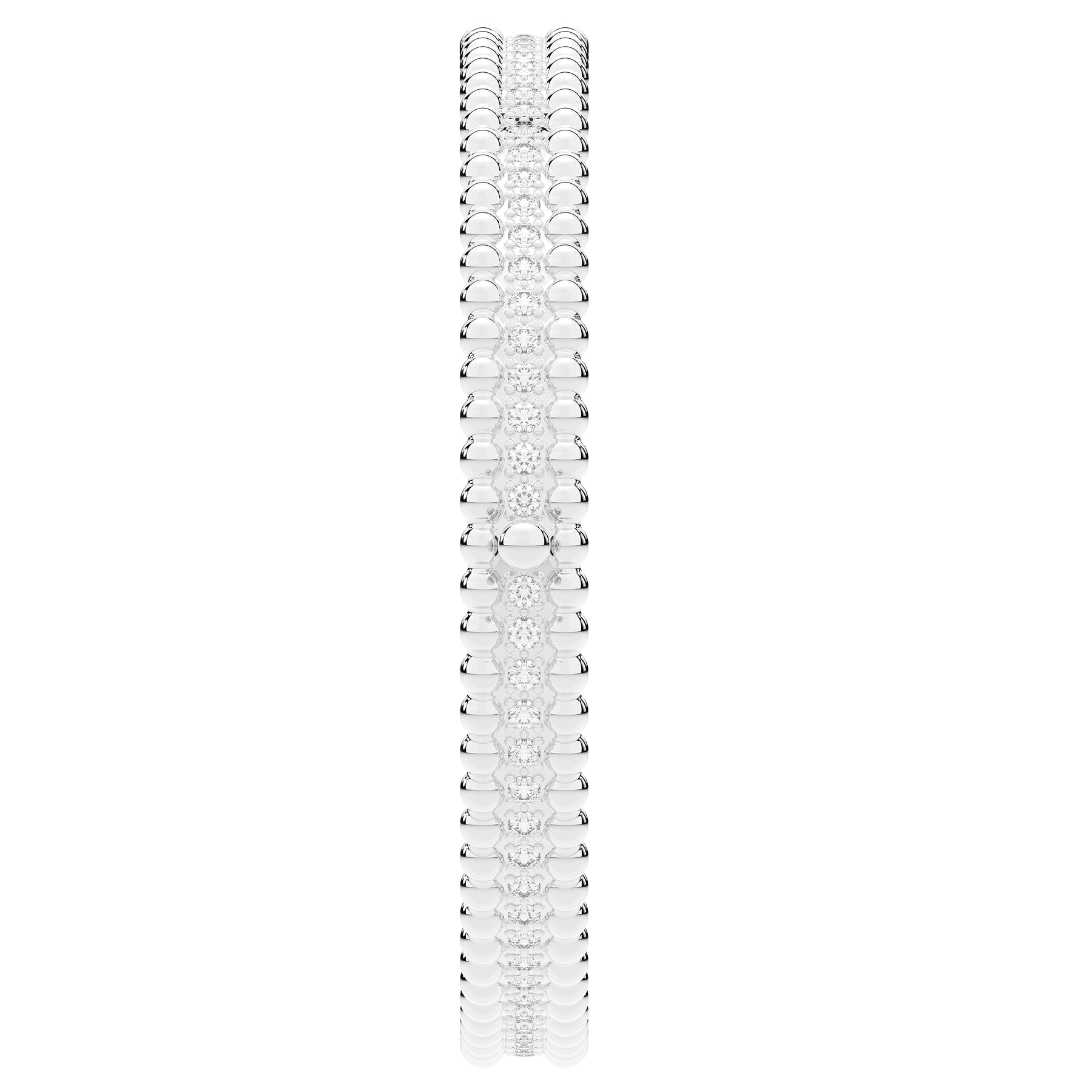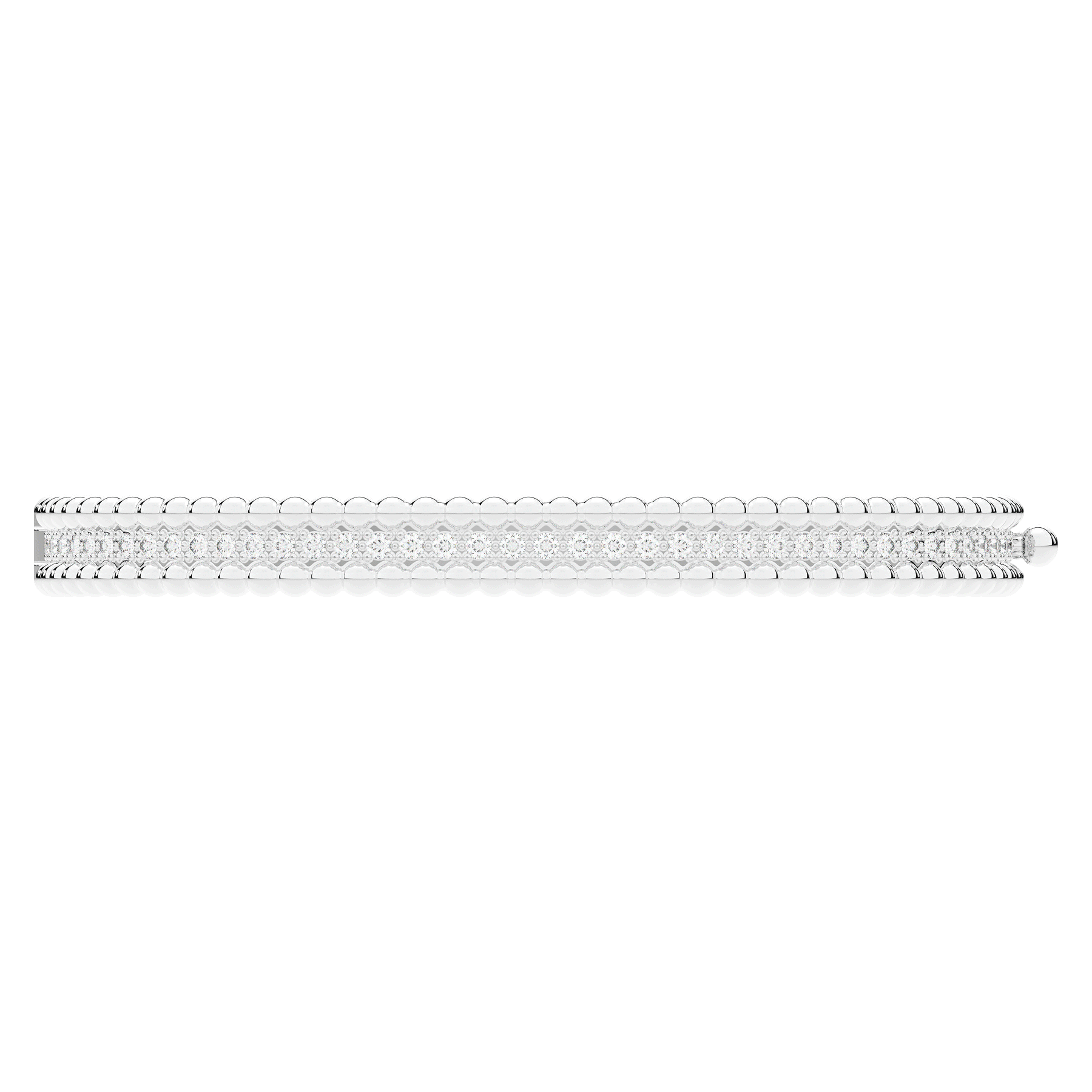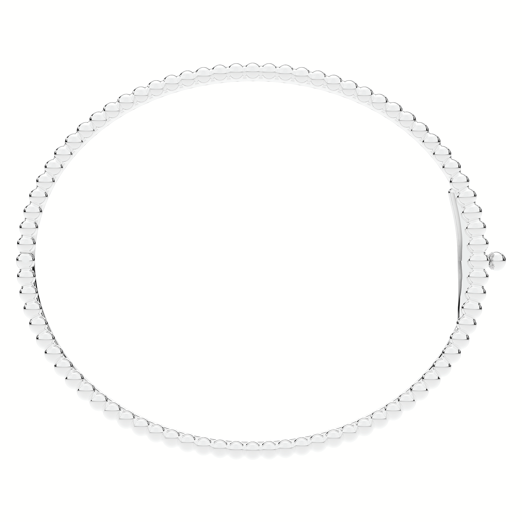 This beautiful bangle features bright round lab grown diamonds, prong set in an eternity style, flanked on either side by stylized beads for a truly unique bangle. This bangle also features a second catch on the latch for security. This bangle is available in 14k white, yellow, or rose gold.