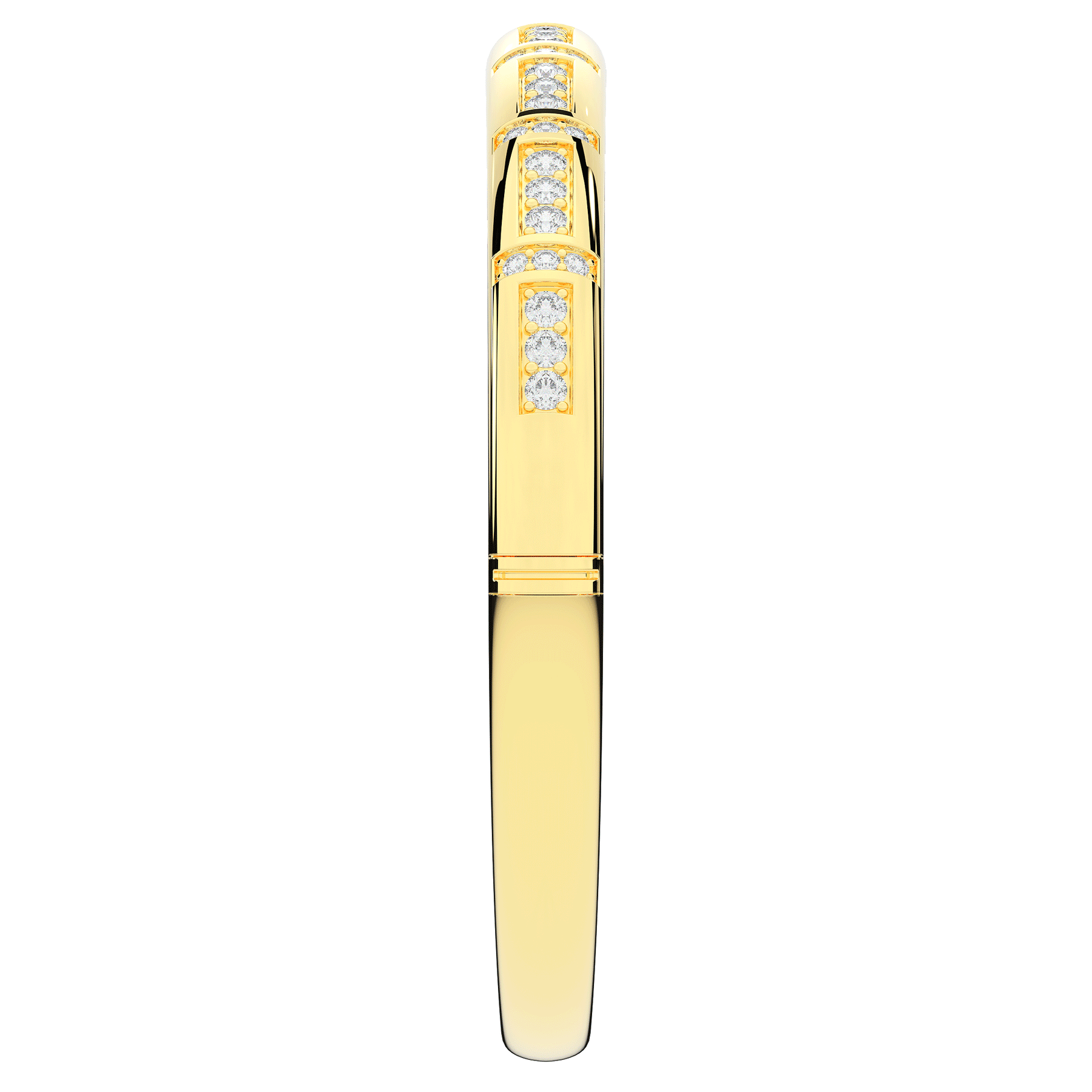 This stunning bangle features bright round lab grown diamonds in groups of three prong set in alternating channels, and a latch that has a second catch for safety. This bangle is available in 14k white, yellow, or rose gold.