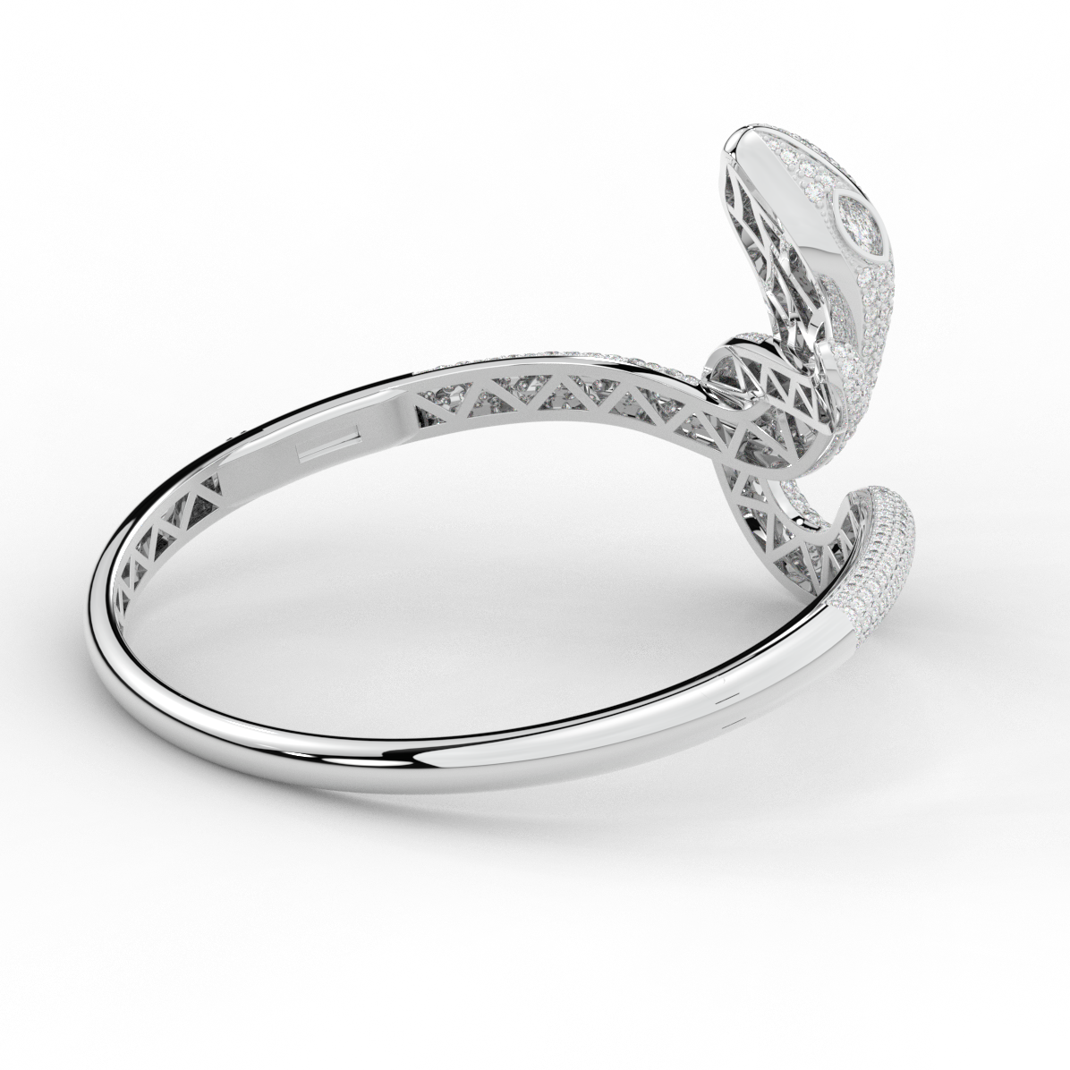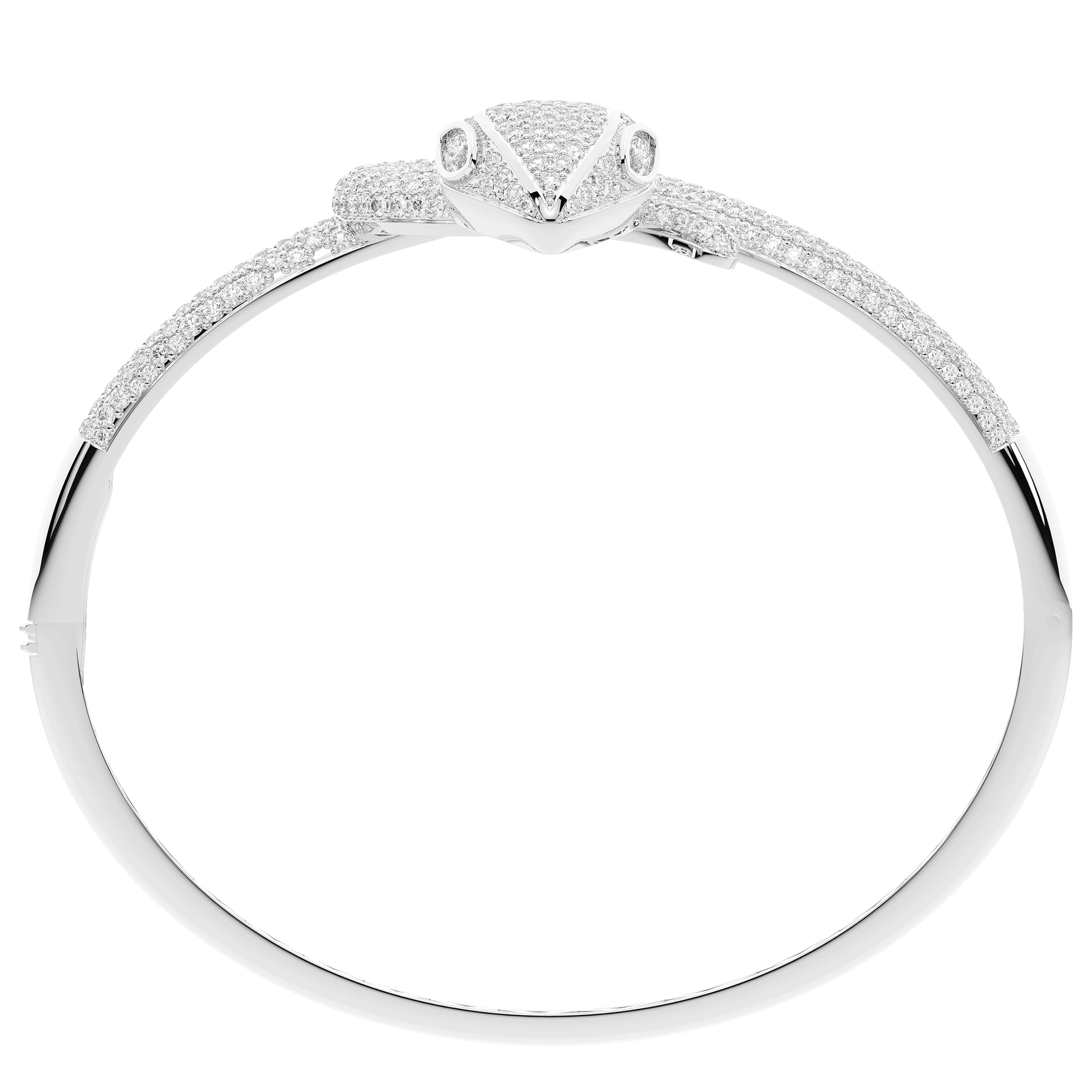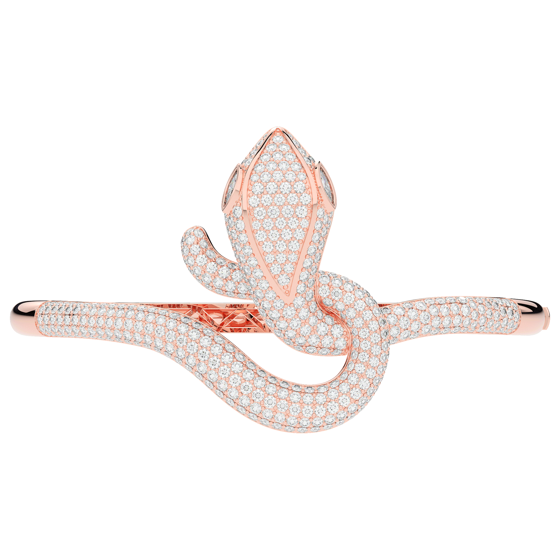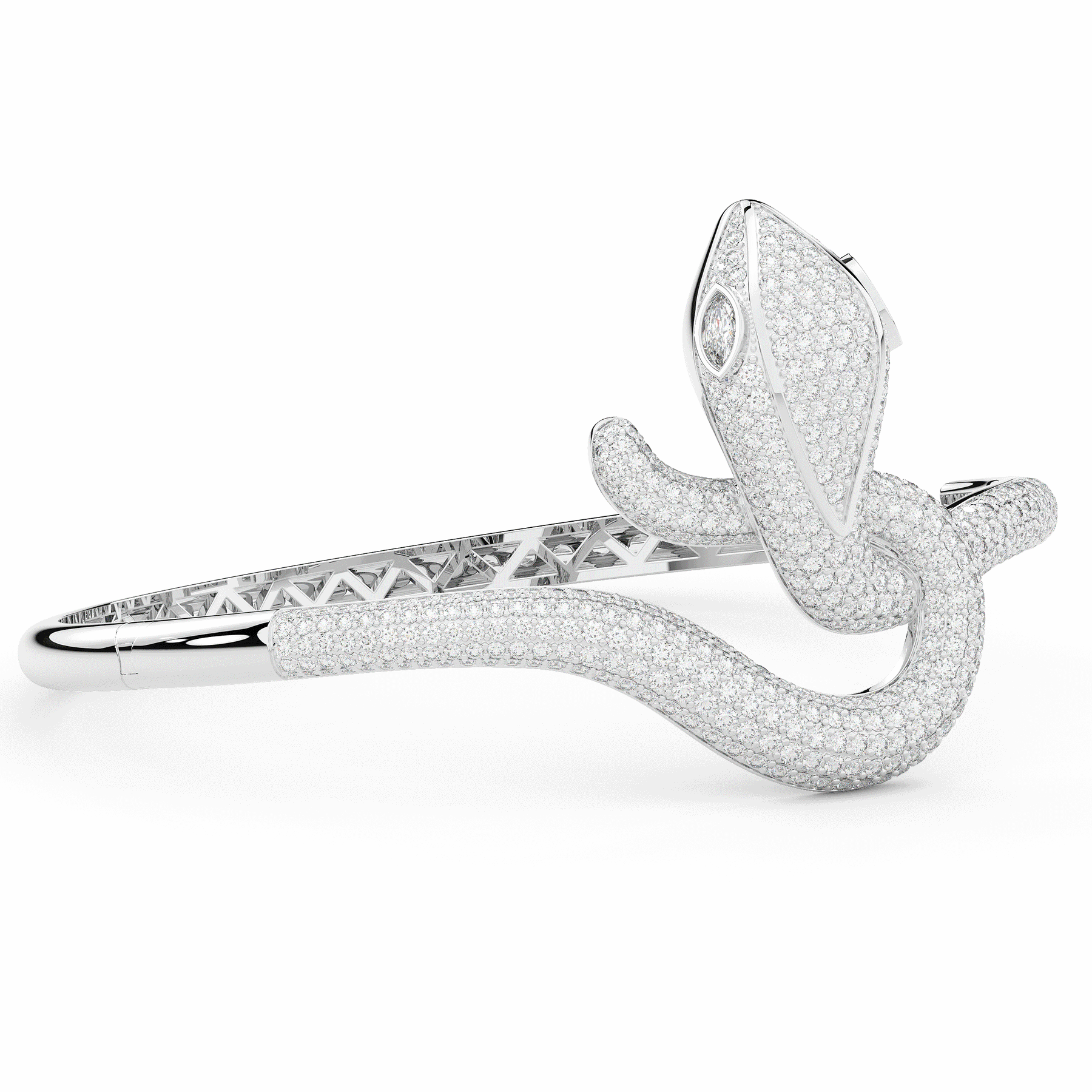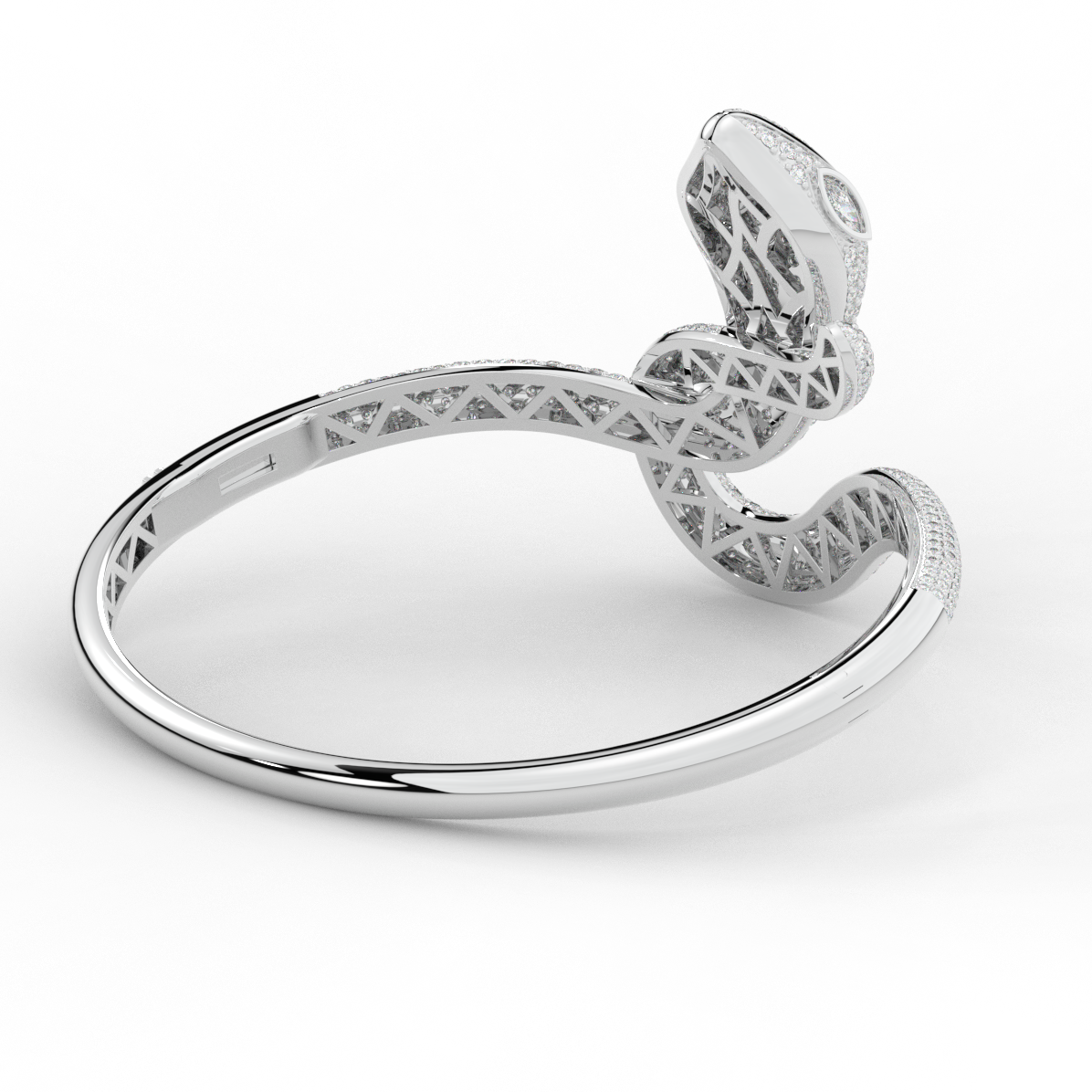 This stunning bangle is shaped like a snake with bright lab grown round diamonds accenting the shape as well as 2 larger pear shaped lab grown diamonds for the eyes. This bangle also features a latch that has a second catch for safety. This bangle is available in 14k white, yellow, or rose gold.