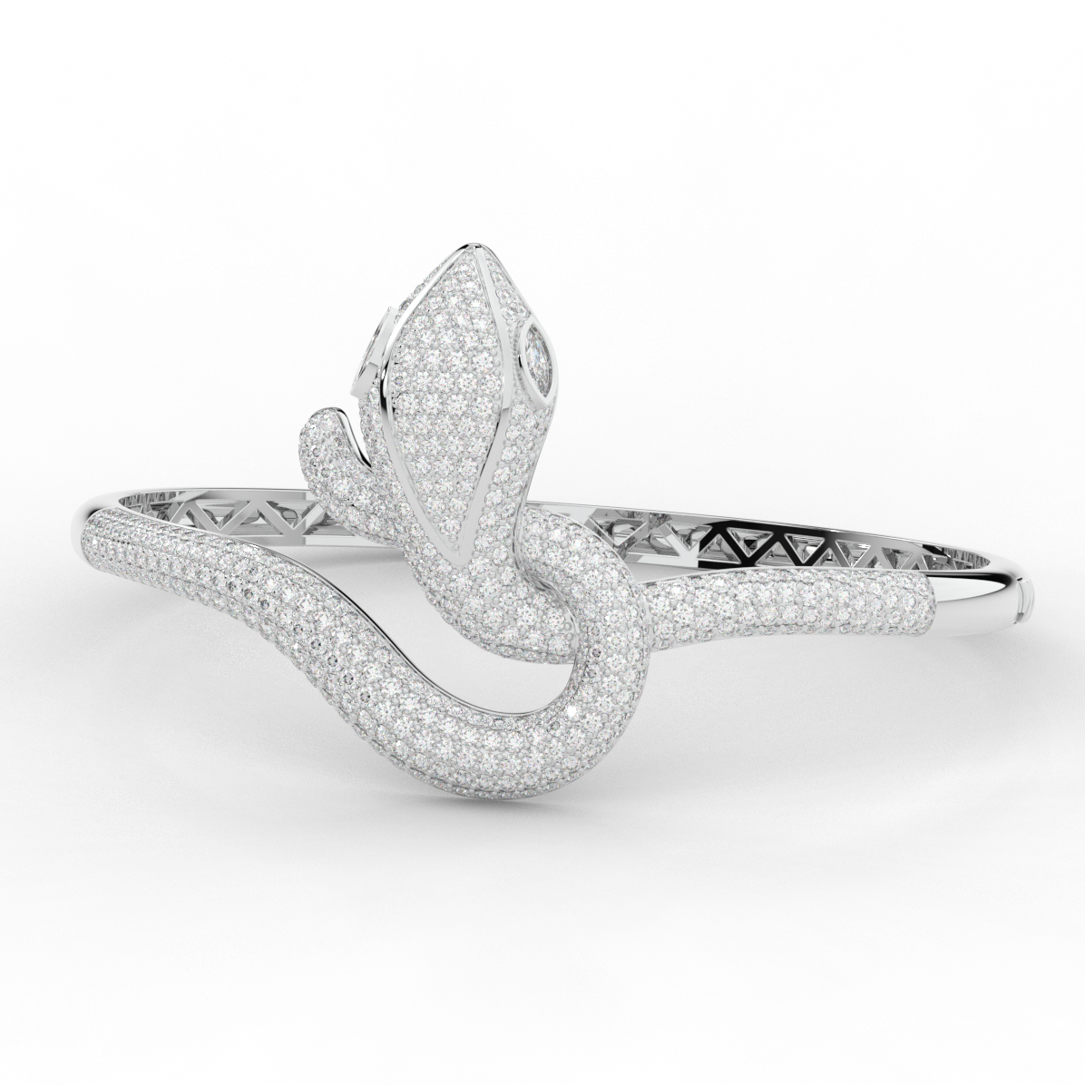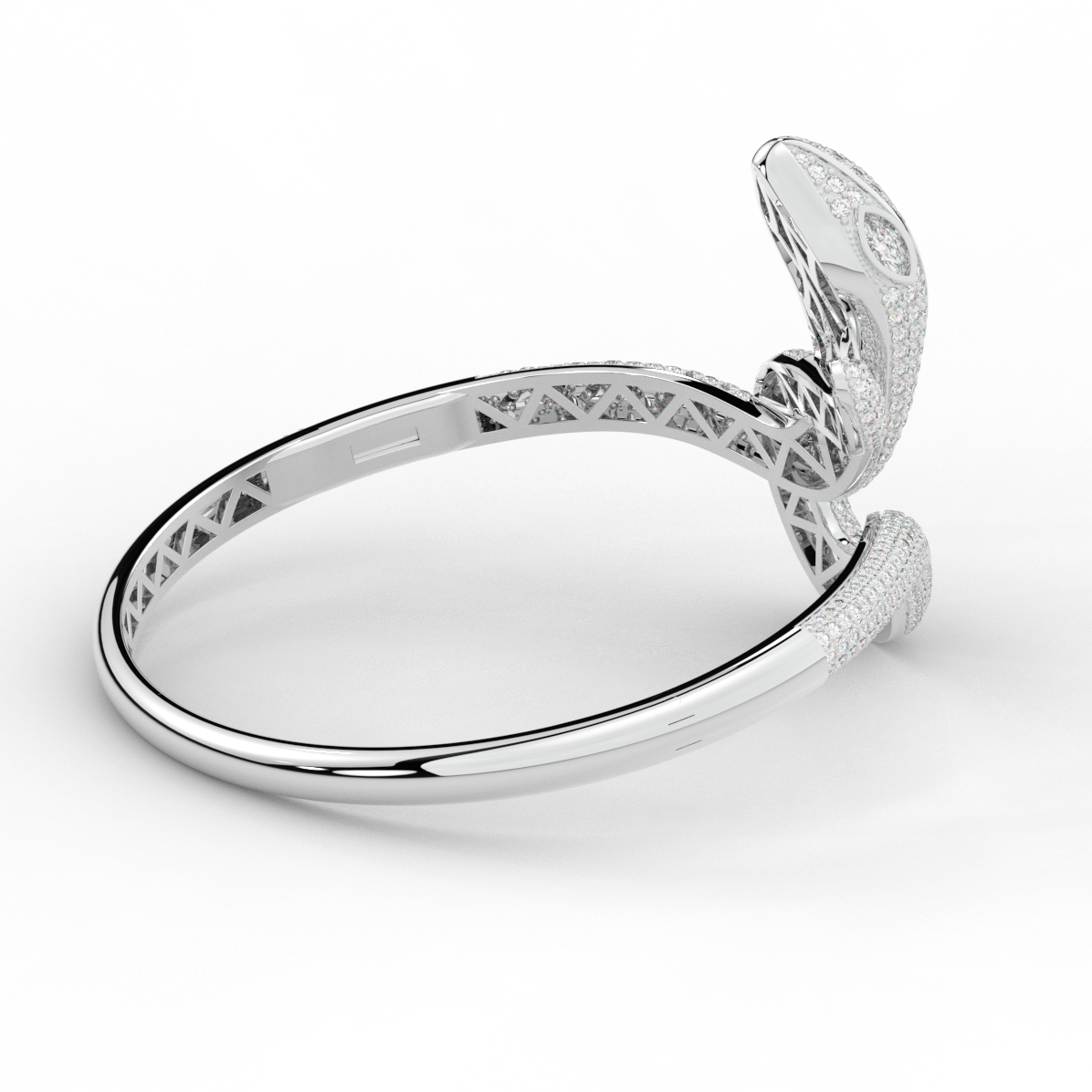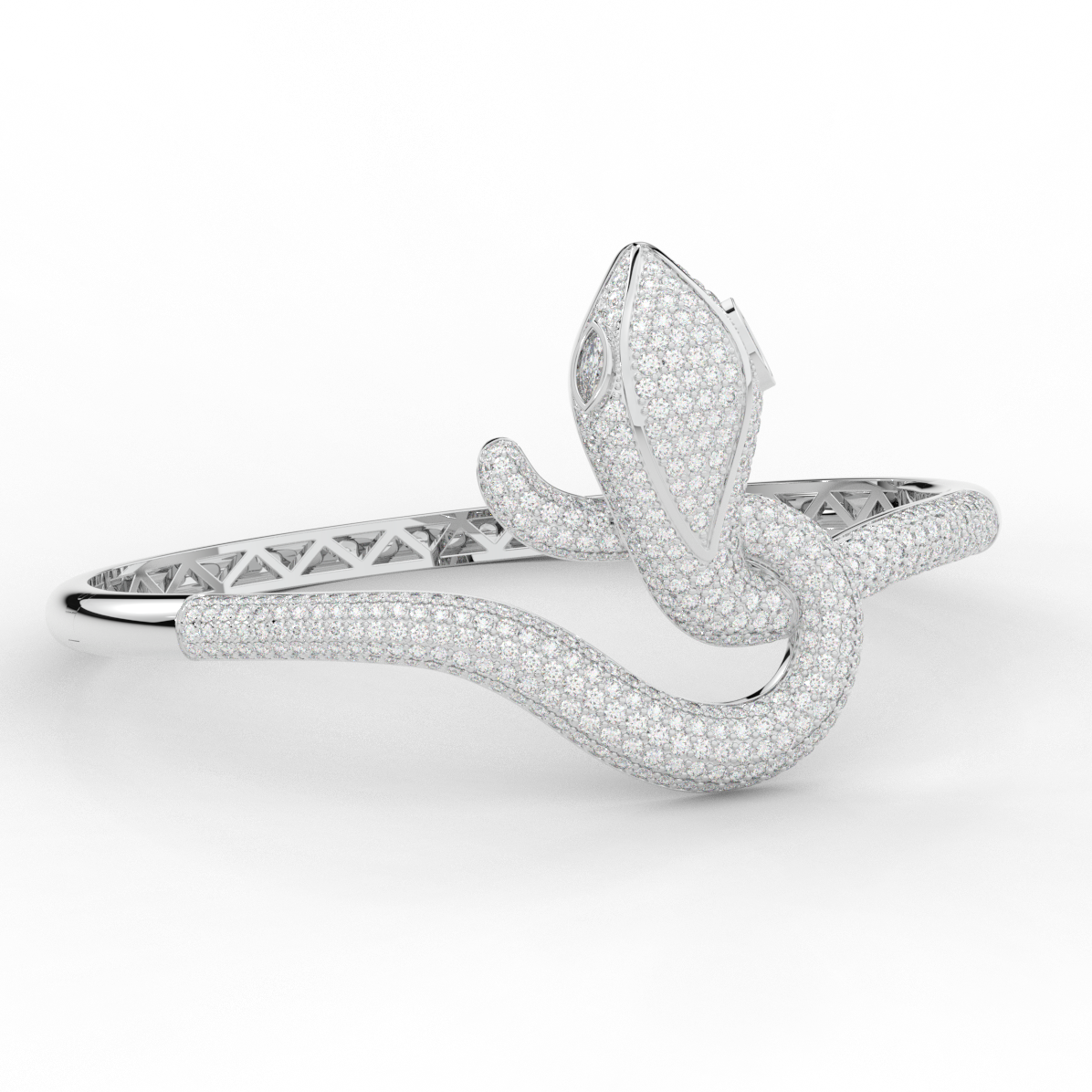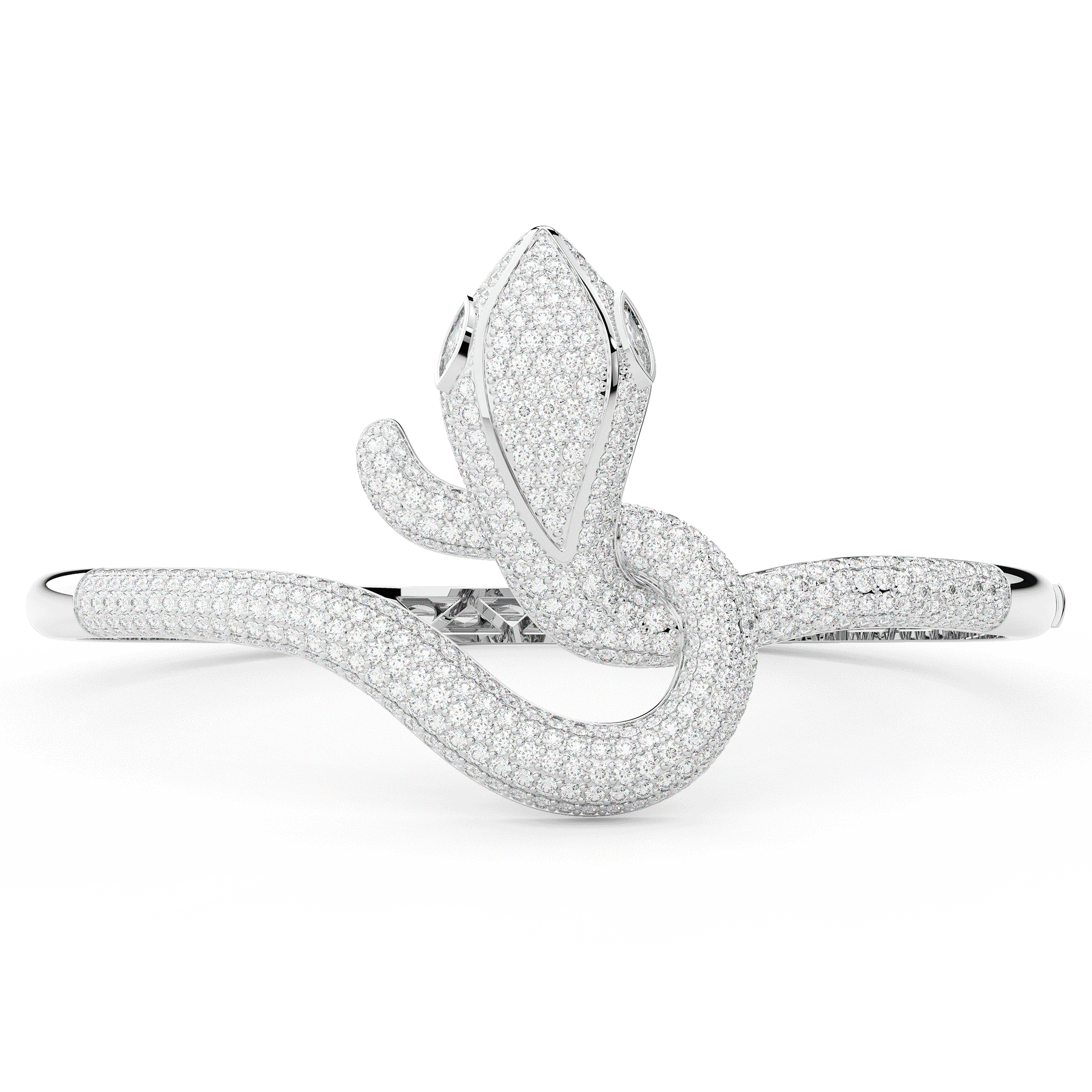 This stunning bangle is shaped like a snake with bright lab grown round diamonds accenting the shape as well as 2 larger pear shaped lab grown diamonds for the eyes. This bangle also features a latch that has a second catch for safety. This bangle is available in 14k white, yellow, or rose gold.