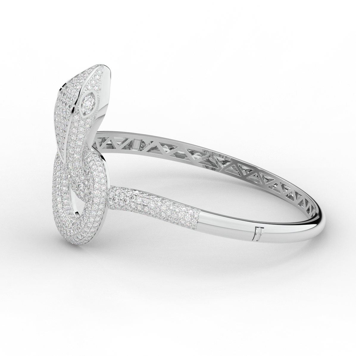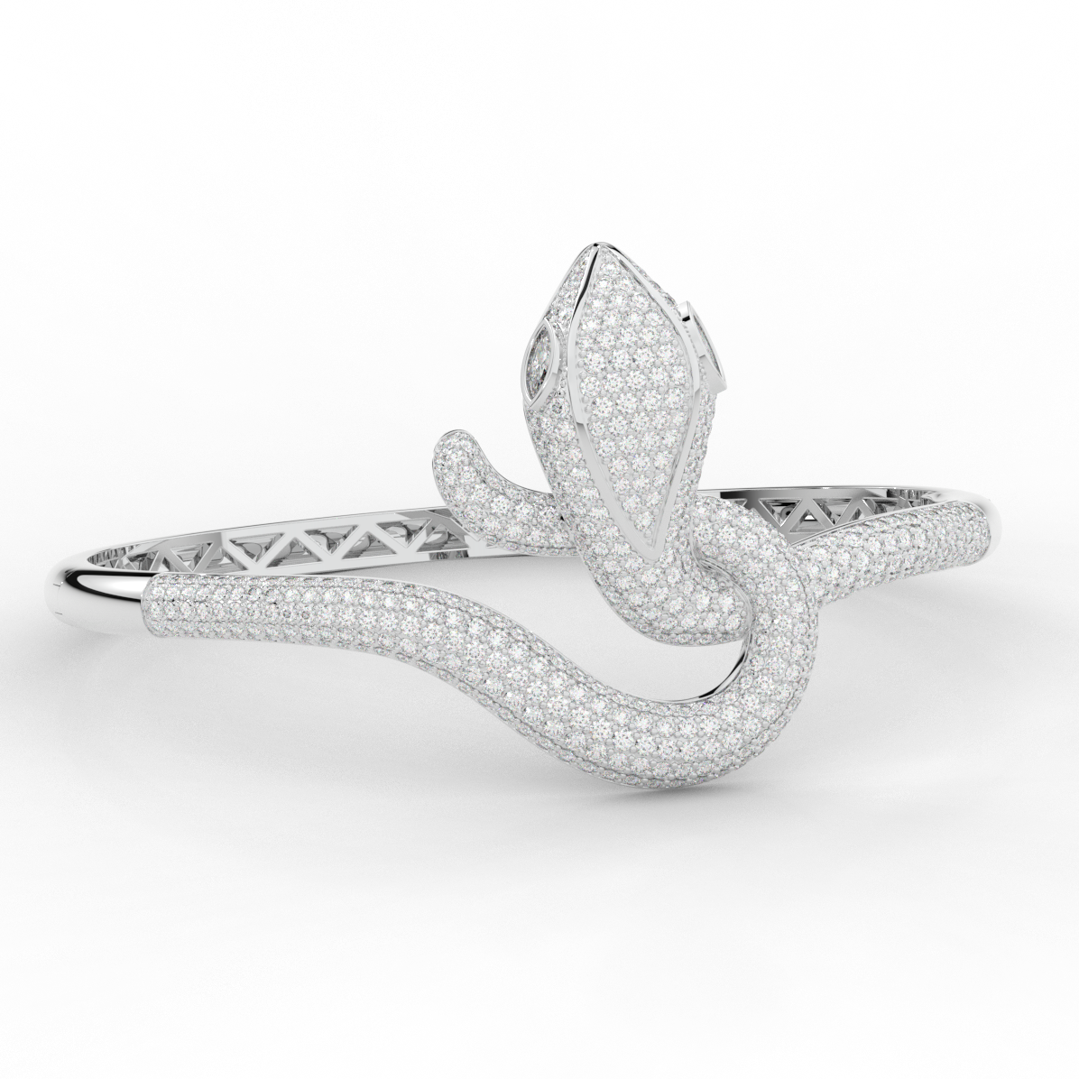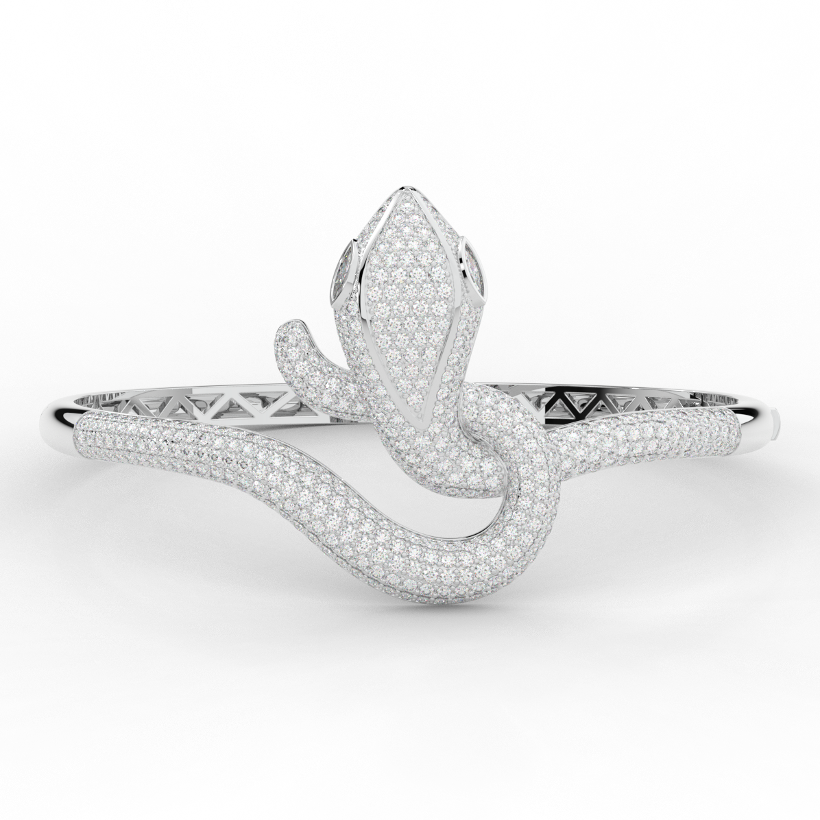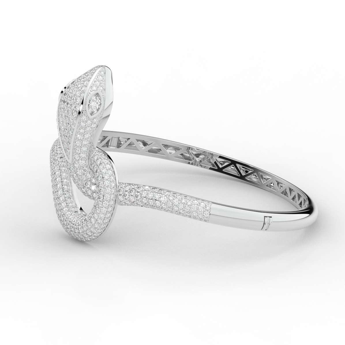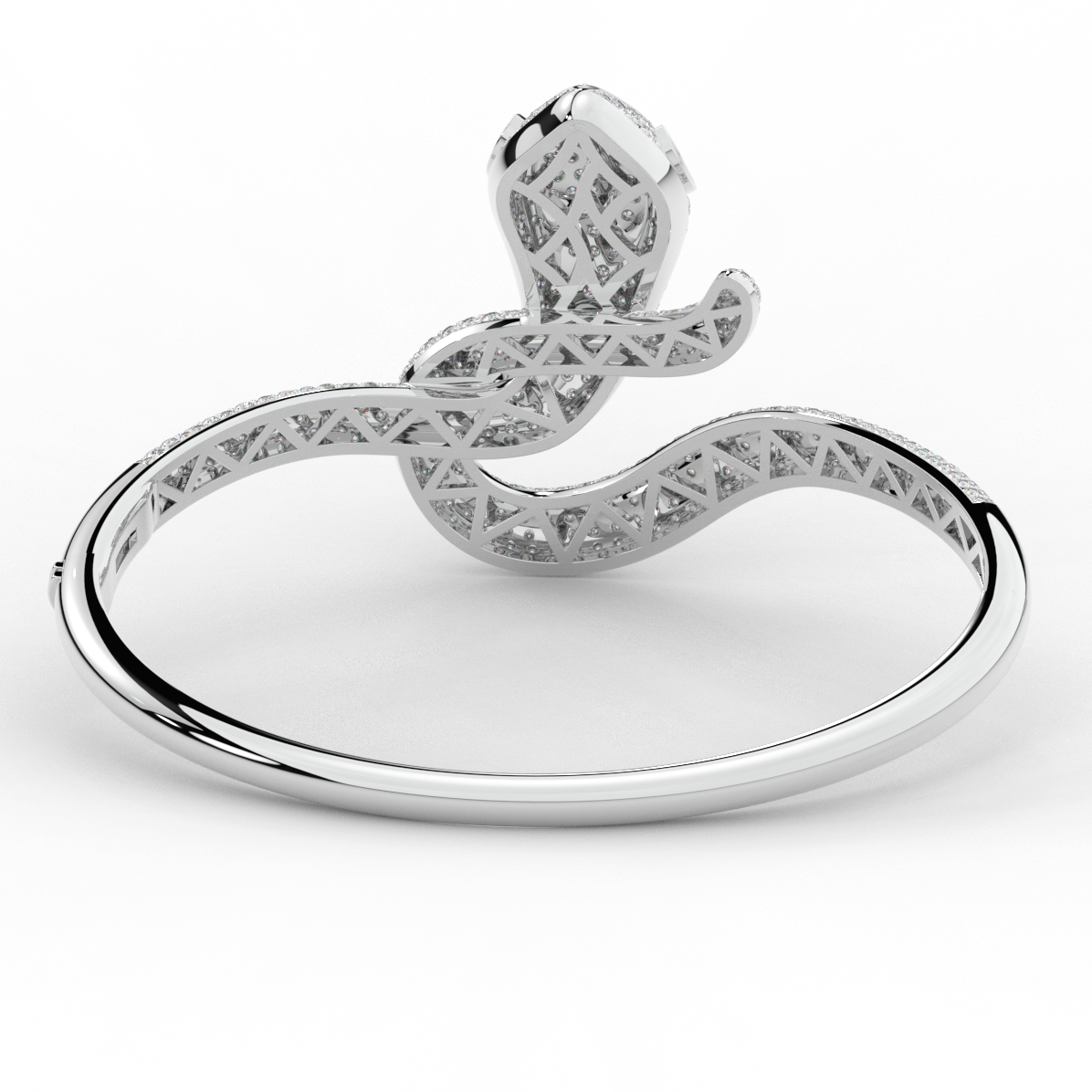 This stunning bangle is shaped like a snake with bright lab grown round diamonds accenting the shape as well as 2 larger pear shaped lab grown diamonds for the eyes. This bangle also features a latch that has a second catch for safety. This bangle is available in 14k white, yellow, or rose gold.