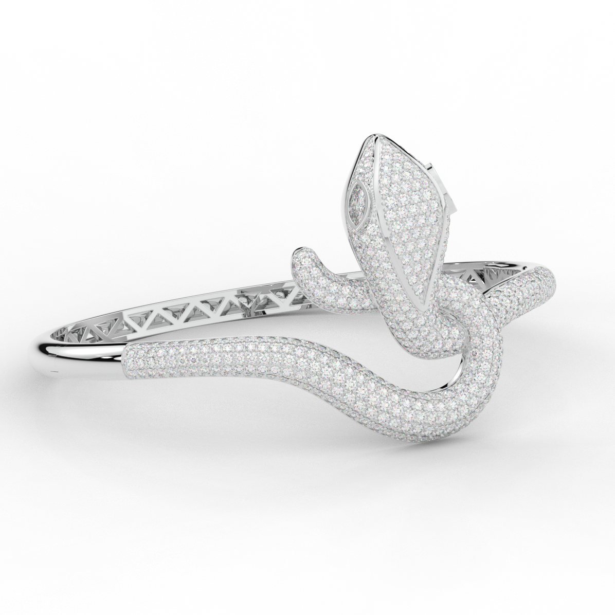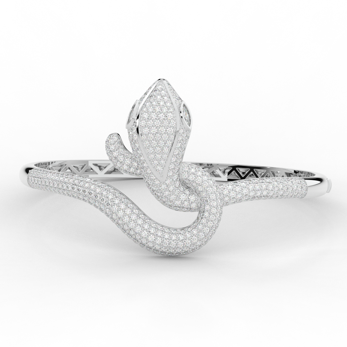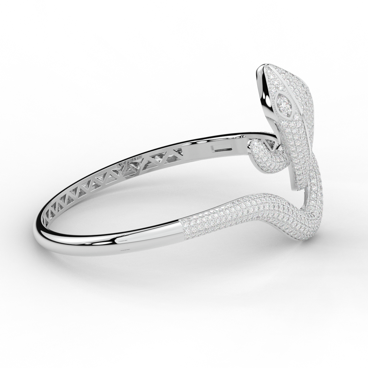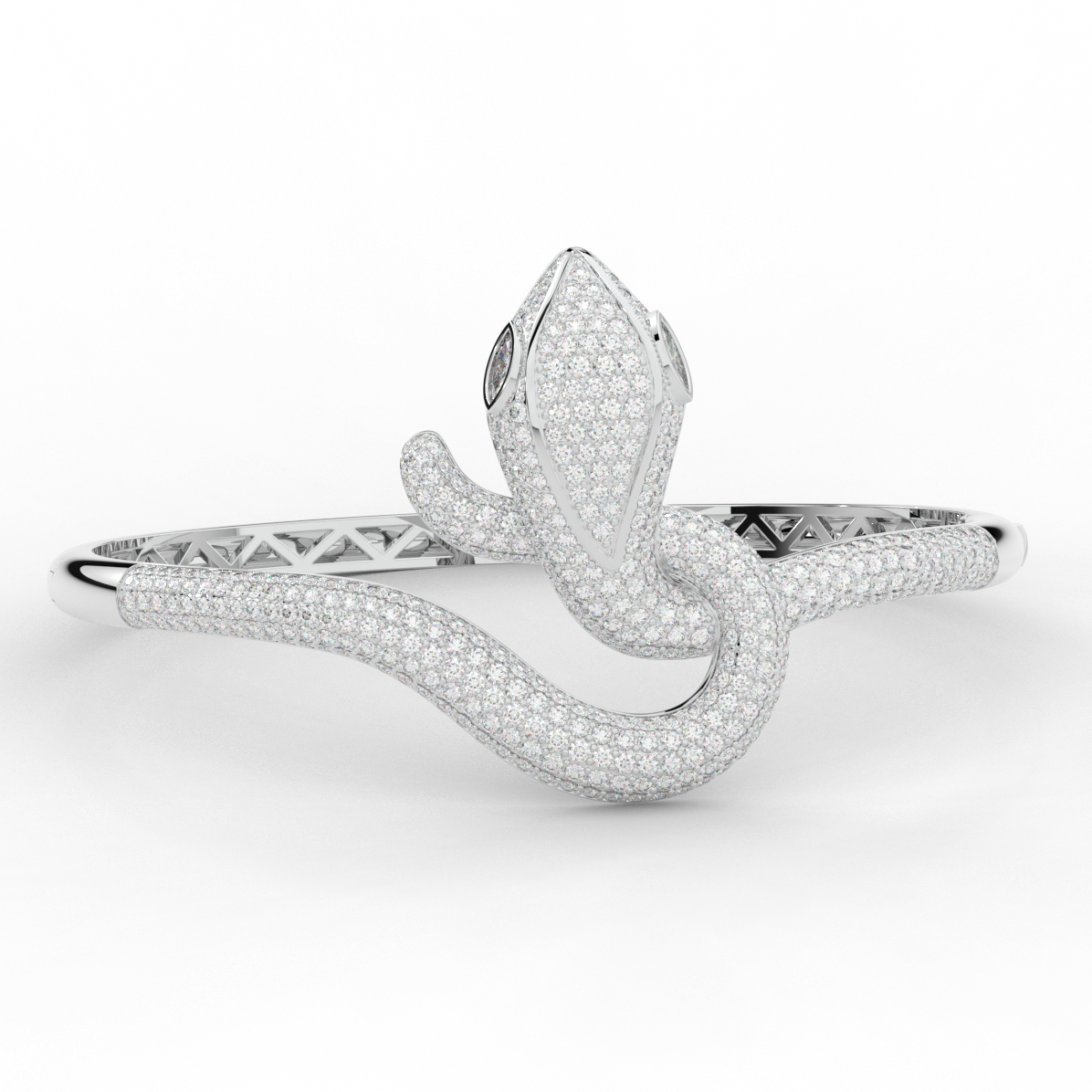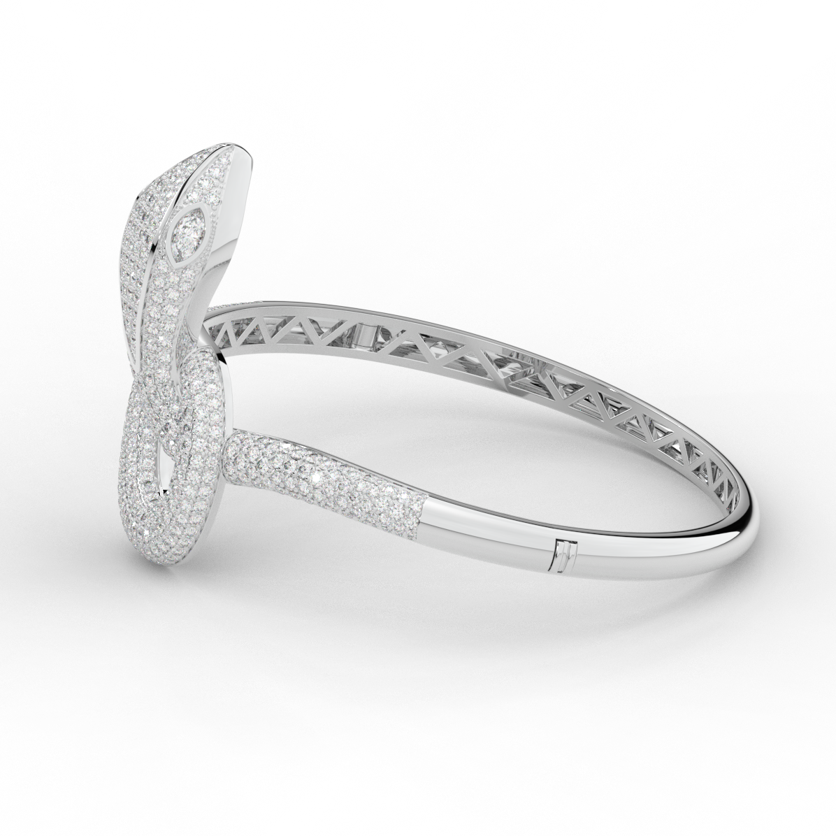 This stunning bangle is shaped like a snake with bright lab grown round diamonds accenting the shape as well as 2 larger pear shaped lab grown diamonds for the eyes. This bangle also features a latch that has a second catch for safety. This bangle is available in 14k white, yellow, or rose gold.