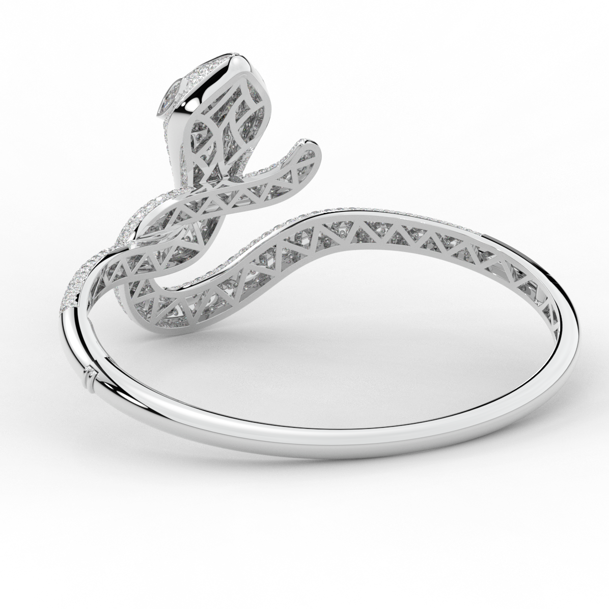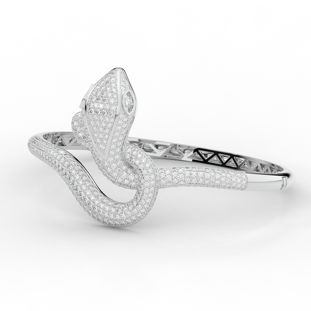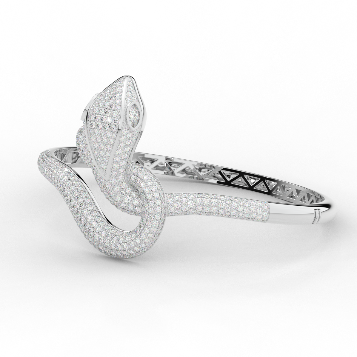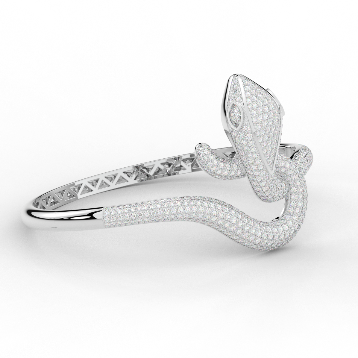 This stunning bangle is shaped like a snake with bright lab grown round diamonds accenting the shape as well as 2 larger pear shaped lab grown diamonds for the eyes. This bangle also features a latch that has a second catch for safety. This bangle is available in 14k white, yellow, or rose gold.