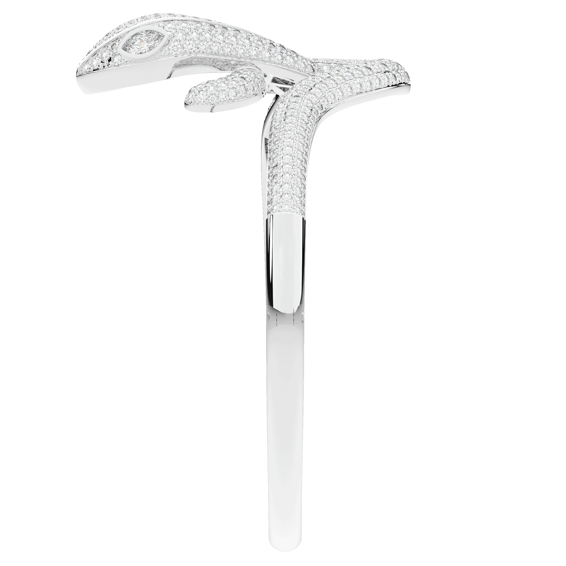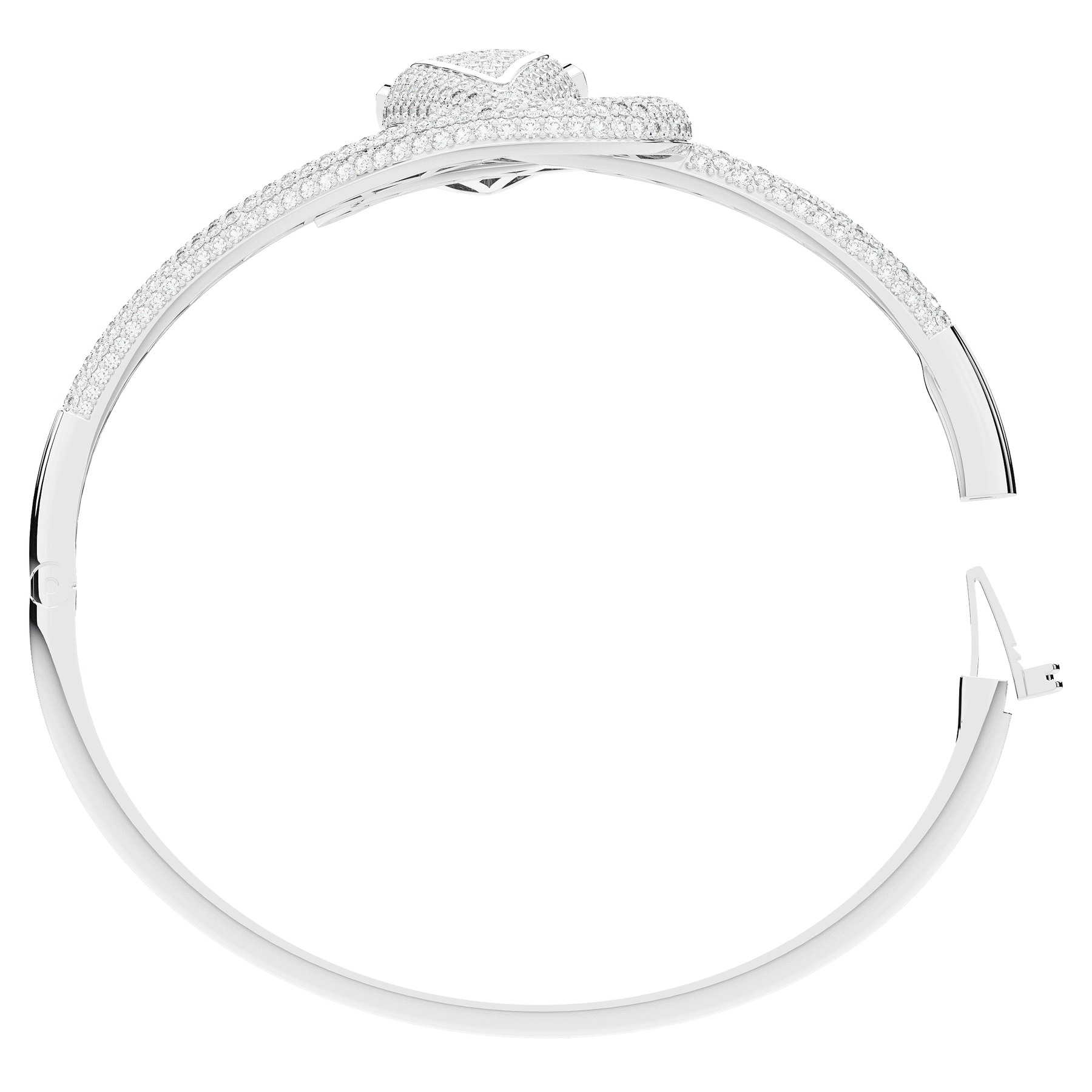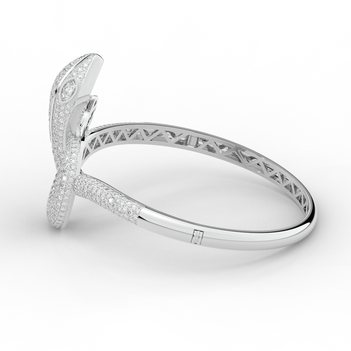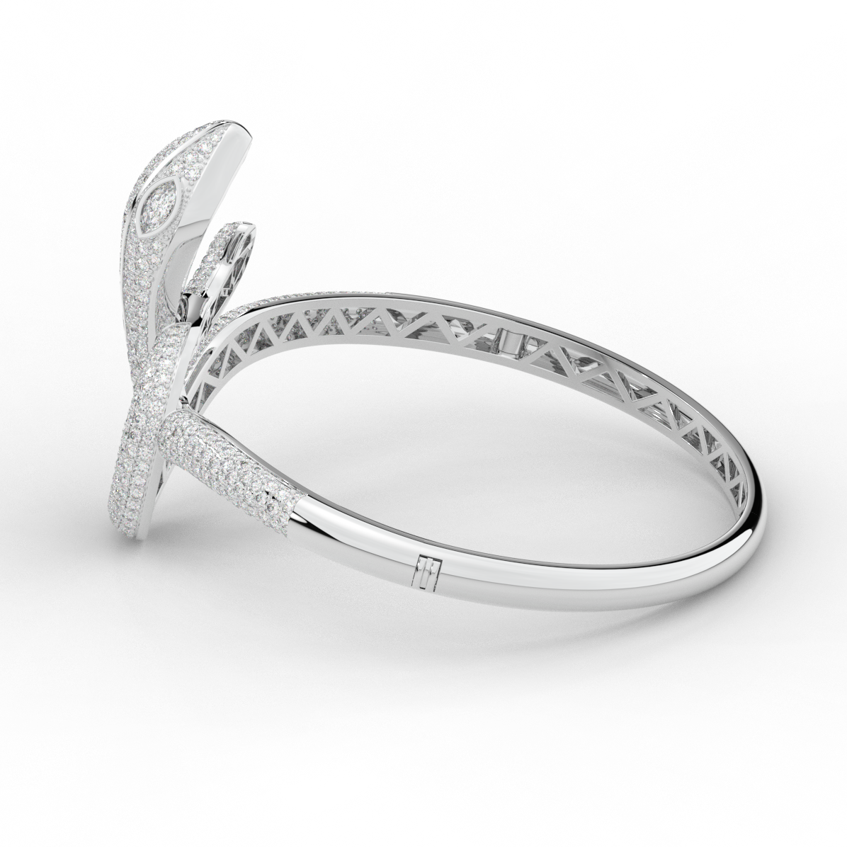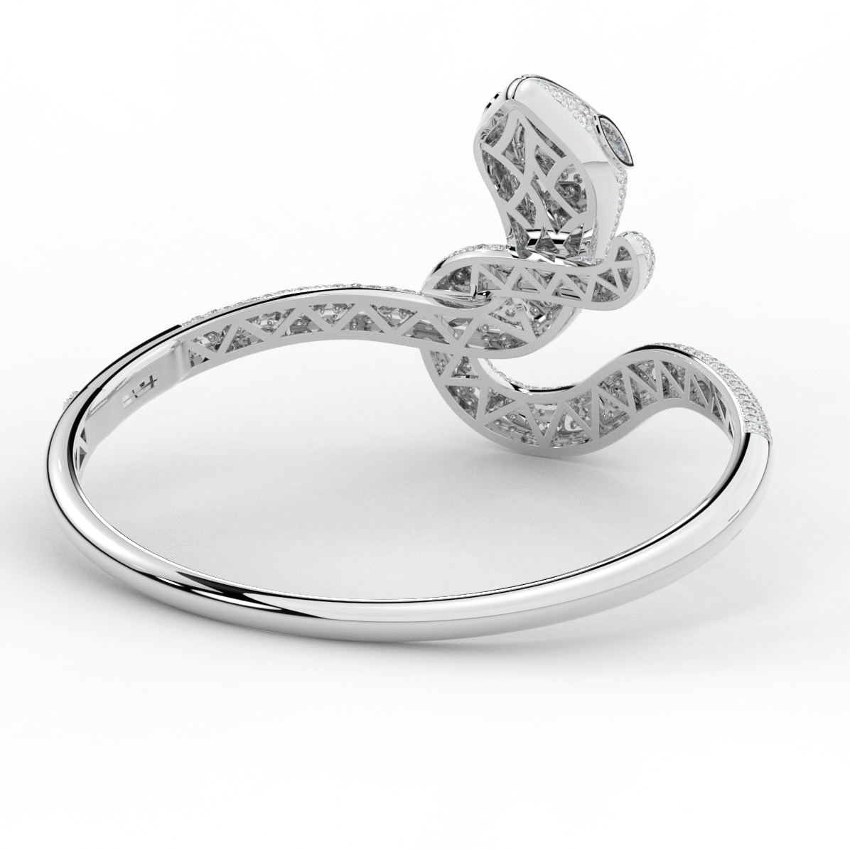 This stunning bangle is shaped like a snake with bright lab grown round diamonds accenting the shape as well as 2 larger pear shaped lab grown diamonds for the eyes. This bangle also features a latch that has a second catch for safety. This bangle is available in 14k white, yellow, or rose gold.