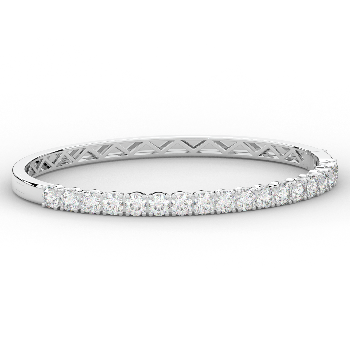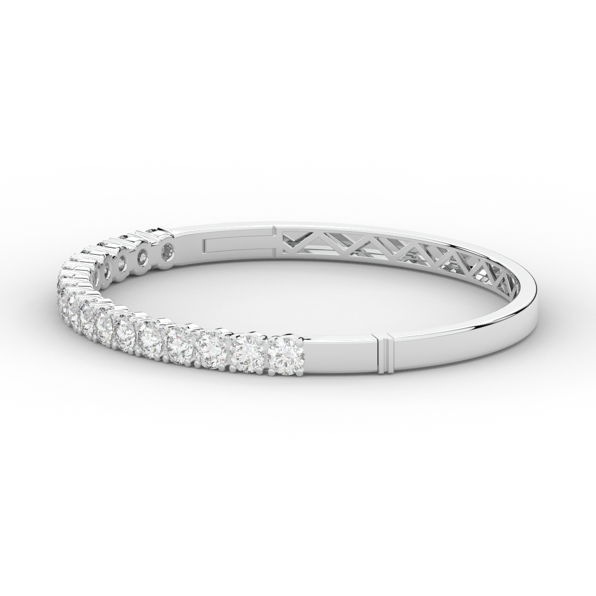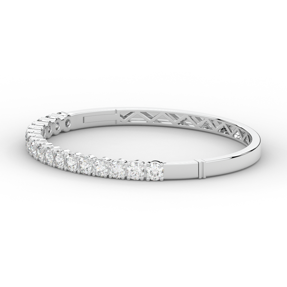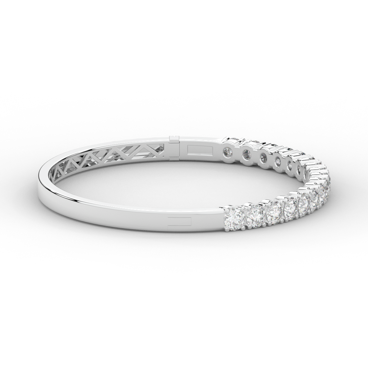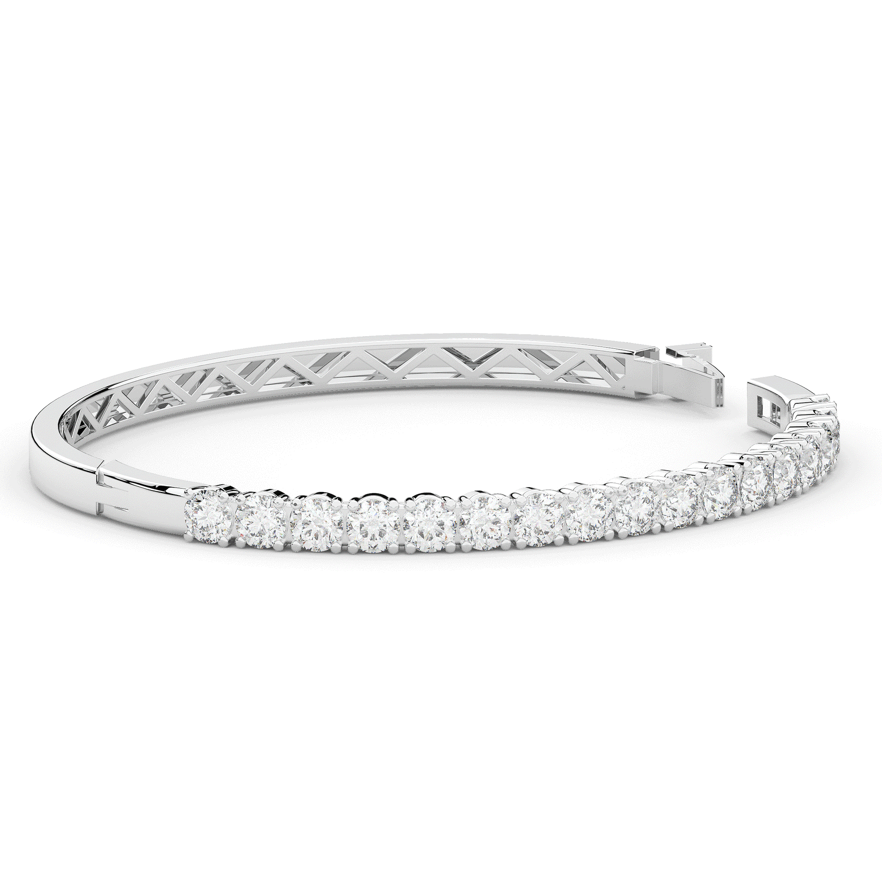 This beautiful bangle features prong set round lab grown diamonds, with a latch that has a second catch for safety. This bangle is available in 14k white, yellow, or rose gold.