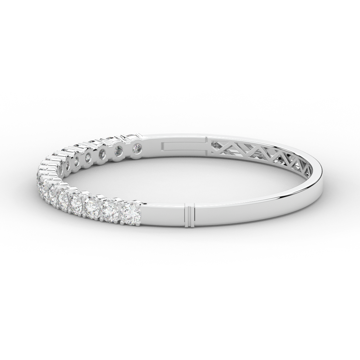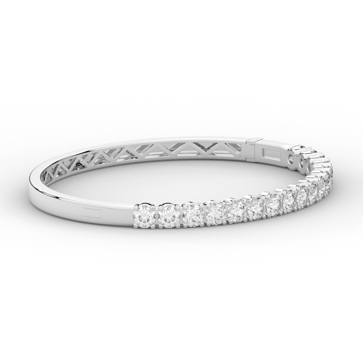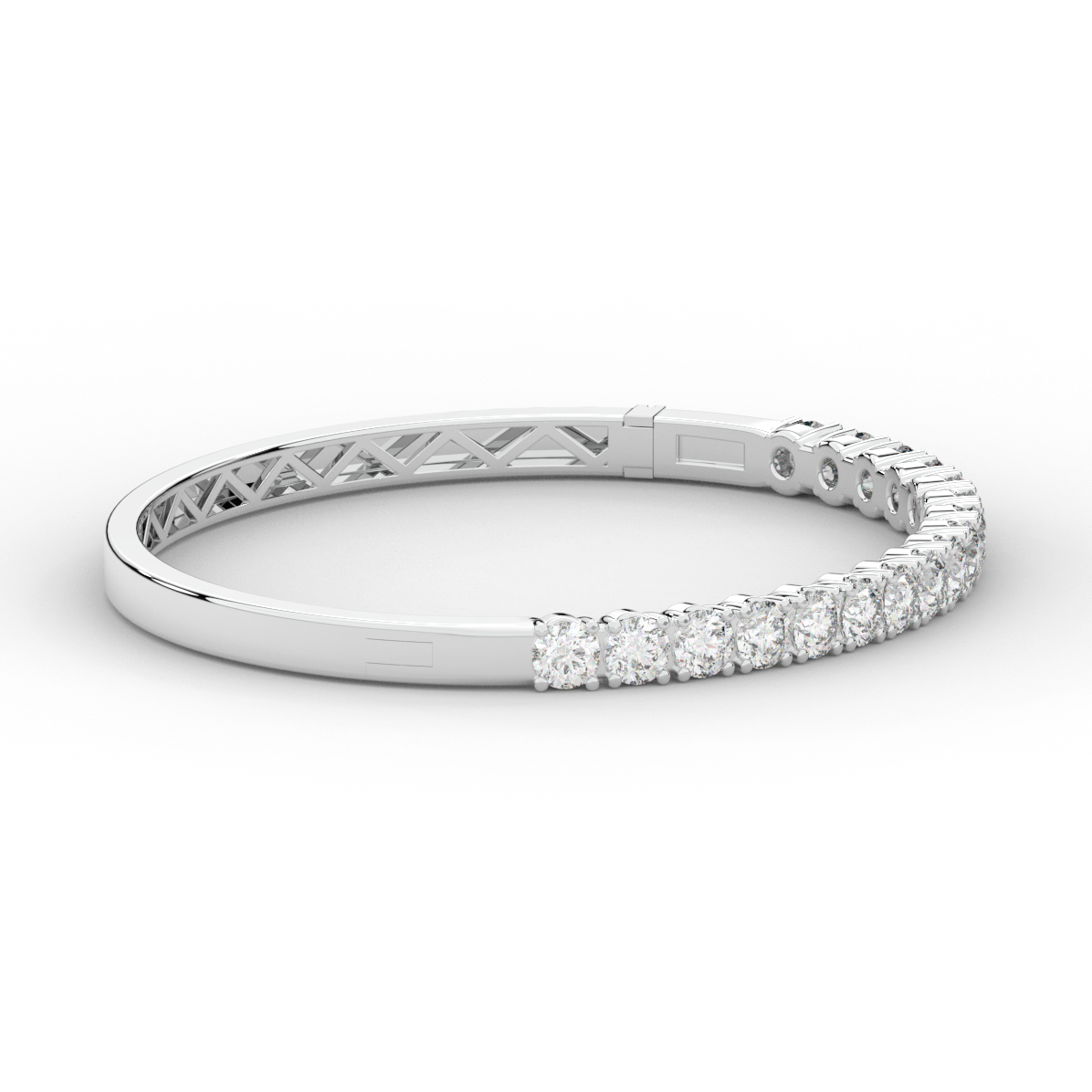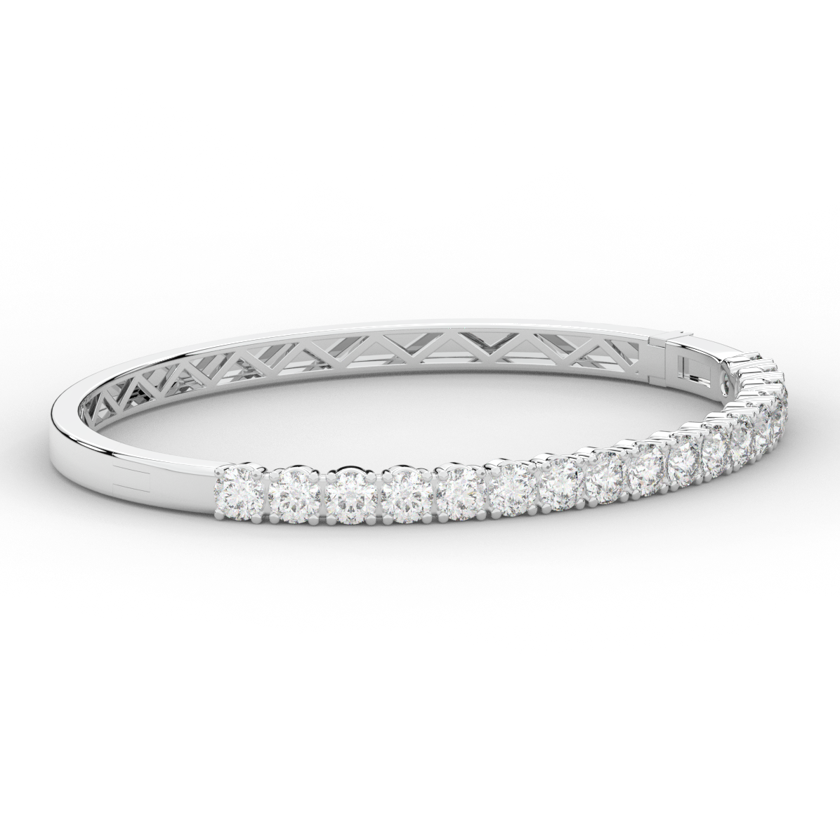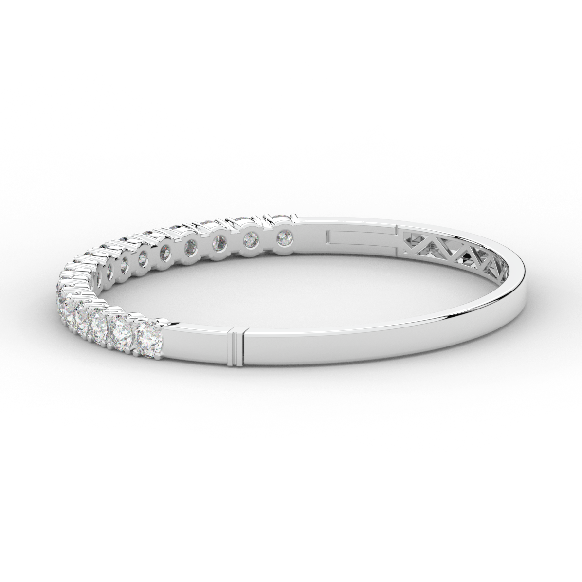This beautiful bangle features prong set round lab grown diamonds, with a latch that has a second catch for safety. This bangle is available in 14k white, yellow, or rose gold.