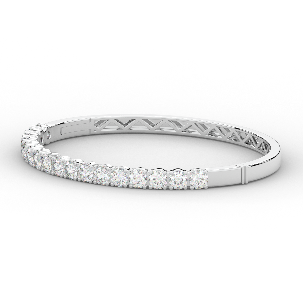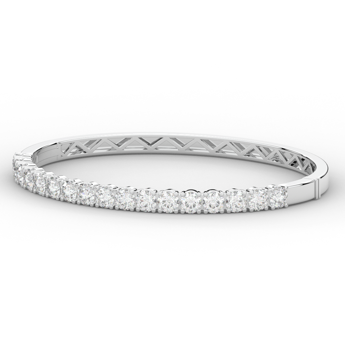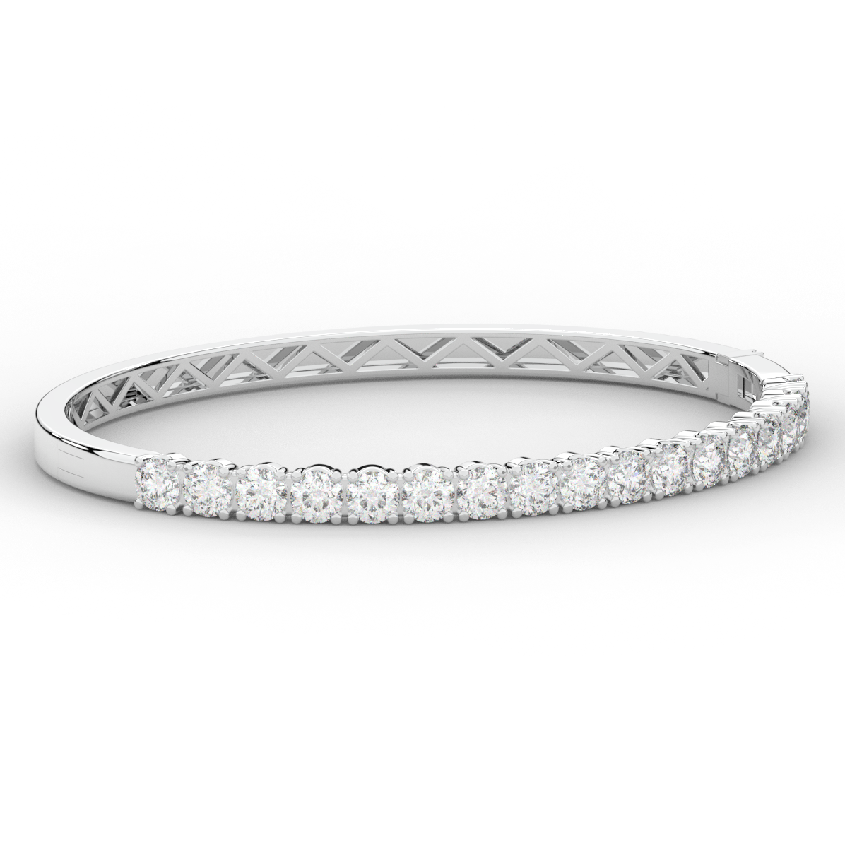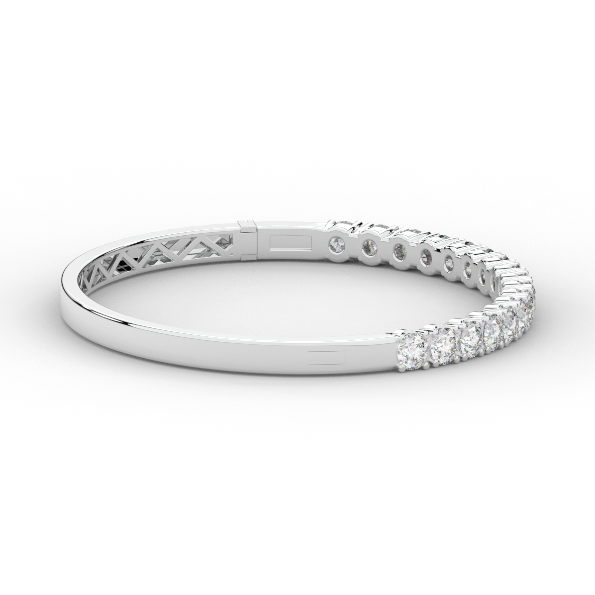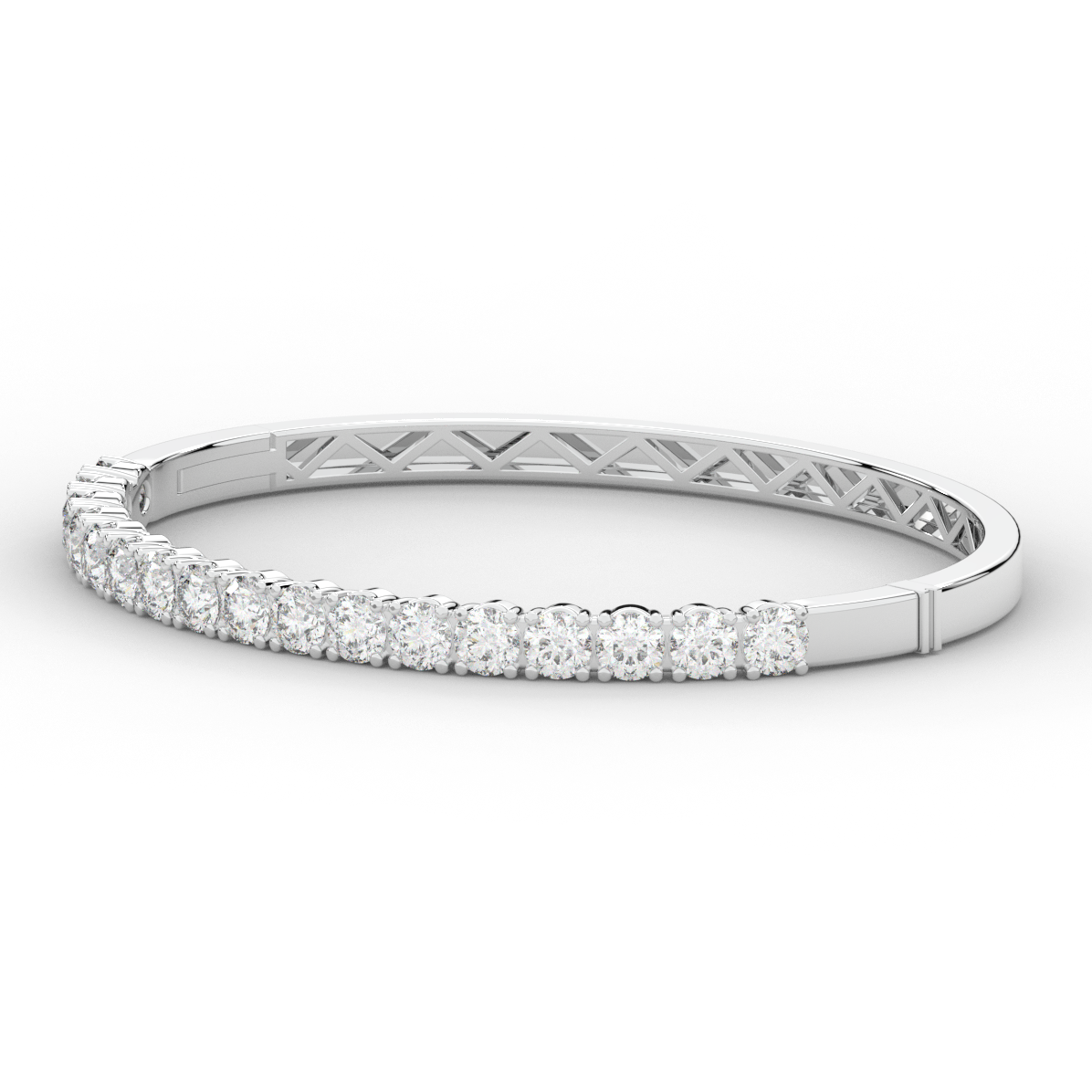 This beautiful bangle features prong set round lab grown diamonds, with a latch that has a second catch for safety. This bangle is available in 14k white, yellow, or rose gold.
