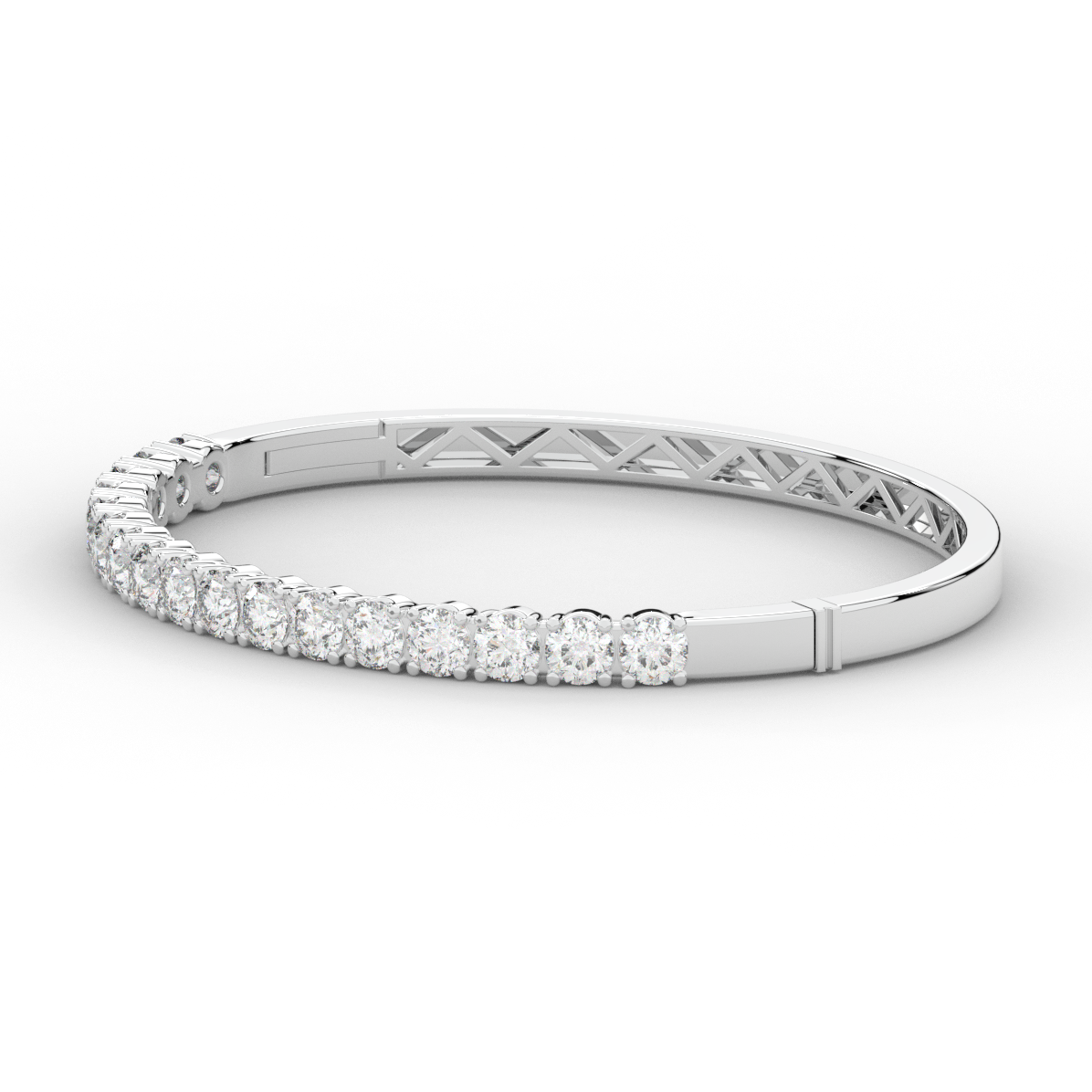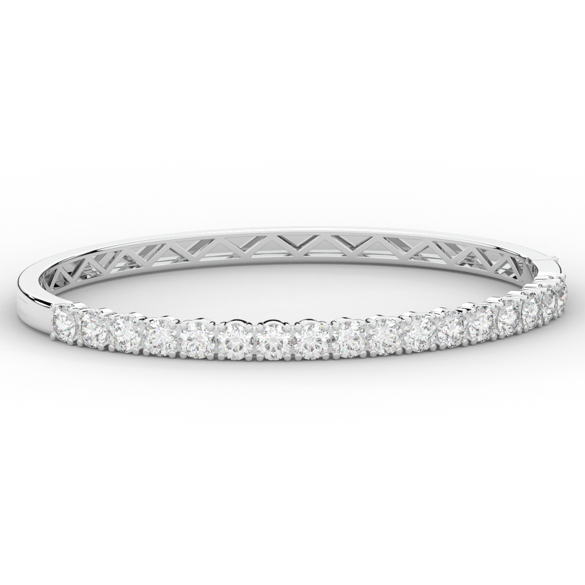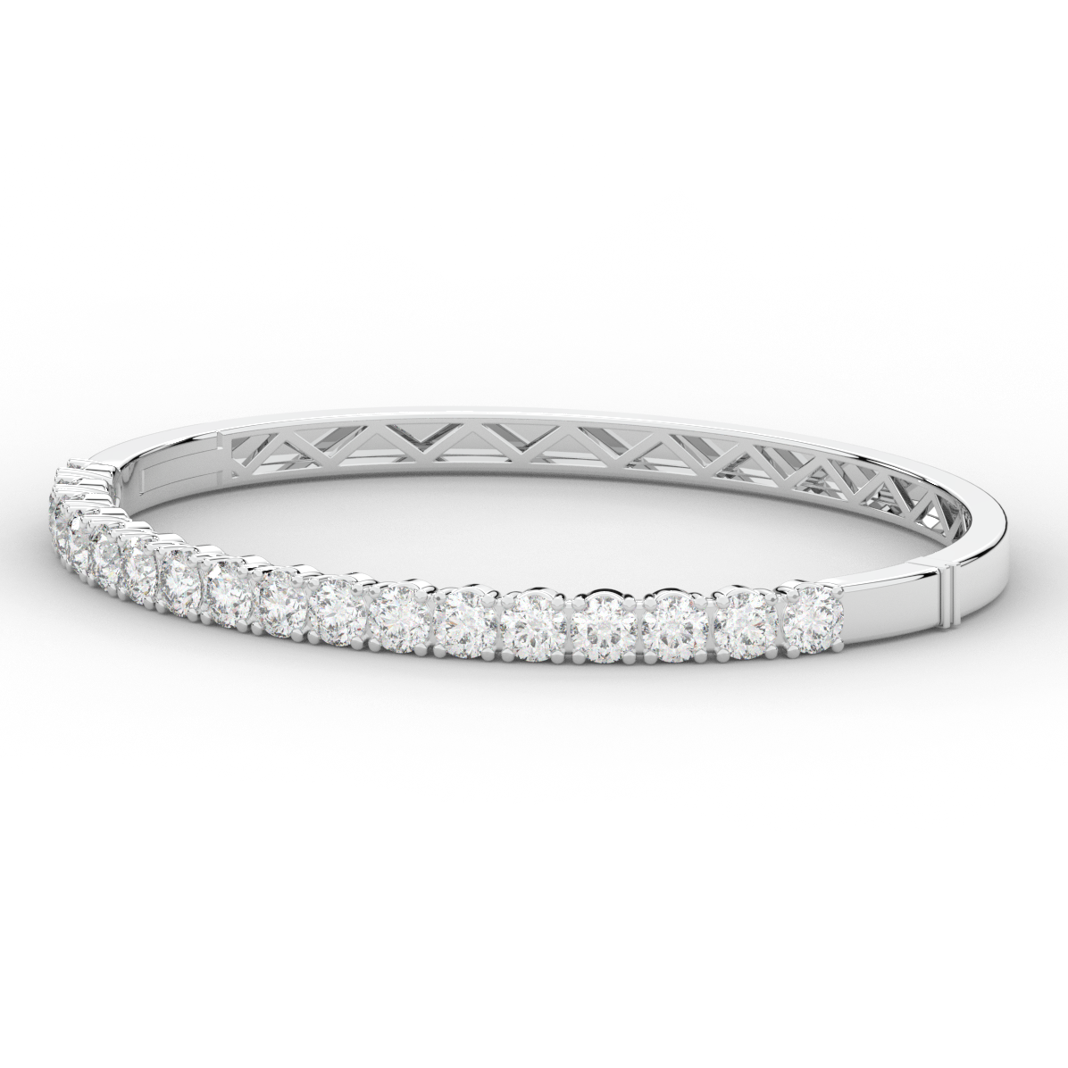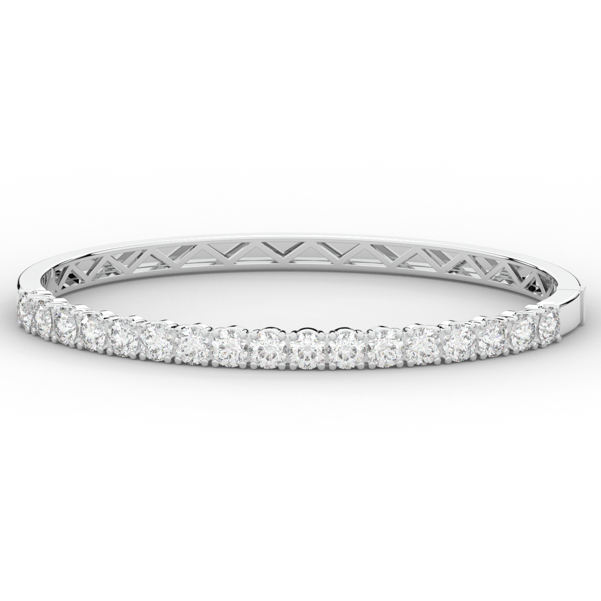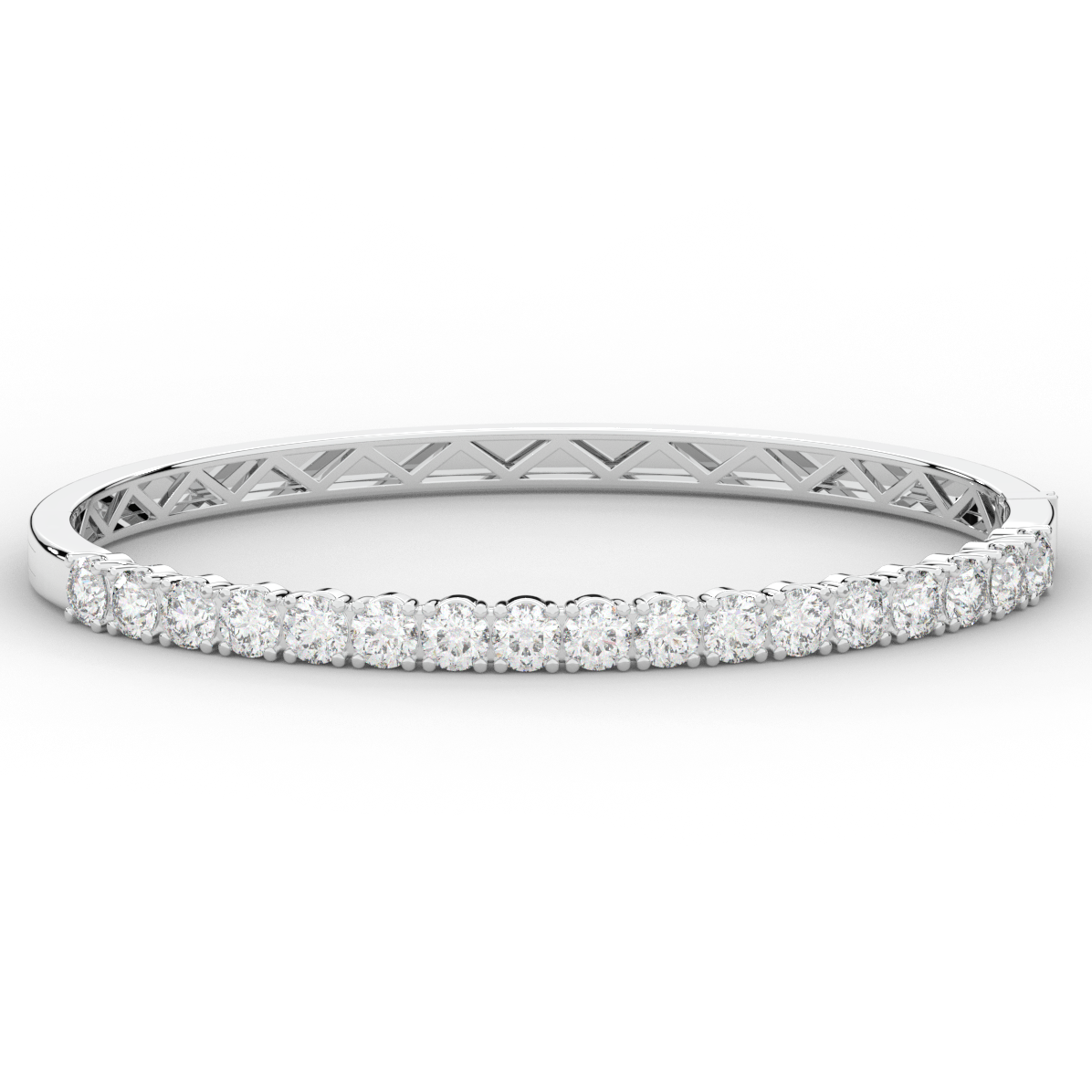 This beautiful bangle features prong set round lab grown diamonds, with a latch that has a second catch for safety. This bangle is available in 14k white, yellow, or rose gold.