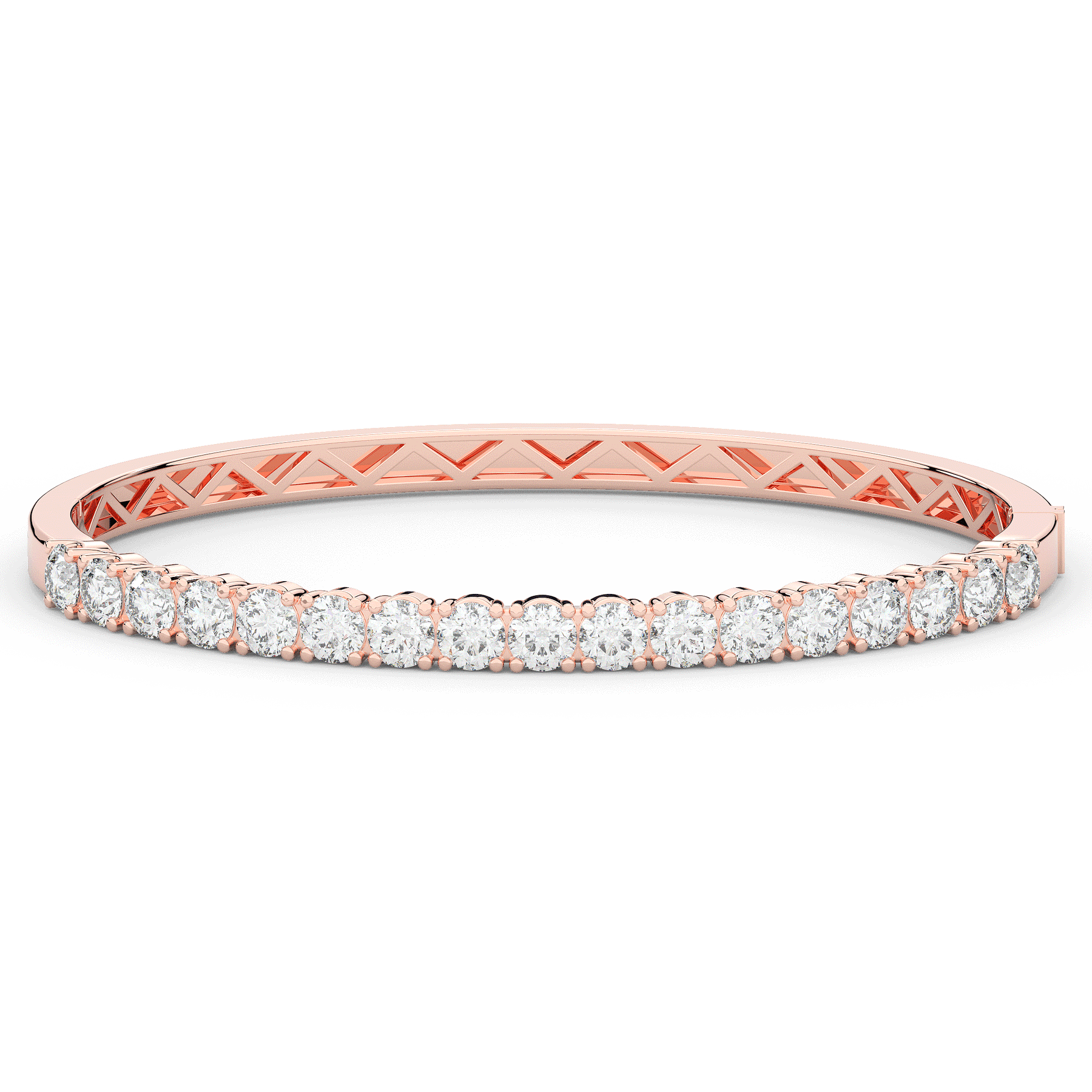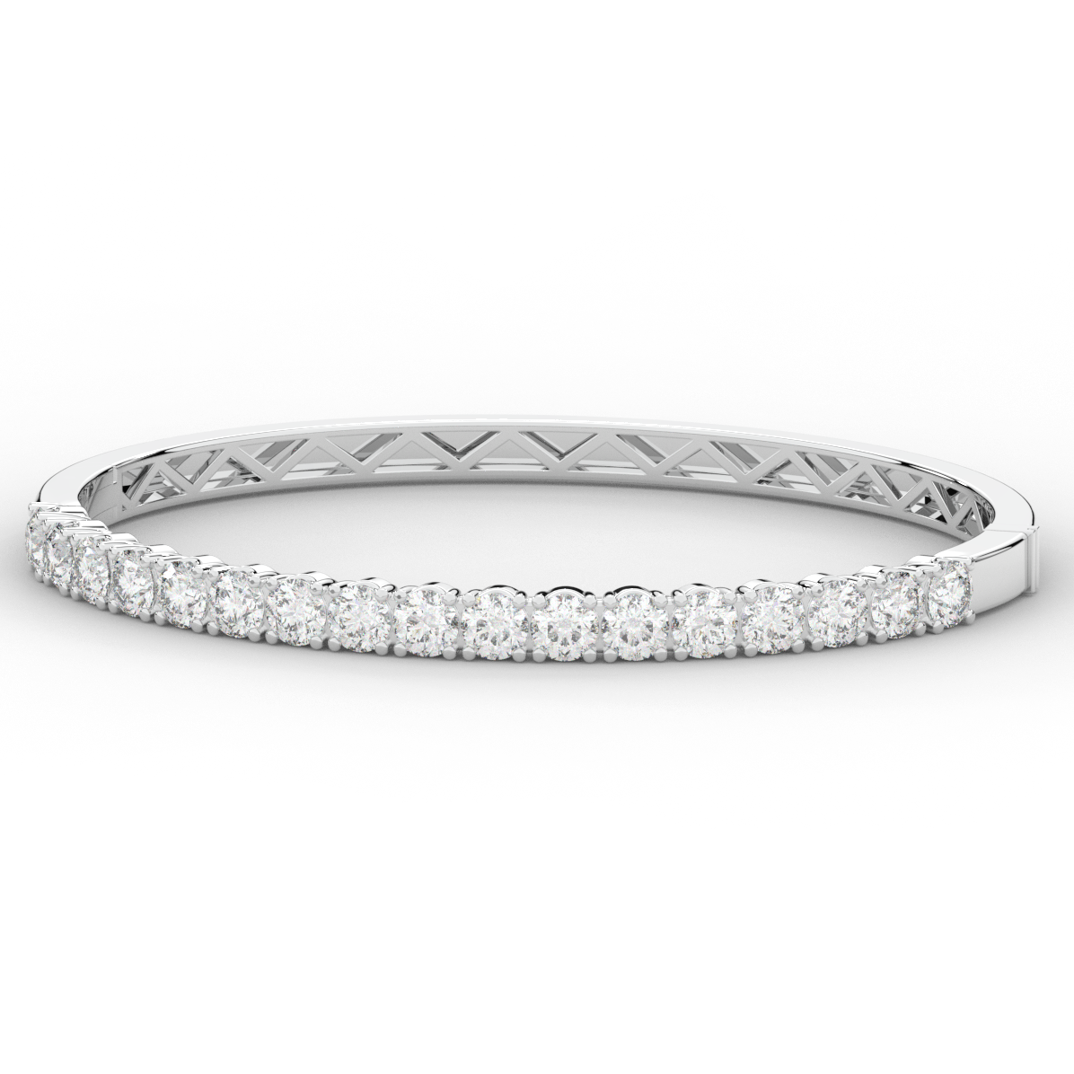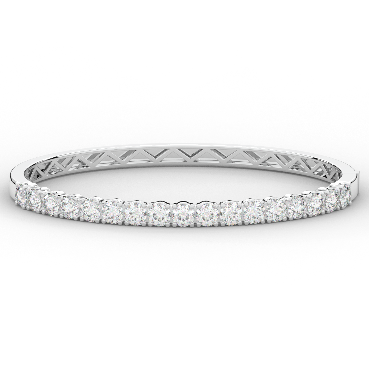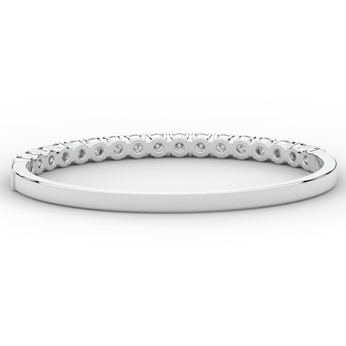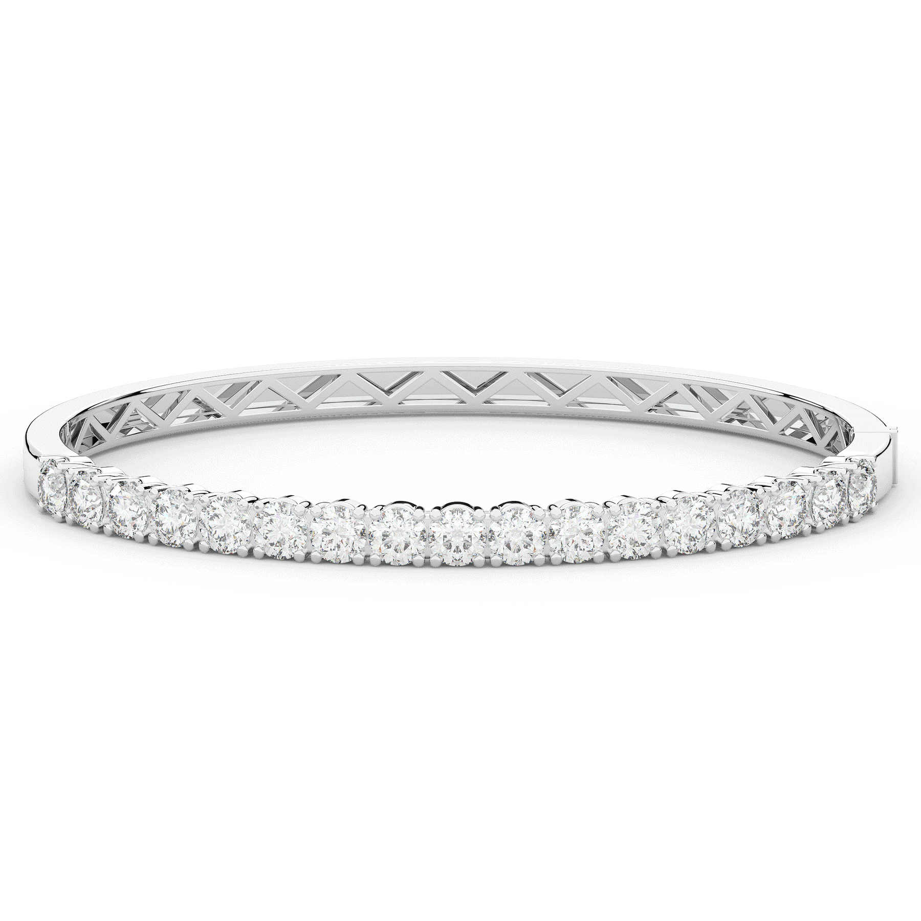 This beautiful bangle features prong set round lab grown diamonds, with a latch that has a second catch for safety. This bangle is available in 14k white, yellow, or rose gold.