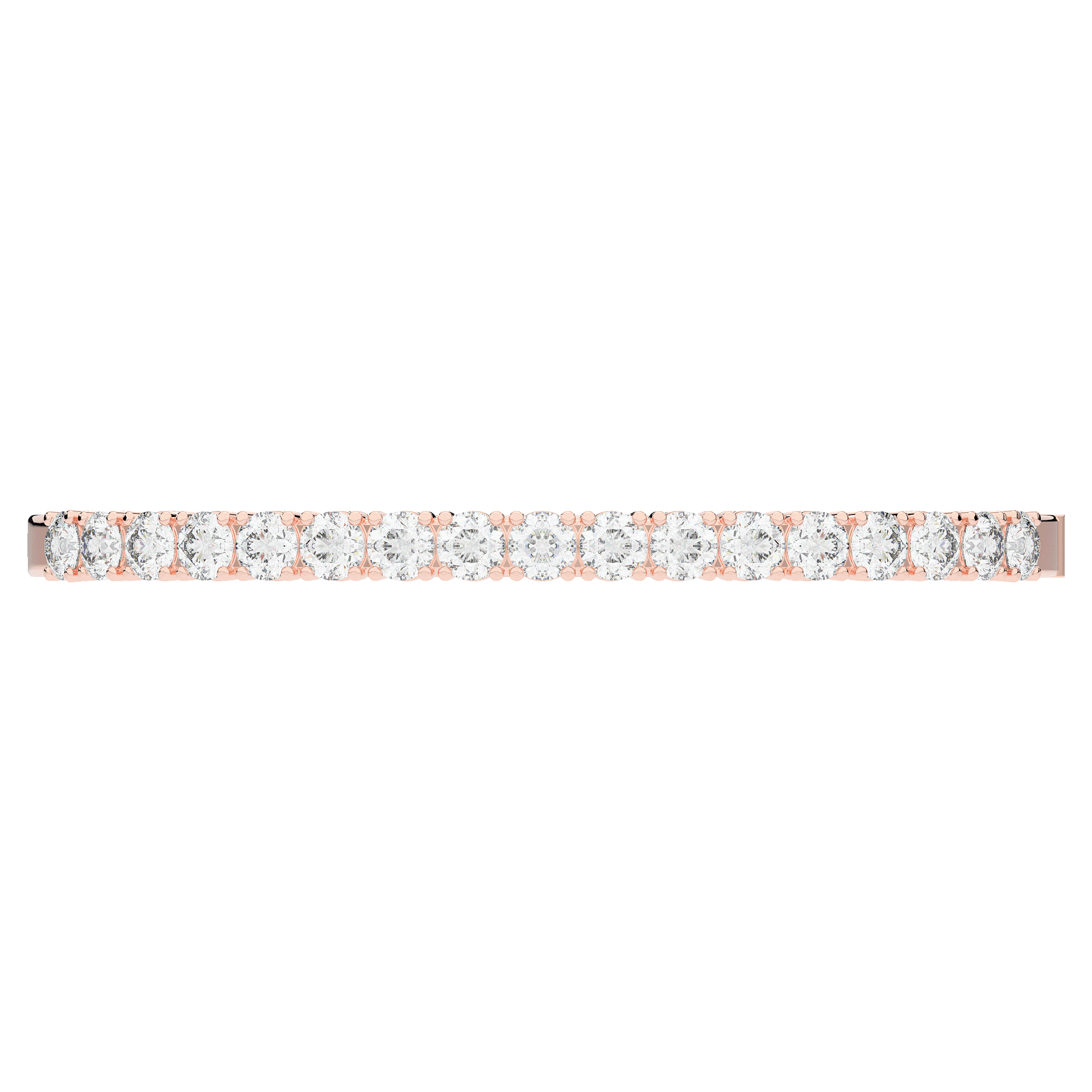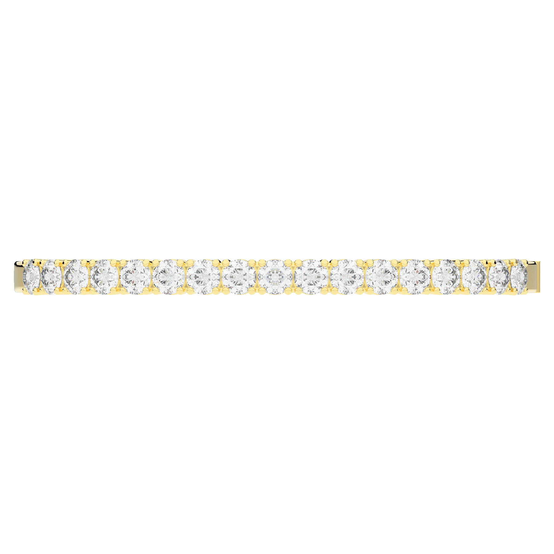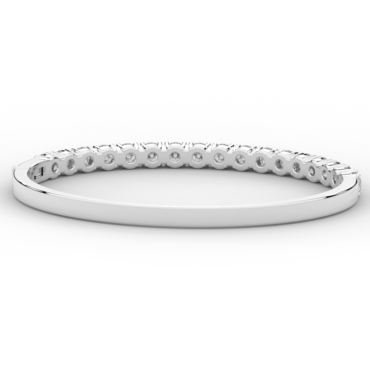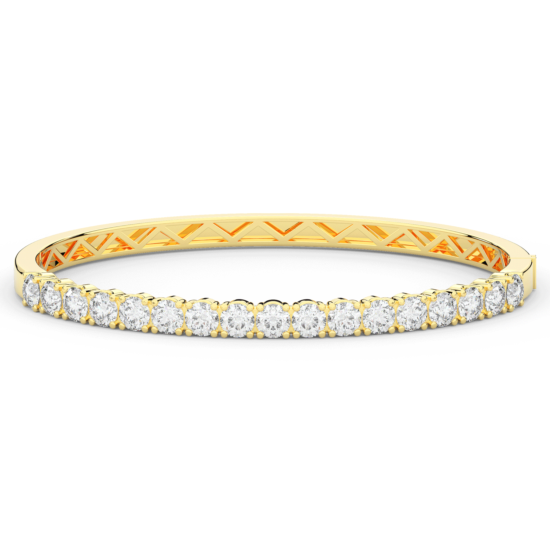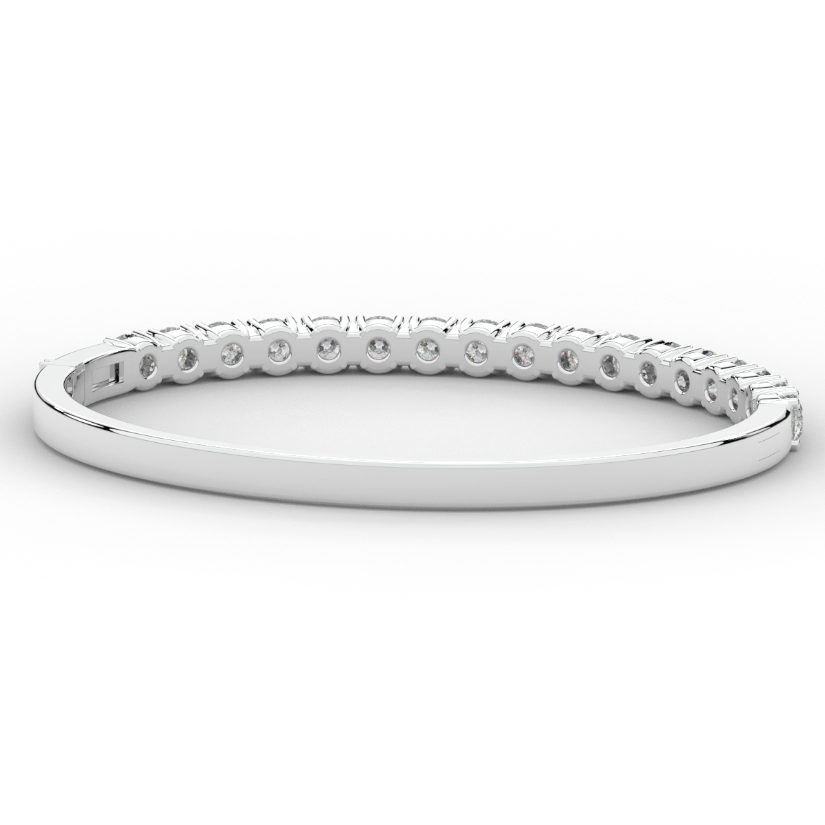 This beautiful bangle features prong set round lab grown diamonds, with a latch that has a second catch for safety. This bangle is available in 14k white, yellow, or rose gold.