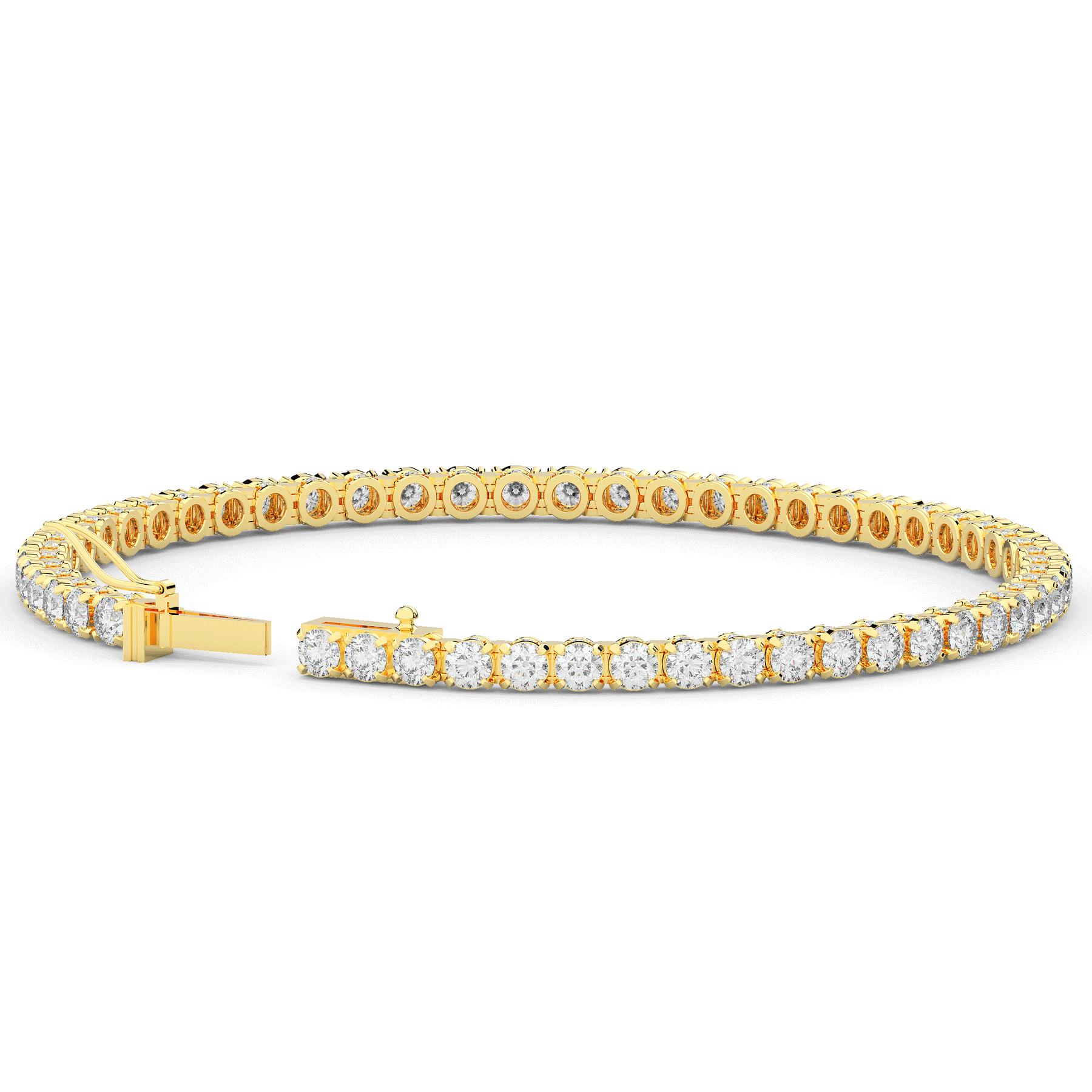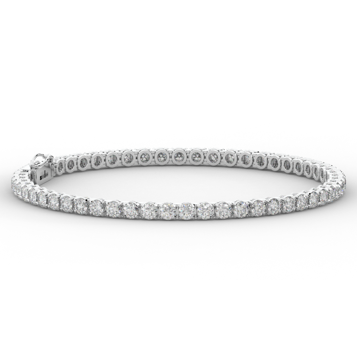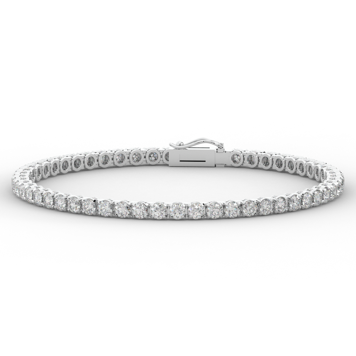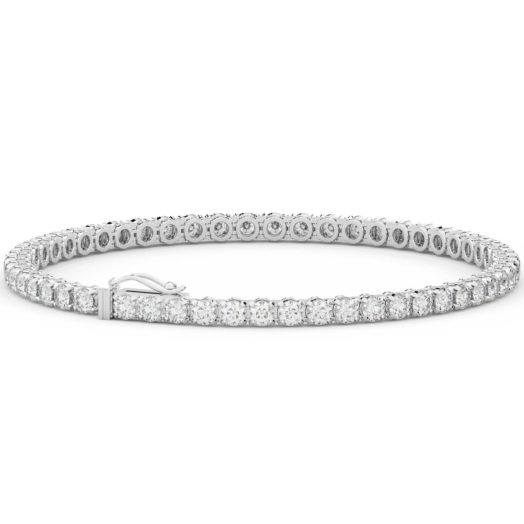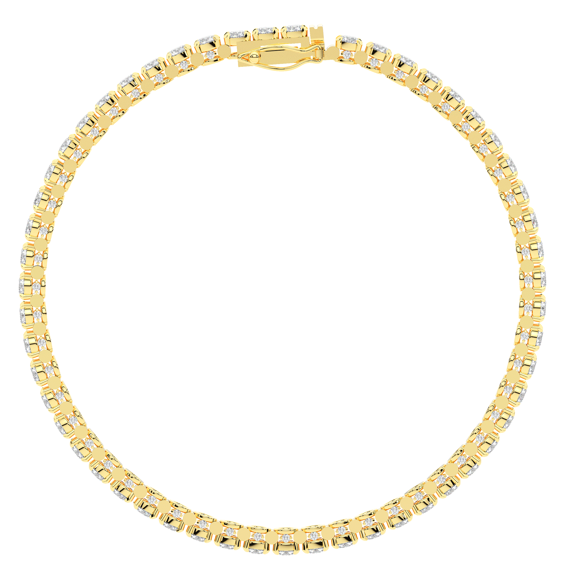 This tennis bracelet features a stunning design a bright round lab grown diamond and 2 lab grown round diamonds in an underhalo style per link. The clasp features a second step for safety as well as an external safety latch for added protection. This tennis bracelet is available in 14k white, yellow, or rose gold.