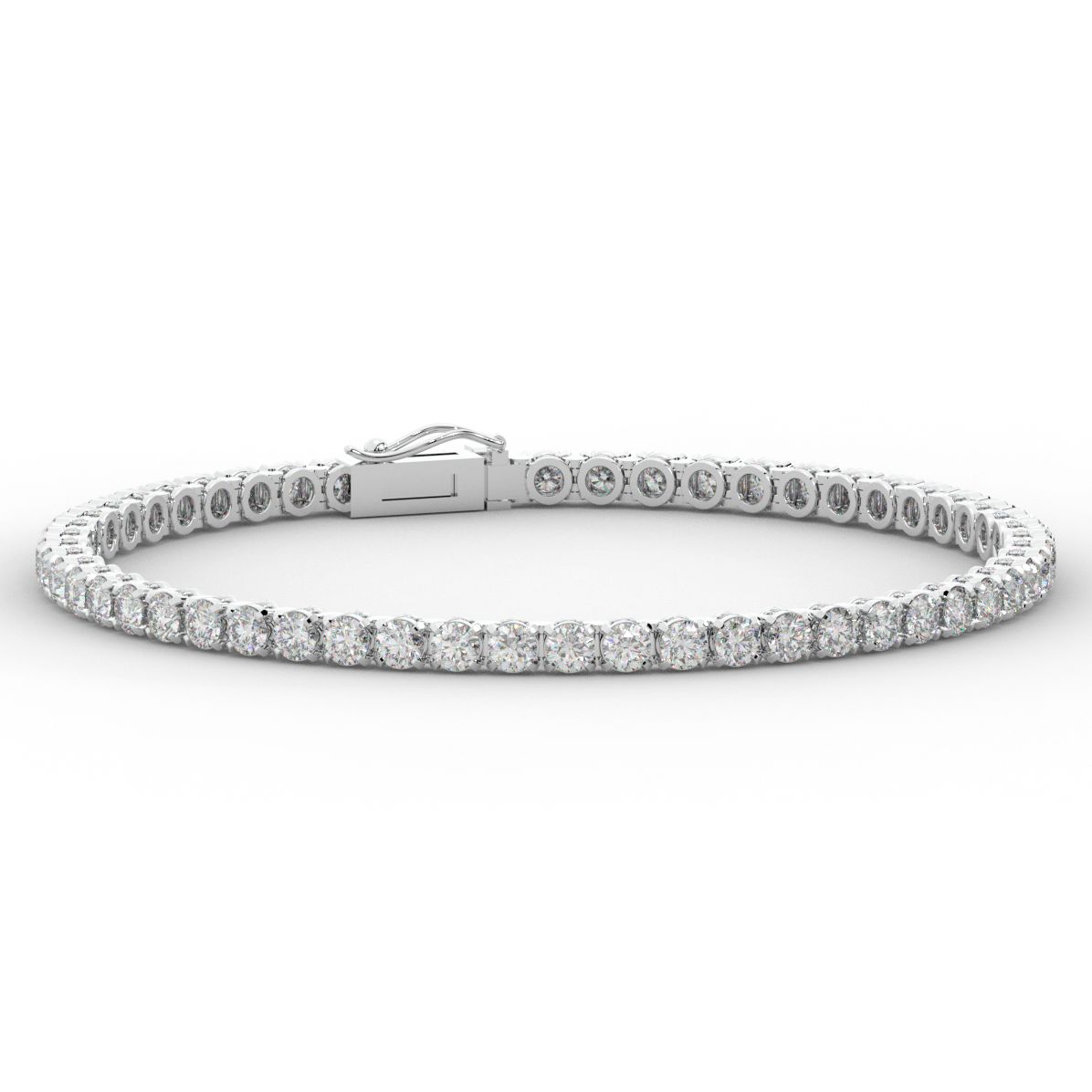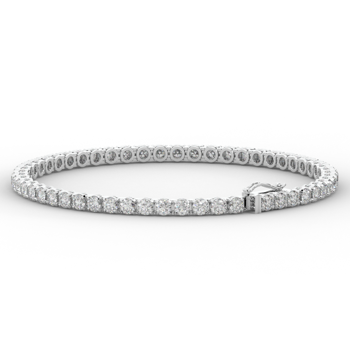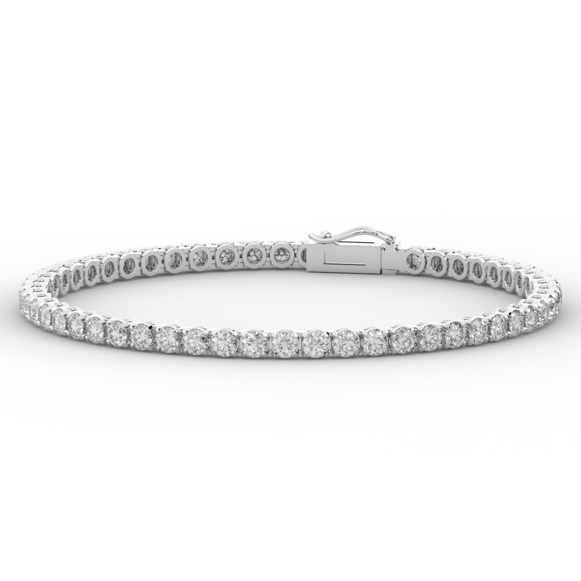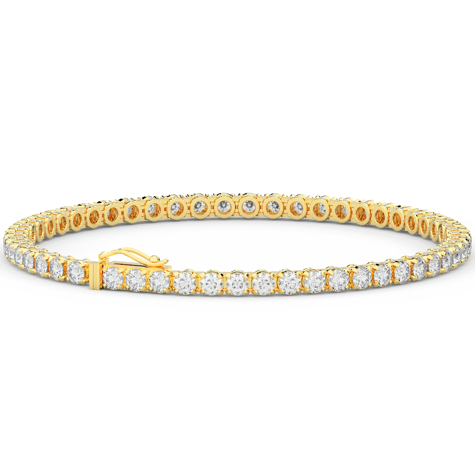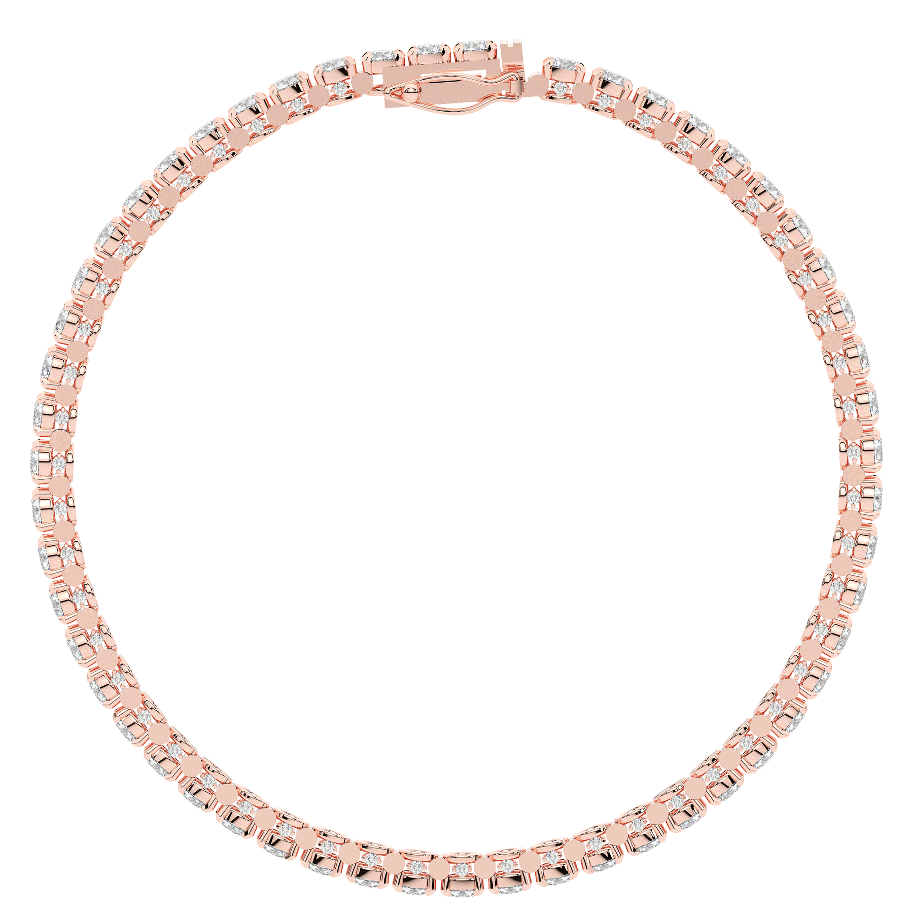 This tennis bracelet features a stunning design a bright round lab grown diamond and 2 lab grown round diamonds in an underhalo style per link. The clasp features a second step for safety as well as an external safety latch for added protection. This tennis bracelet is available in 14k white, yellow, or rose gold.