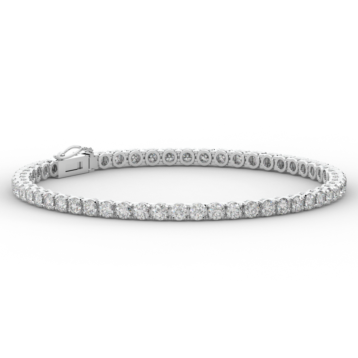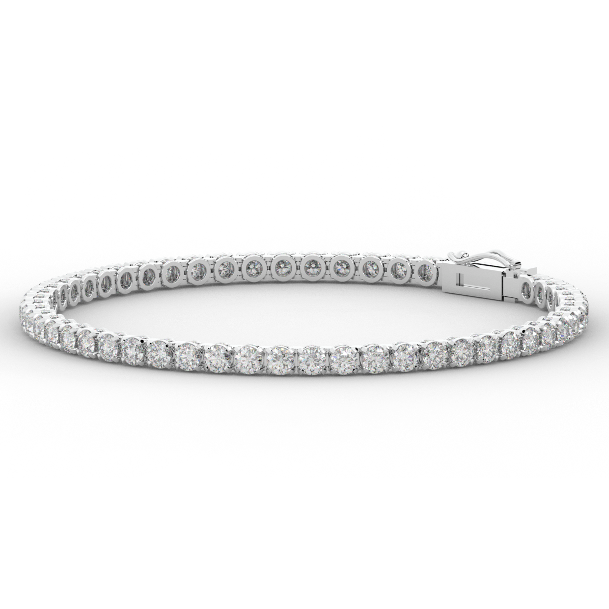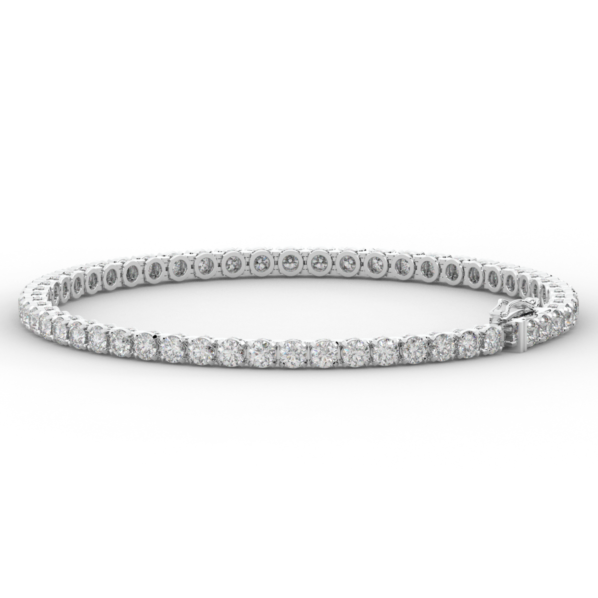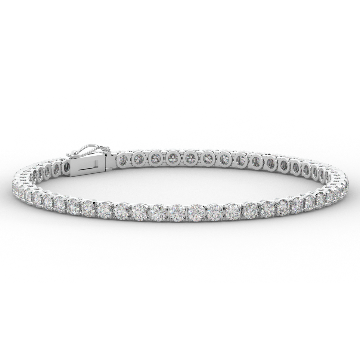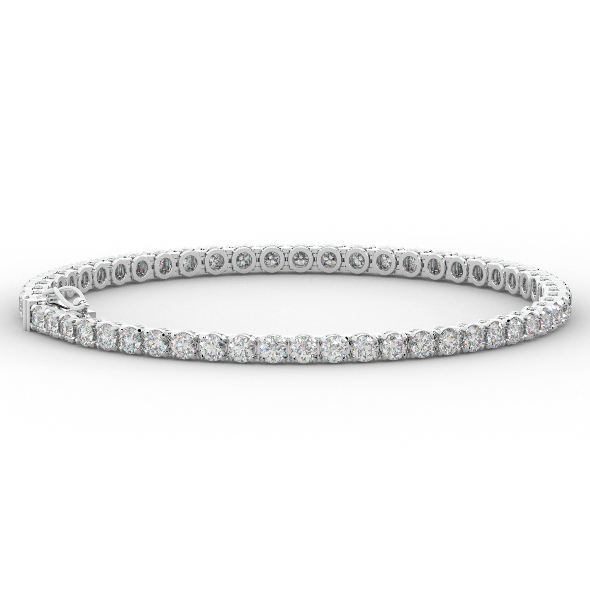 This tennis bracelet features a stunning design a bright round lab grown diamond and 2 lab grown round diamonds in an underhalo style per link. The clasp features a second step for safety as well as an external safety latch for added protection. This tennis bracelet is available in 14k white, yellow, or rose gold.