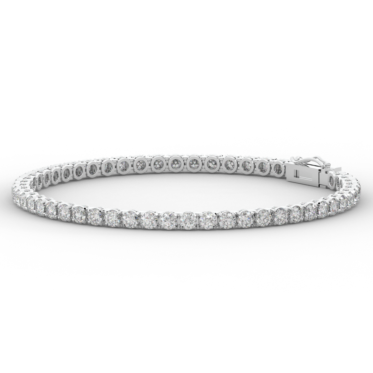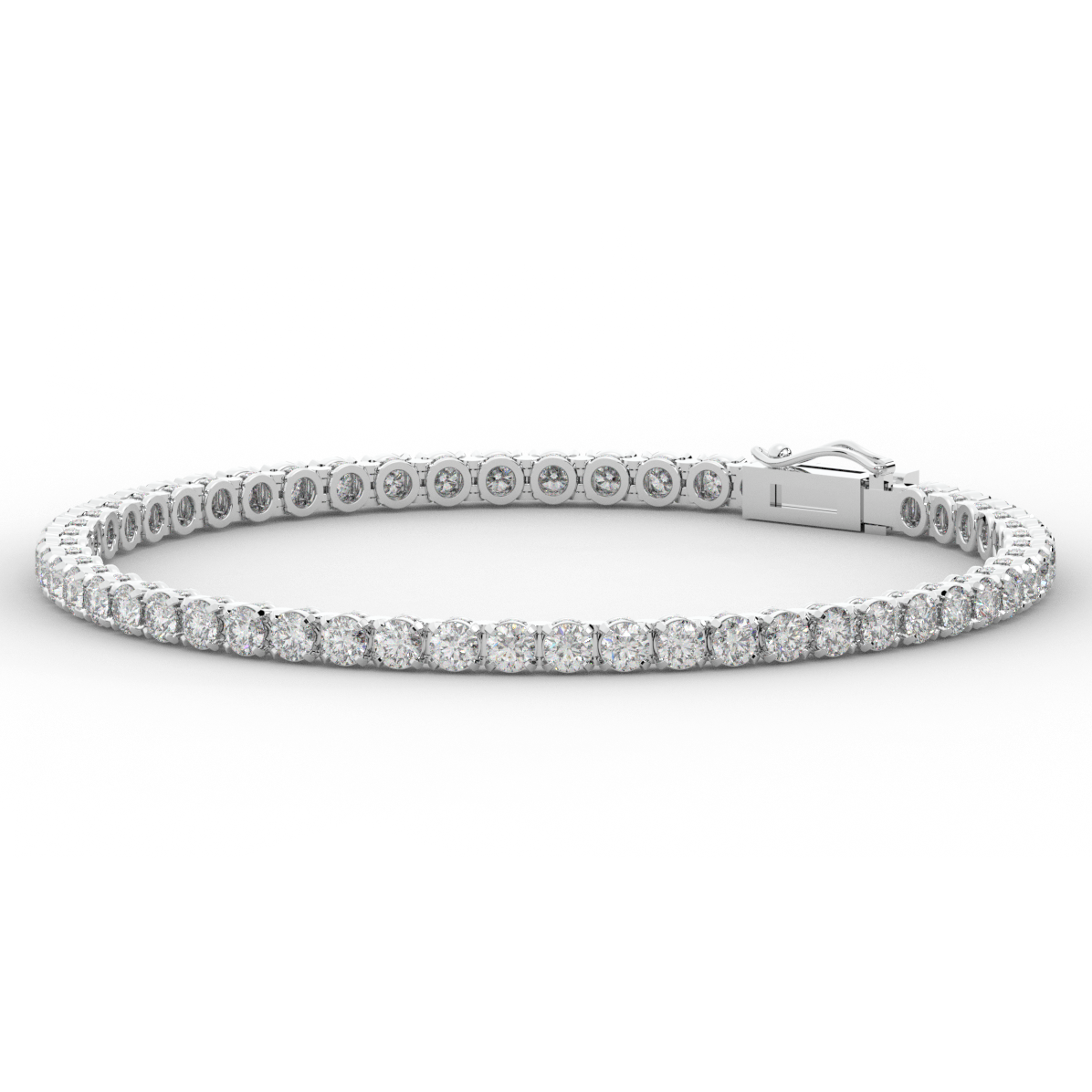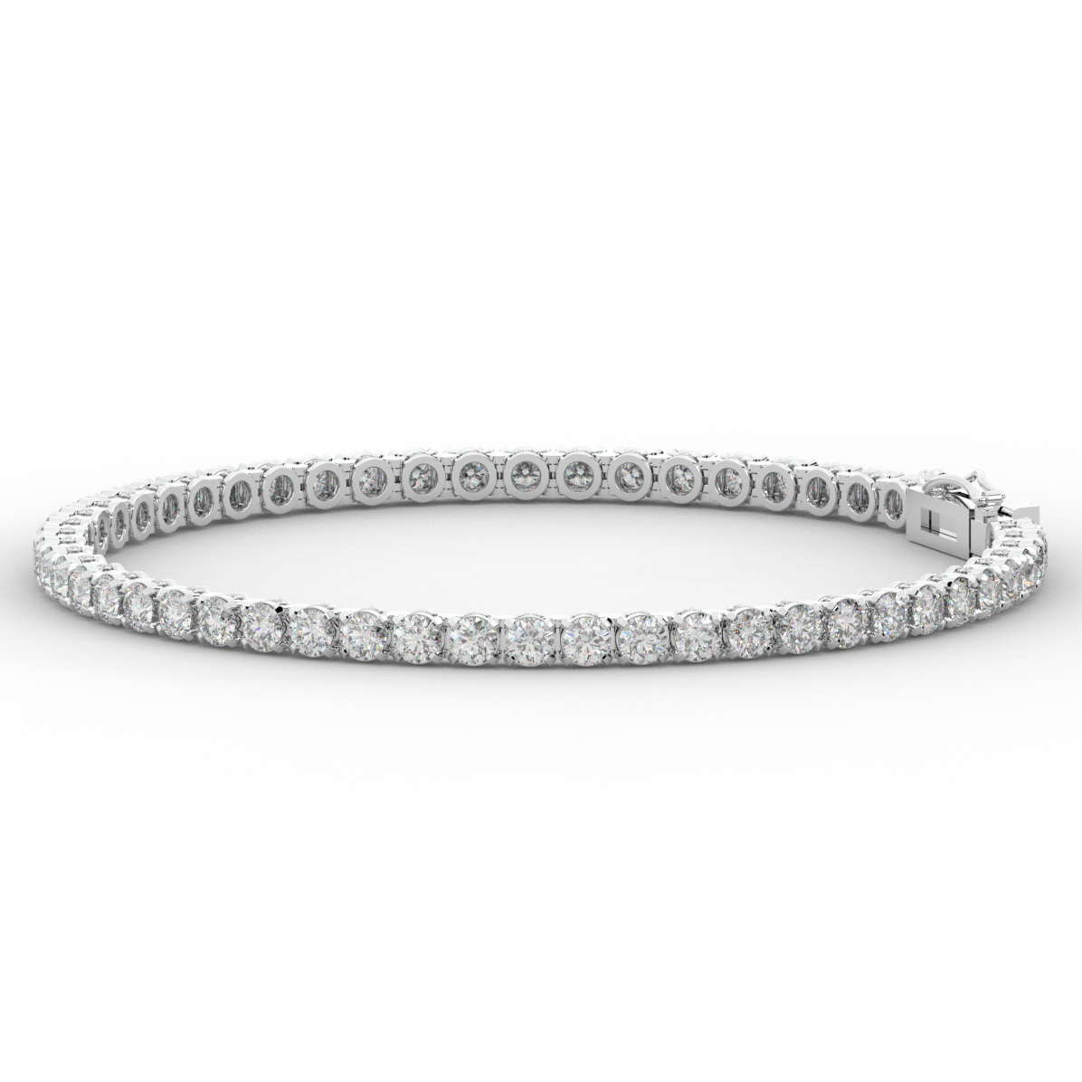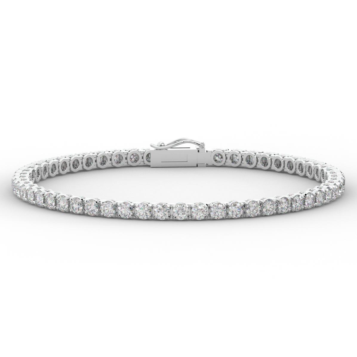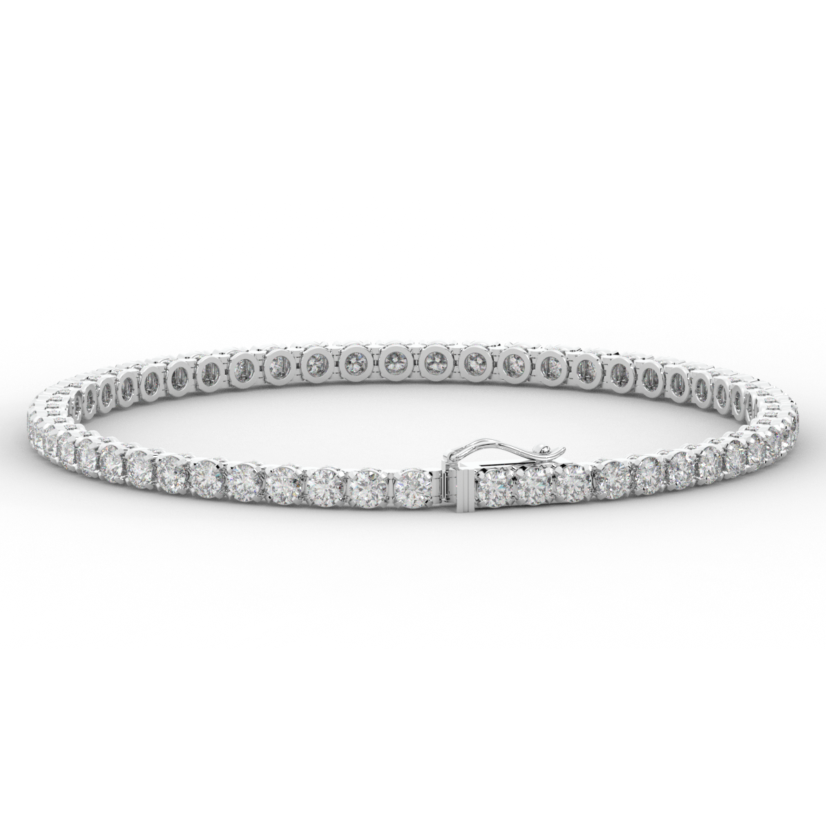 This tennis bracelet features a stunning design a bright round lab grown diamond and 2 lab grown round diamonds in an underhalo style per link. The clasp features a second step for safety as well as an external safety latch for added protection. This tennis bracelet is available in 14k white, yellow, or rose gold.