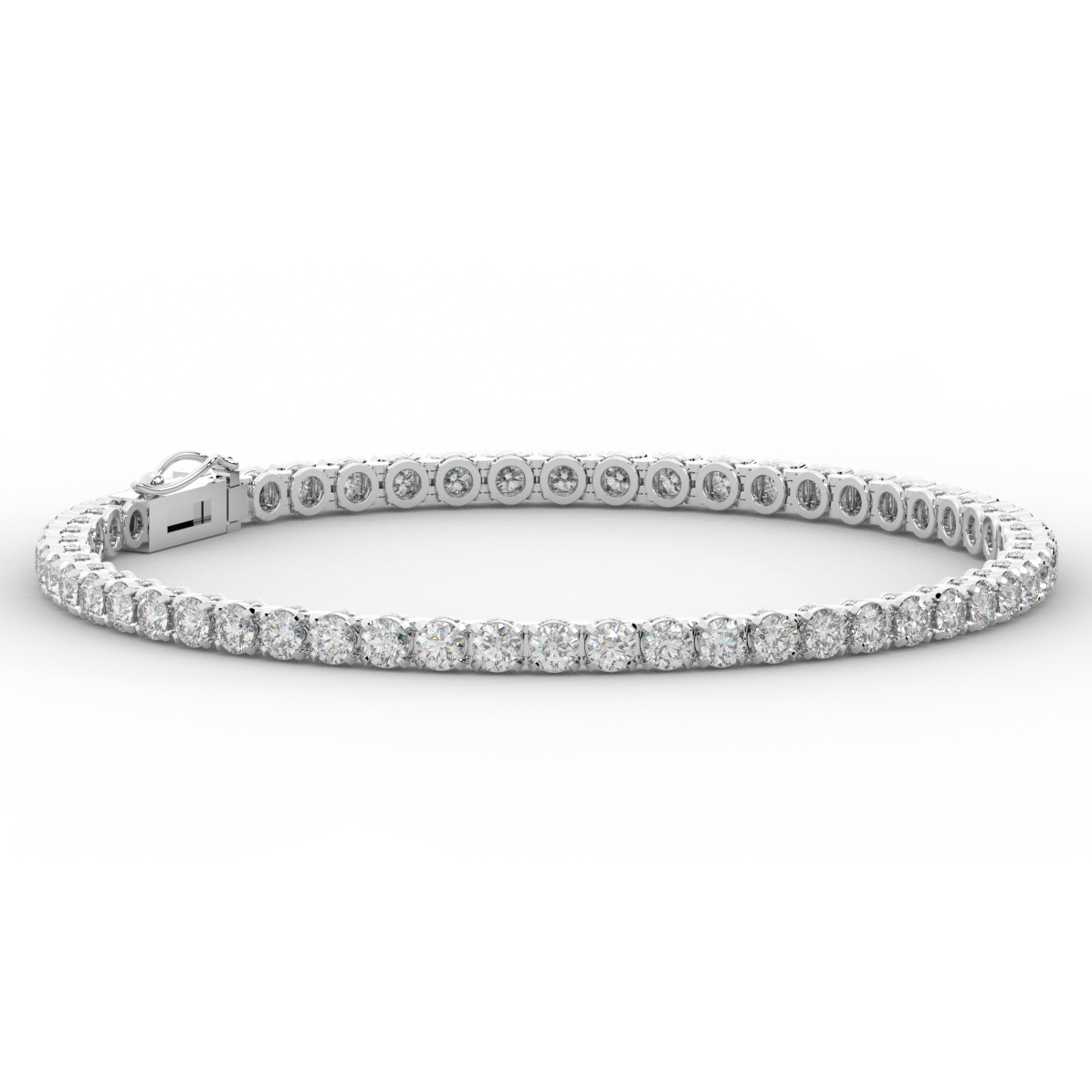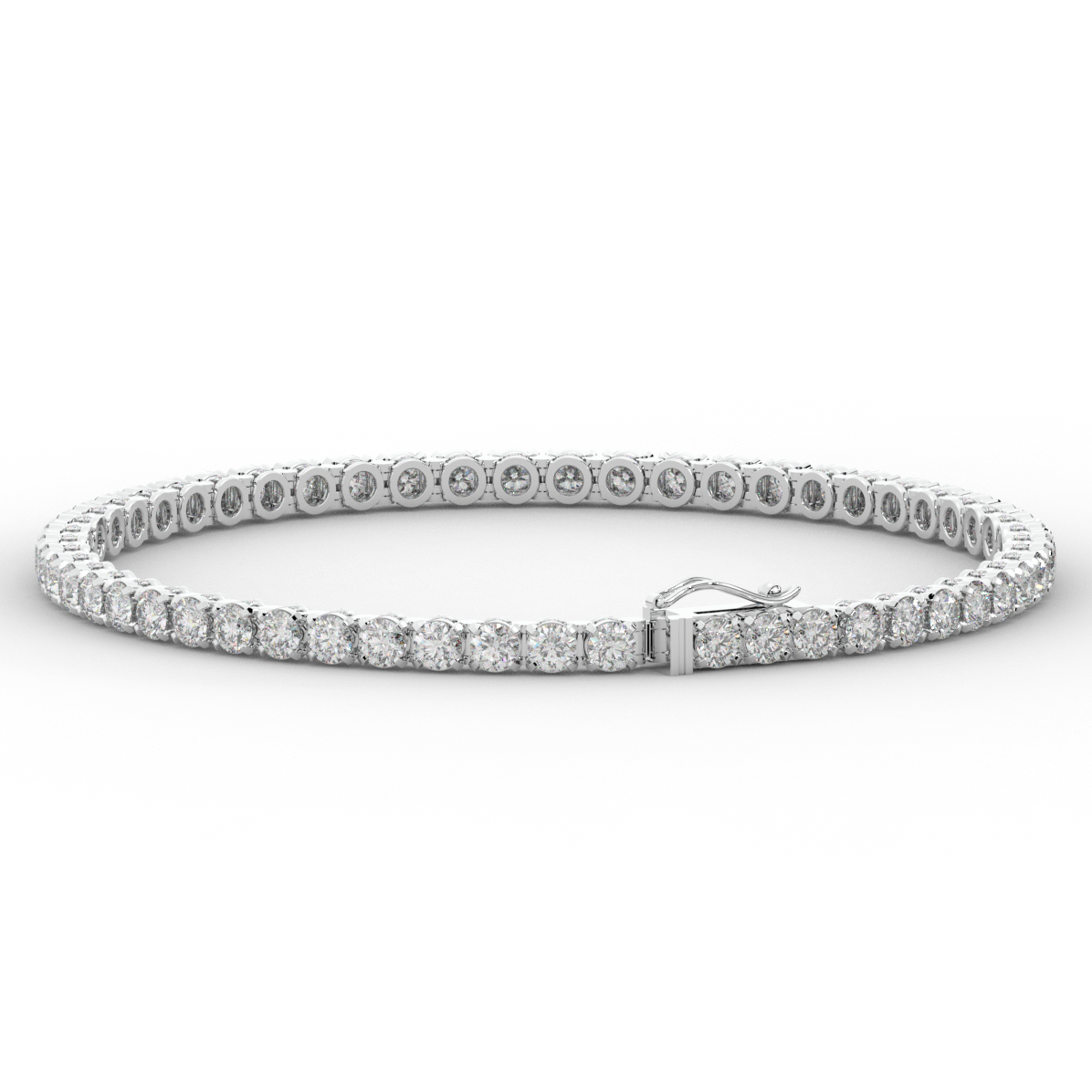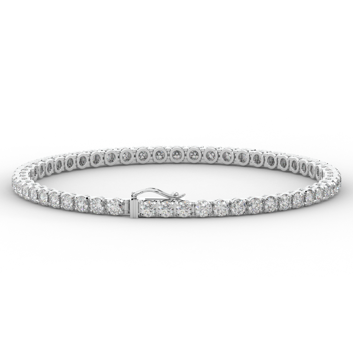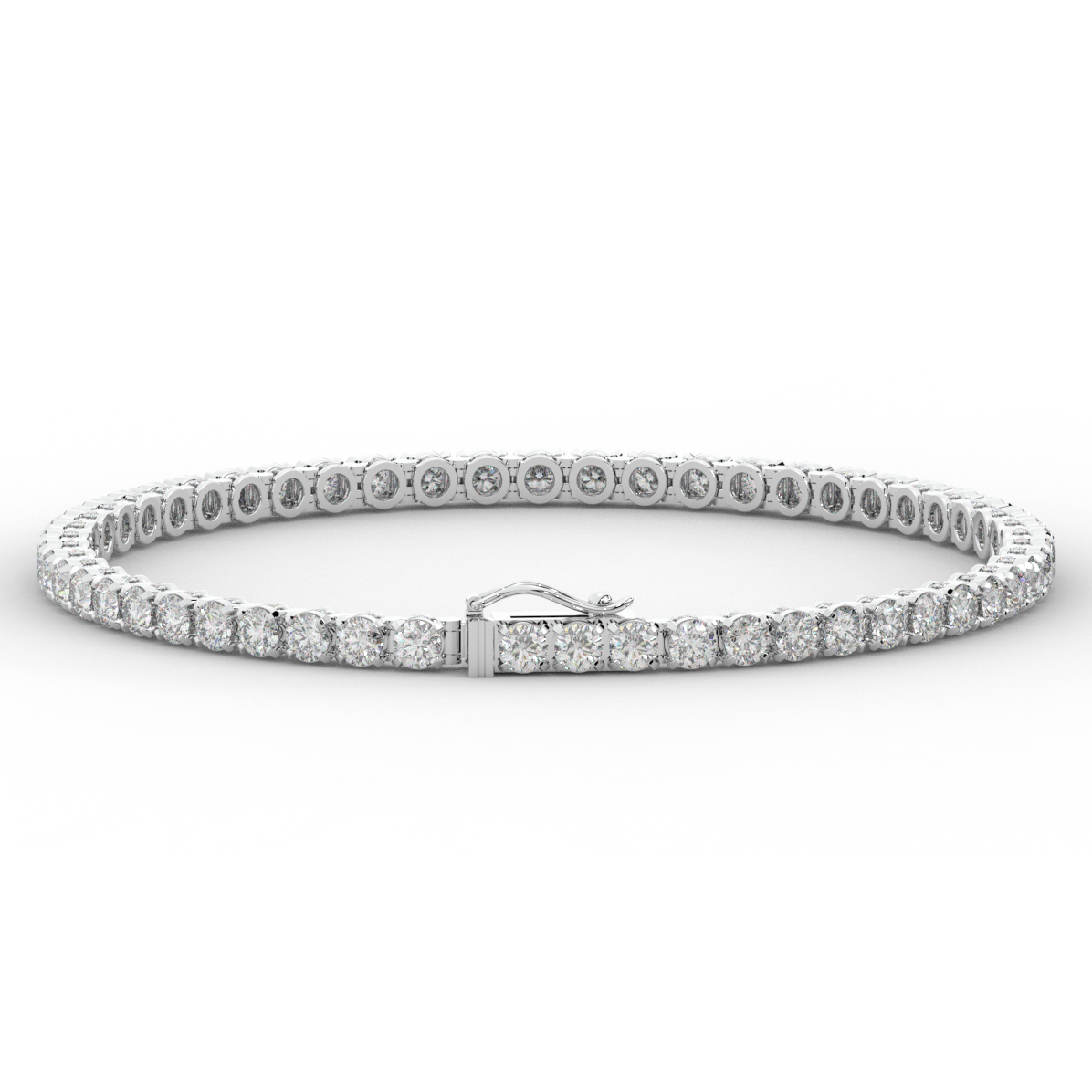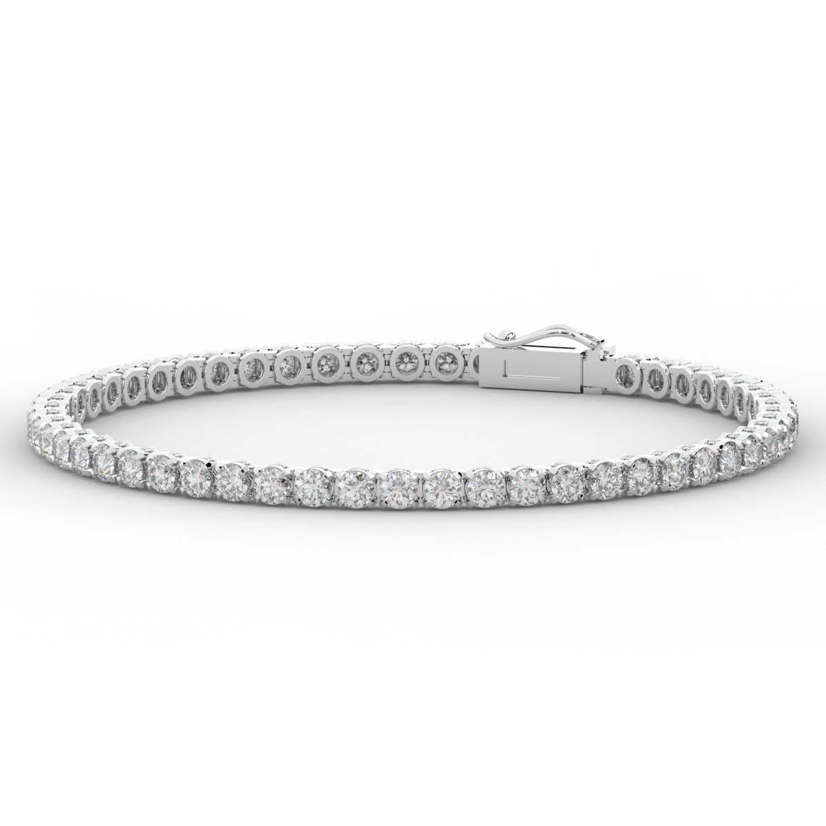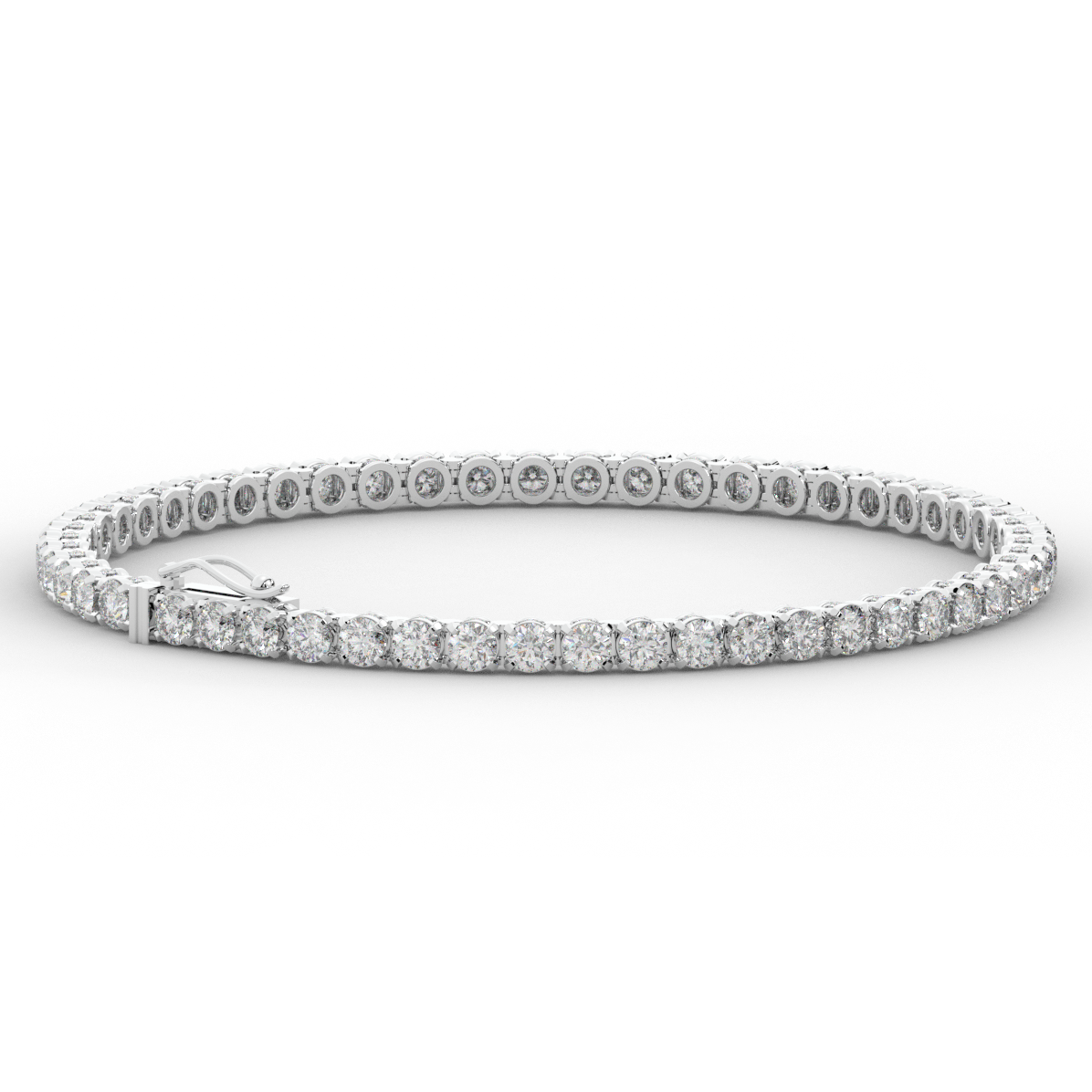 This tennis bracelet features a stunning design a bright round lab grown diamond and 2 lab grown round diamonds in an underhalo style per link. The clasp features a second step for safety as well as an external safety latch for added protection. This tennis bracelet is available in 14k white, yellow, or rose gold.