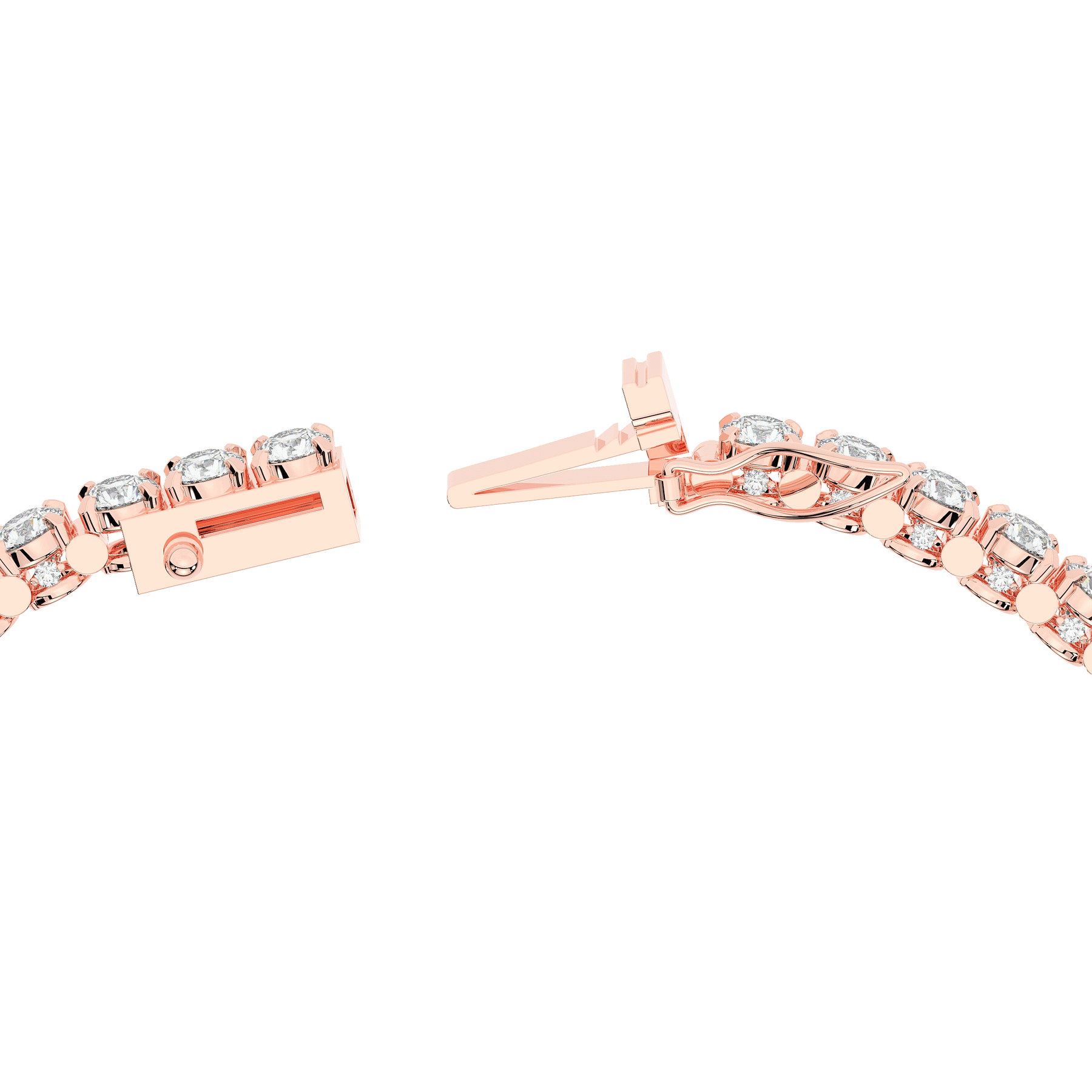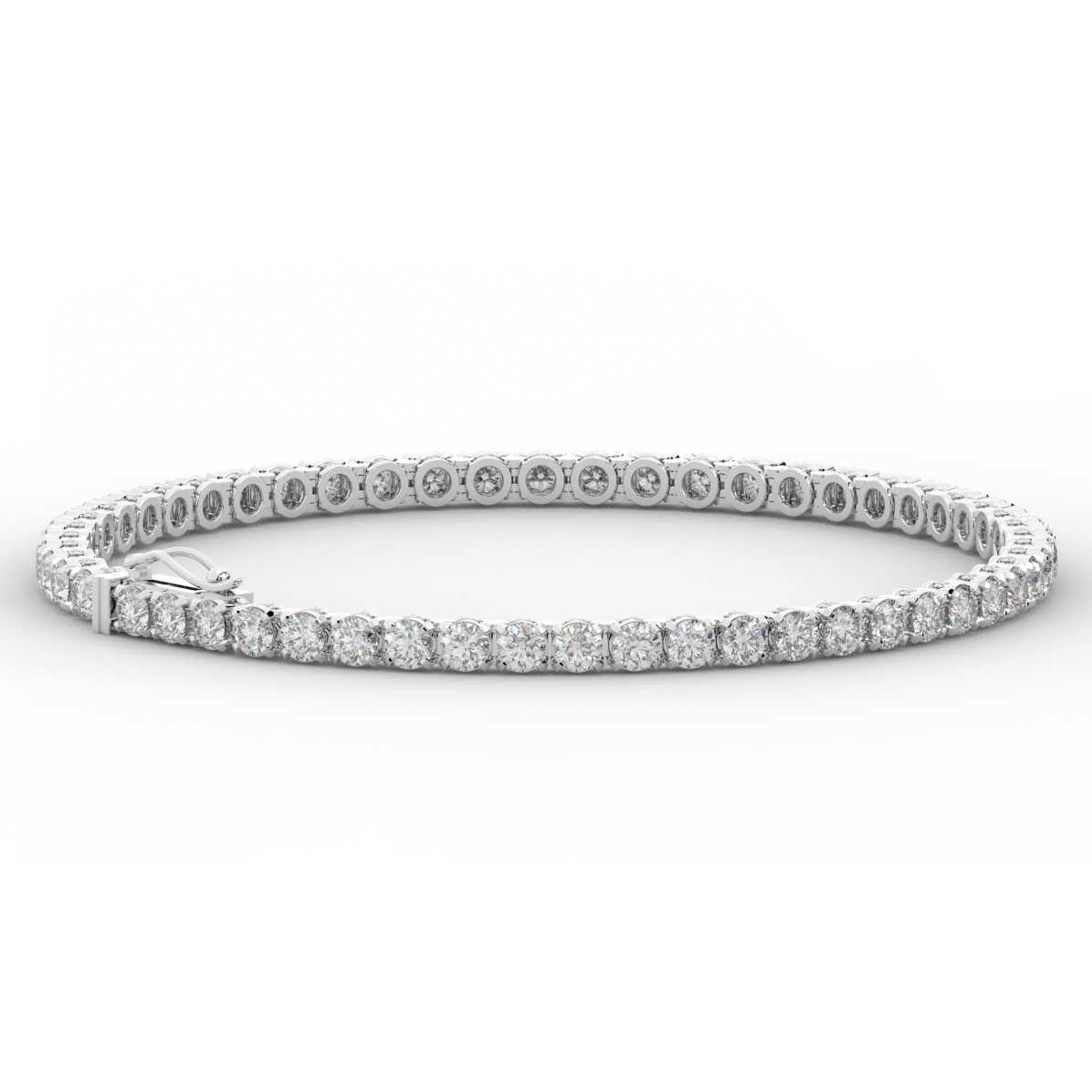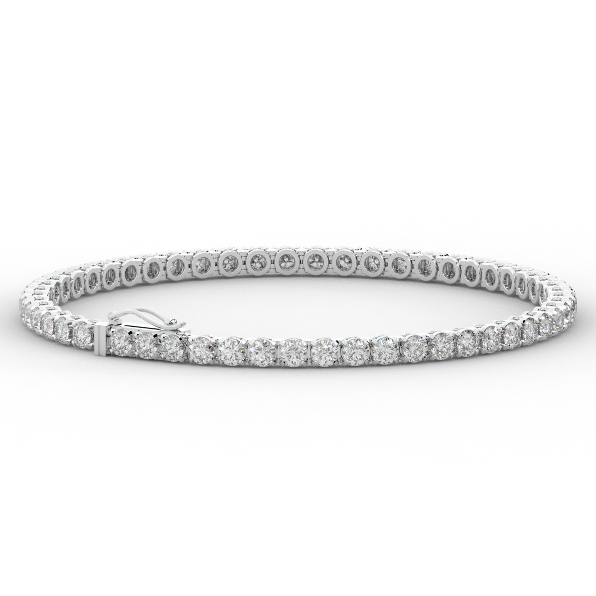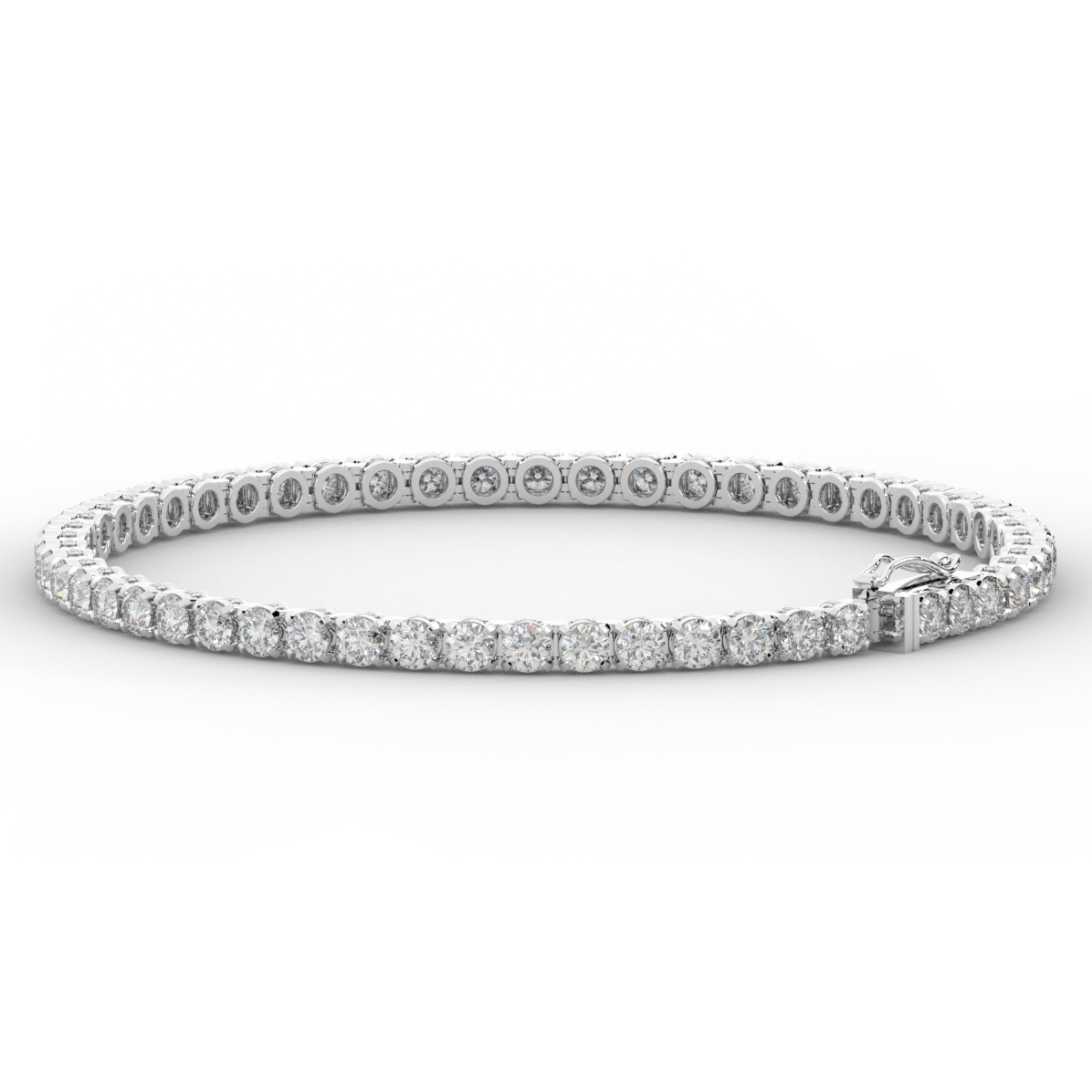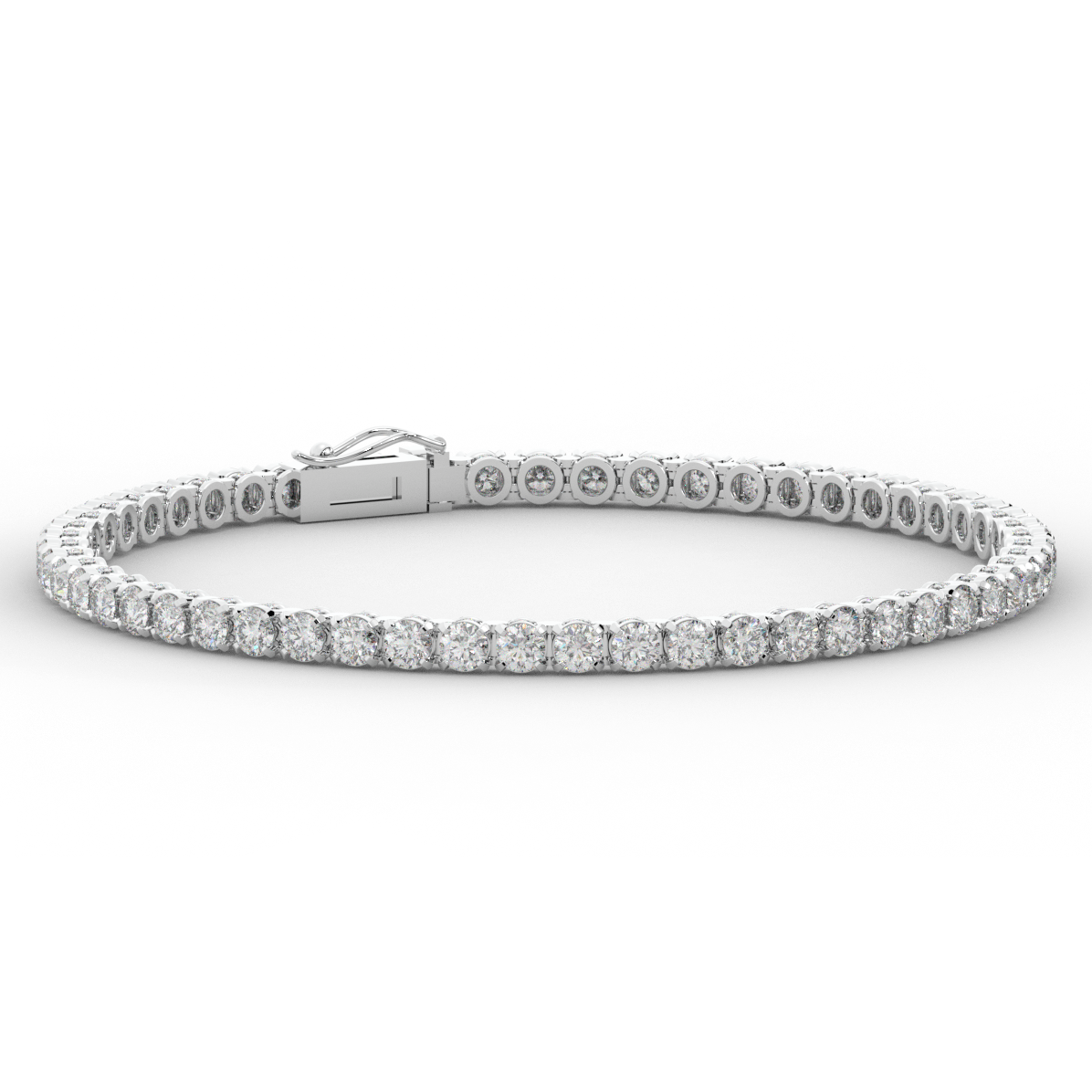 This tennis bracelet features a stunning design a bright round lab grown diamond and 2 lab grown round diamonds in an underhalo style per link. The clasp features a second step for safety as well as an external safety latch for added protection. This tennis bracelet is available in 14k white, yellow, or rose gold.