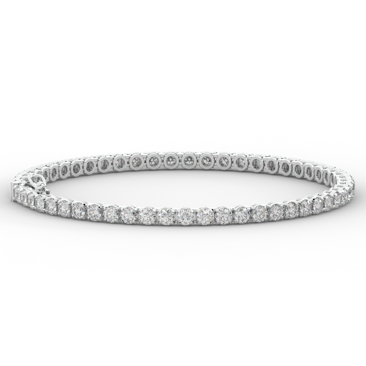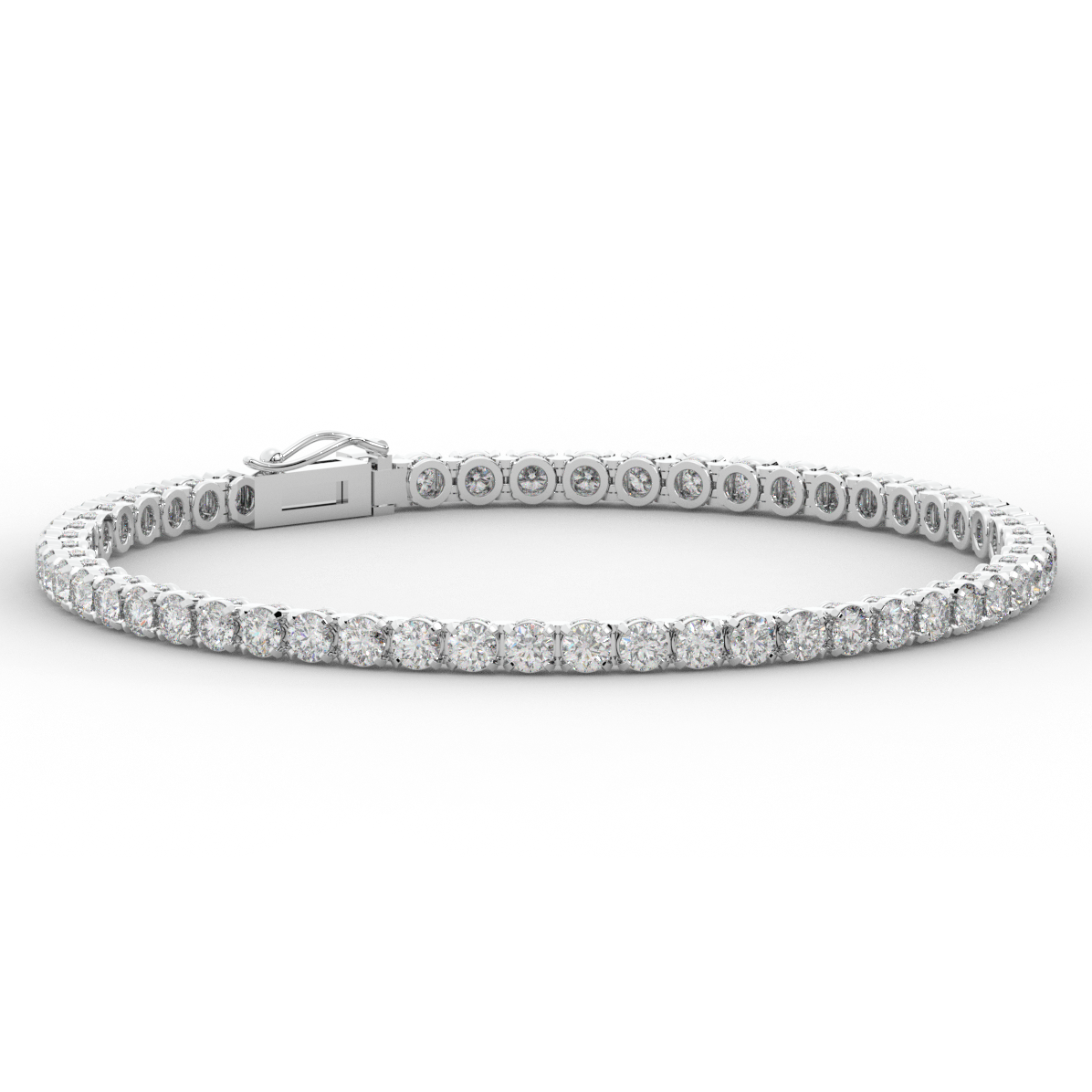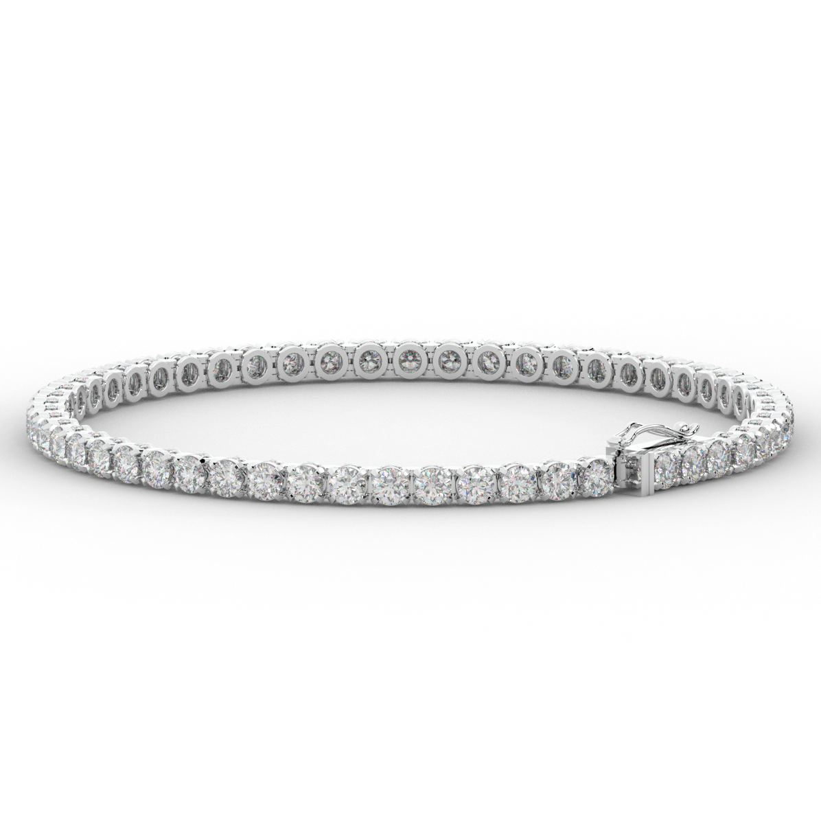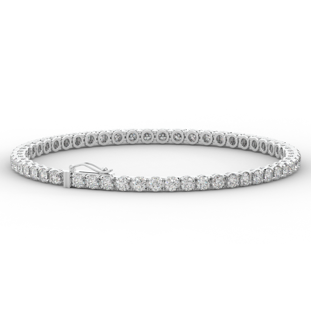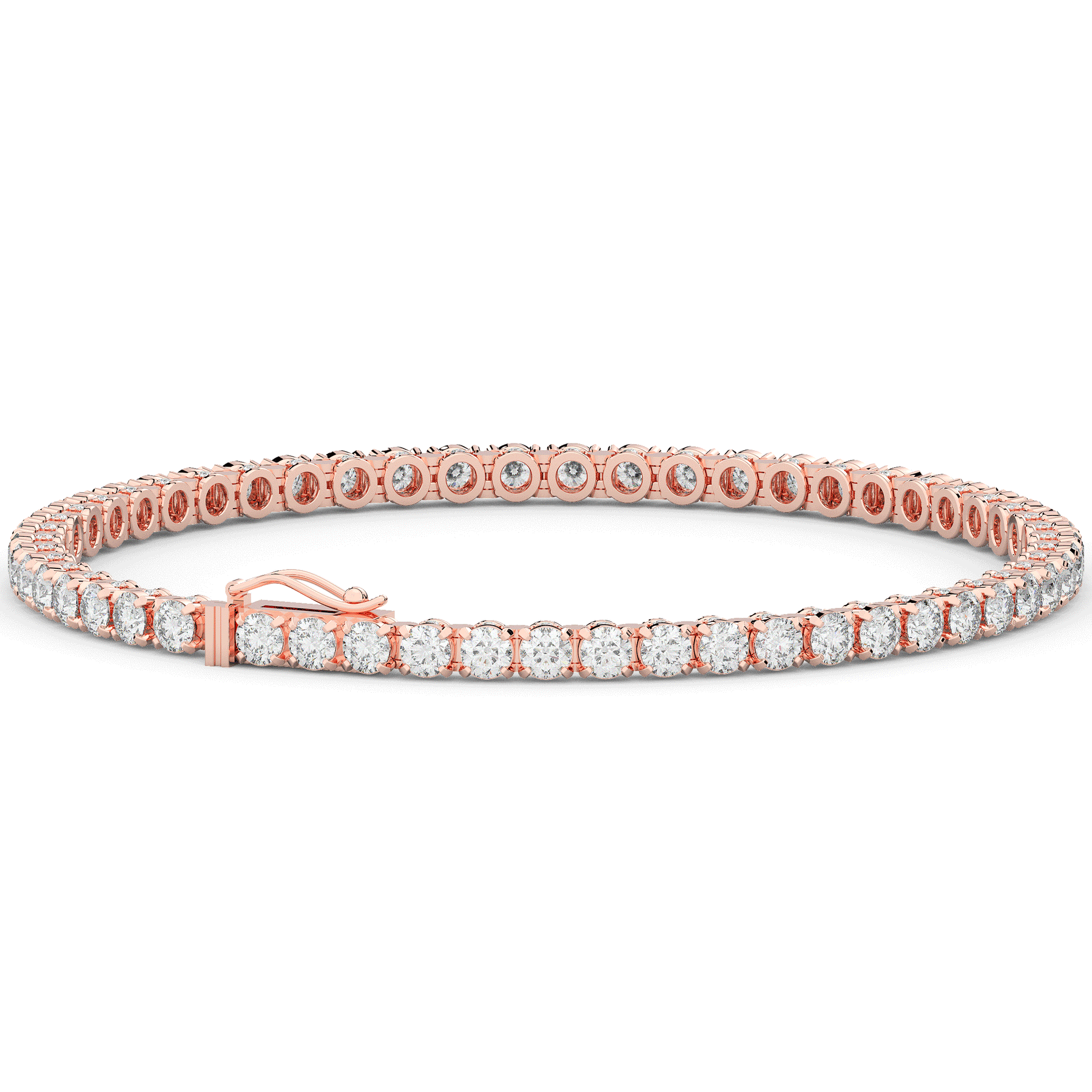 This tennis bracelet features a stunning design a bright round lab grown diamond and 2 lab grown round diamonds in an underhalo style per link. The clasp features a second step for safety as well as an external safety latch for added protection. This tennis bracelet is available in 14k white, yellow, or rose gold.