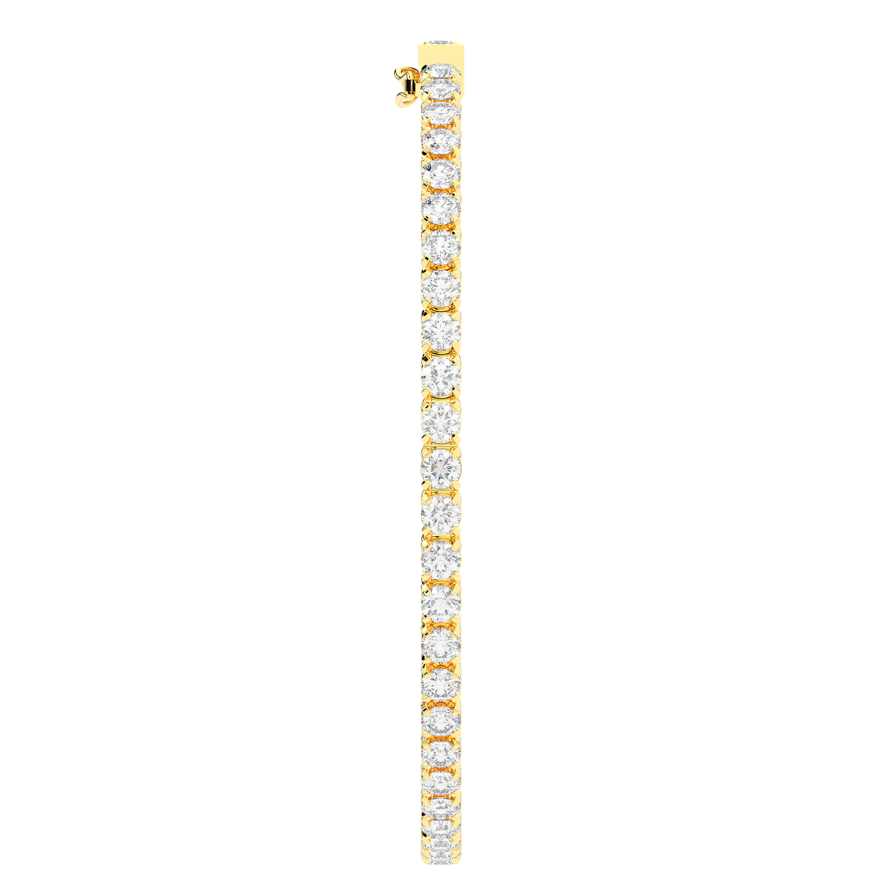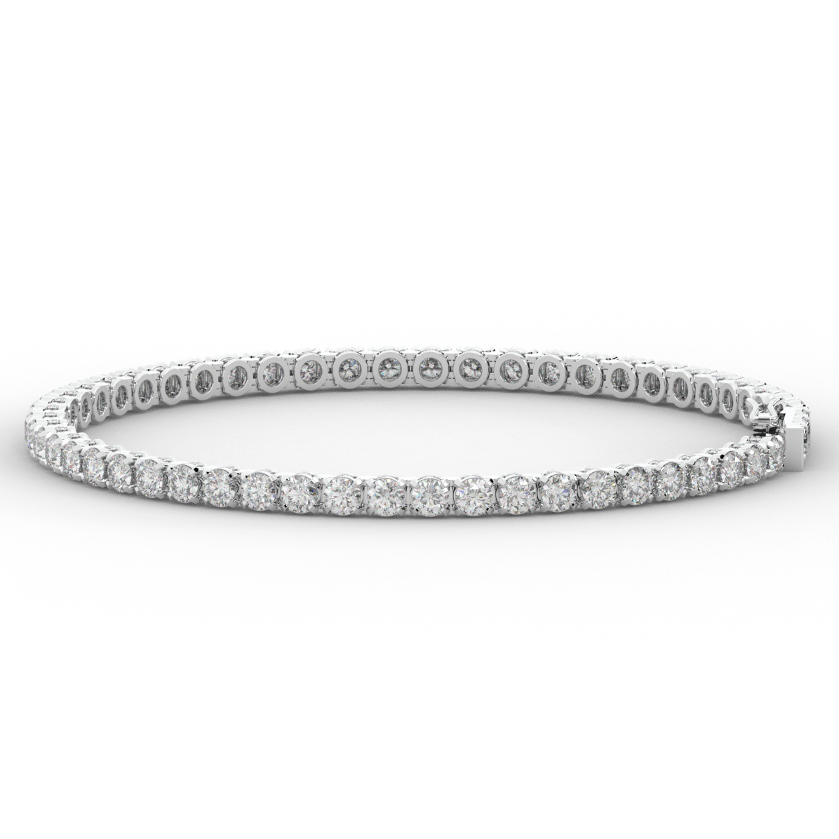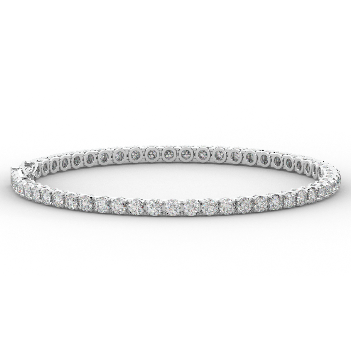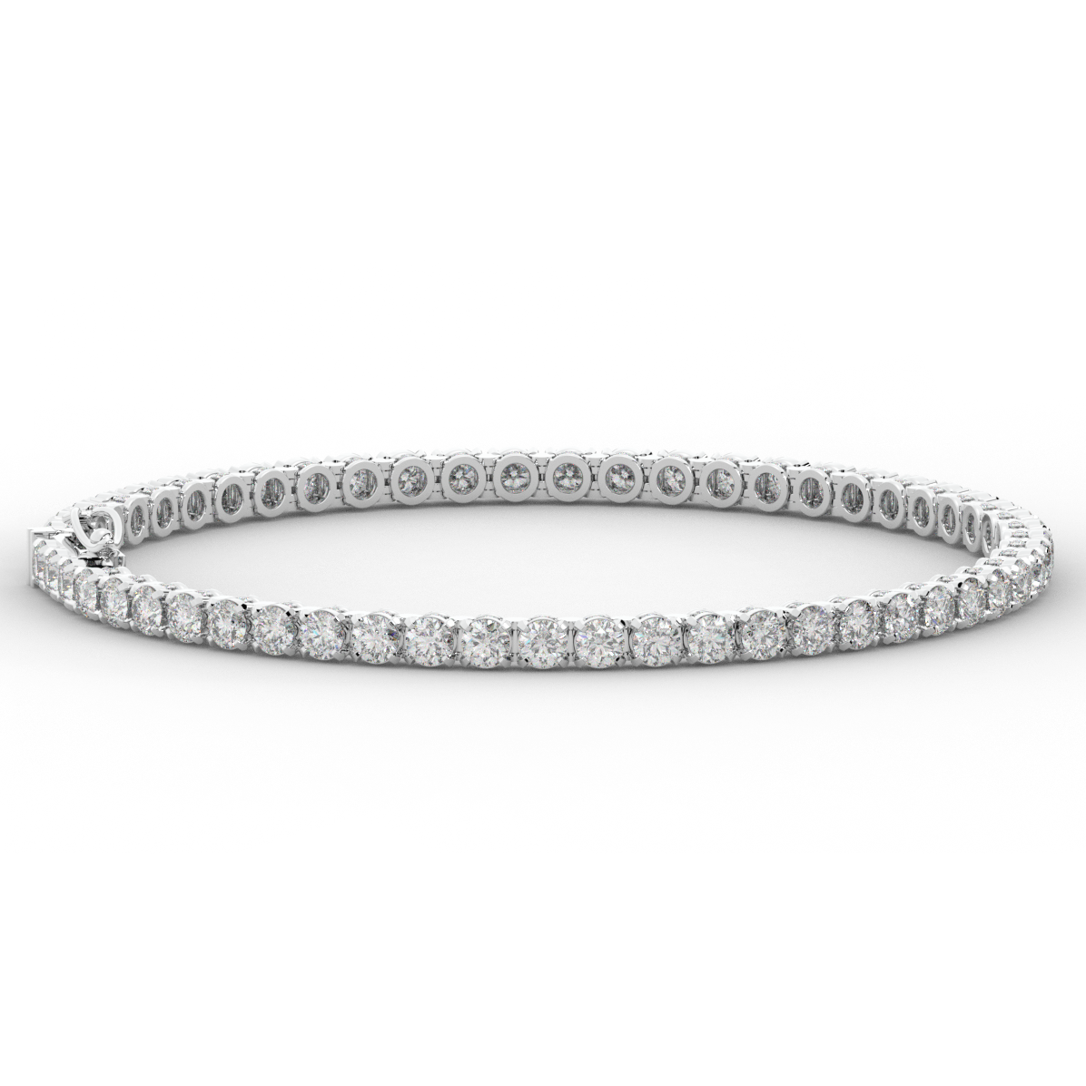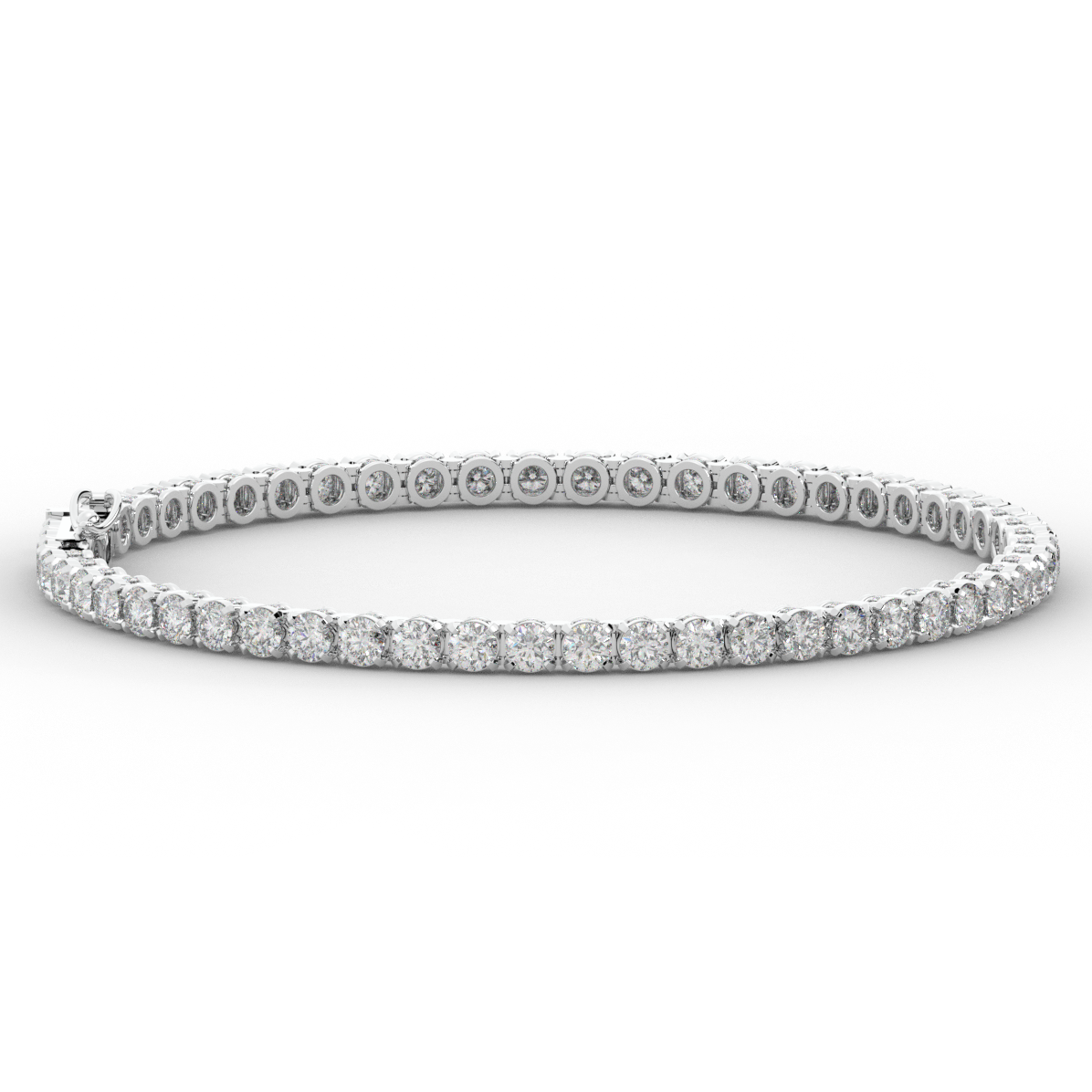 This tennis bracelet features a stunning design a bright round lab grown diamond and 2 lab grown round diamonds in an underhalo style per link. The clasp features a second step for safety as well as an external safety latch for added protection. This tennis bracelet is available in 14k white, yellow, or rose gold.