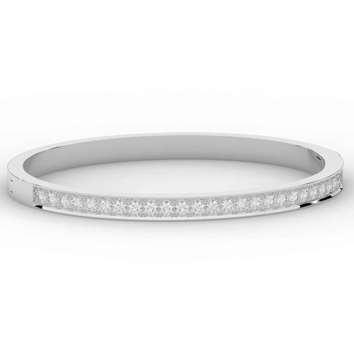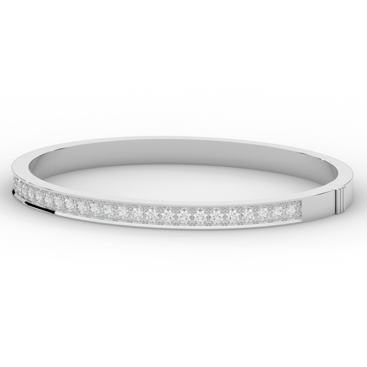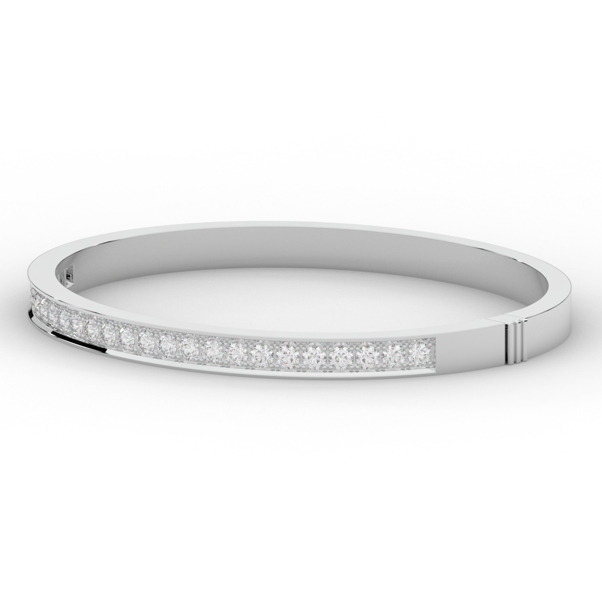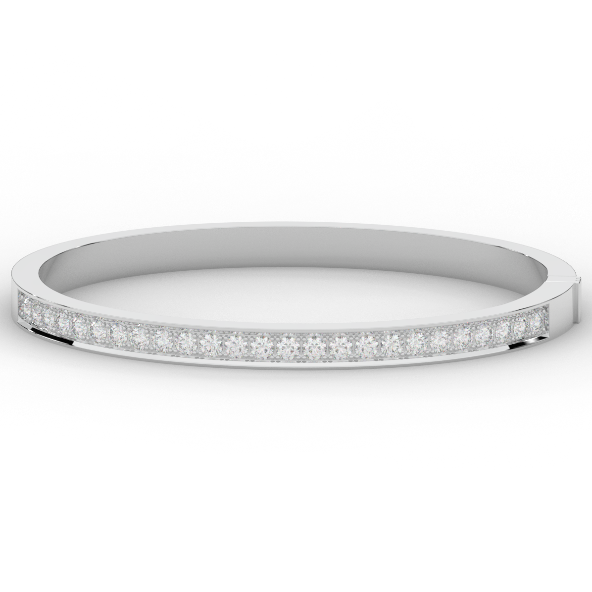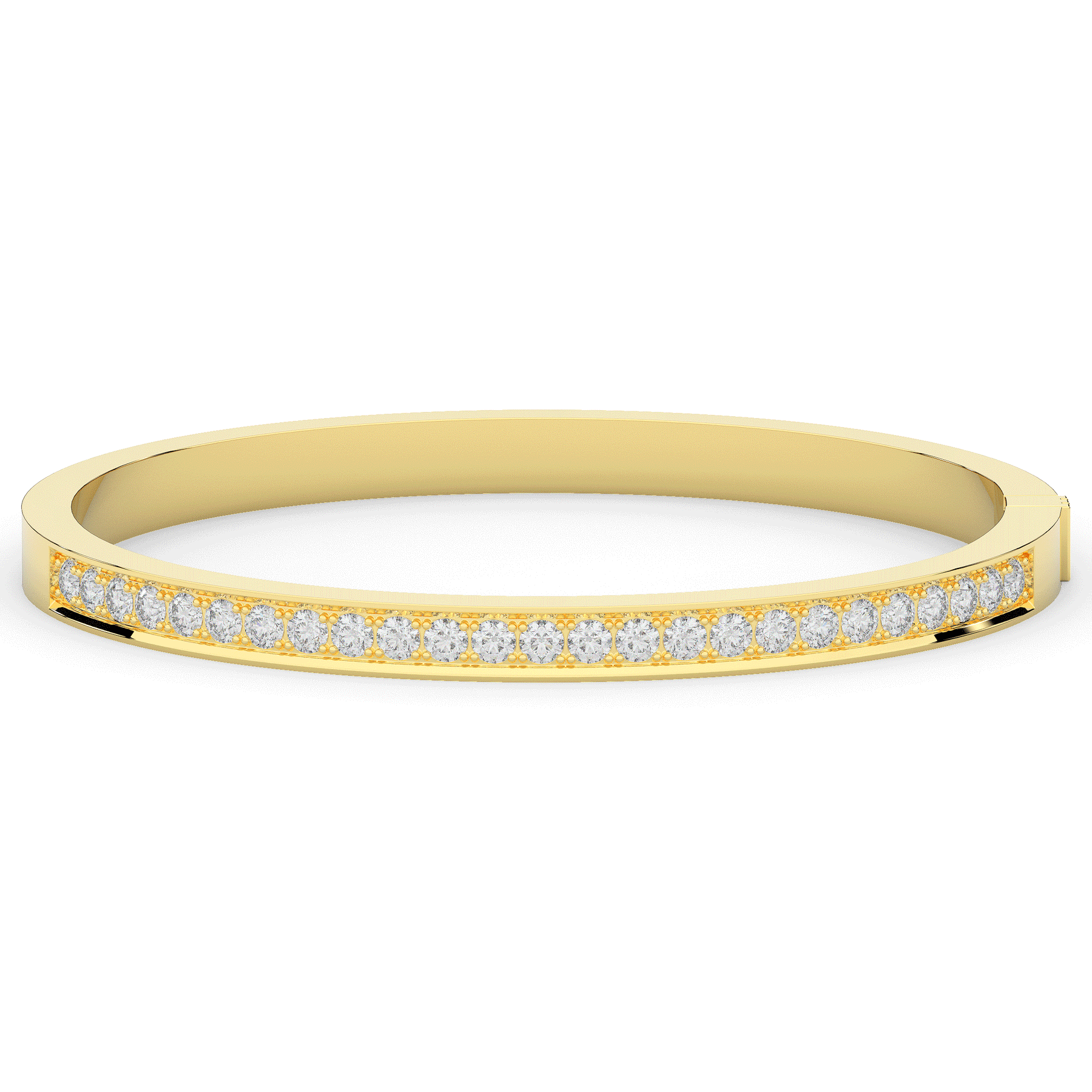 This beautiful bangle features a channel of prong set bright lab grown round diamonds, with a latch that has a second catch for safety. This bangle is available in 14k white, yellow, or rose gold.