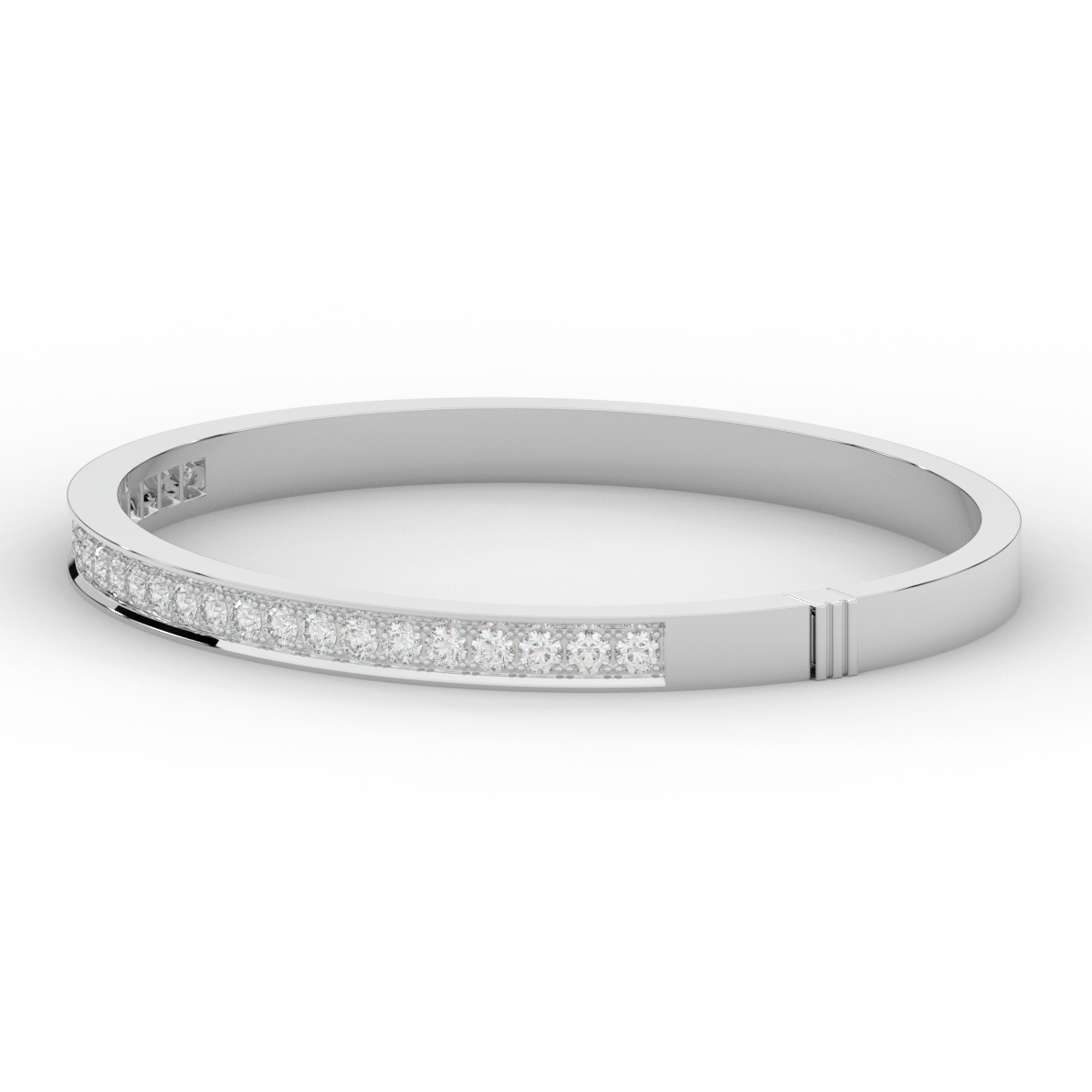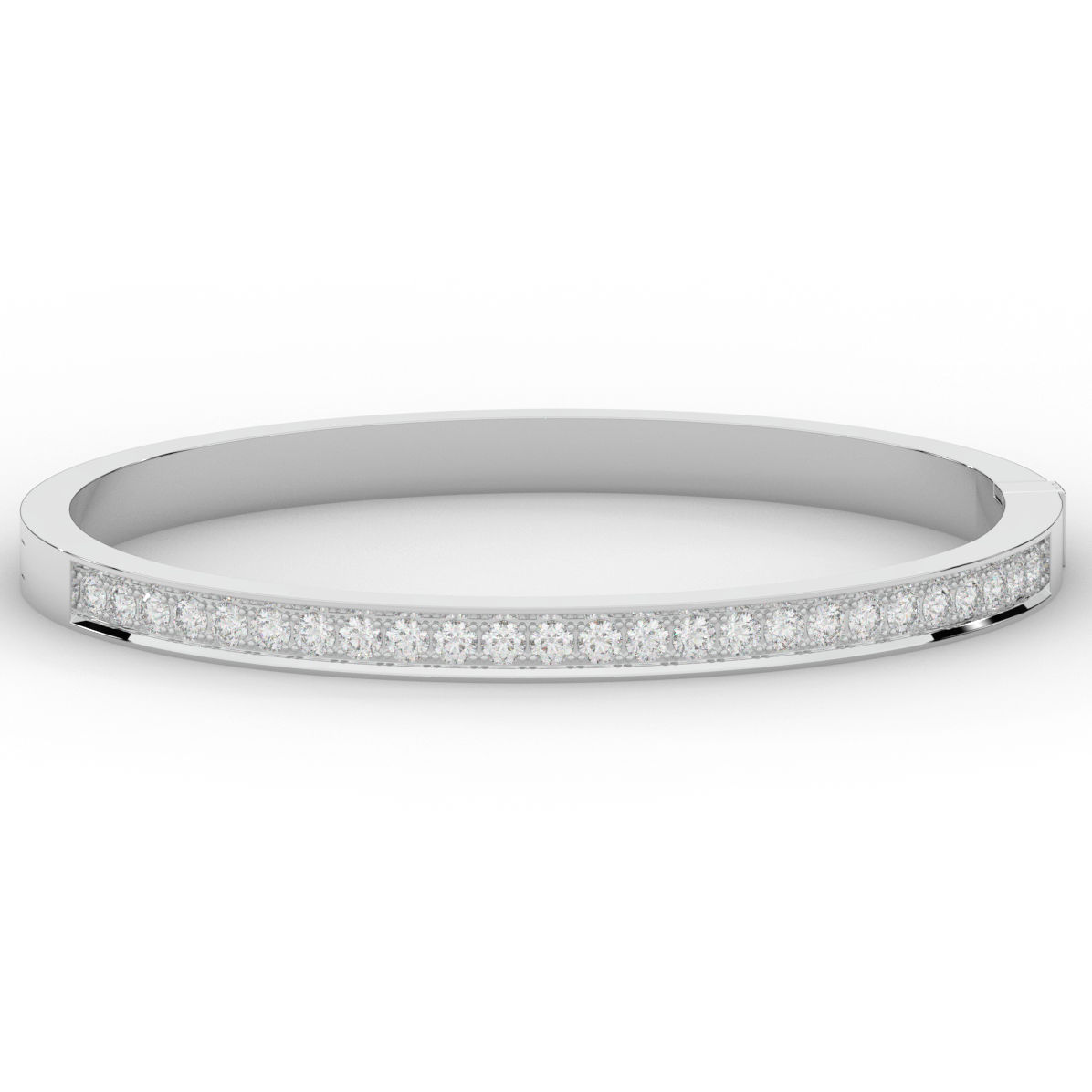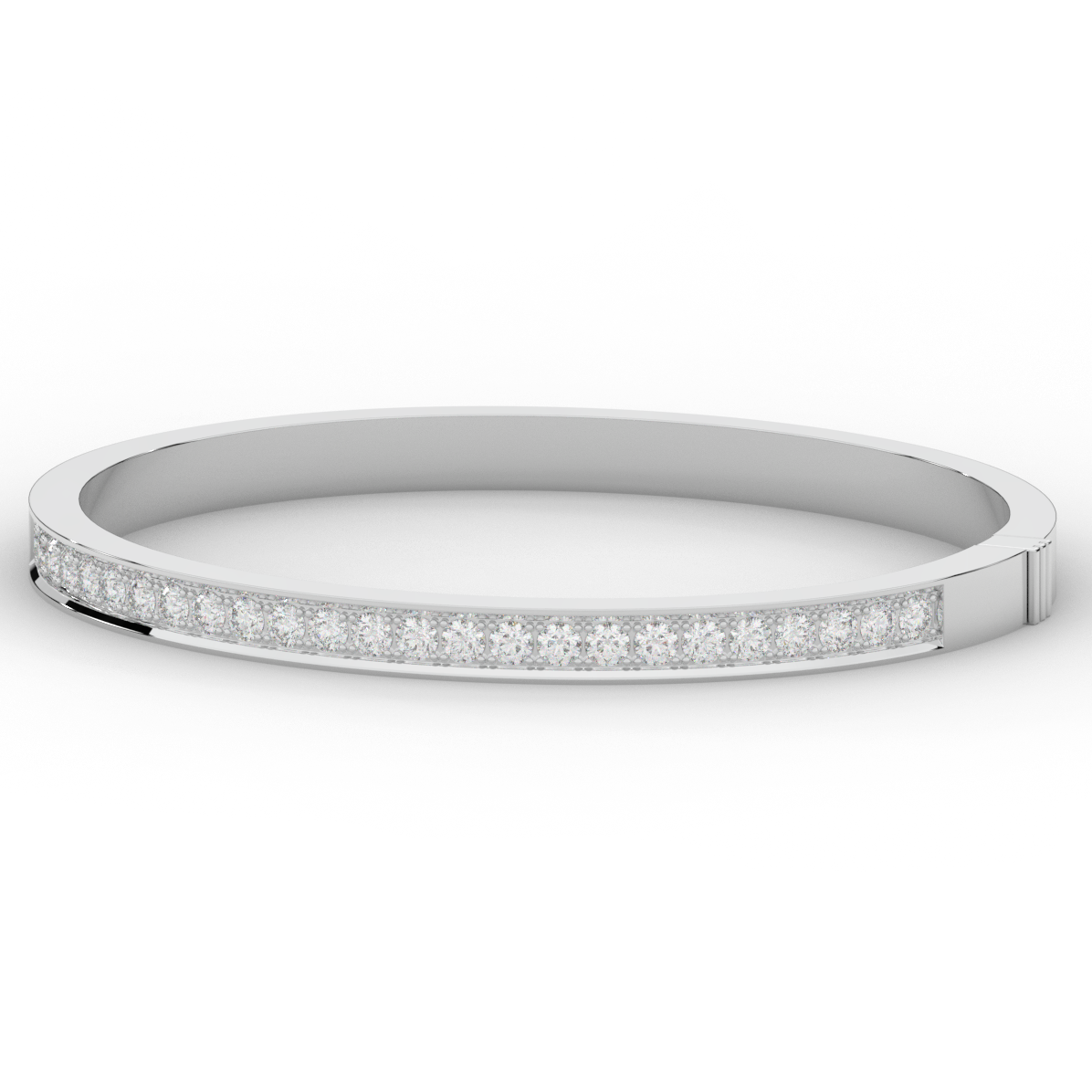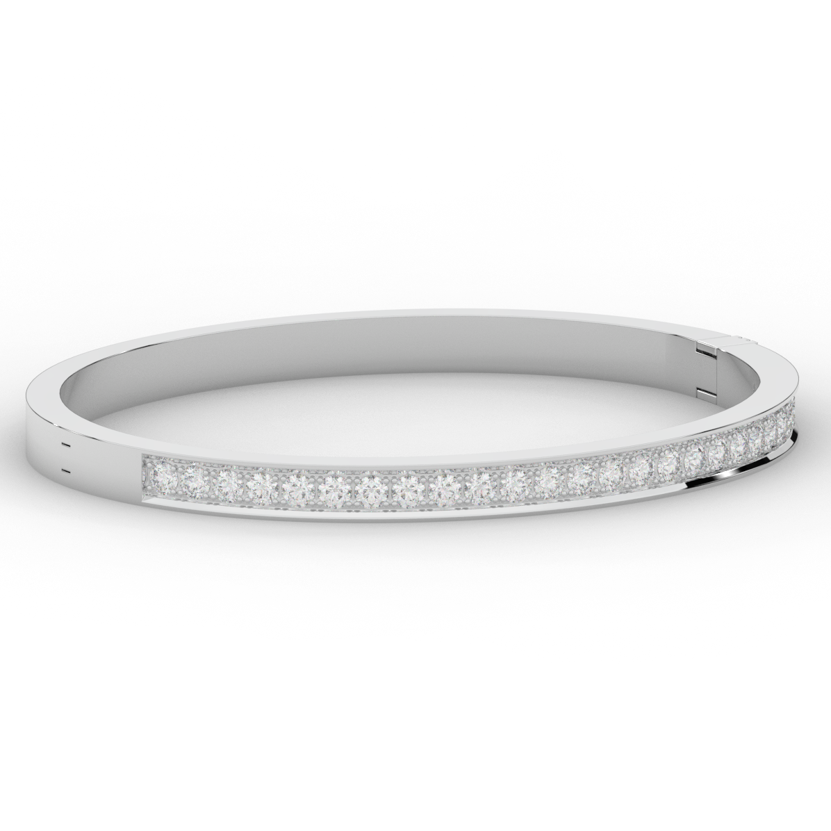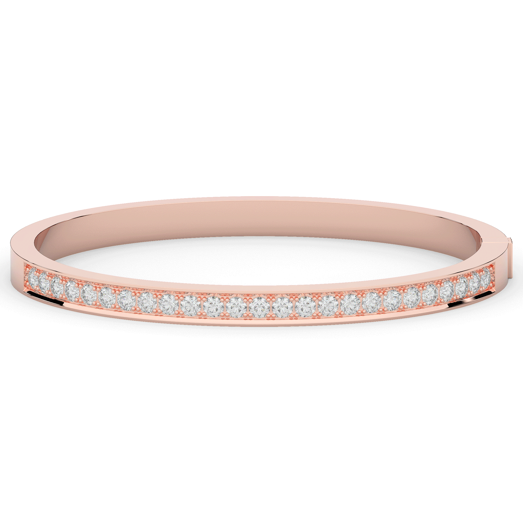 This beautiful bangle features a channel of prong set bright lab grown round diamonds, with a latch that has a second catch for safety. This bangle is available in 14k white, yellow, or rose gold.