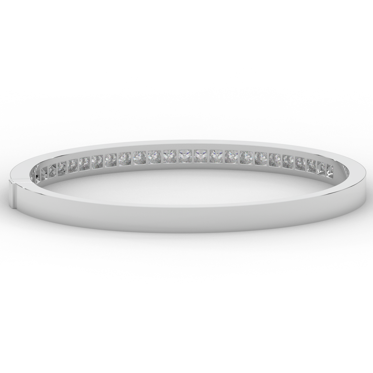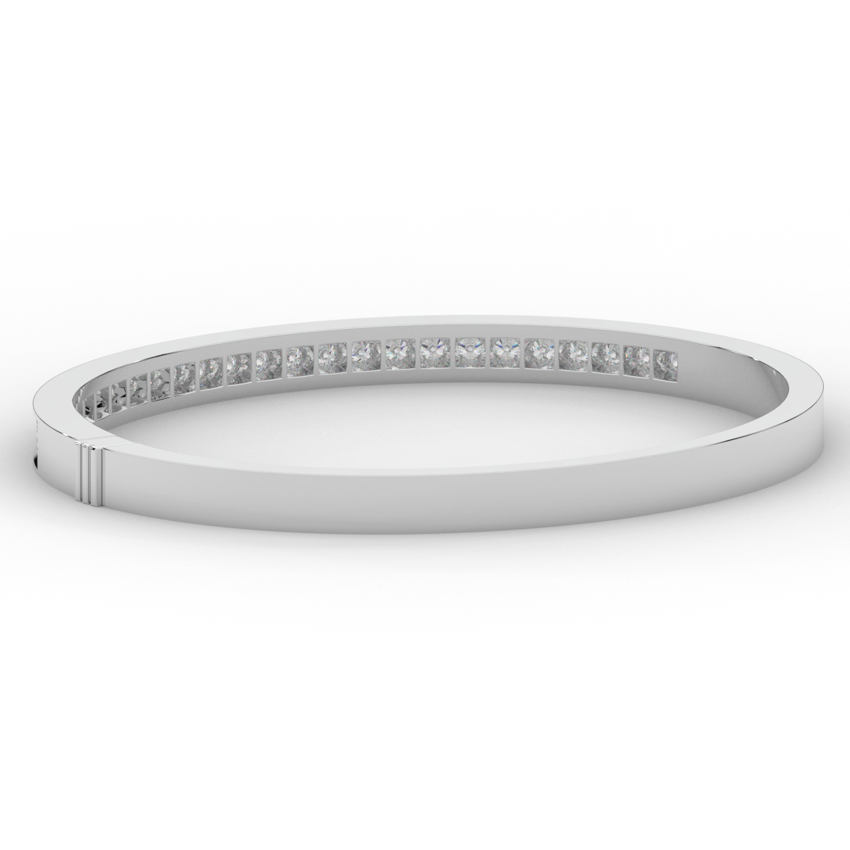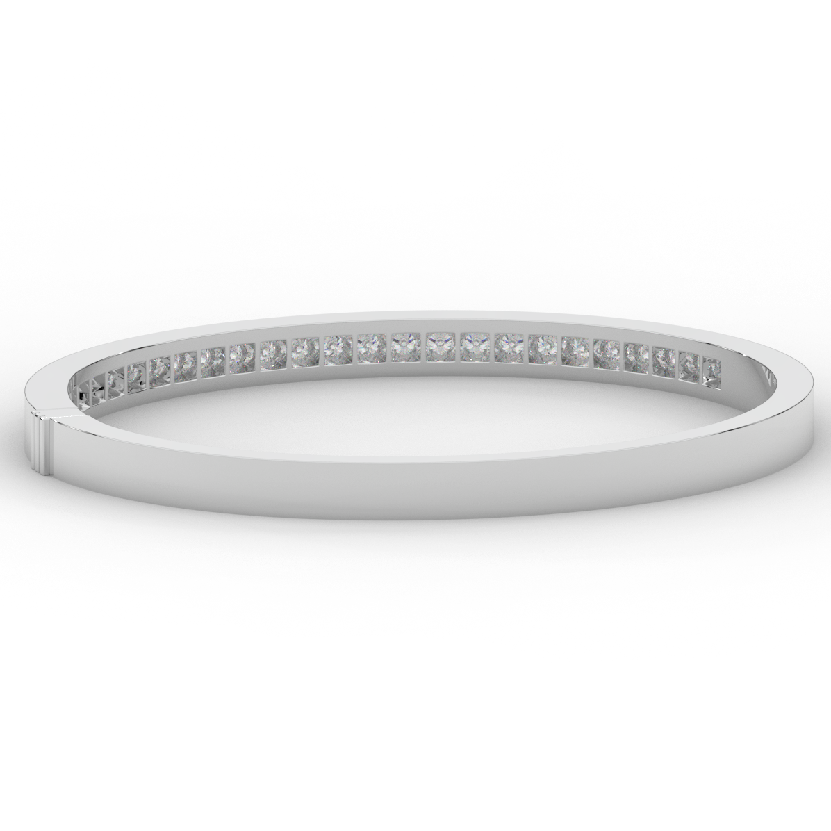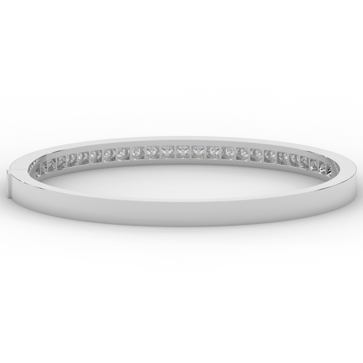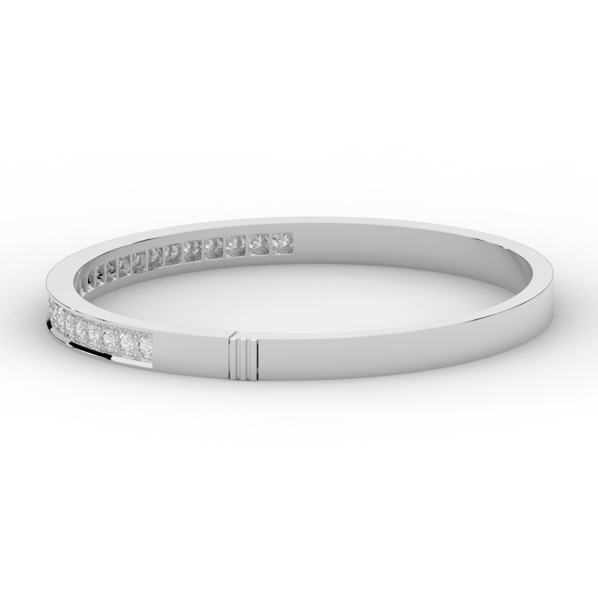 This beautiful bangle features a channel of prong set bright lab grown round diamonds, with a latch that has a second catch for safety. This bangle is available in 14k white, yellow, or rose gold.