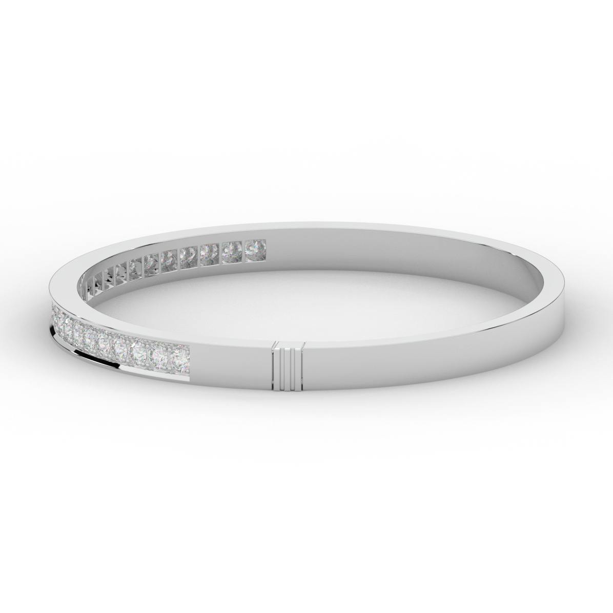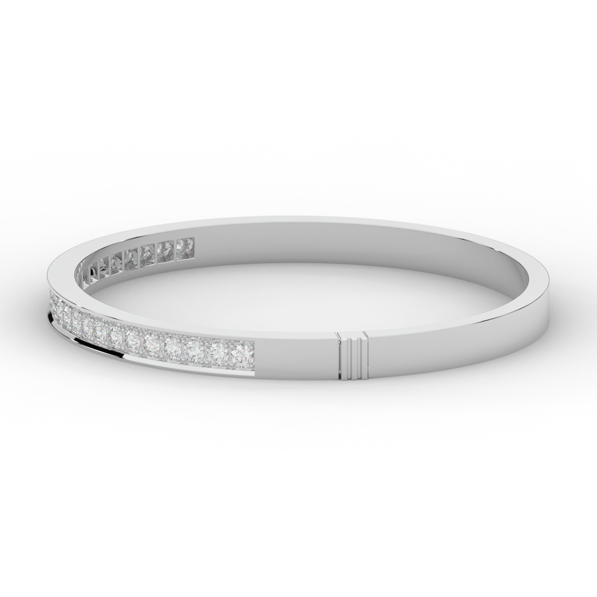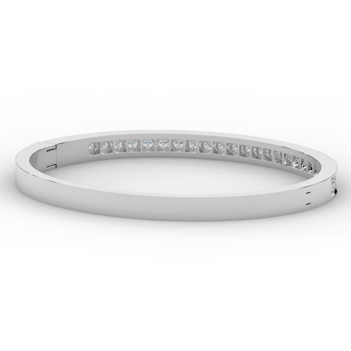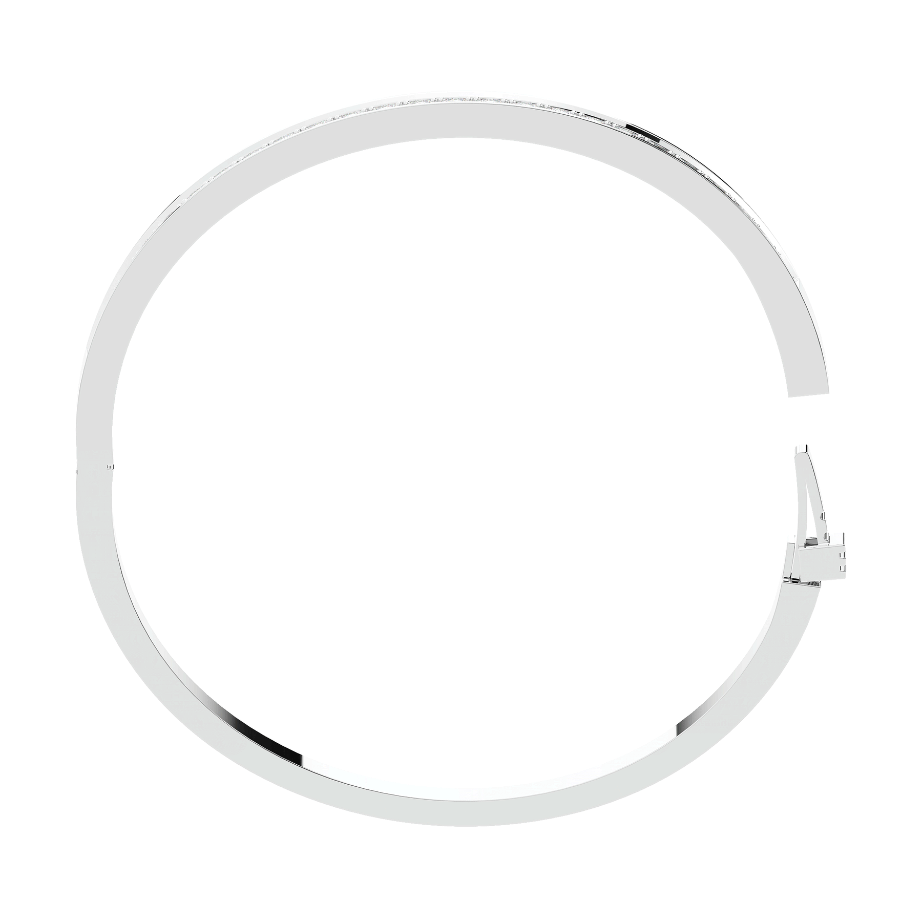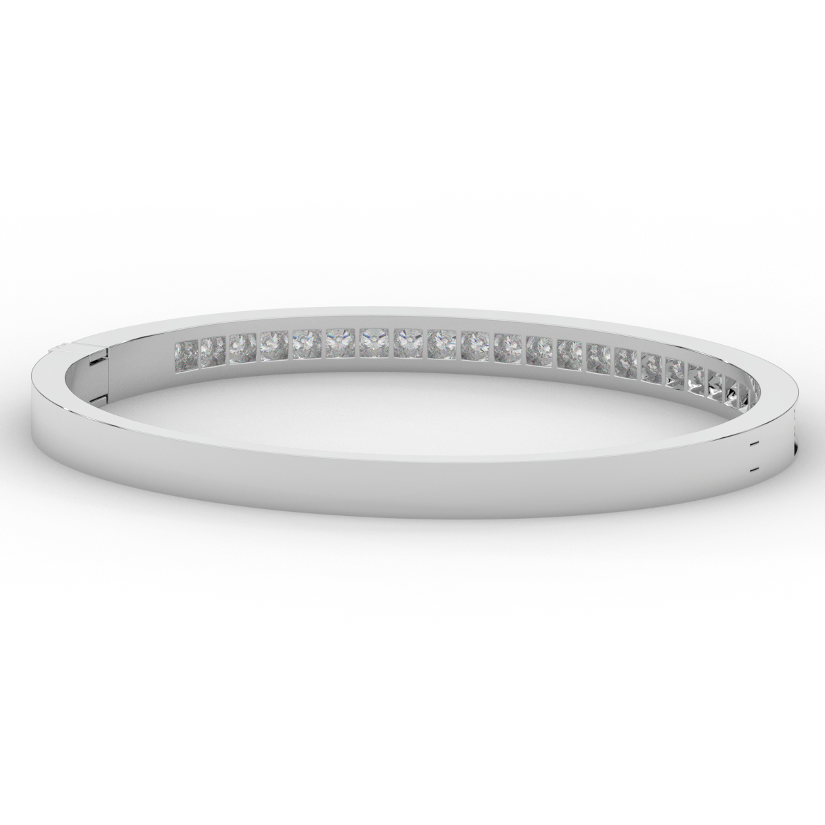 This beautiful bangle features a channel of prong set bright lab grown round diamonds, with a latch that has a second catch for safety. This bangle is available in 14k white, yellow, or rose gold.