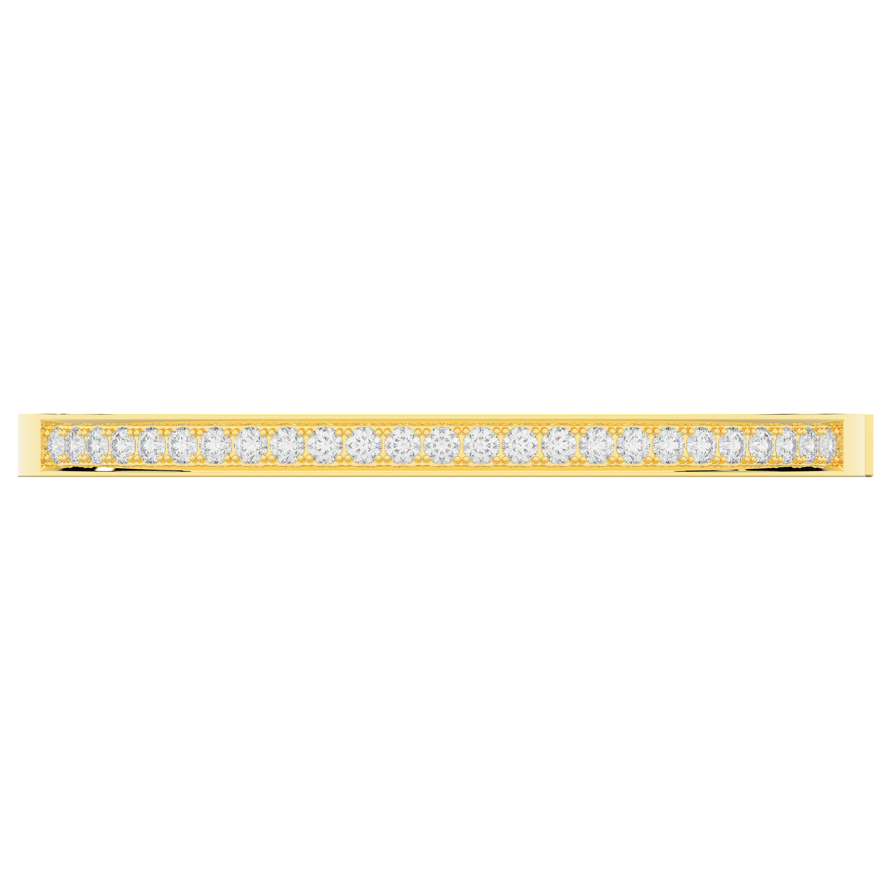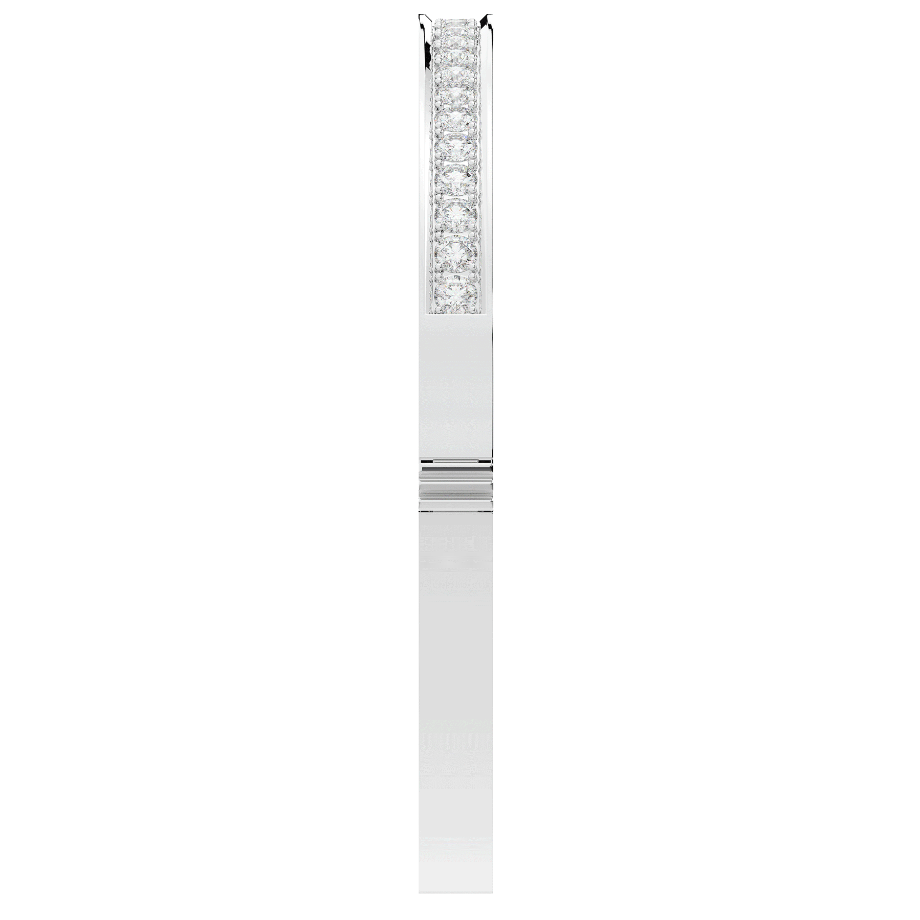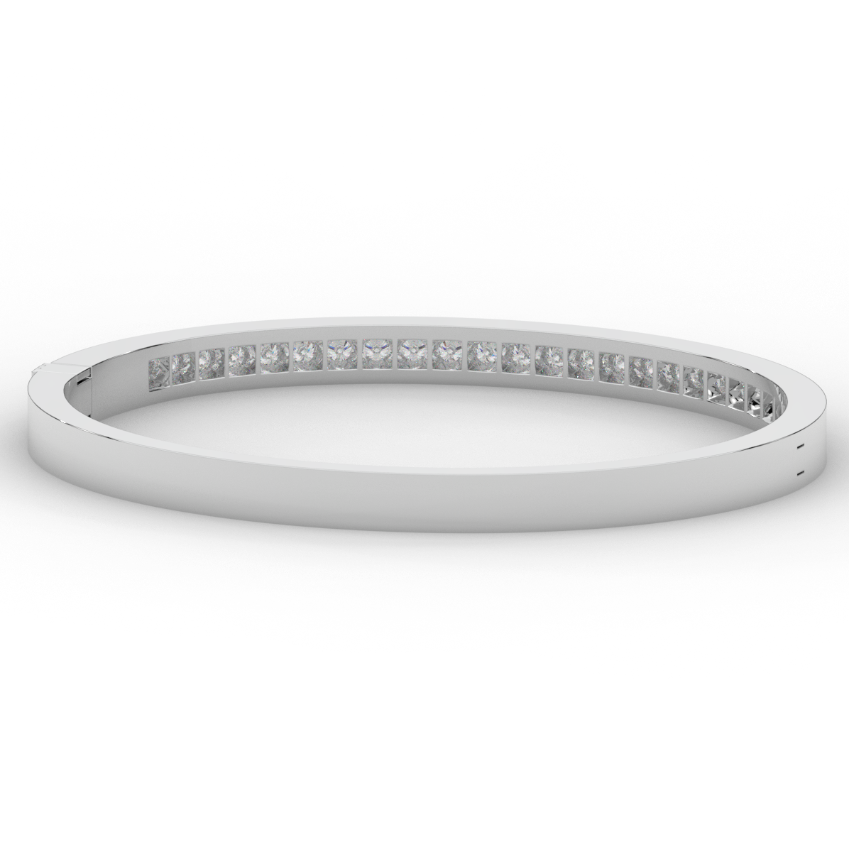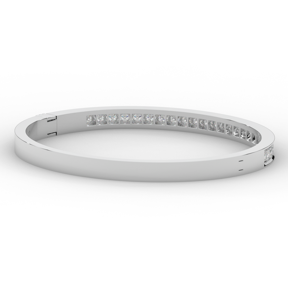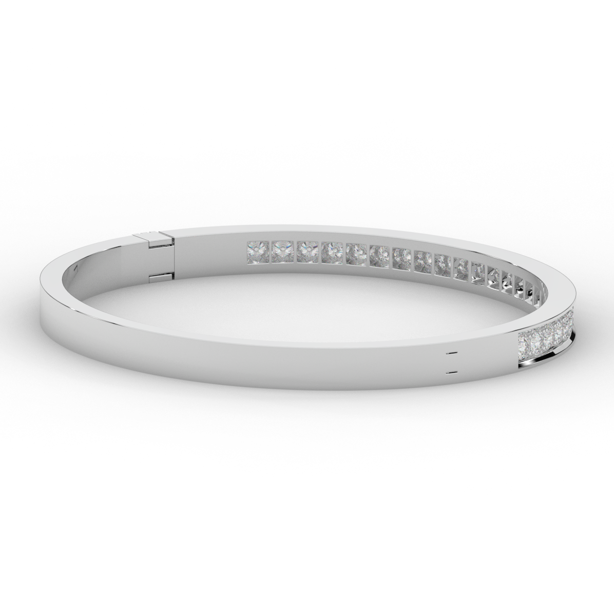 This beautiful bangle features a channel of prong set bright lab grown round diamonds, with a latch that has a second catch for safety. This bangle is available in 14k white, yellow, or rose gold.