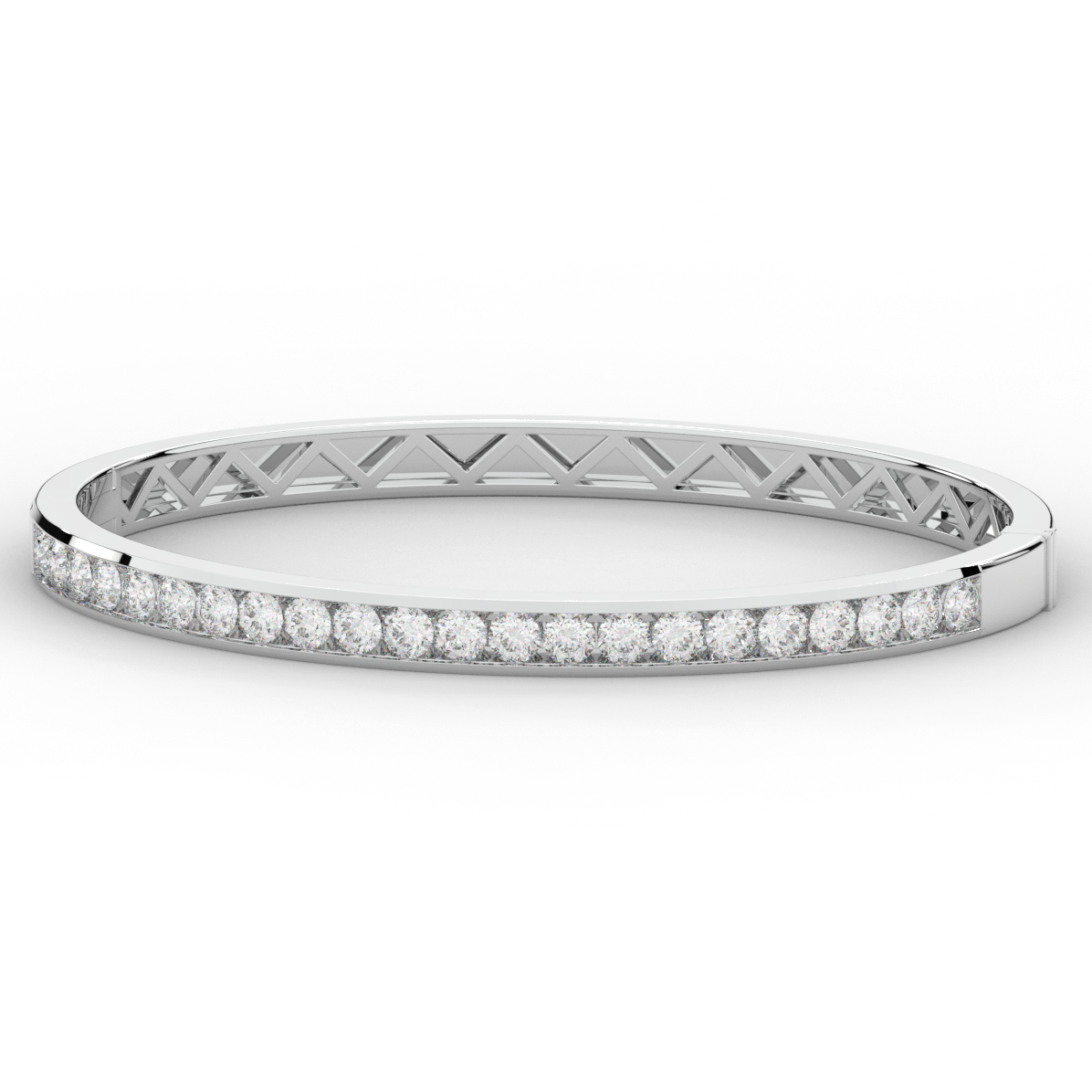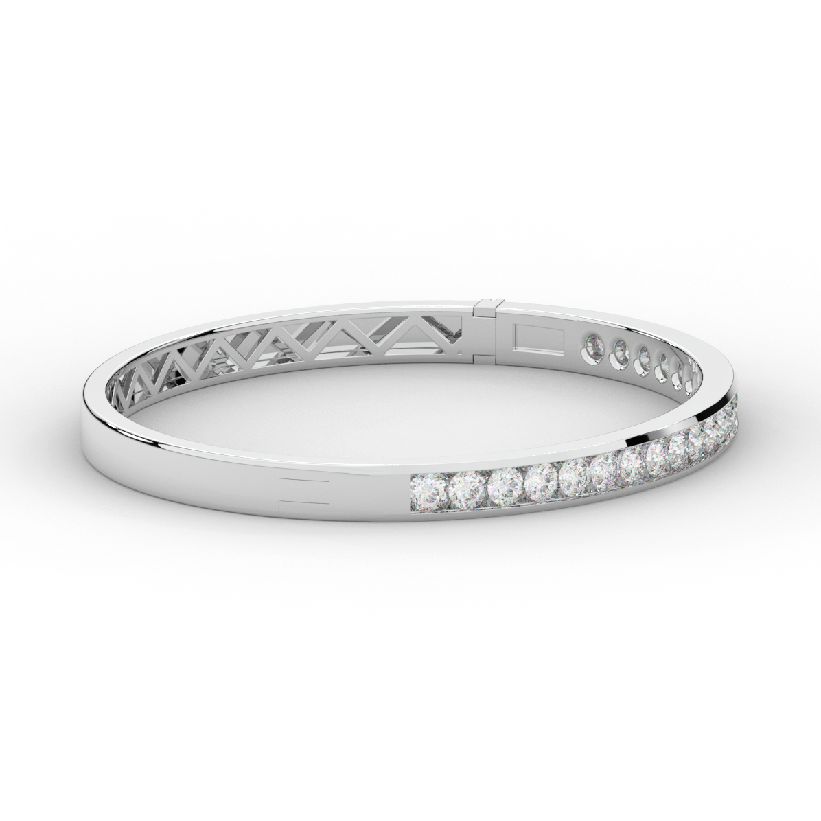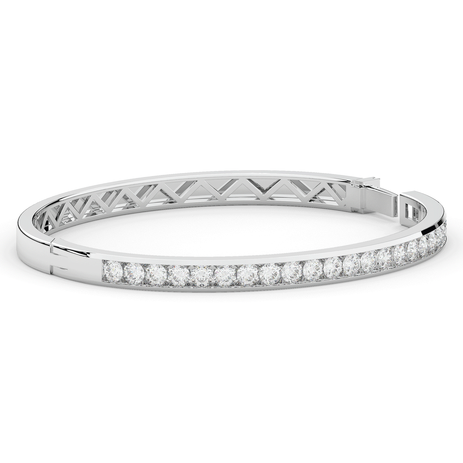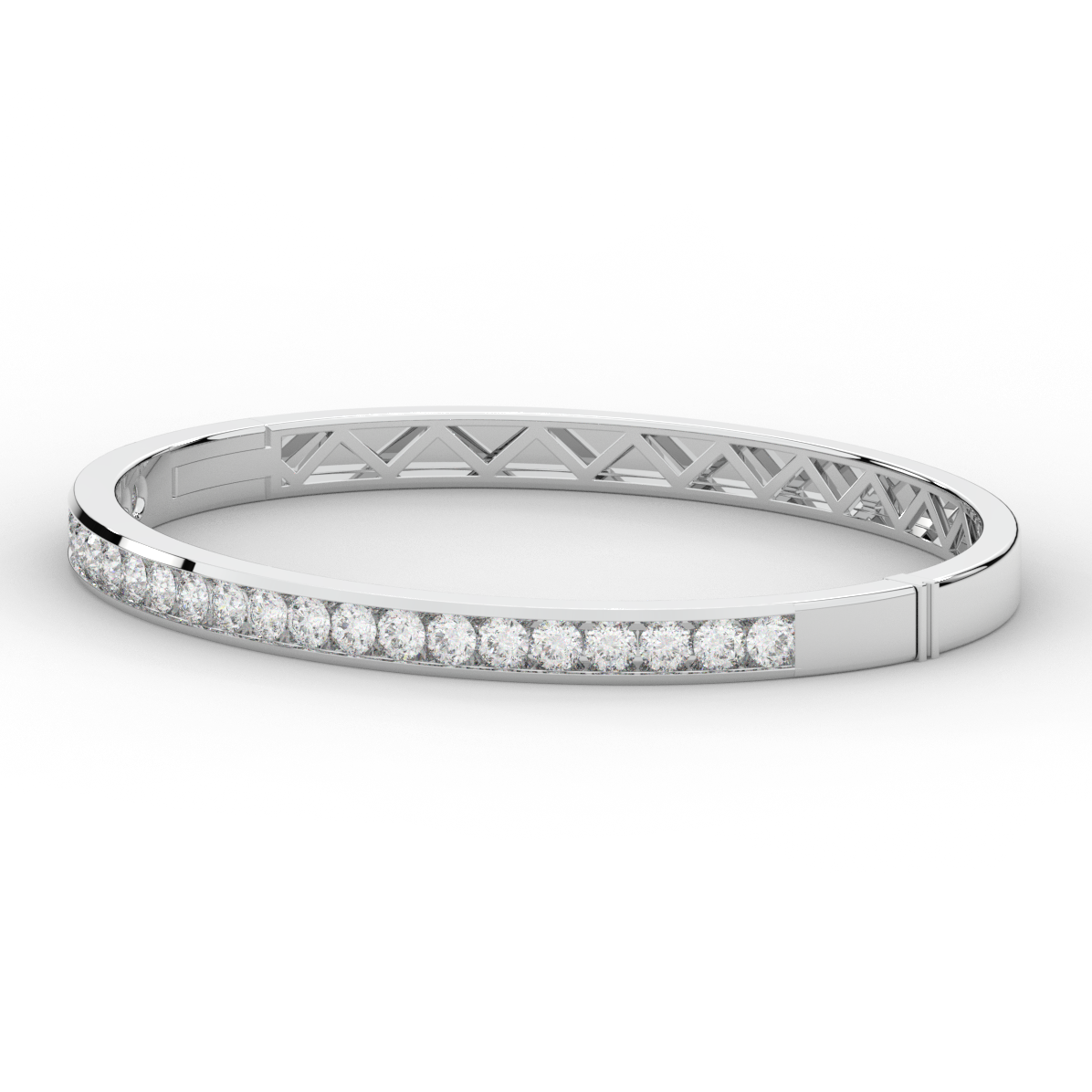 This beautiful bangle features channel set bright lab grown round diamonds, with a latch that has a second catch for safety. This bangle is available in 14k white, yellow, or rose gold.