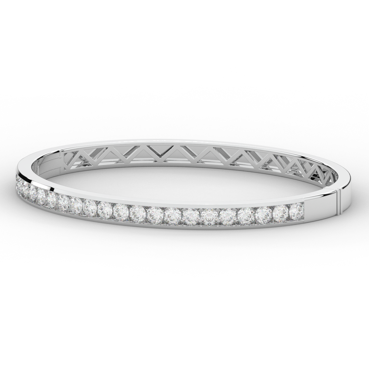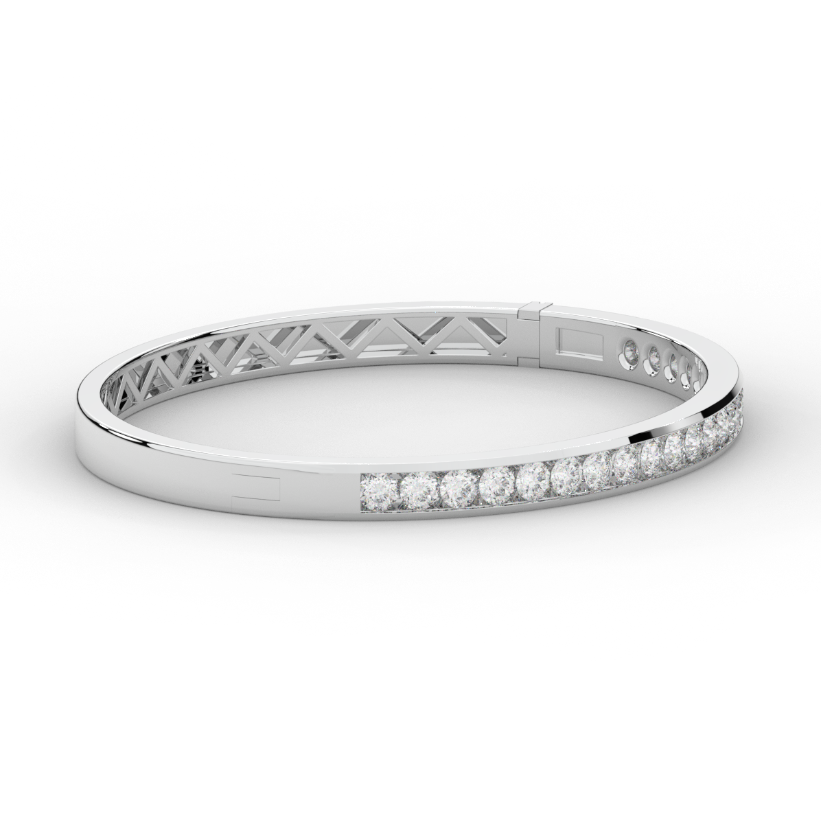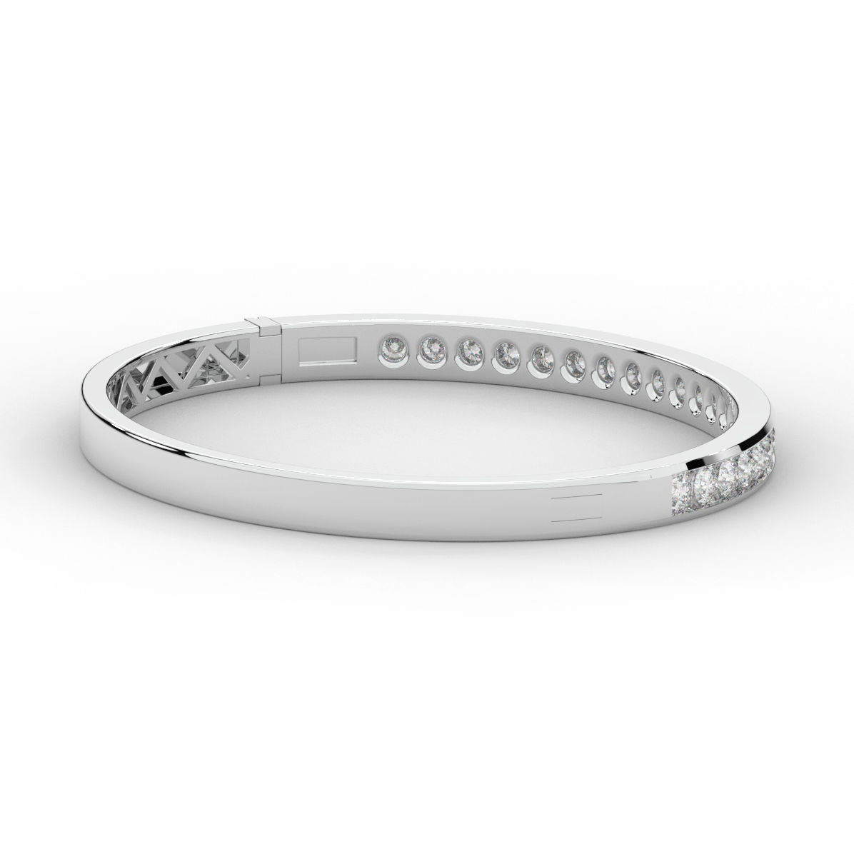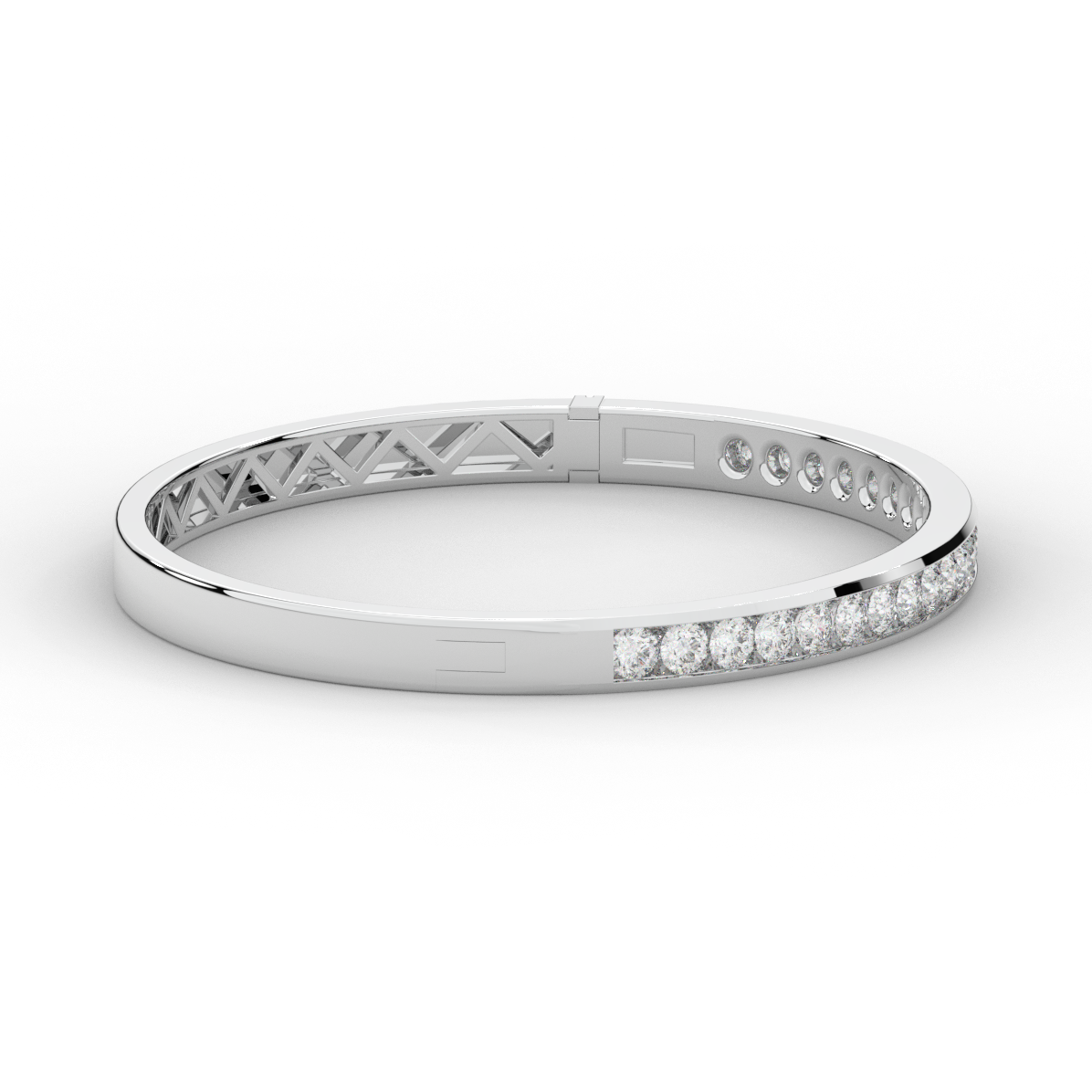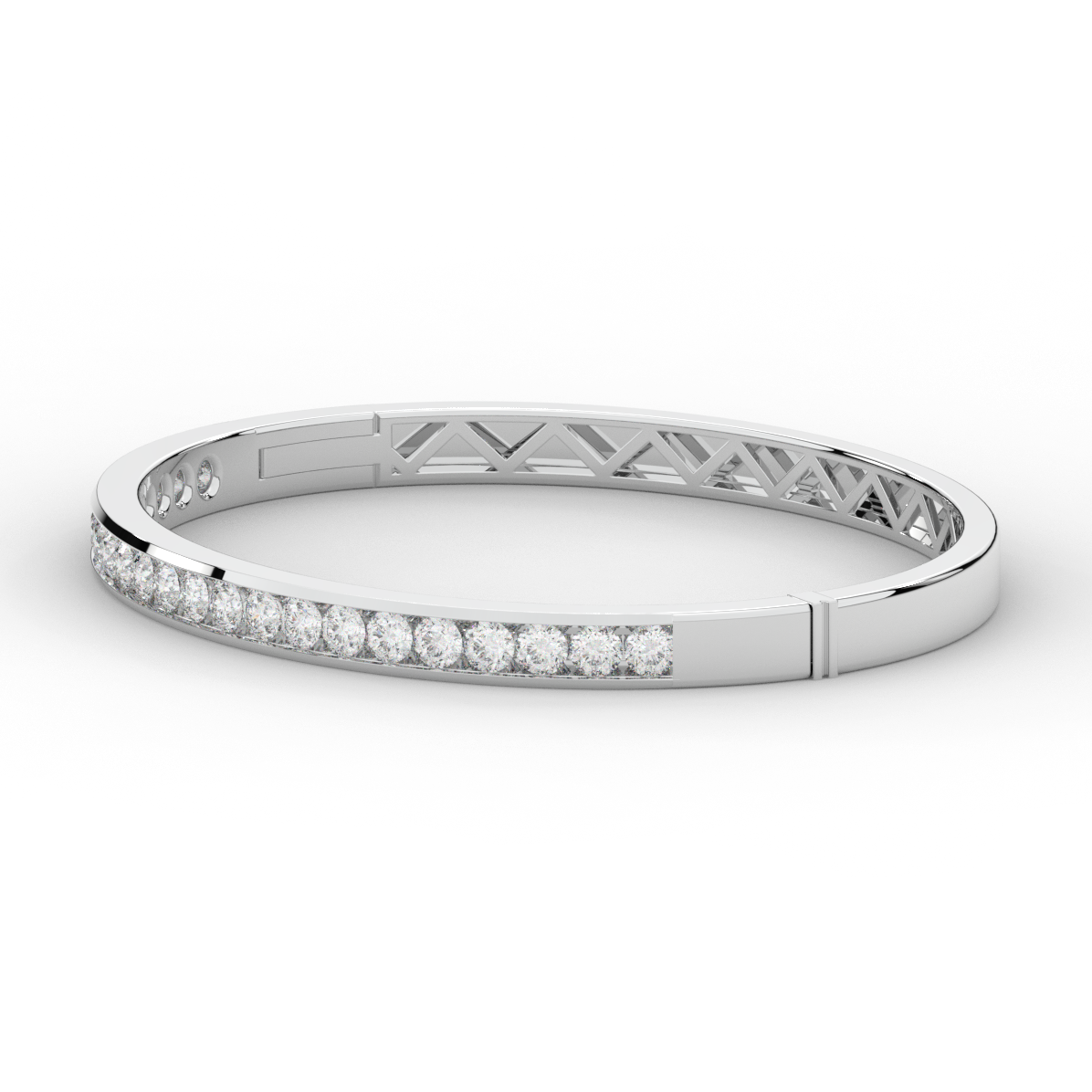 This beautiful bangle features channel set bright lab grown round diamonds, with a latch that has a second catch for safety. This bangle is available in 14k white, yellow, or rose gold.