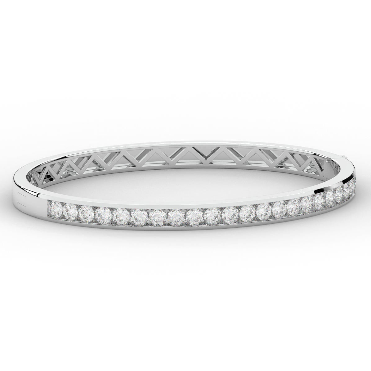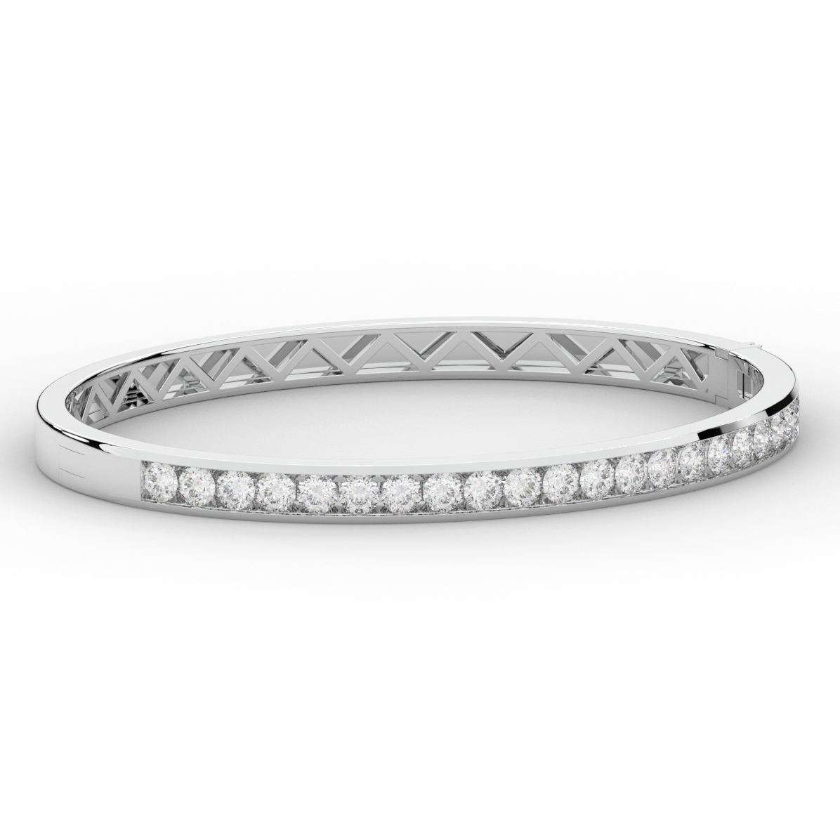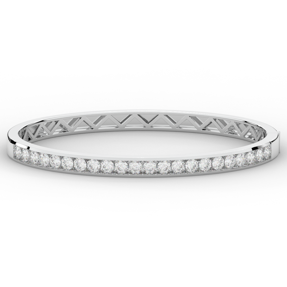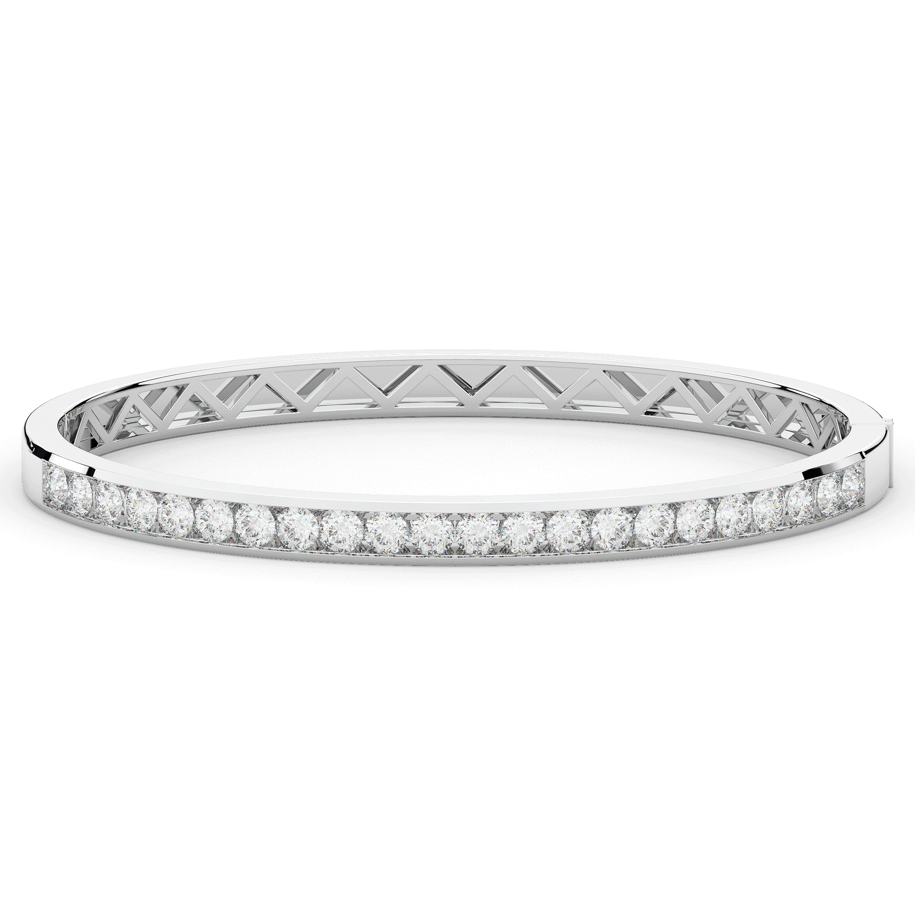 This beautiful bangle features channel set bright lab grown round diamonds, with a latch that has a second catch for safety. This bangle is available in 14k white, yellow, or rose gold.