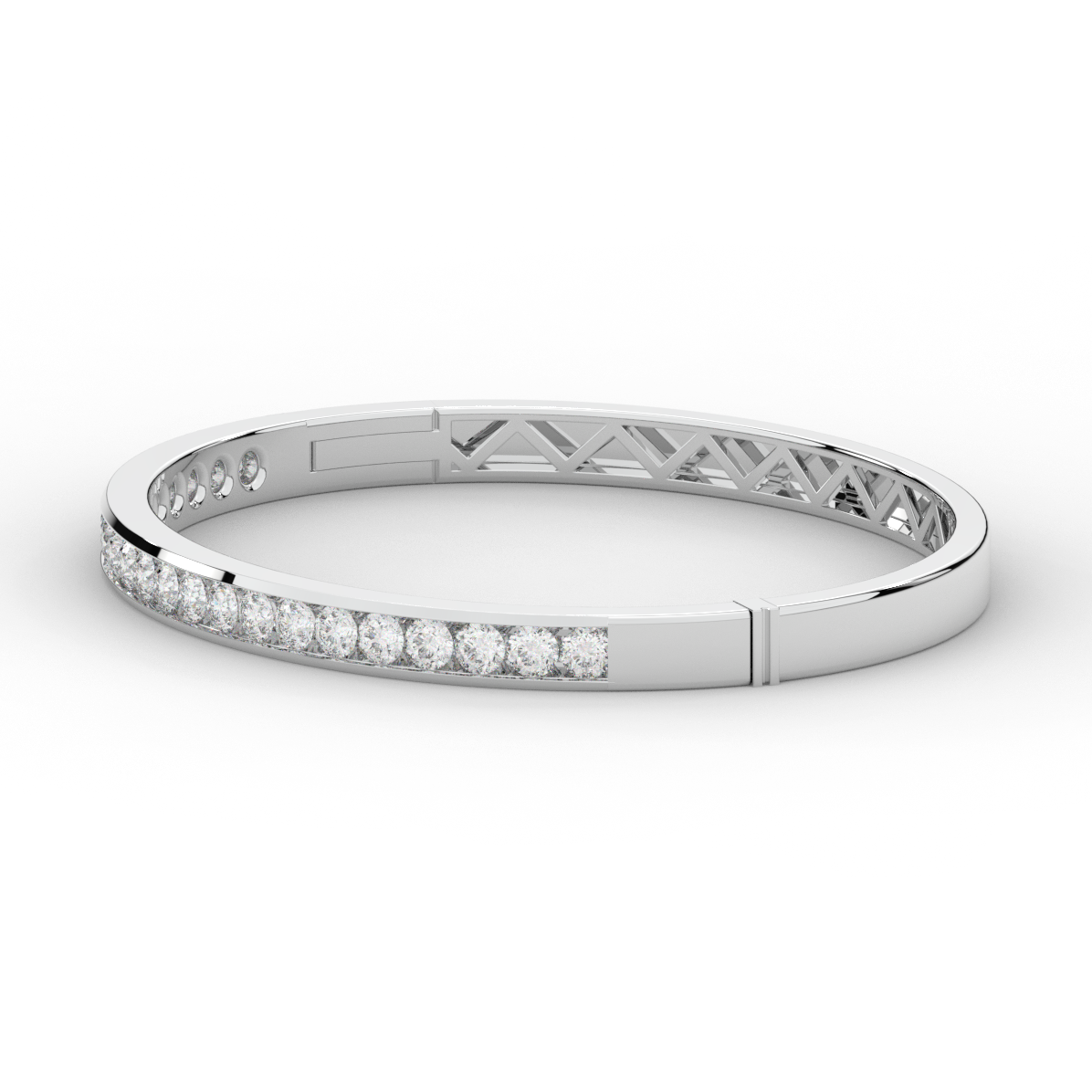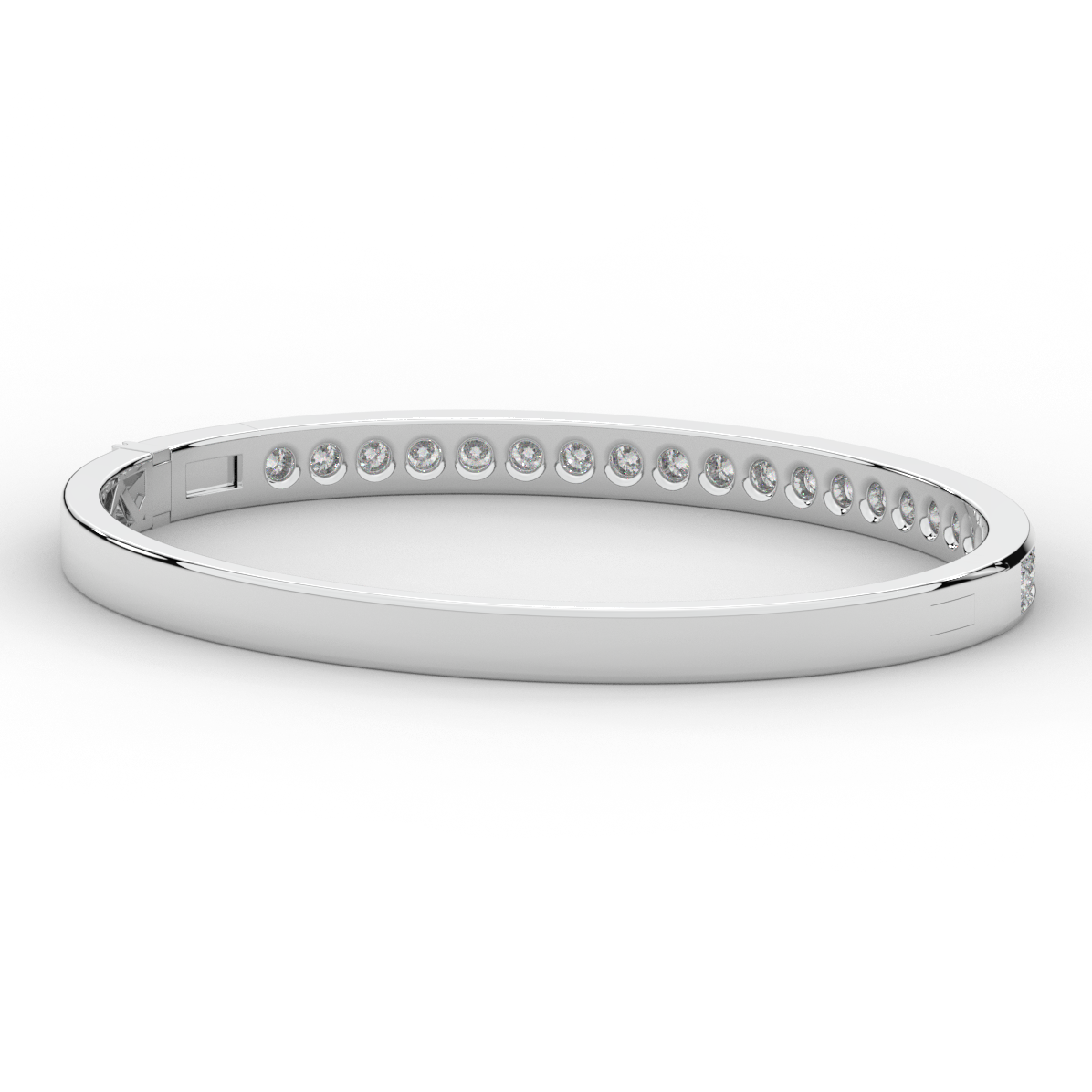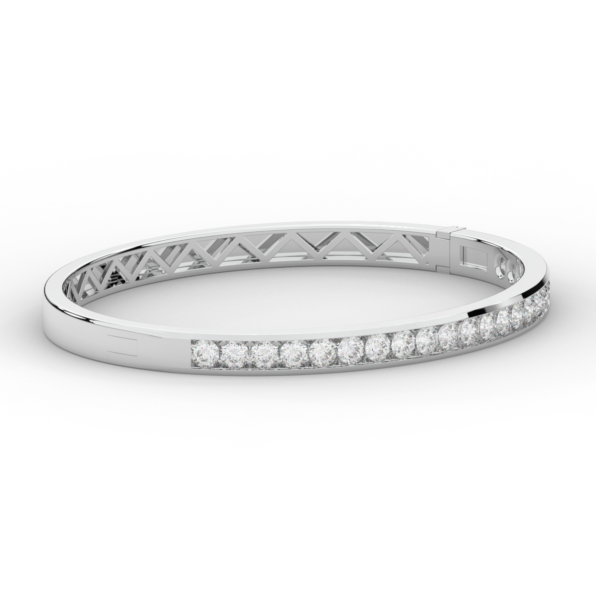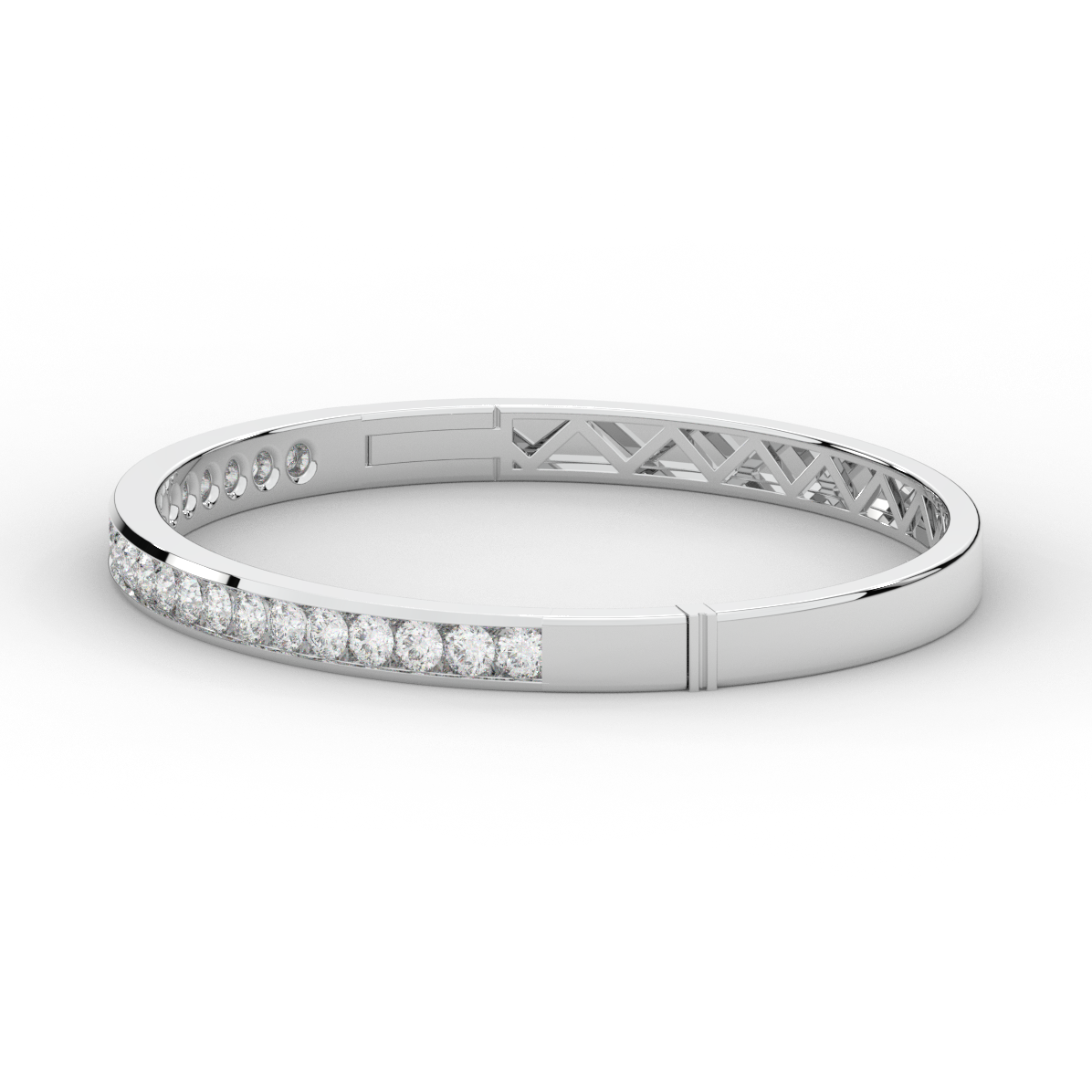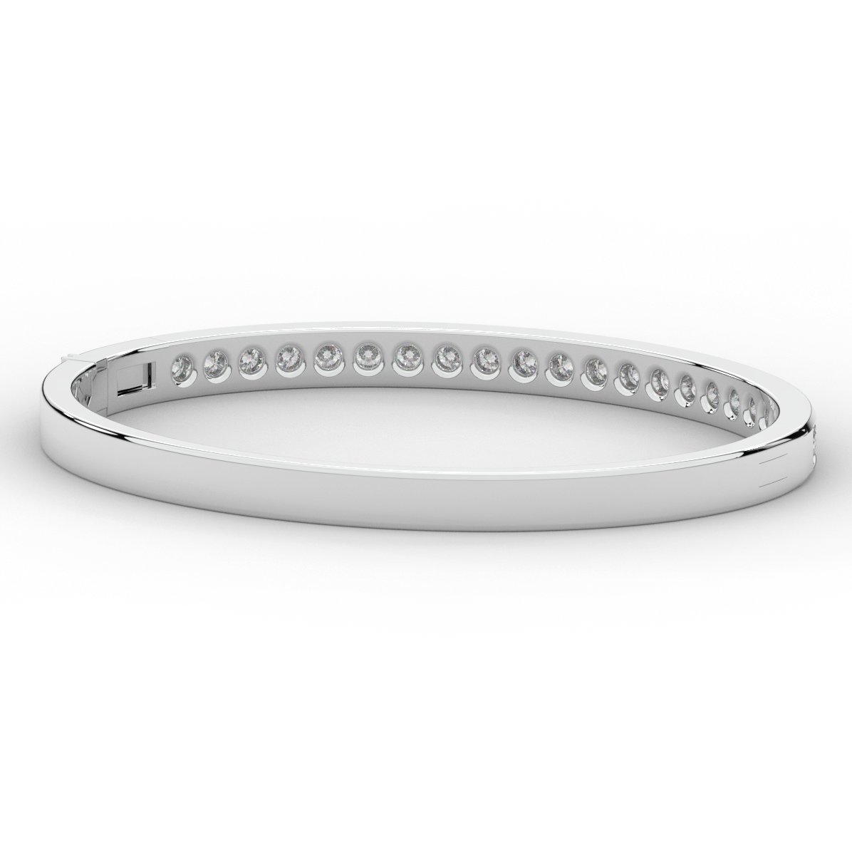 This beautiful bangle features channel set bright lab grown round diamonds, with a latch that has a second catch for safety. This bangle is available in 14k white, yellow, or rose gold.
