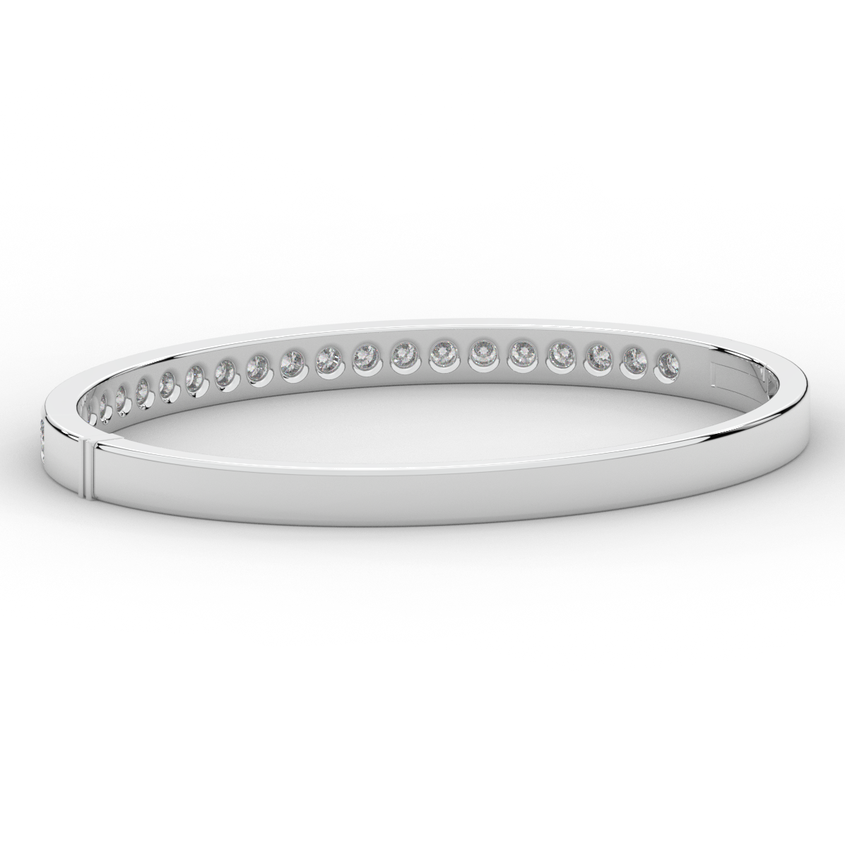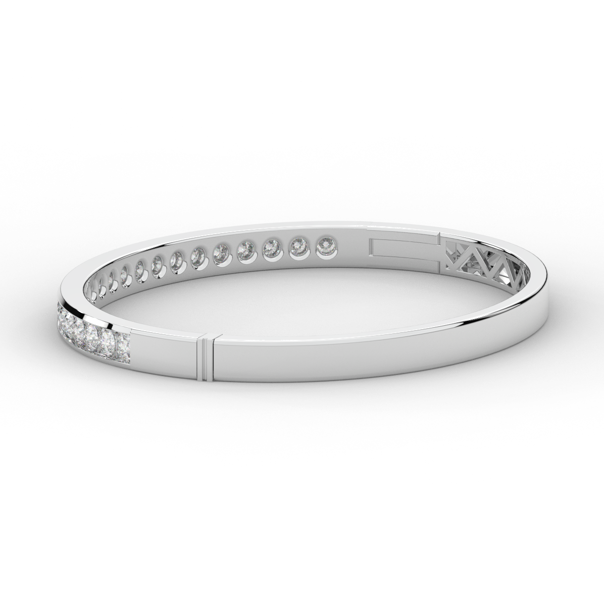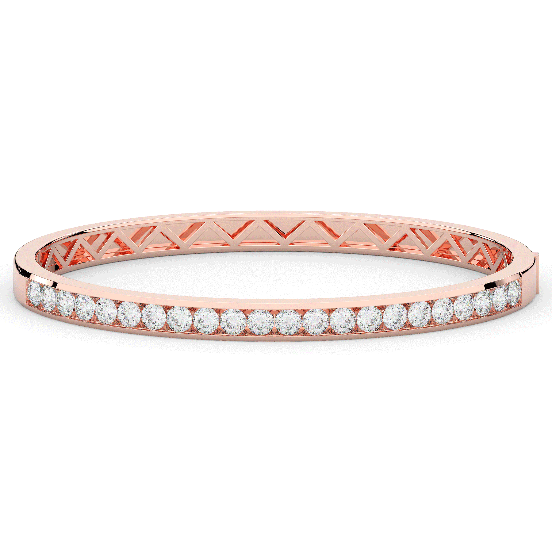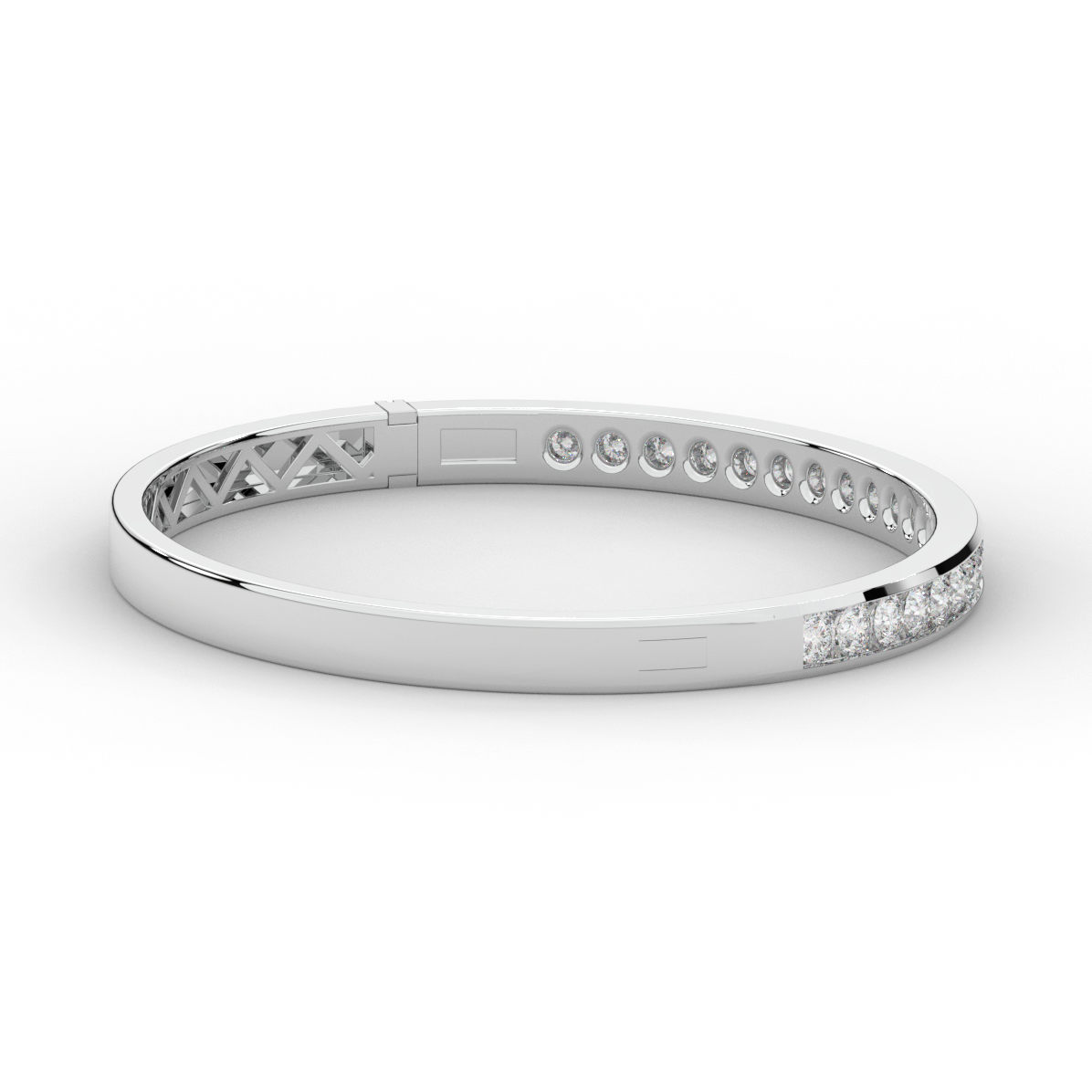 This beautiful bangle features channel set bright lab grown round diamonds, with a latch that has a second catch for safety. This bangle is available in 14k white, yellow, or rose gold.