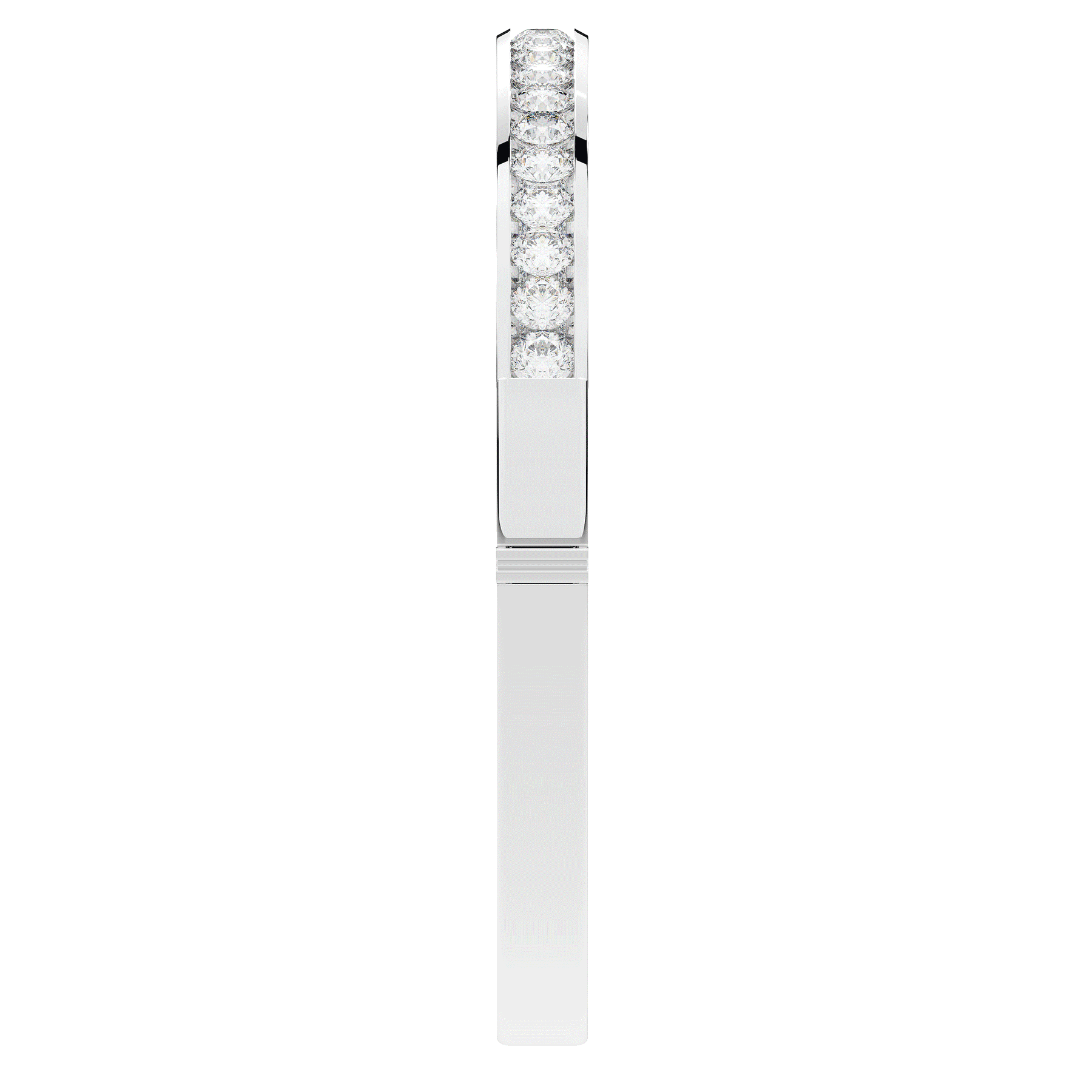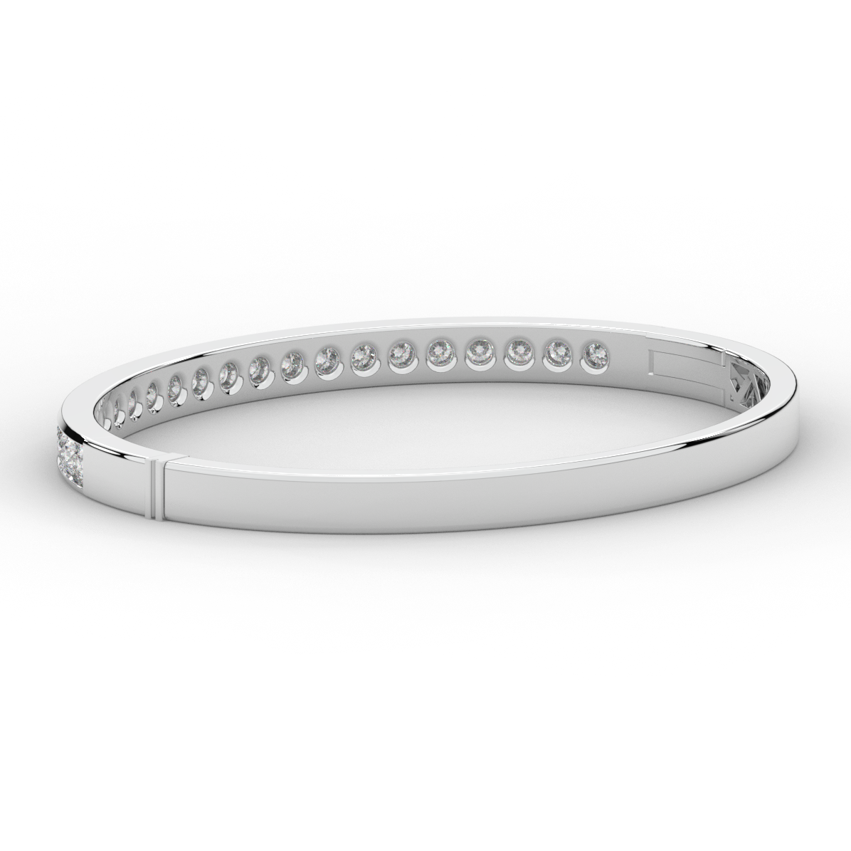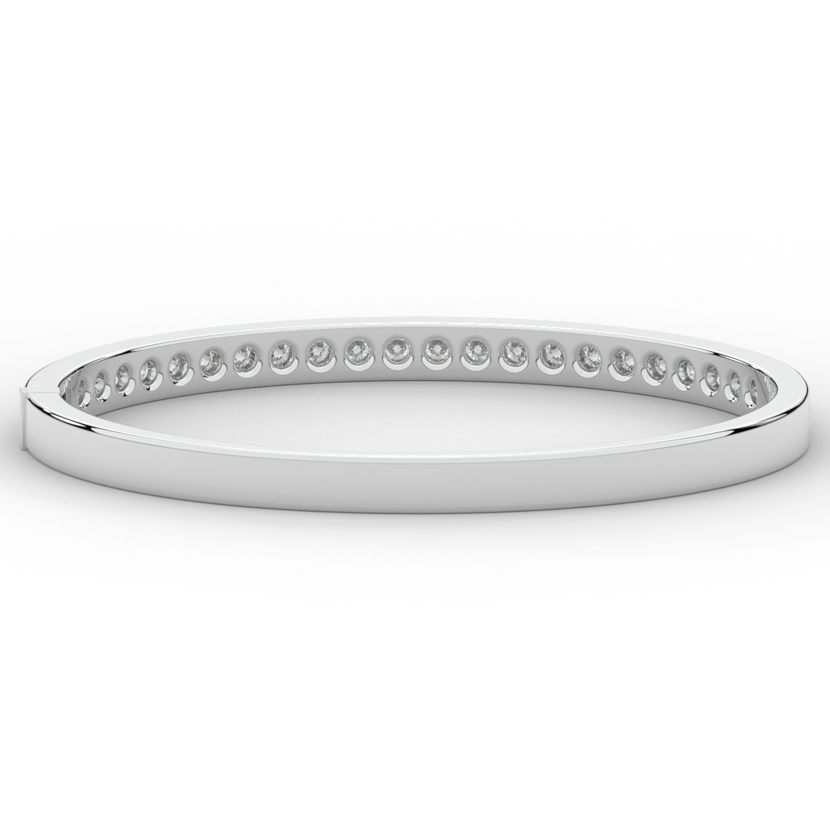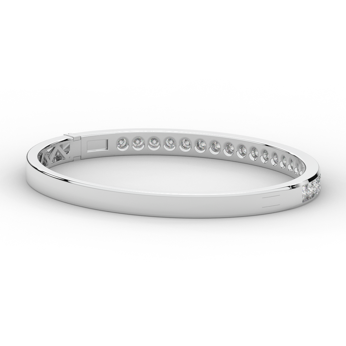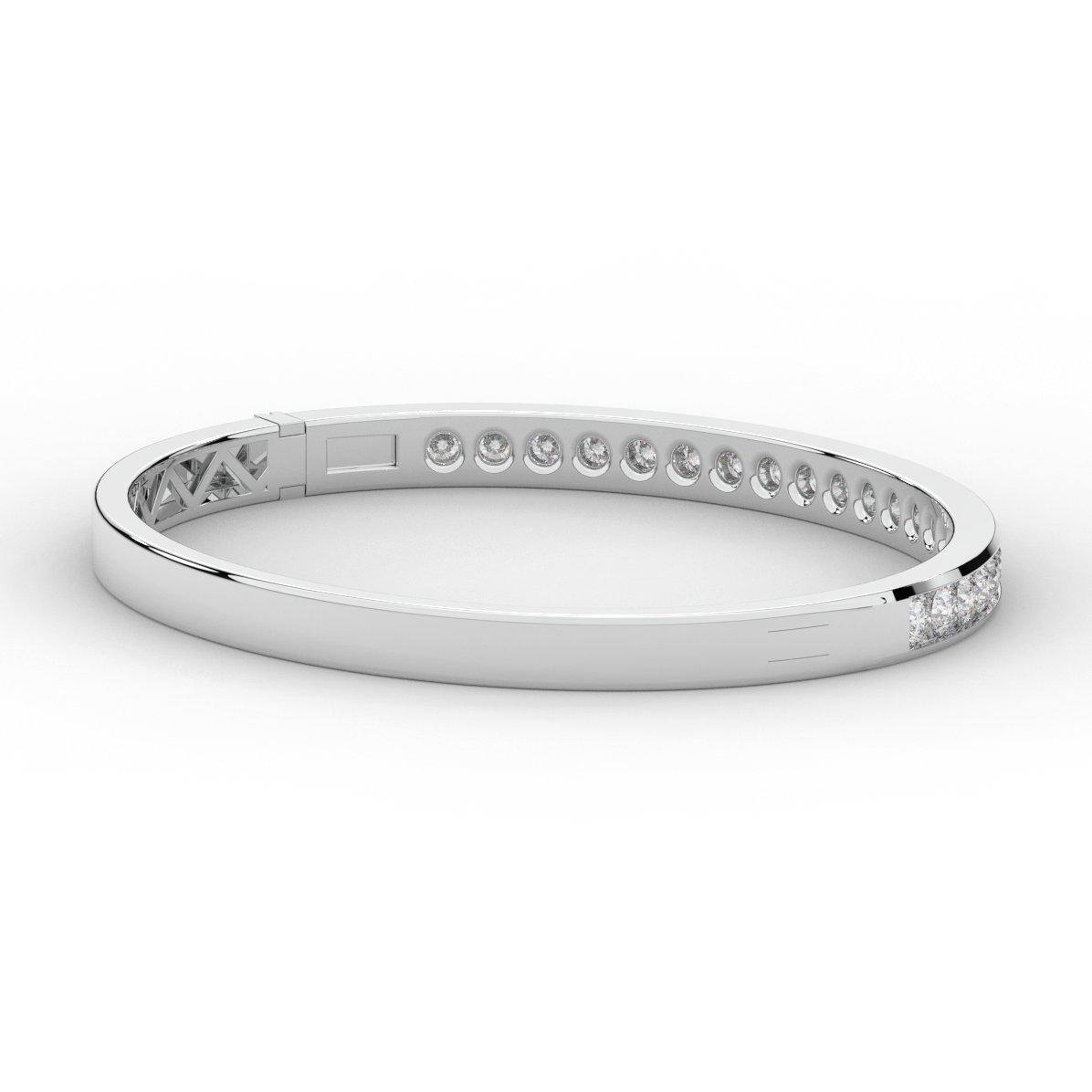 This beautiful bangle features channel set bright lab grown round diamonds, with a latch that has a second catch for safety. This bangle is available in 14k white, yellow, or rose gold.