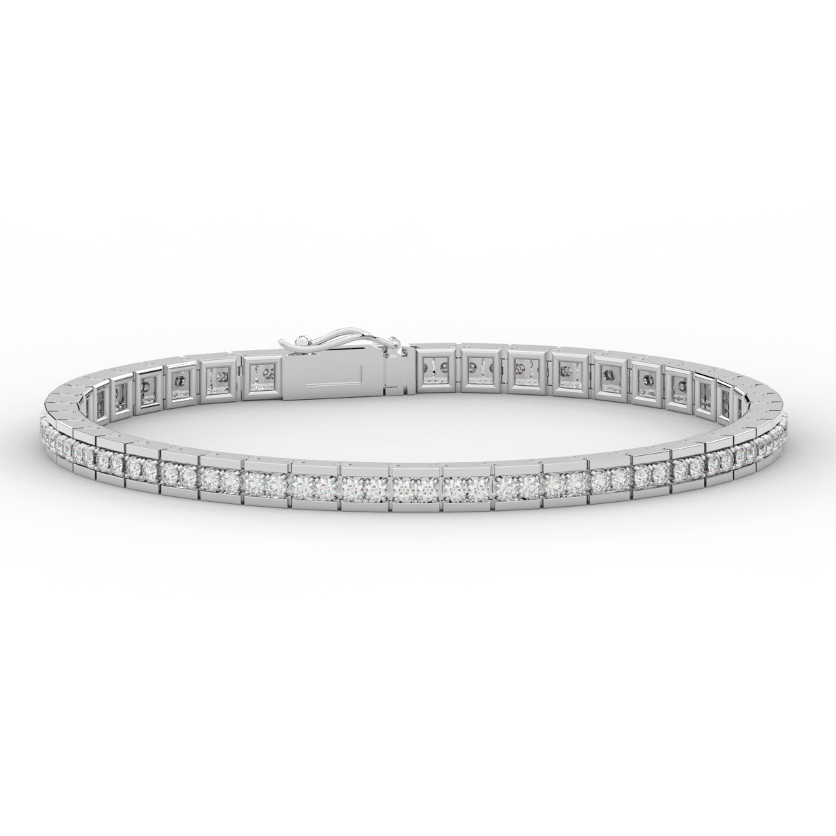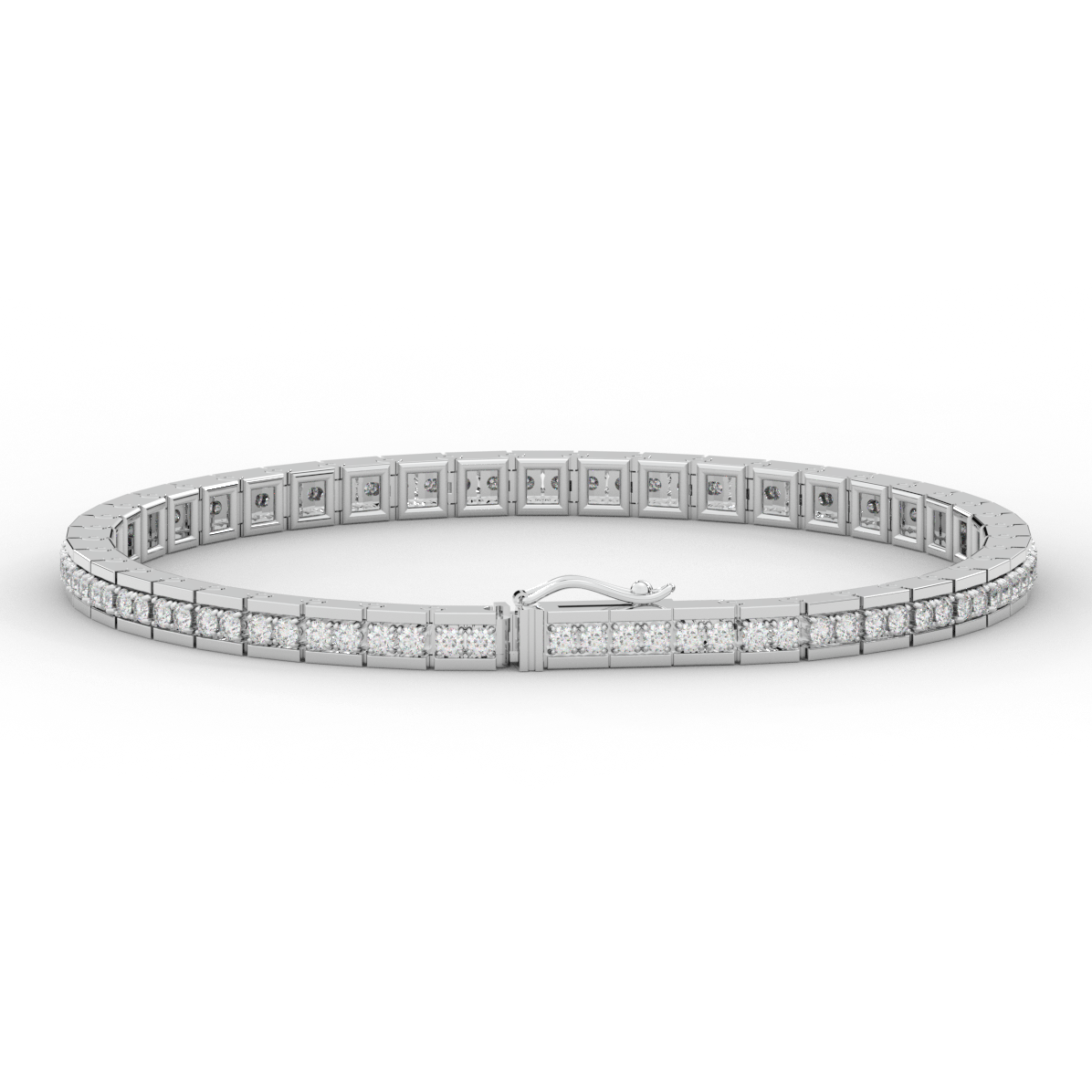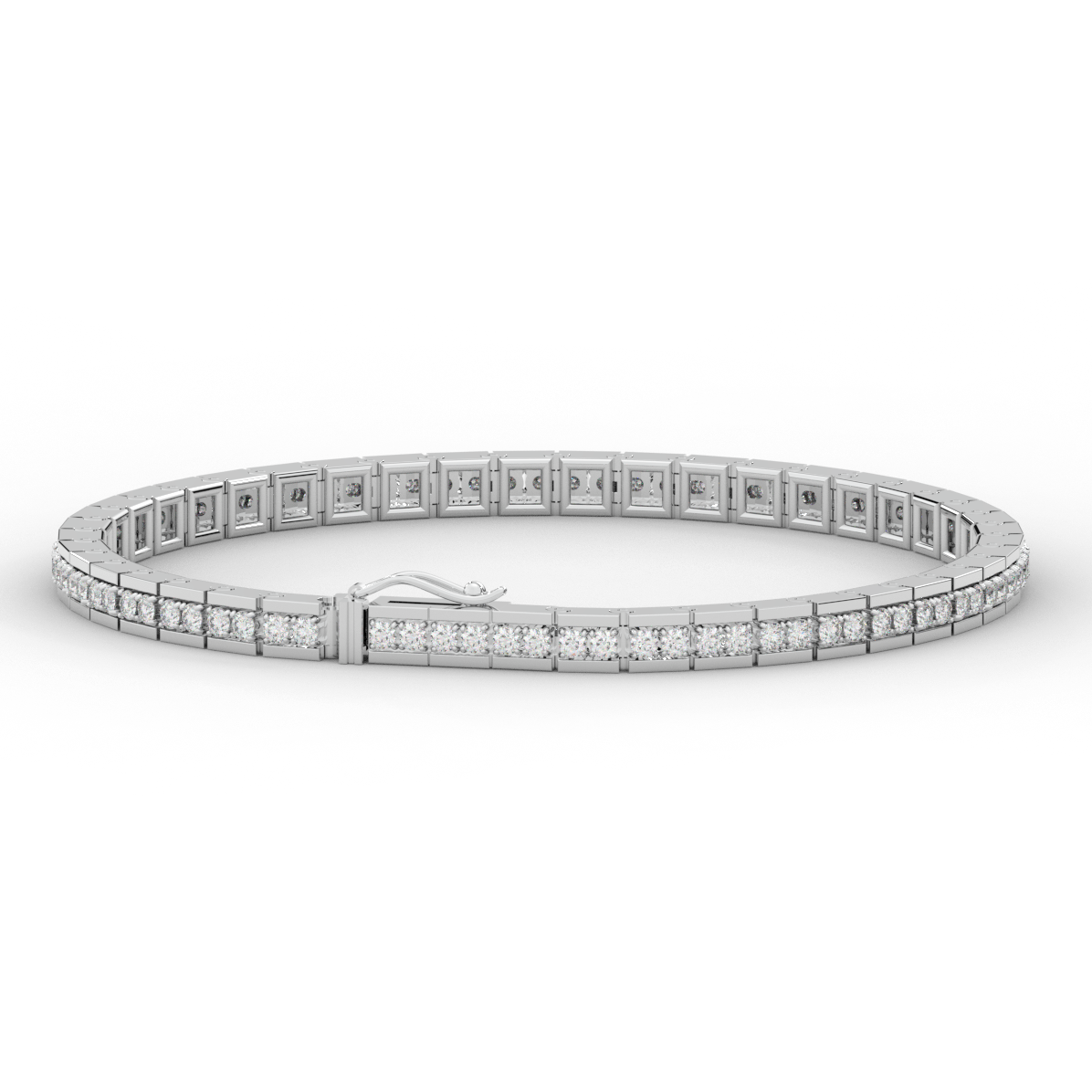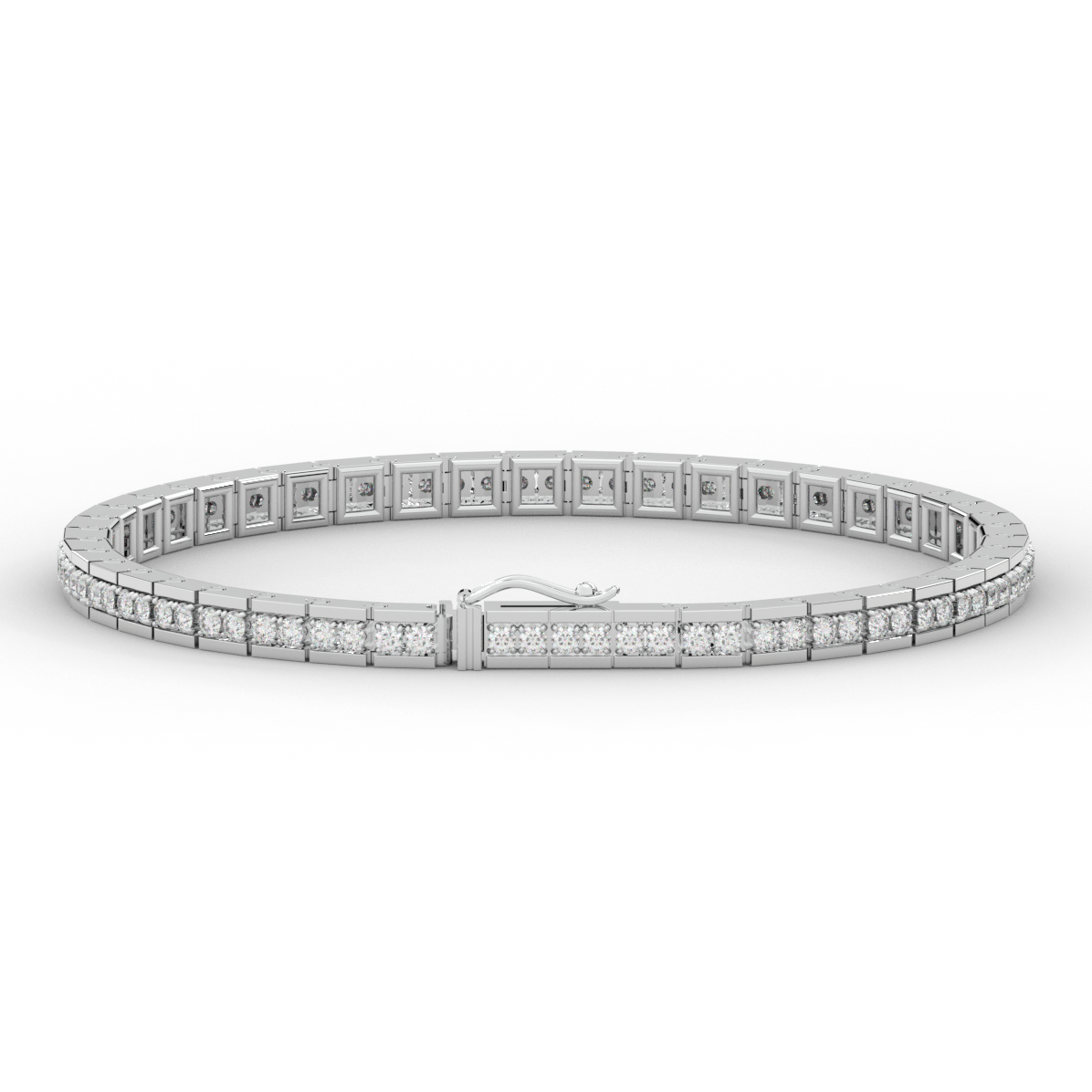 This beautiful tennis bracelet features 2 round lab grown diamonds per link set into a pseudo channel making for a stunning design. The clasp features a second step for safety as well as an external safety latch for added protection. This tennis bracelet is available in 14k white, yellow, or rose gold.