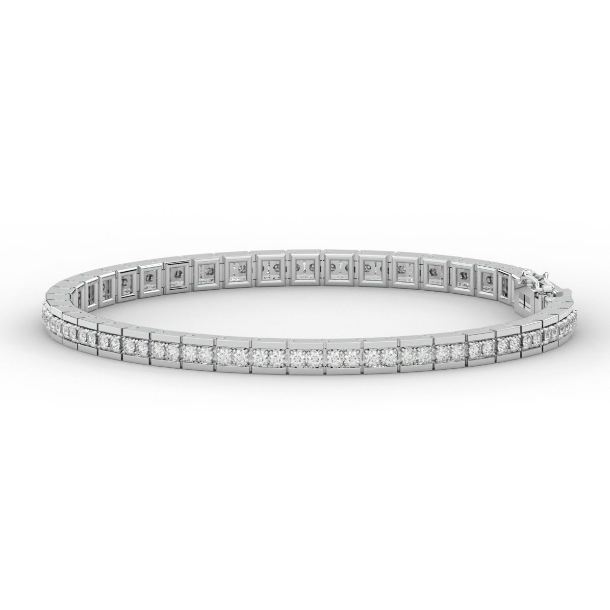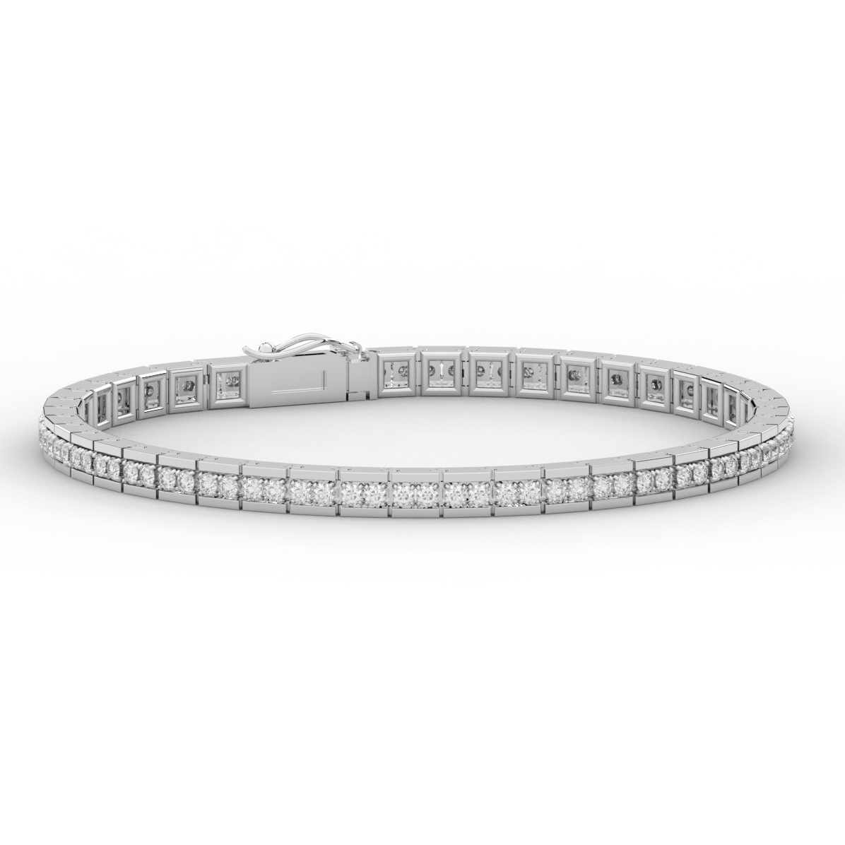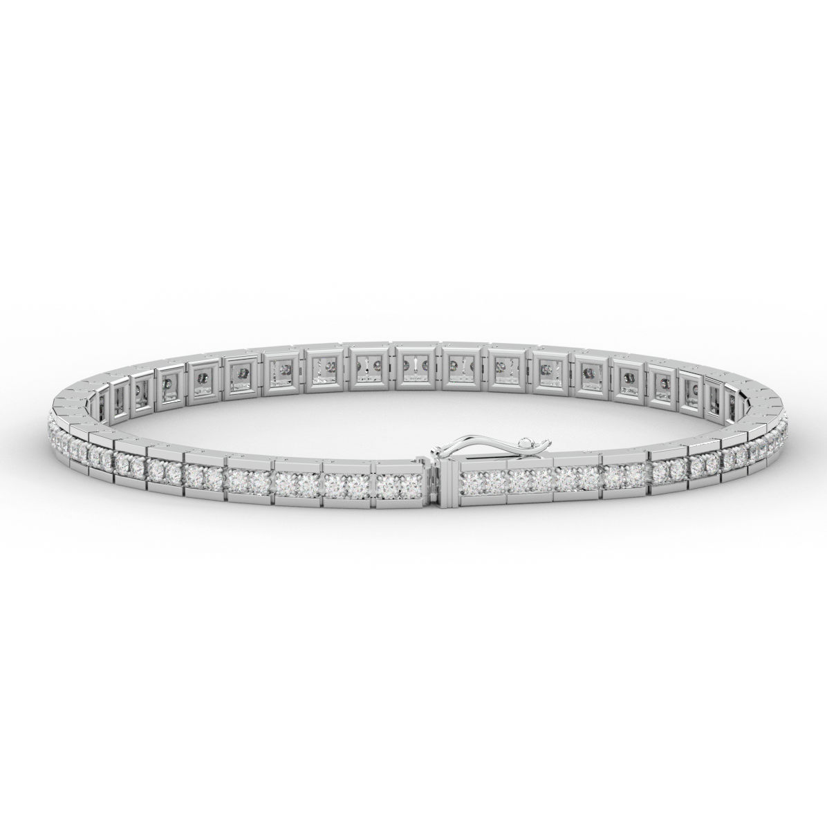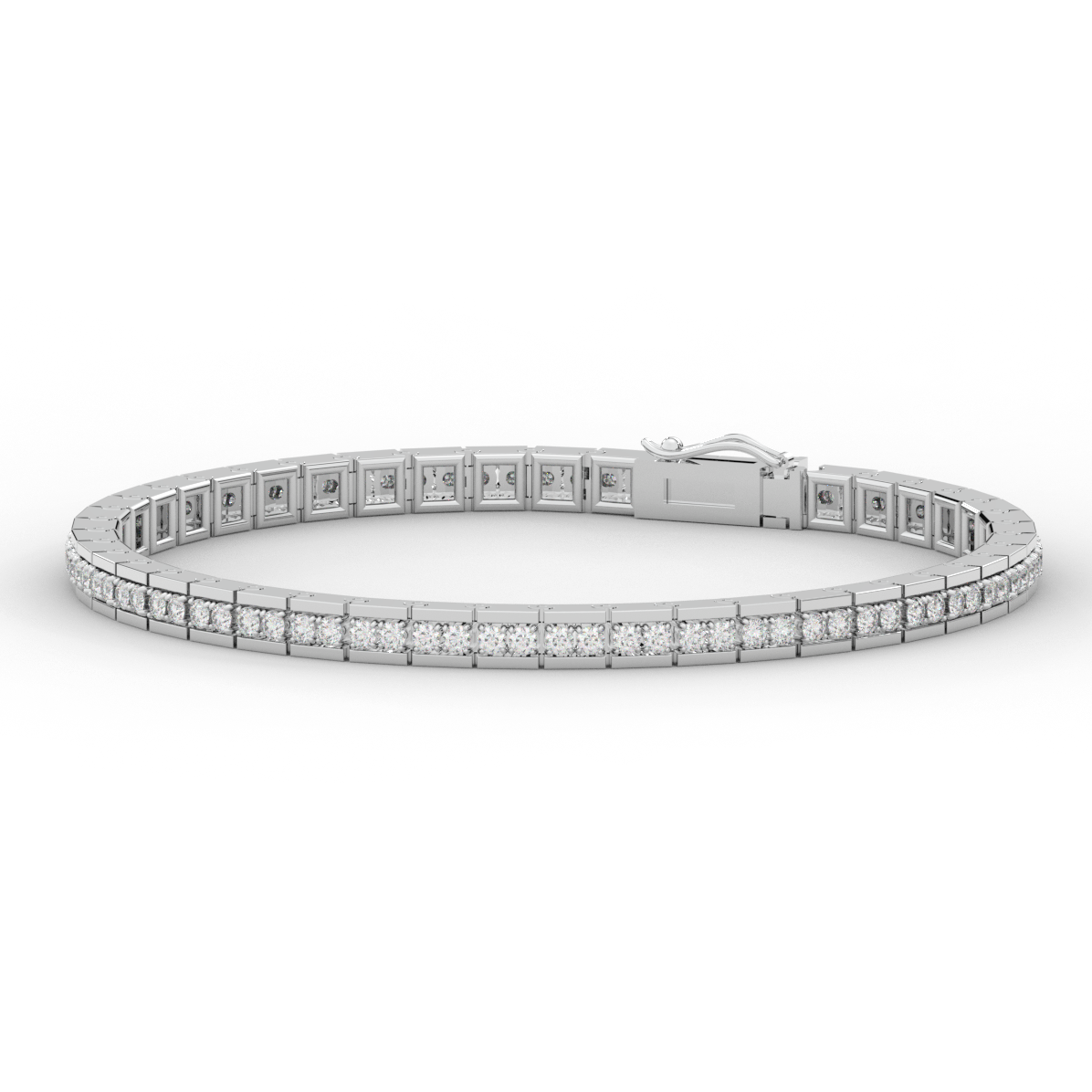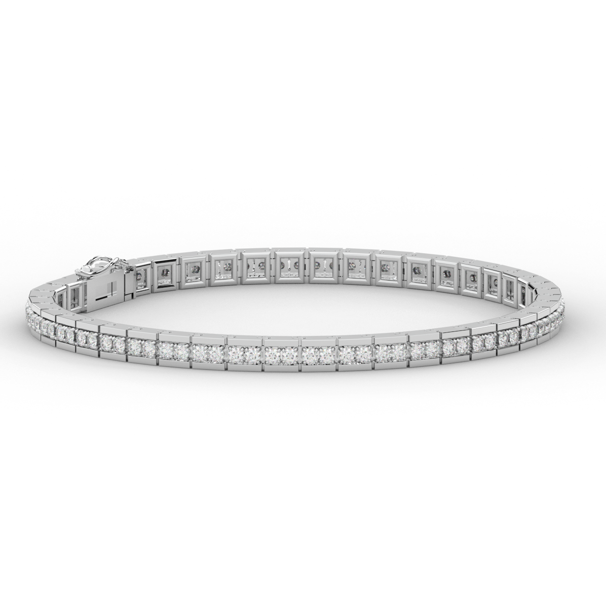This beautiful tennis bracelet features 2 round lab grown diamonds per link set into a pseudo channel making for a stunning design. The clasp features a second step for safety as well as an external safety latch for added protection. This tennis bracelet is available in 14k white, yellow, or rose gold.