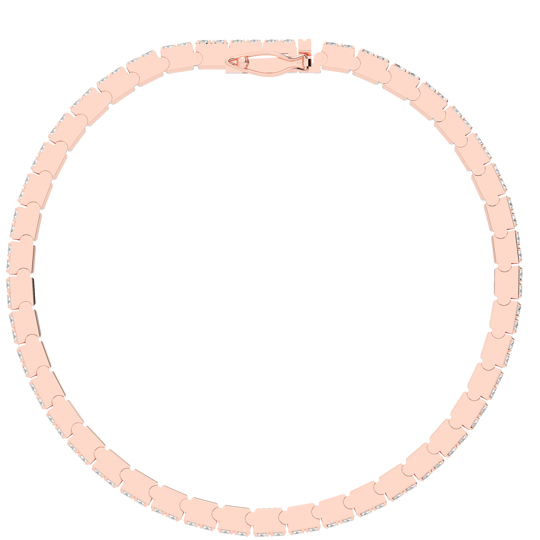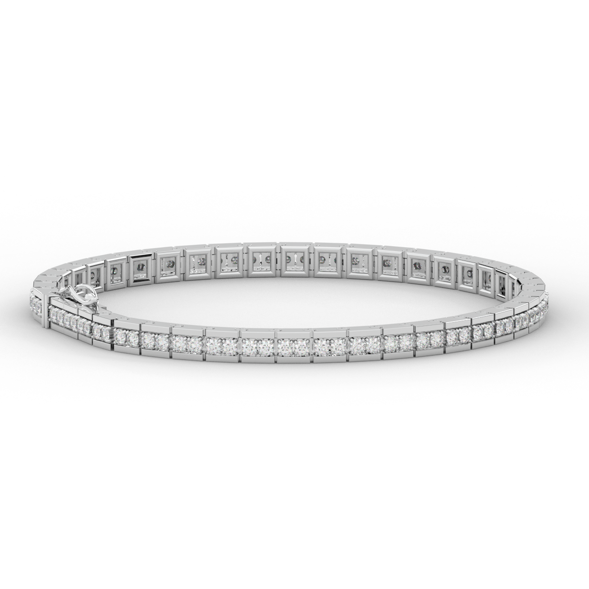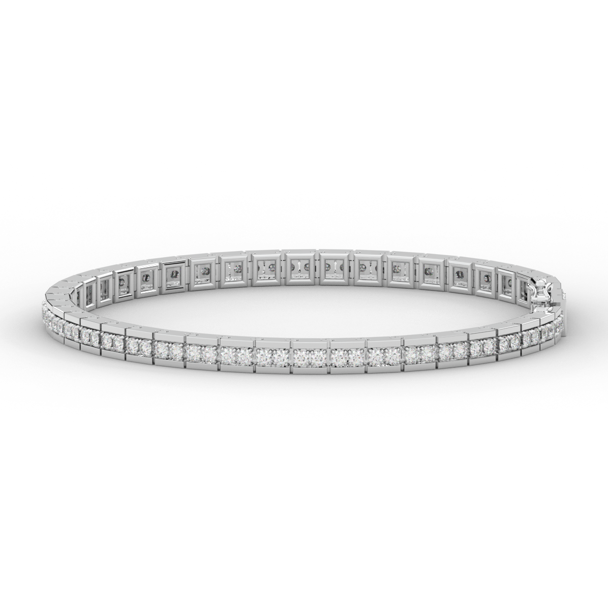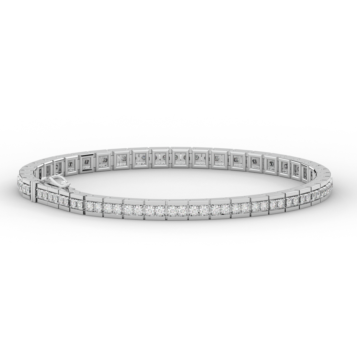 This beautiful tennis bracelet features 2 round lab grown diamonds per link set into a pseudo channel making for a stunning design. The clasp features a second step for safety as well as an external safety latch for added protection. This tennis bracelet is available in 14k white, yellow, or rose gold.
