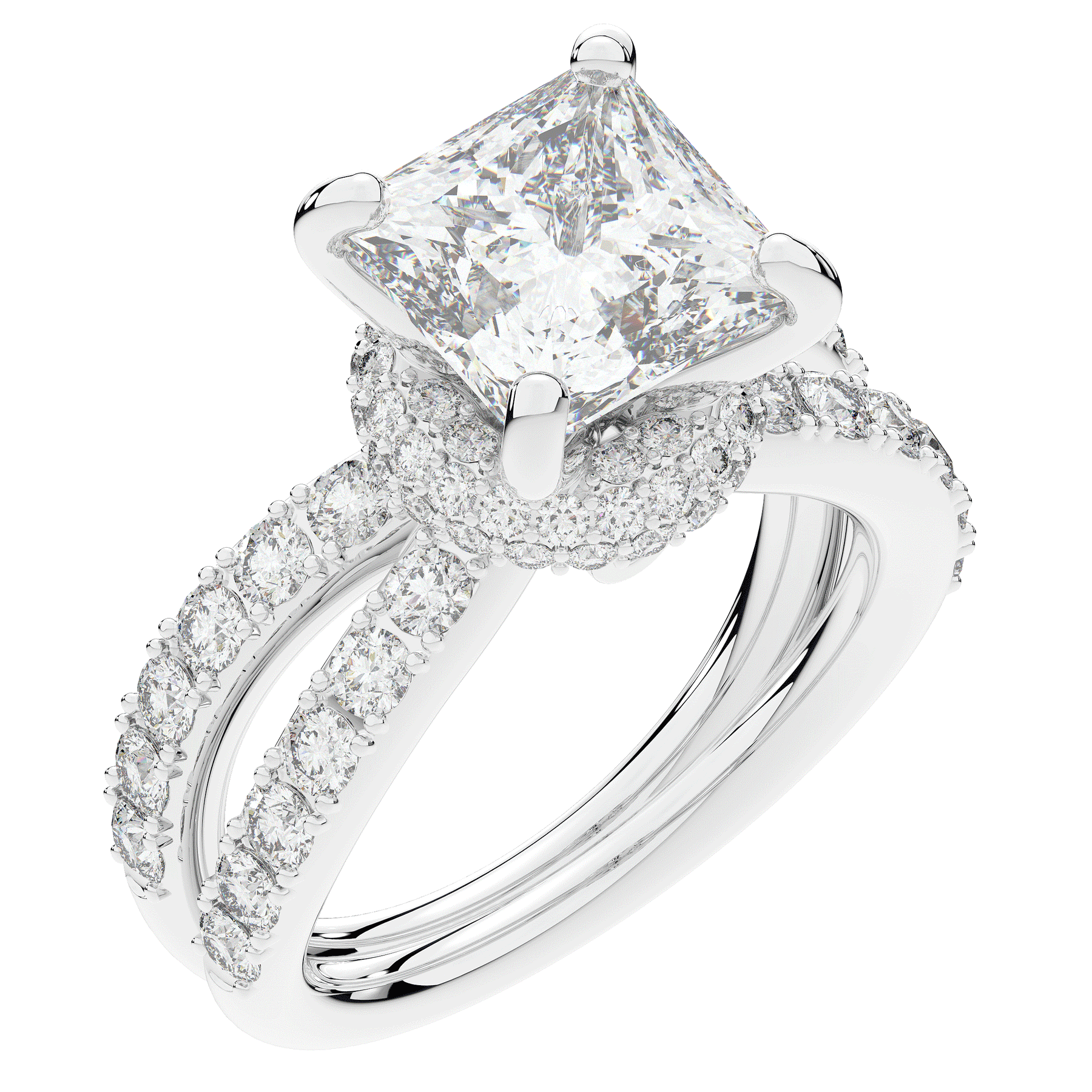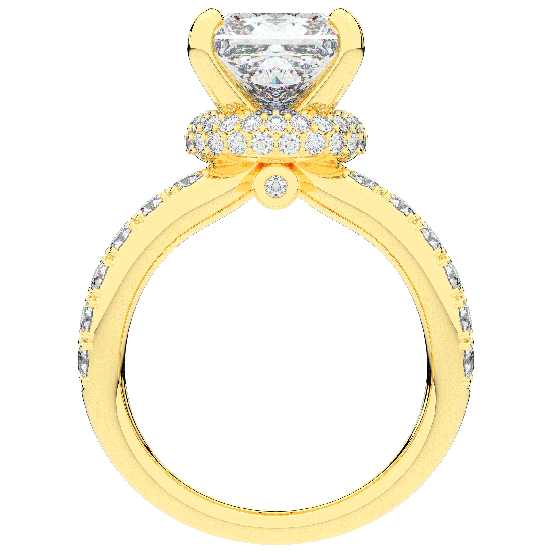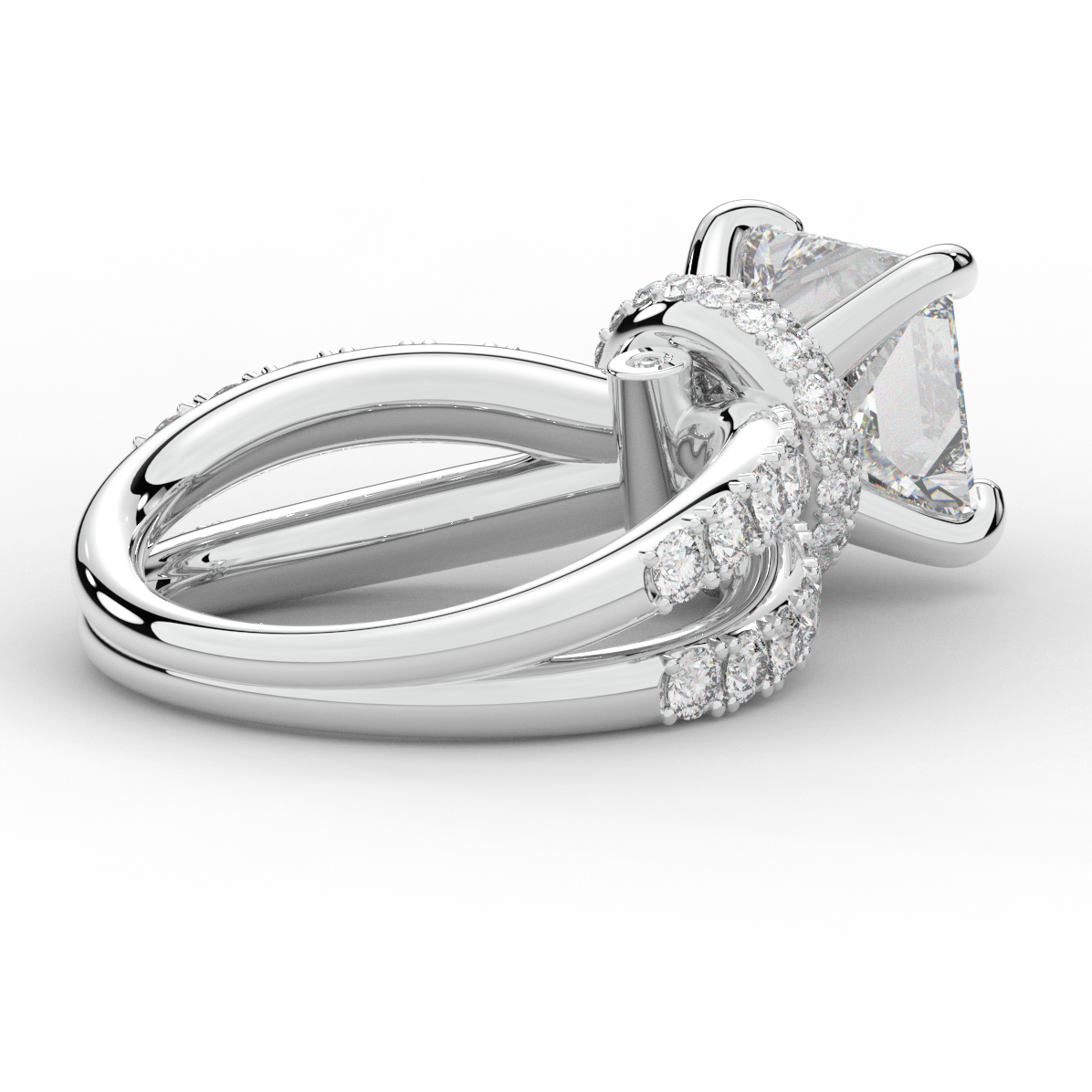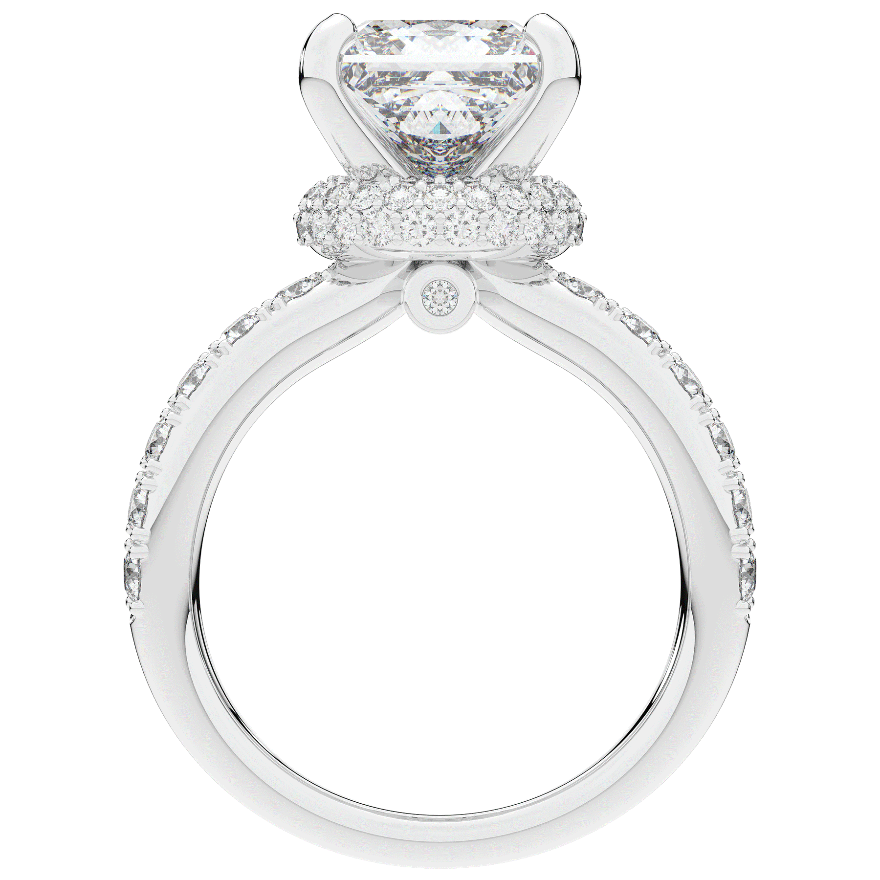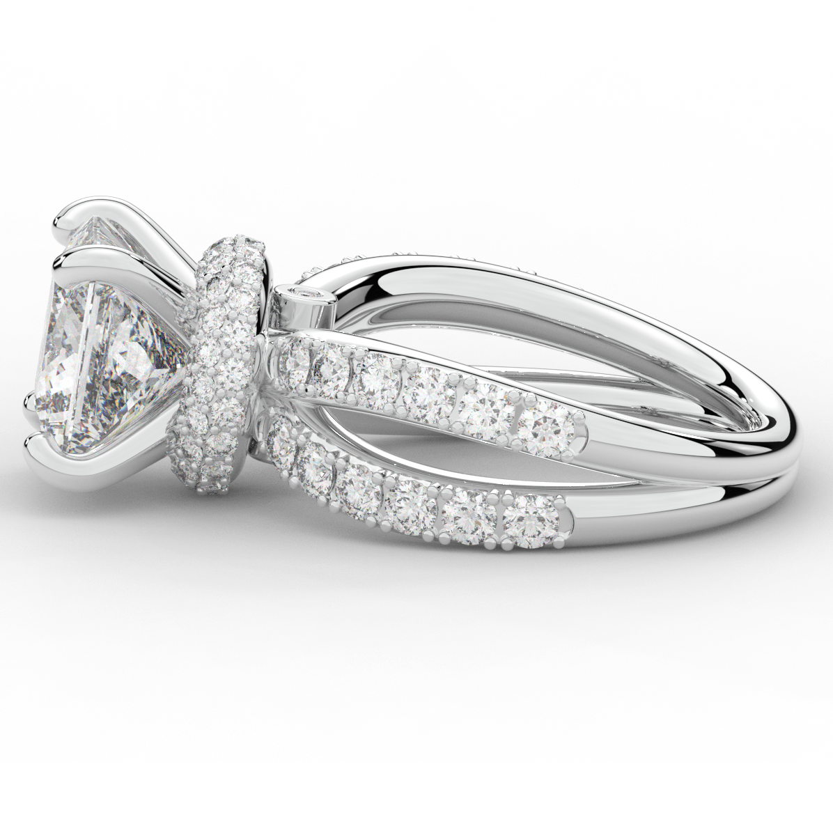 This beautiful ring features a large princess lab grown diamond atop a split lab diamond accented band and collar. This ring is available in 14k white, yellow or rose gold, 18k yellow gold, as well as platinum.