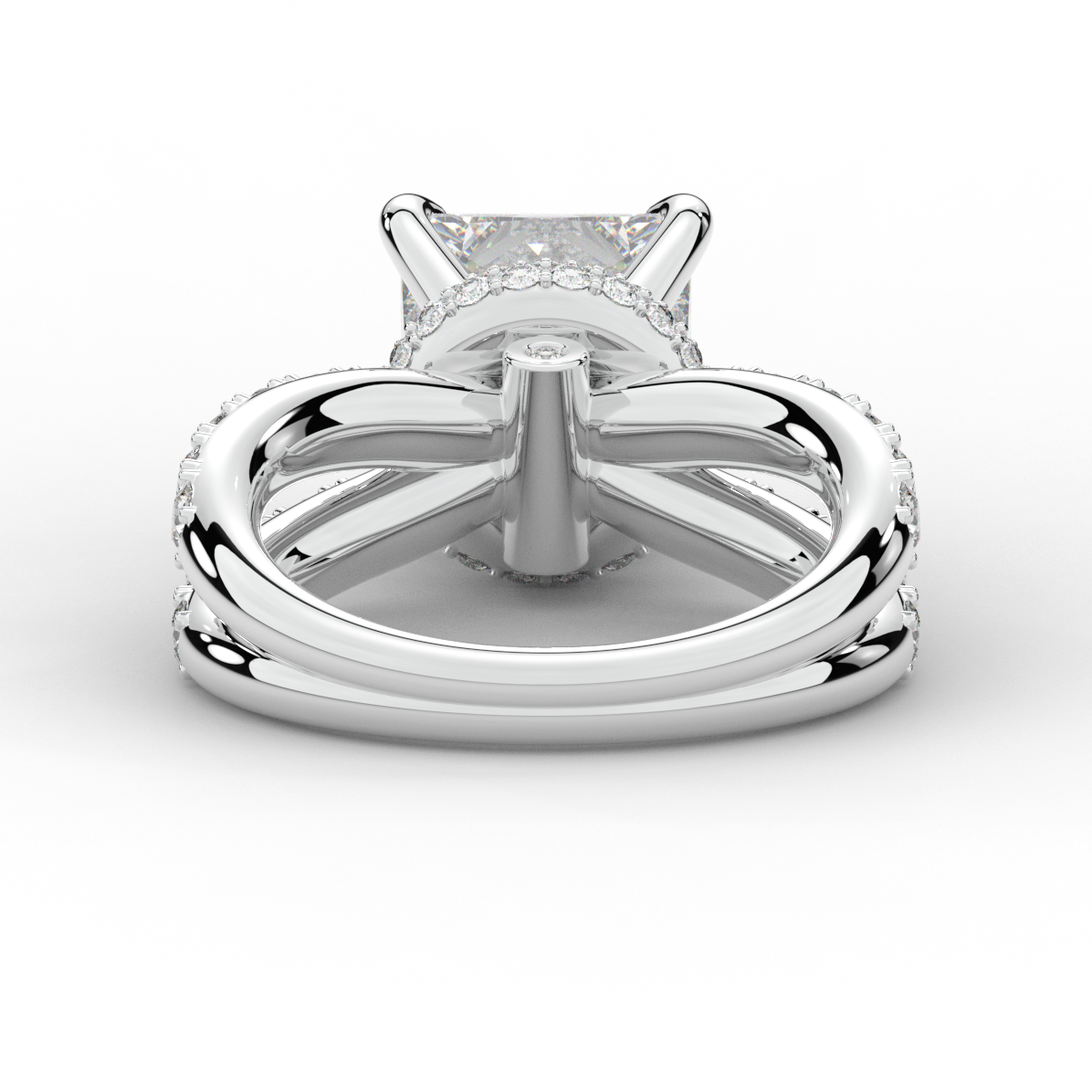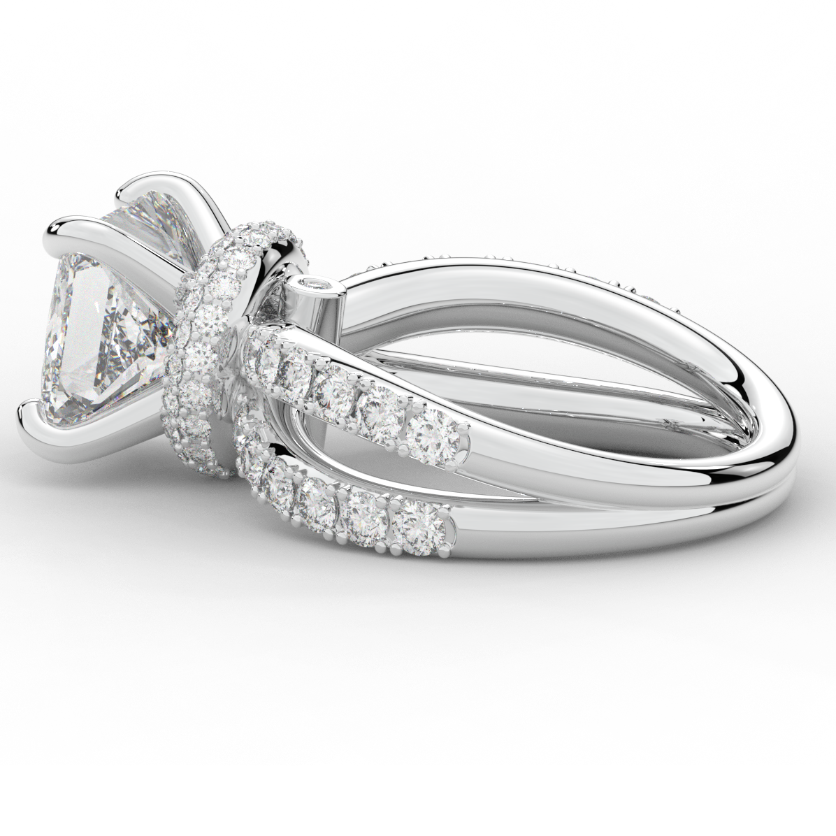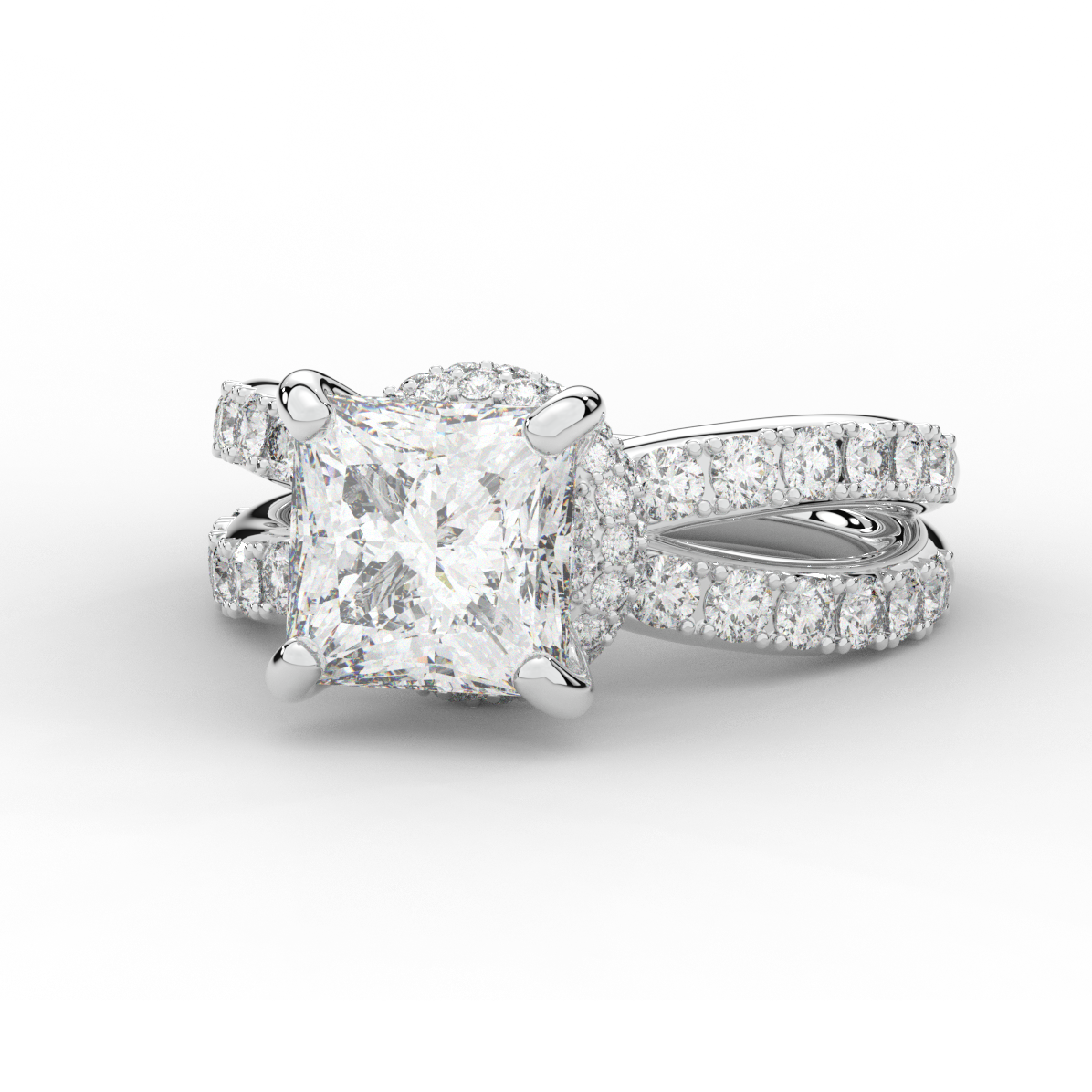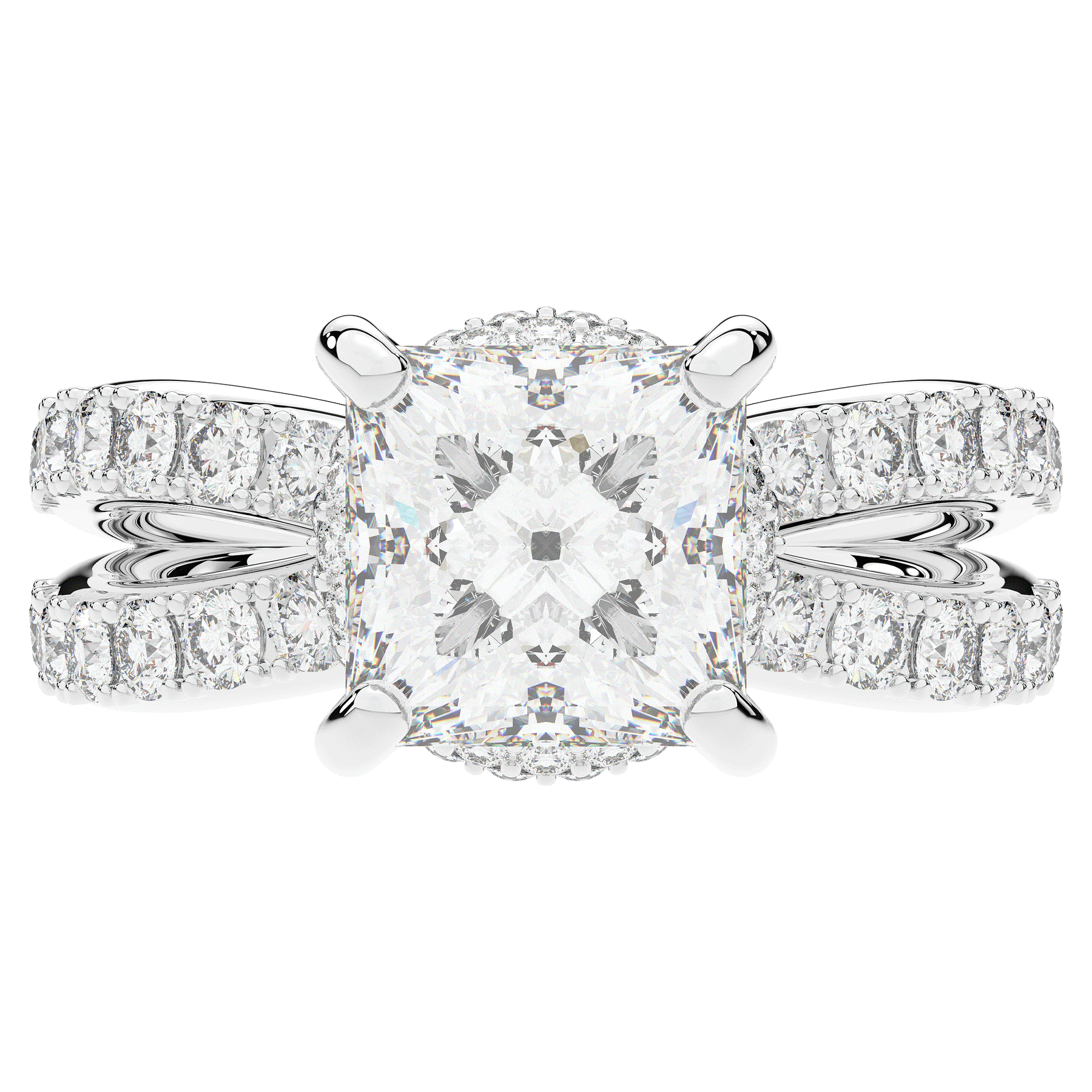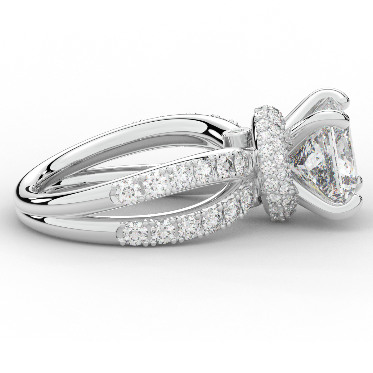 This beautiful ring features a large princess lab grown diamond atop a split lab diamond accented band and collar. This ring is available in 14k white, yellow or rose gold, 18k yellow gold, as well as platinum.