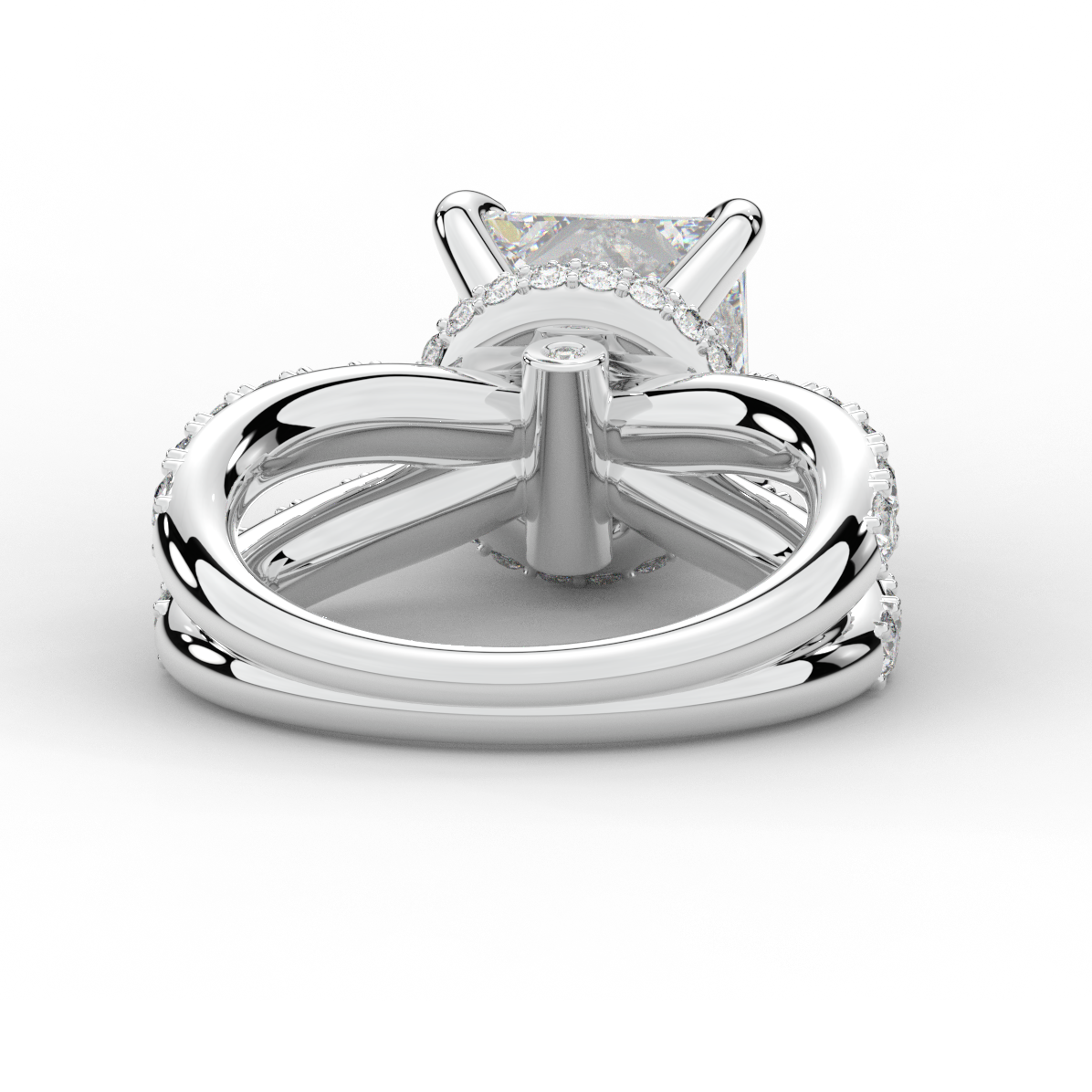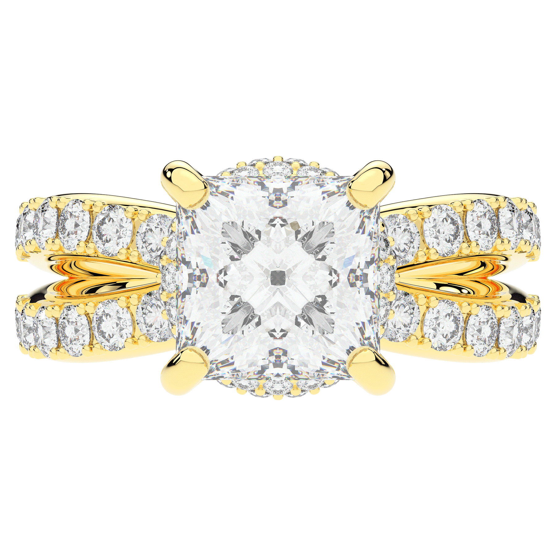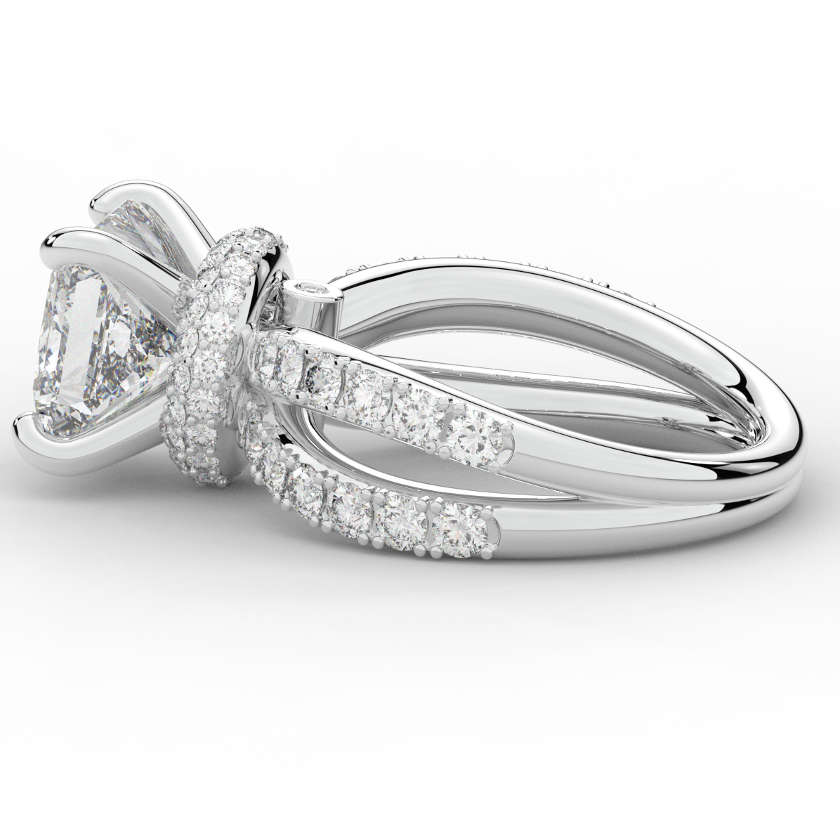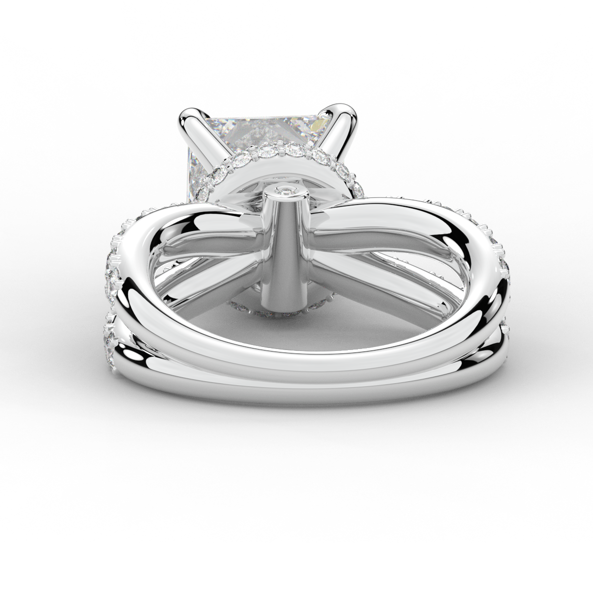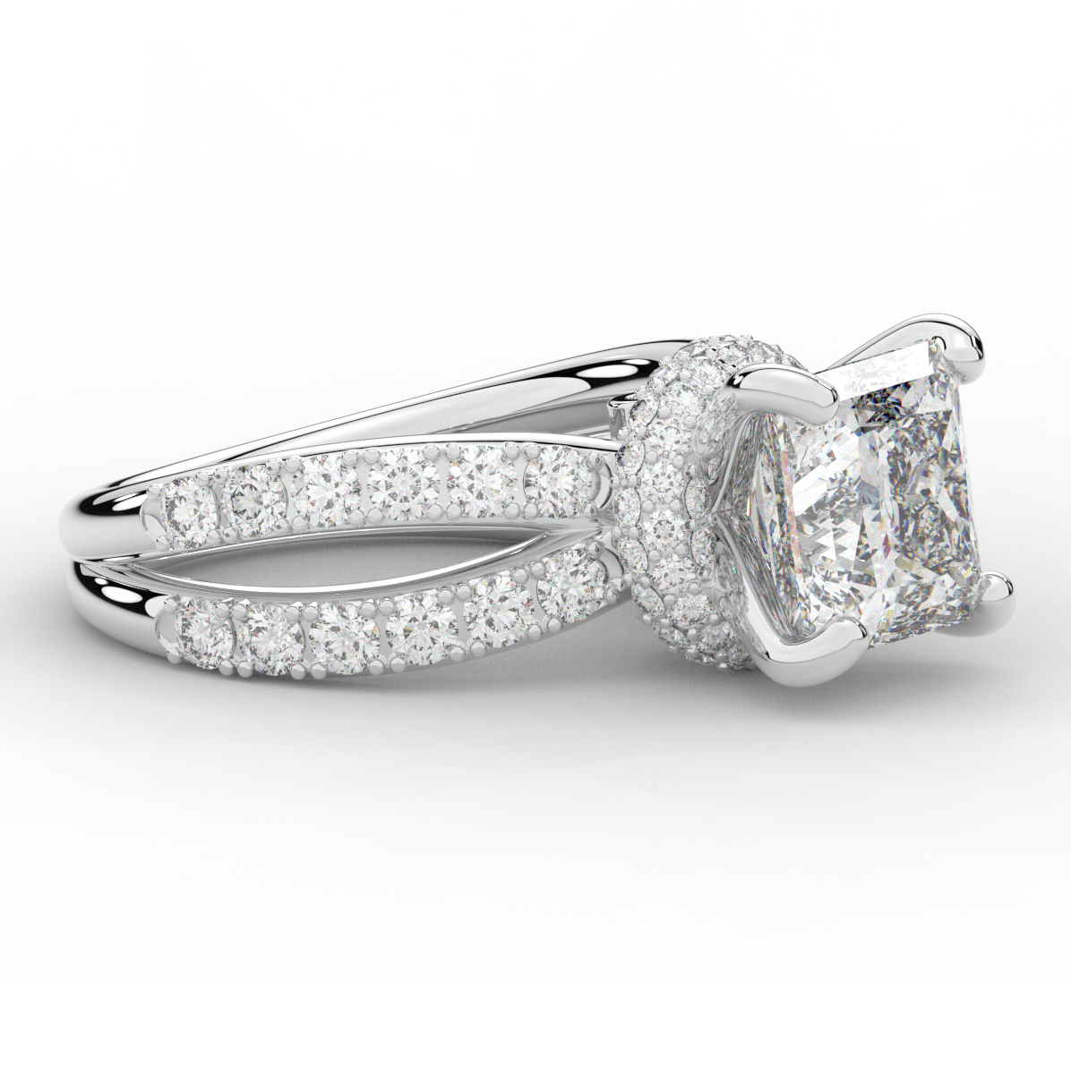 This beautiful ring features a large princess lab grown diamond atop a split lab diamond accented band and collar. This ring is available in 14k white, yellow or rose gold, 18k yellow gold, as well as platinum.