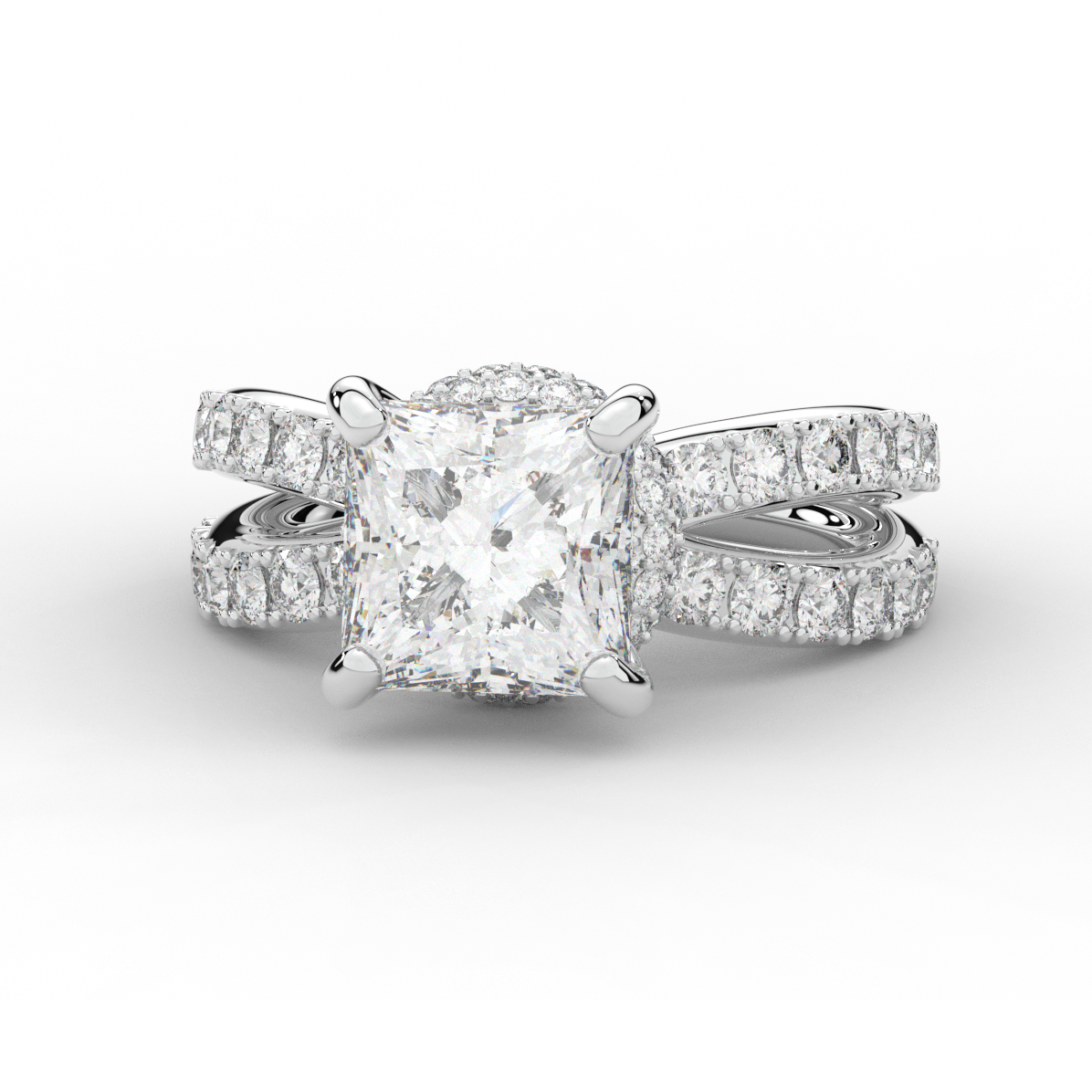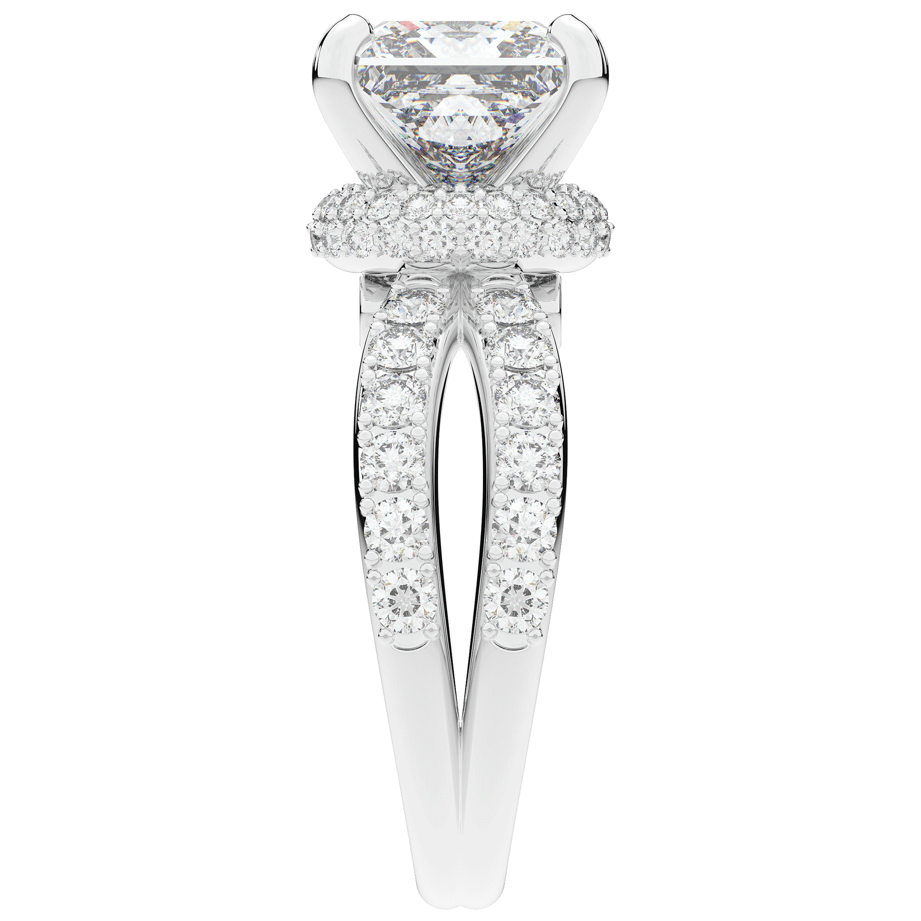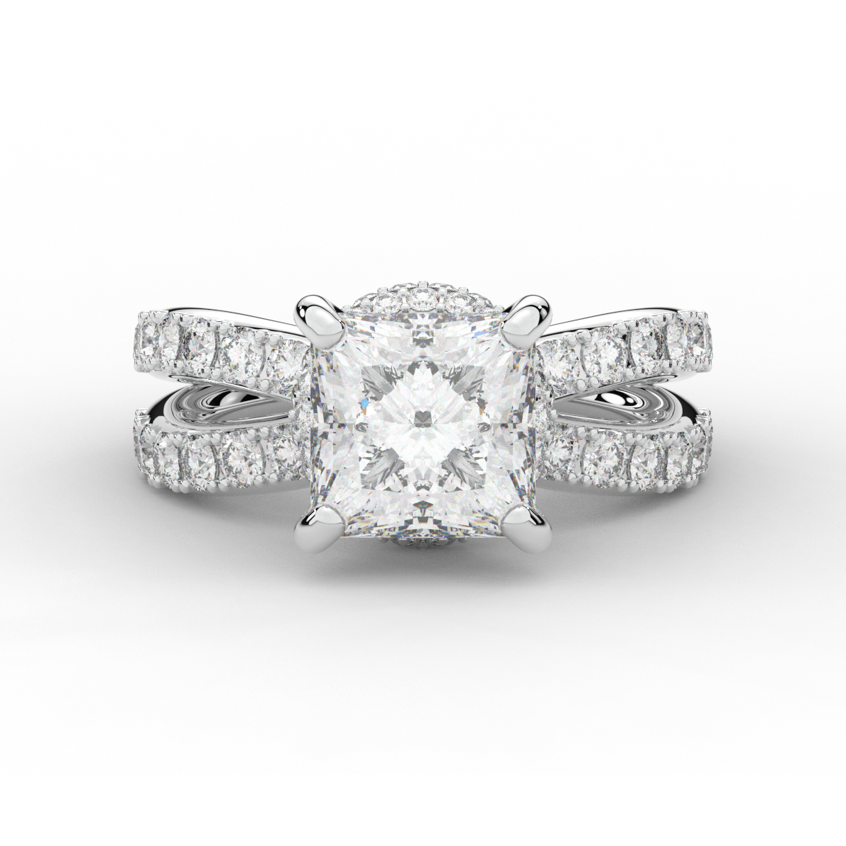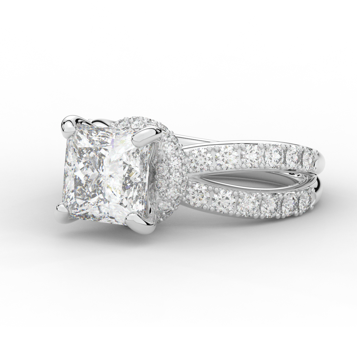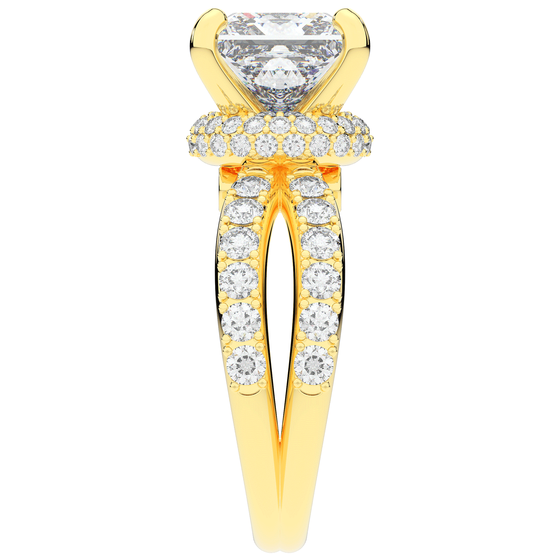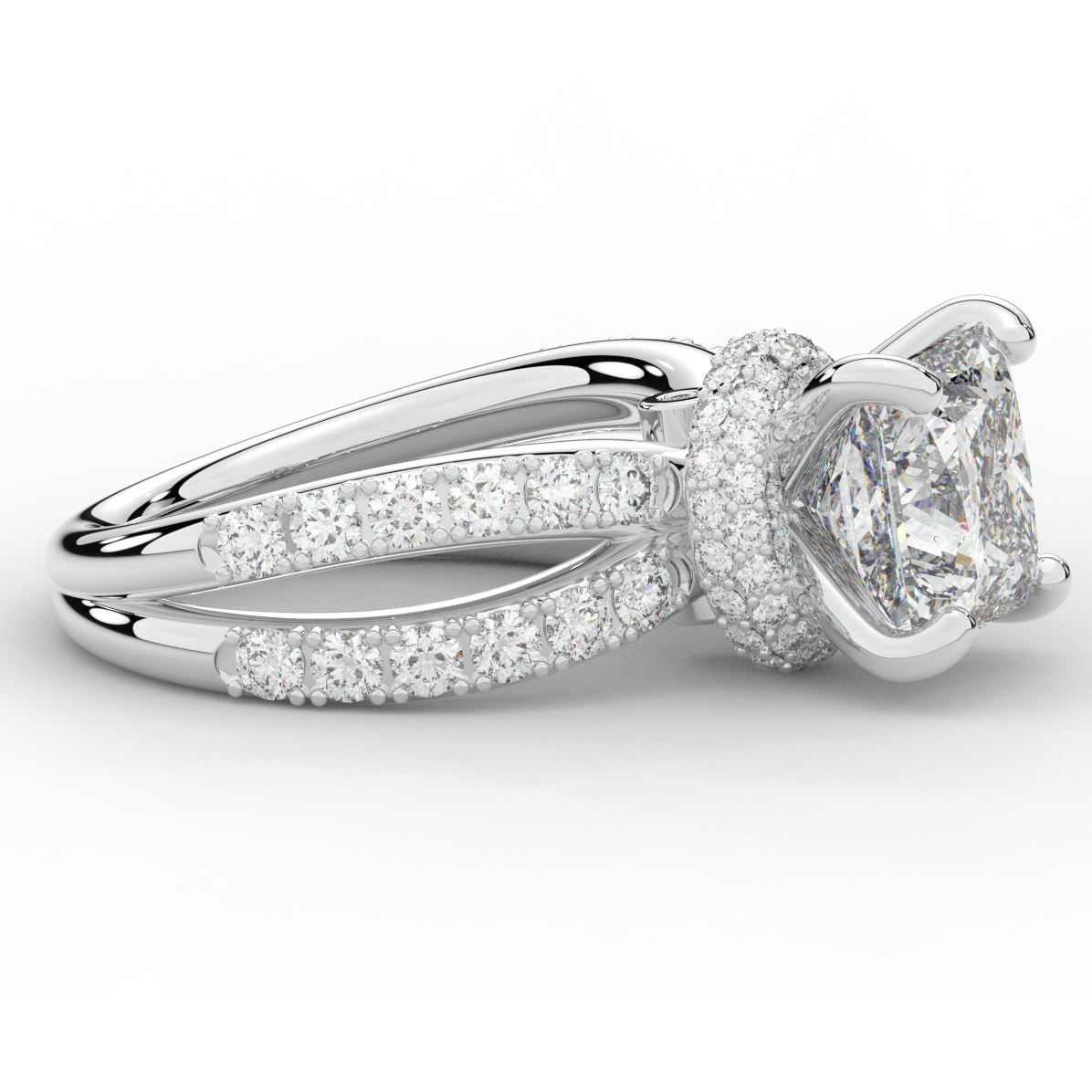 This beautiful ring features a large princess lab grown diamond atop a split lab diamond accented band and collar. This ring is available in 14k white, yellow or rose gold, 18k yellow gold, as well as platinum.