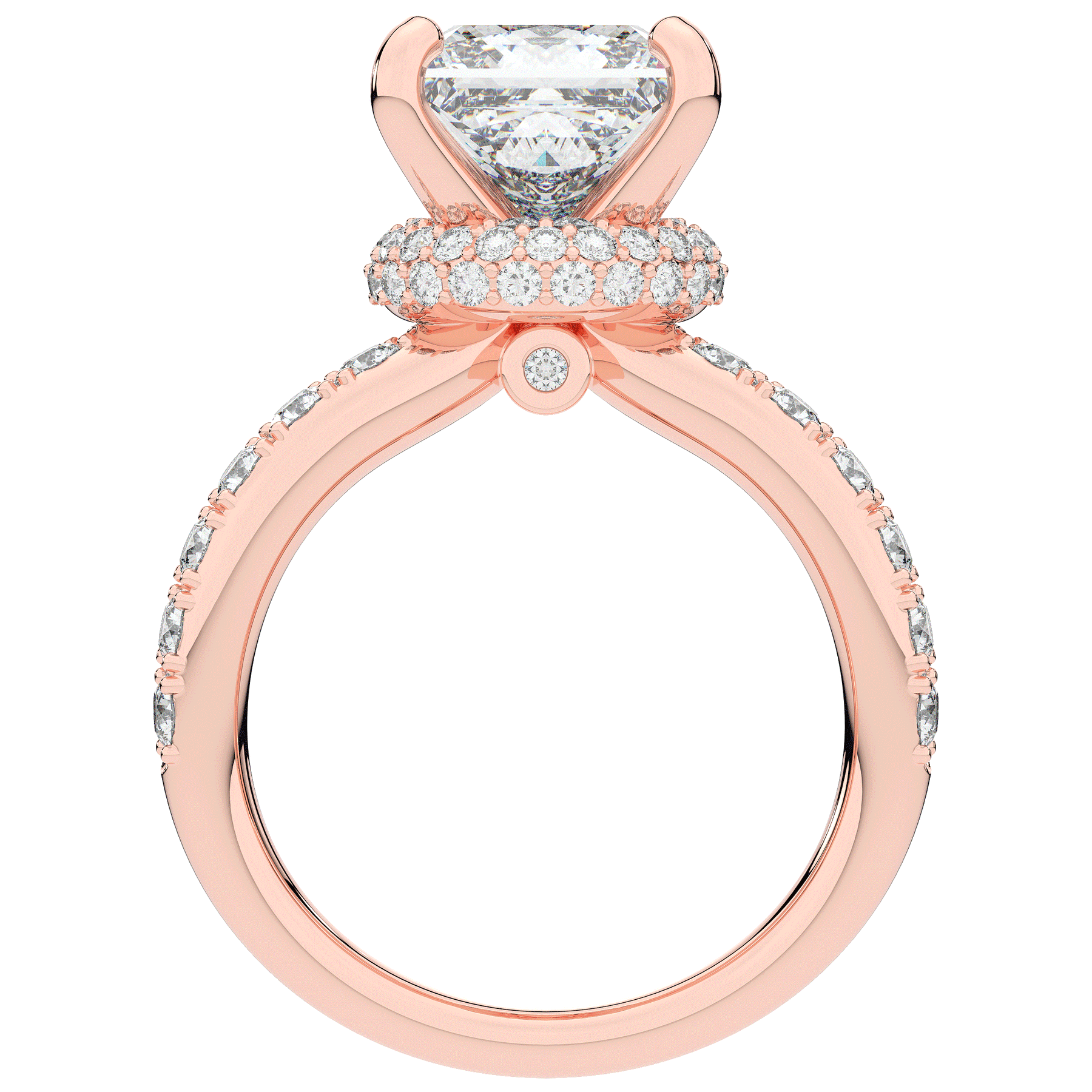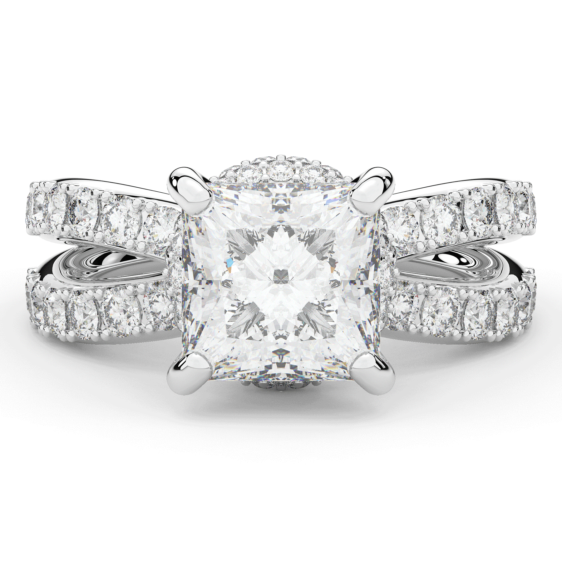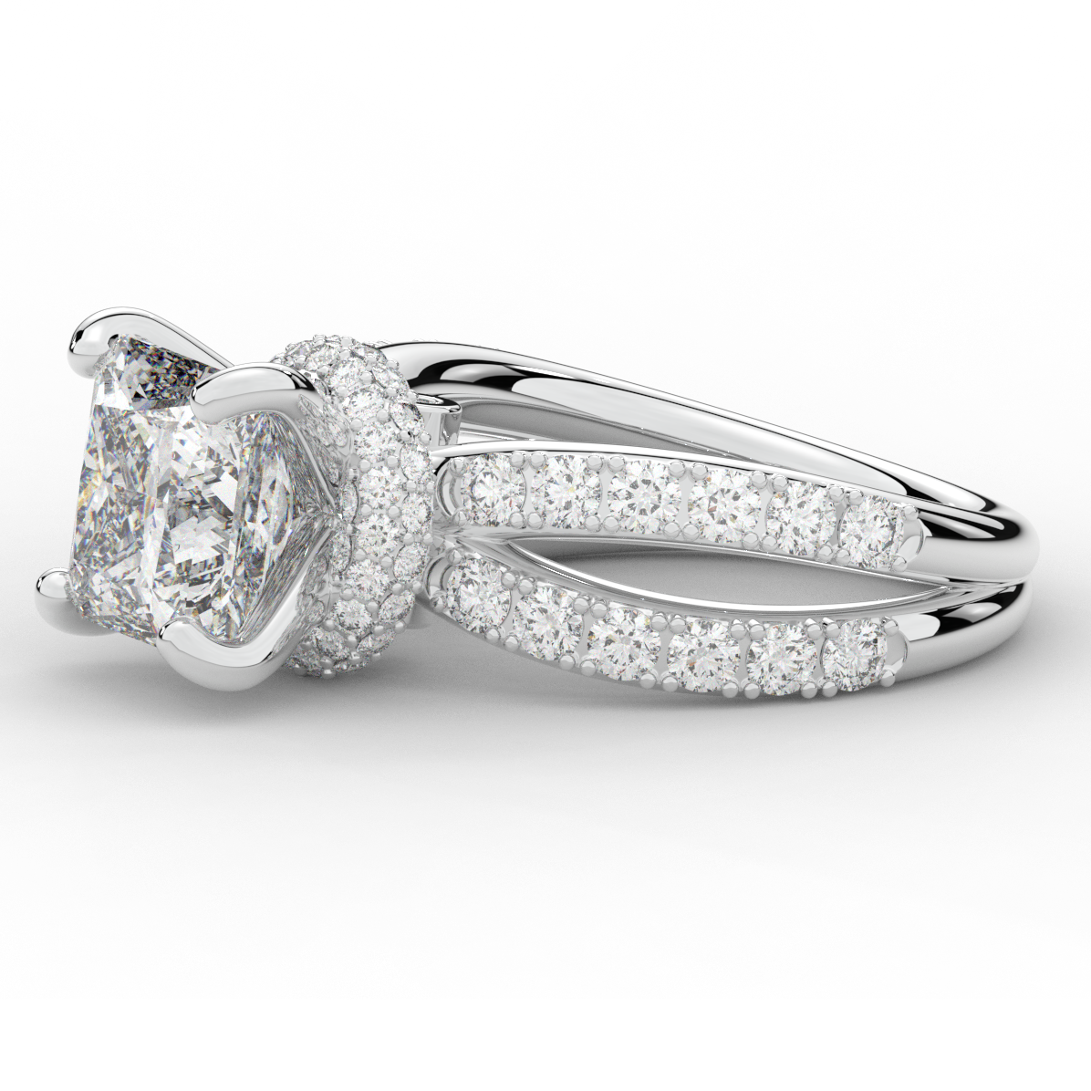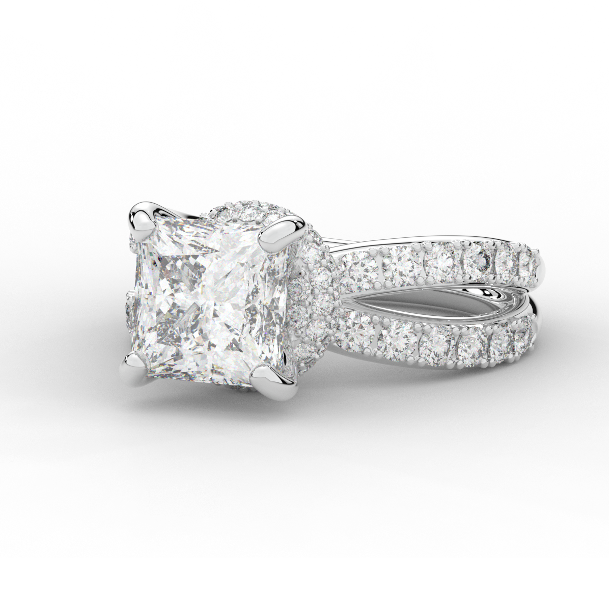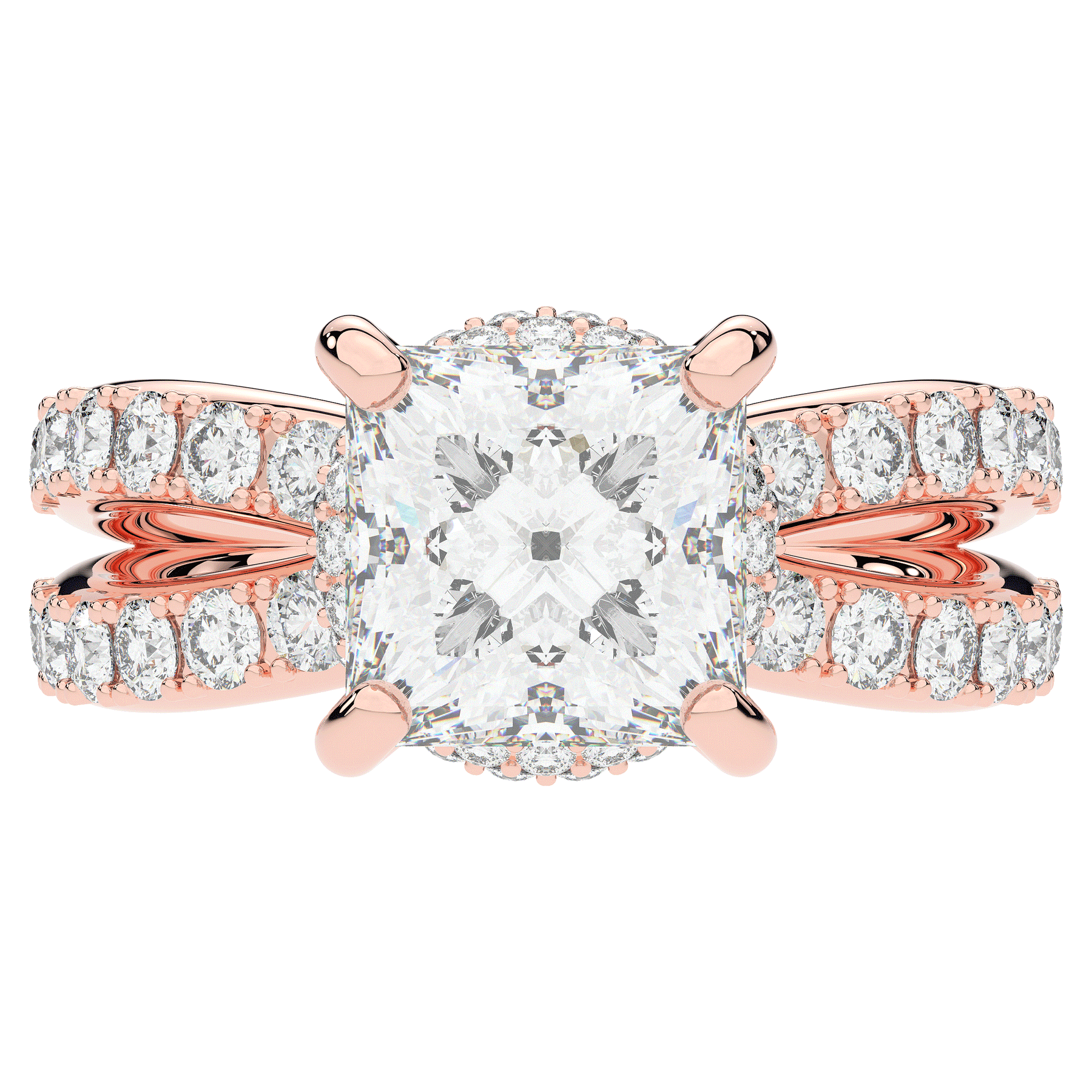 This beautiful ring features a large princess lab grown diamond atop a split lab diamond accented band and collar. This ring is available in 14k white, yellow or rose gold, 18k yellow gold, as well as platinum.