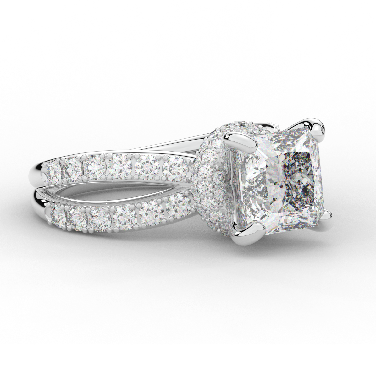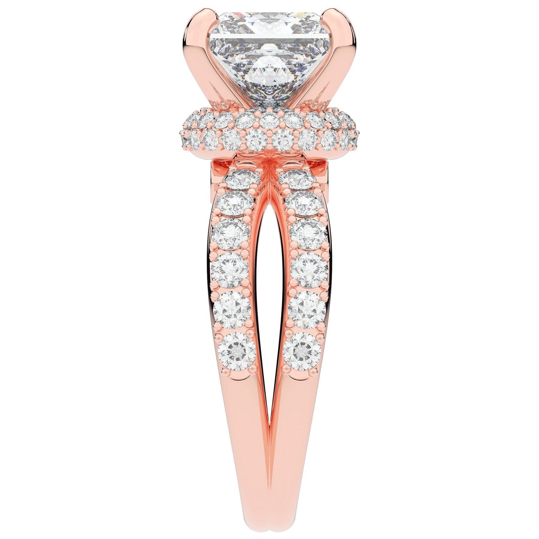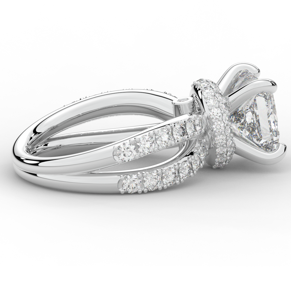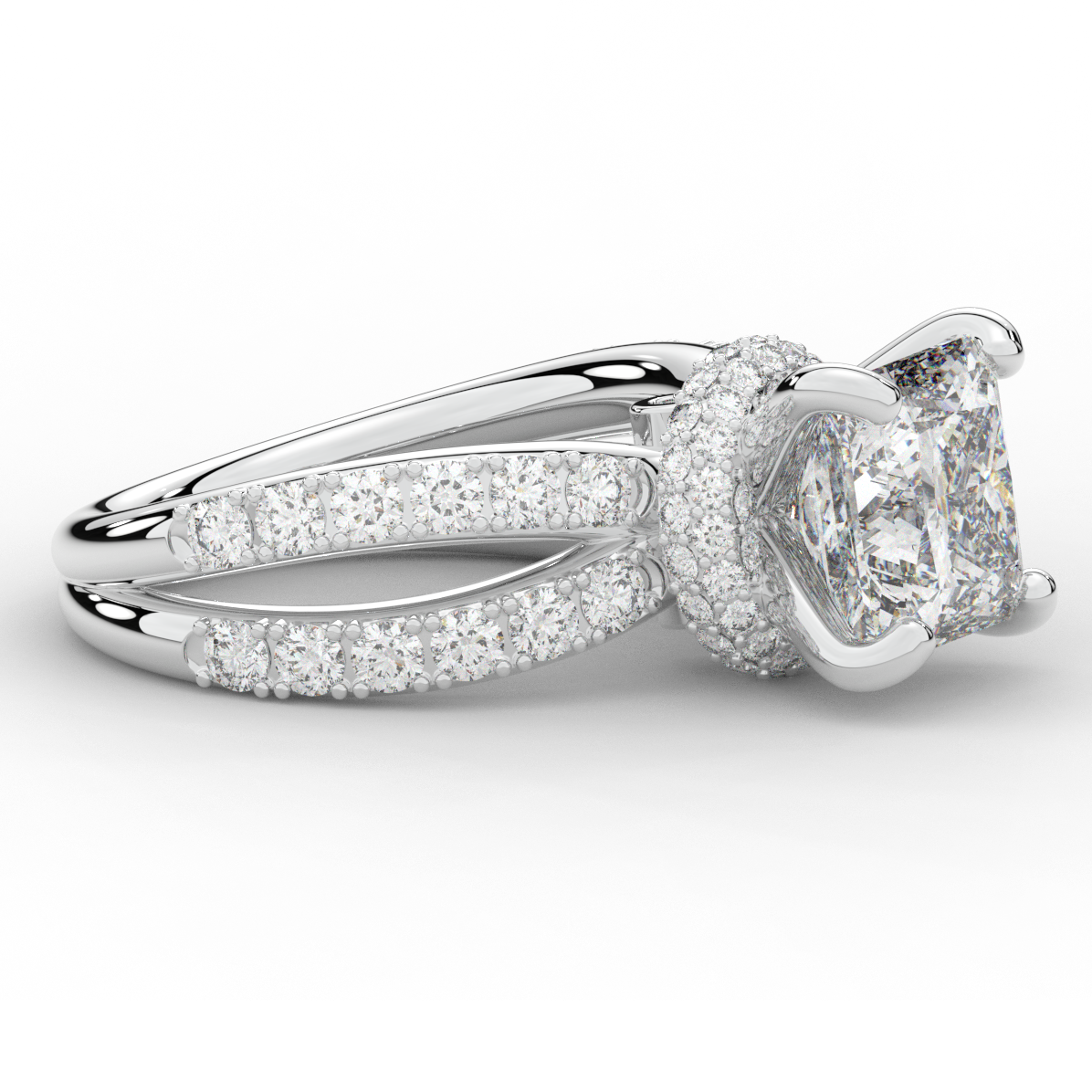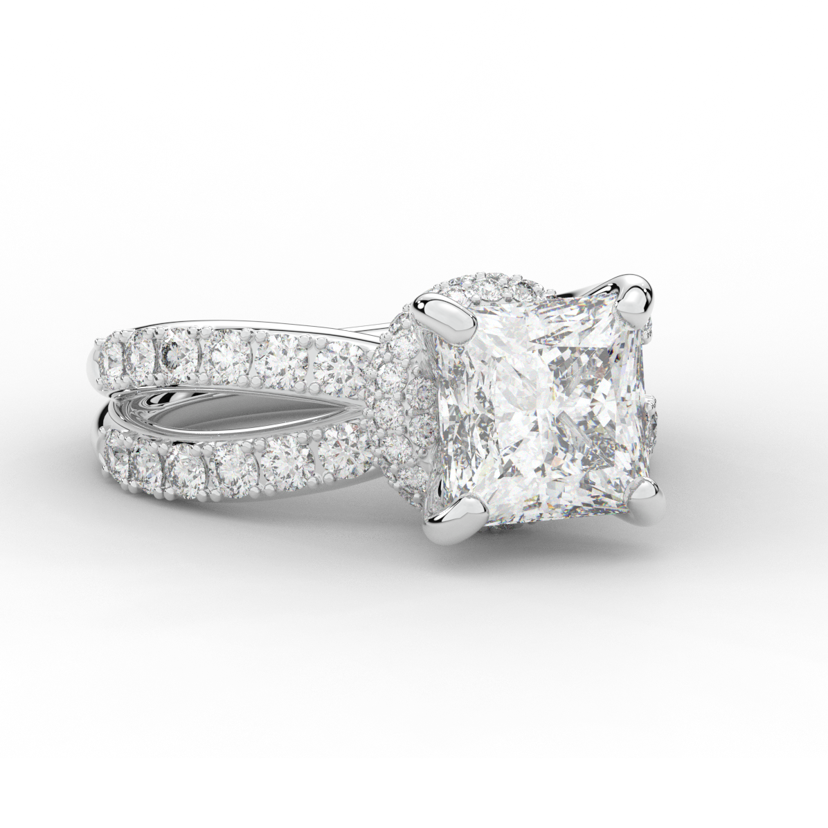 This beautiful ring features a large princess lab grown diamond atop a split lab diamond accented band and collar. This ring is available in 14k white, yellow or rose gold, 18k yellow gold, as well as platinum.
