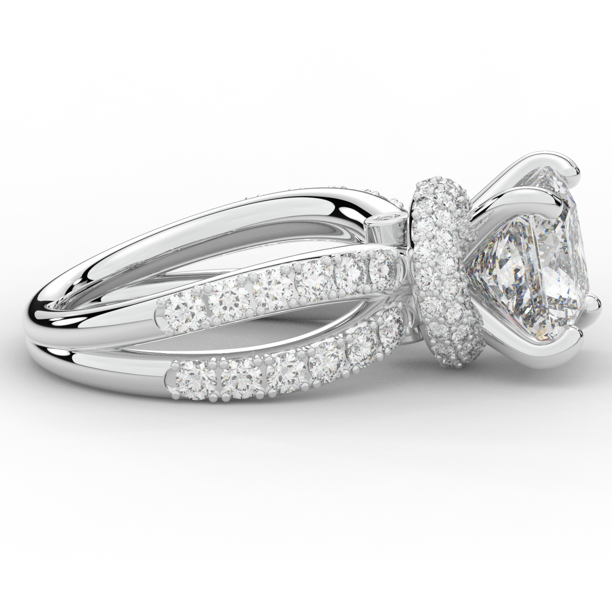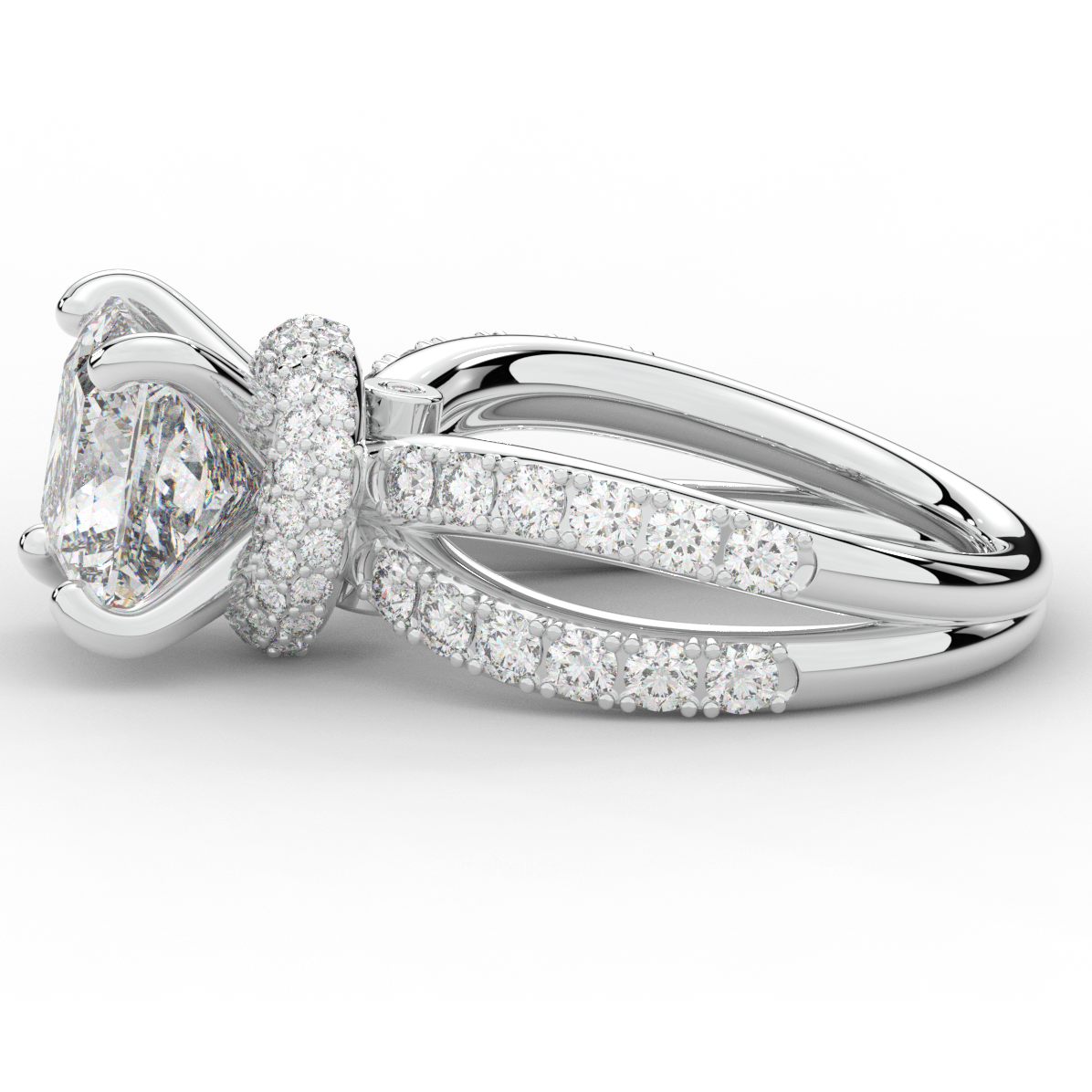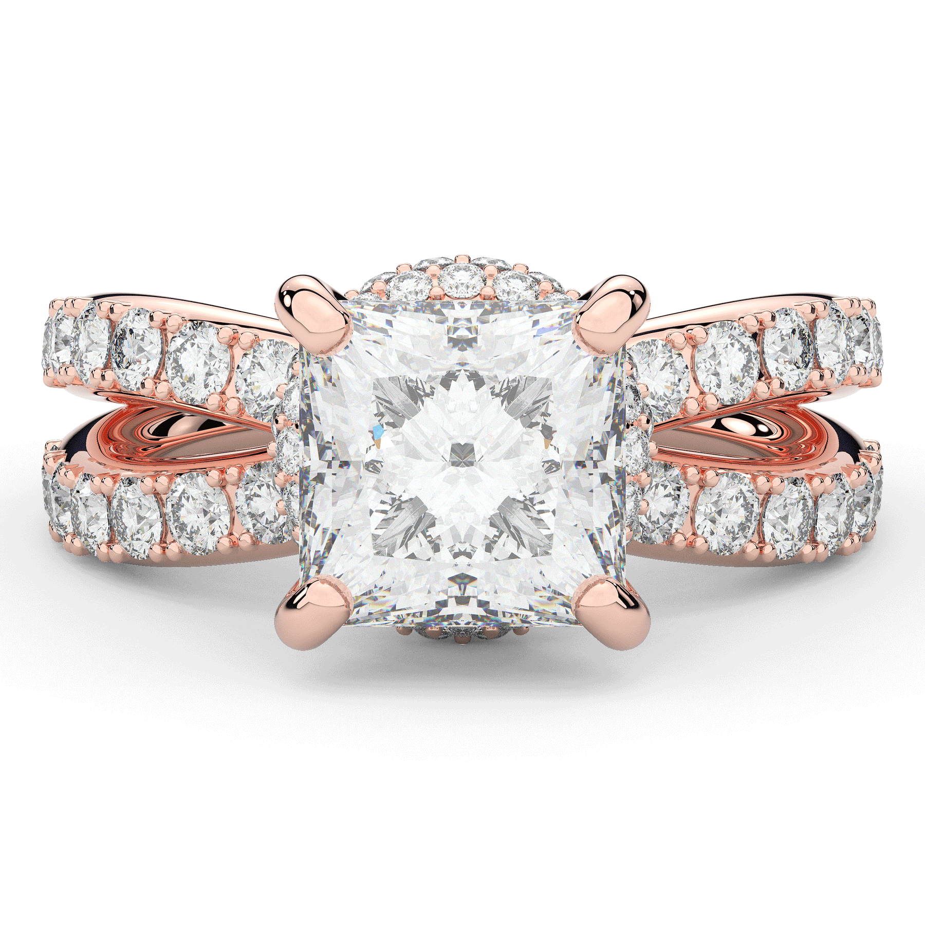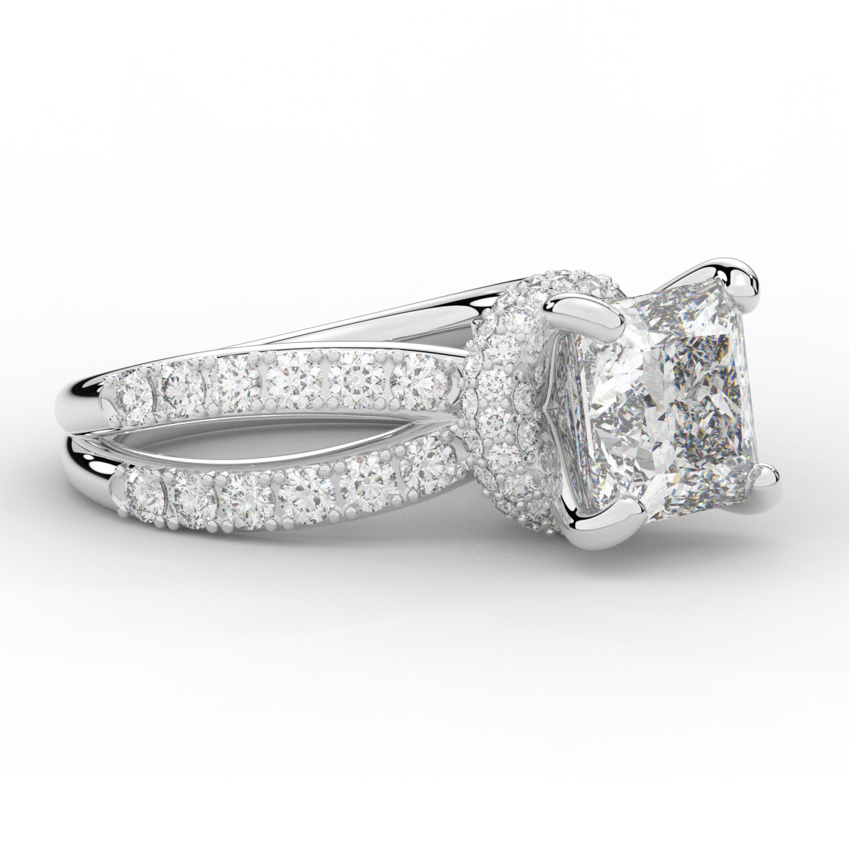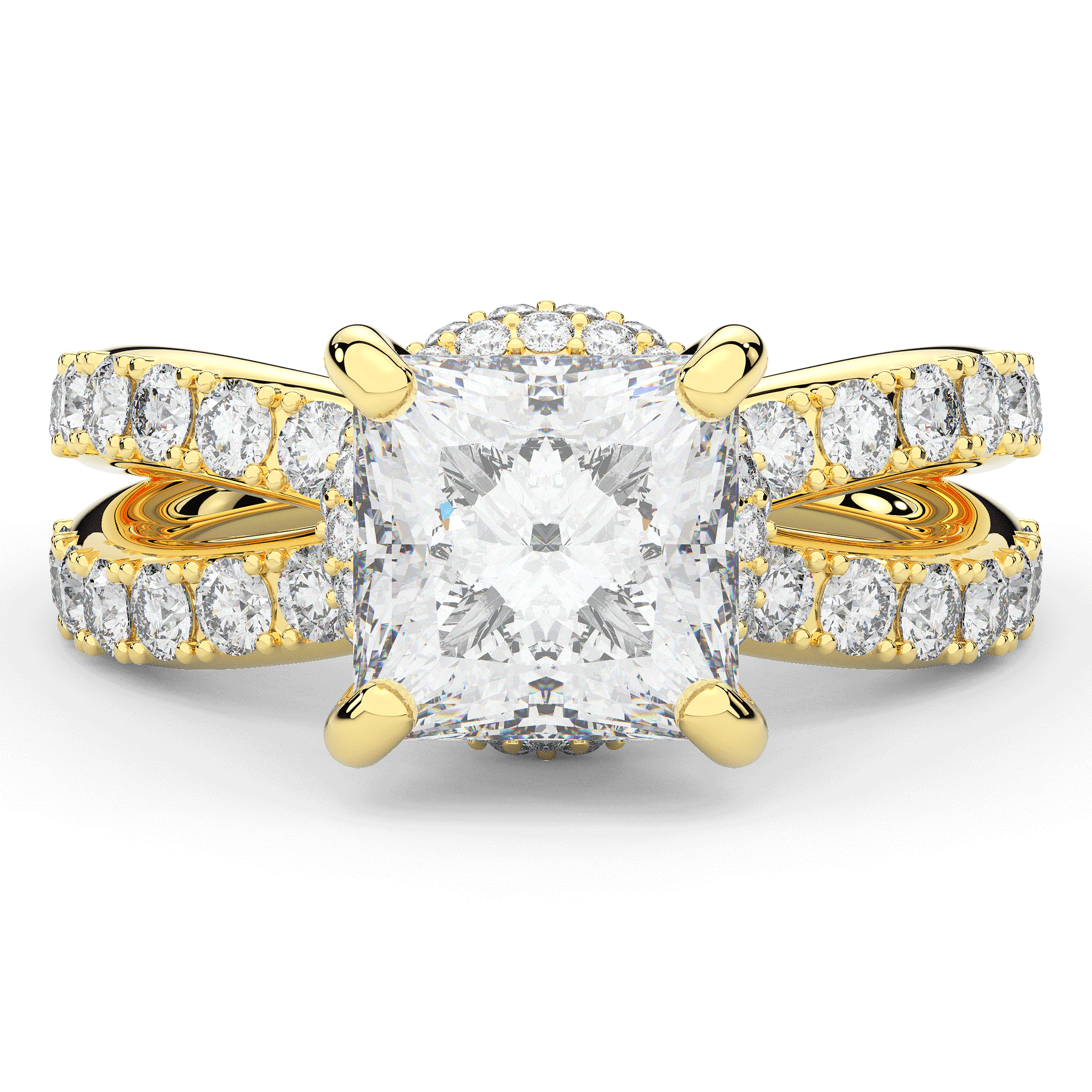 This beautiful ring features a large princess lab grown diamond atop a split lab diamond accented band and collar. This ring is available in 14k white, yellow or rose gold, 18k yellow gold, as well as platinum.