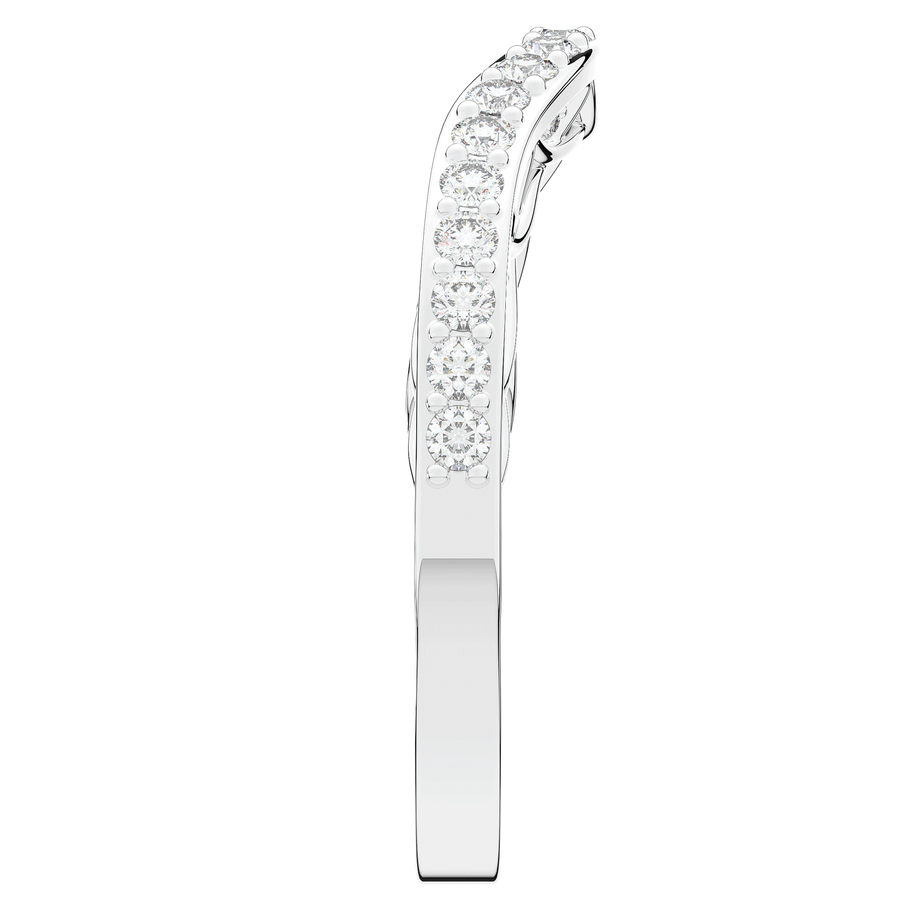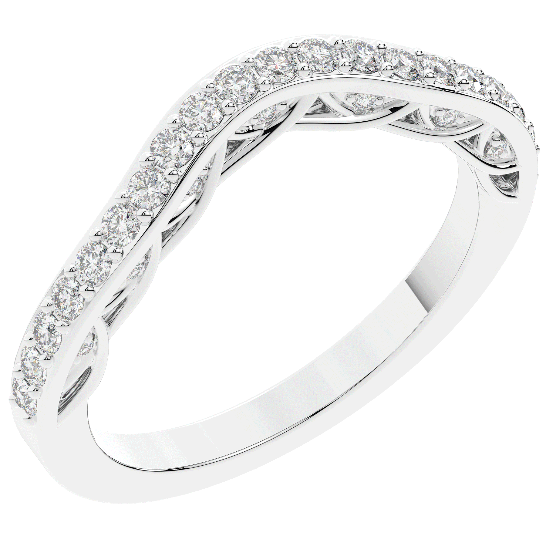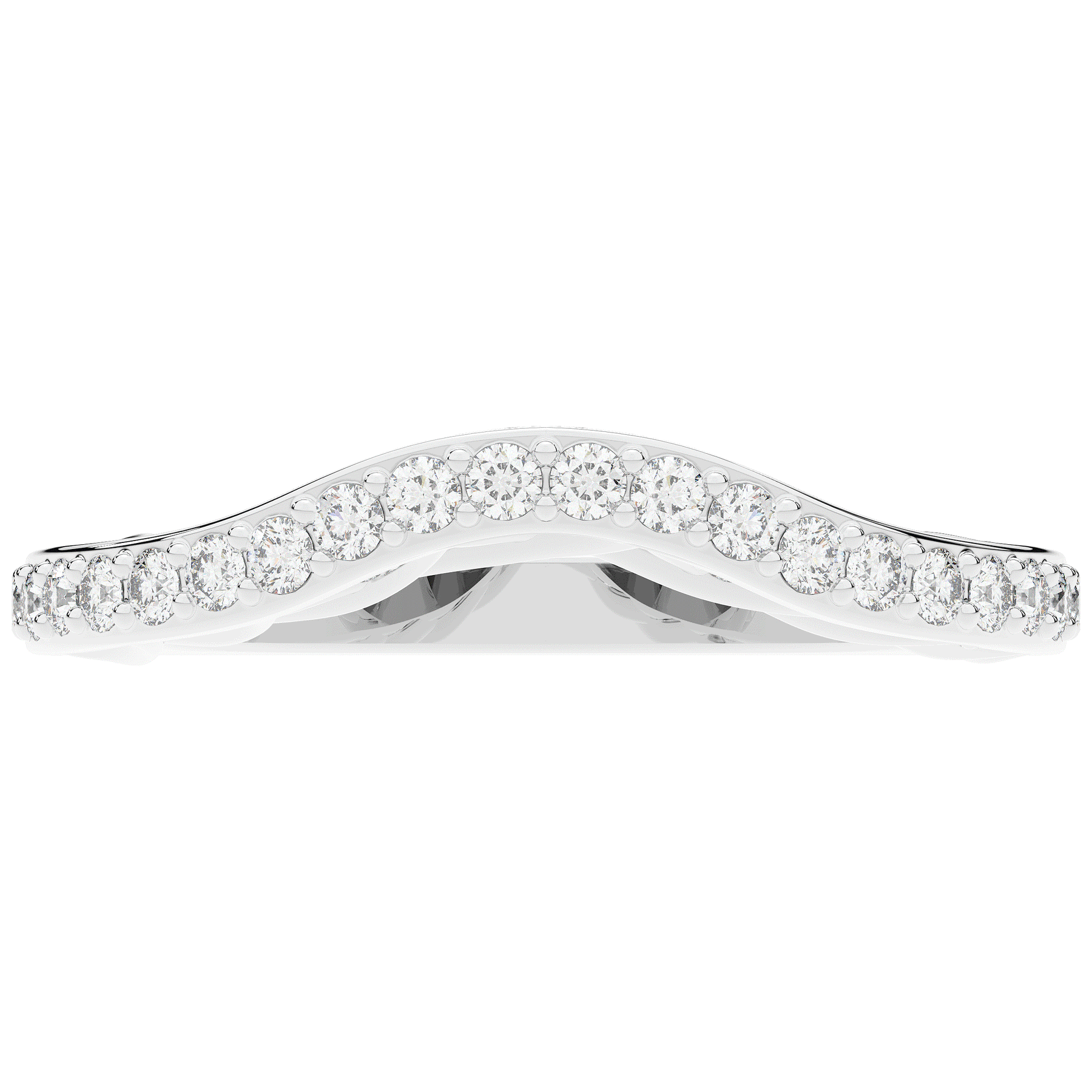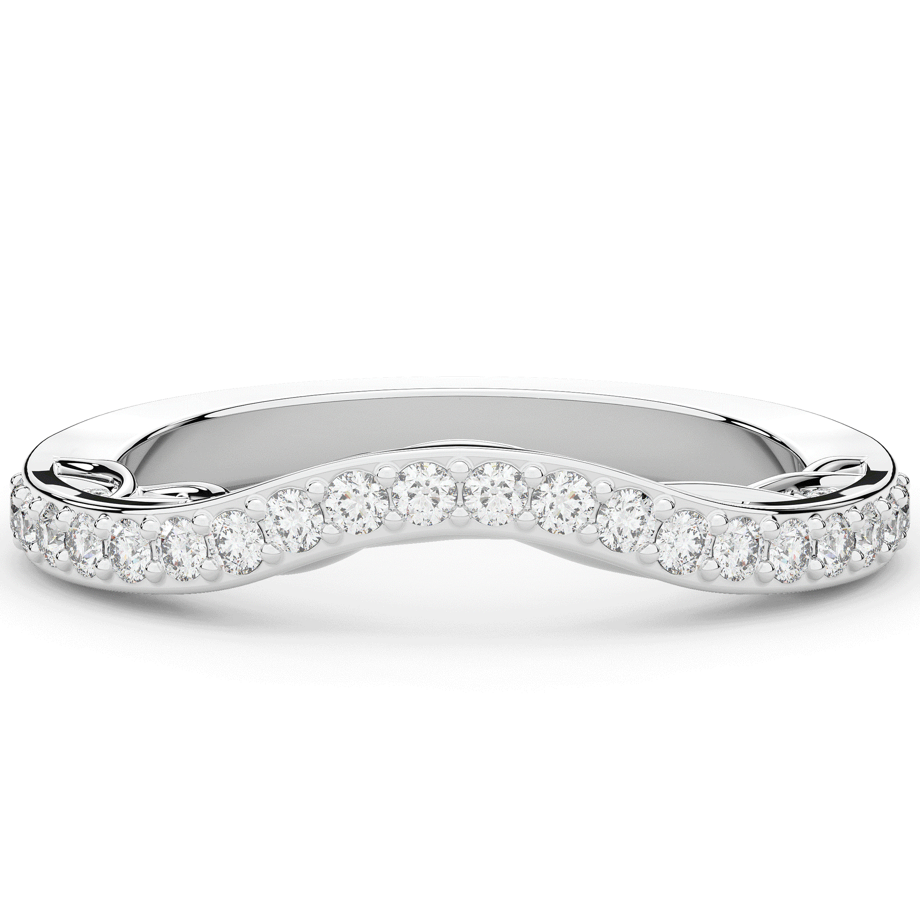 This beautiful ring features bright round lab grown diamonds accenting the curved contour the band on the top and both sides. This ring is available in 14k white, yellow or rose gold, 18k yellow gold, as well as platinum.